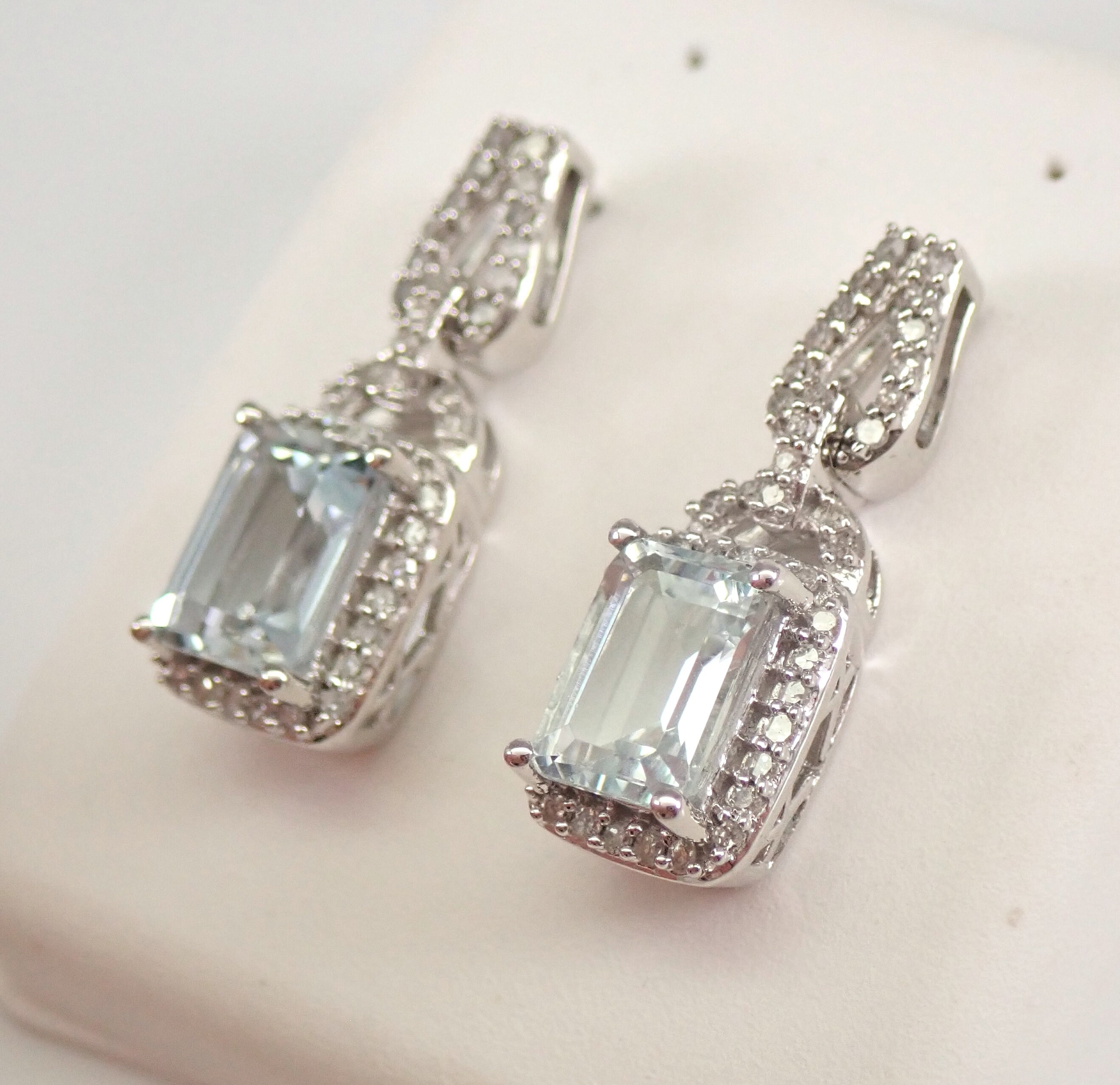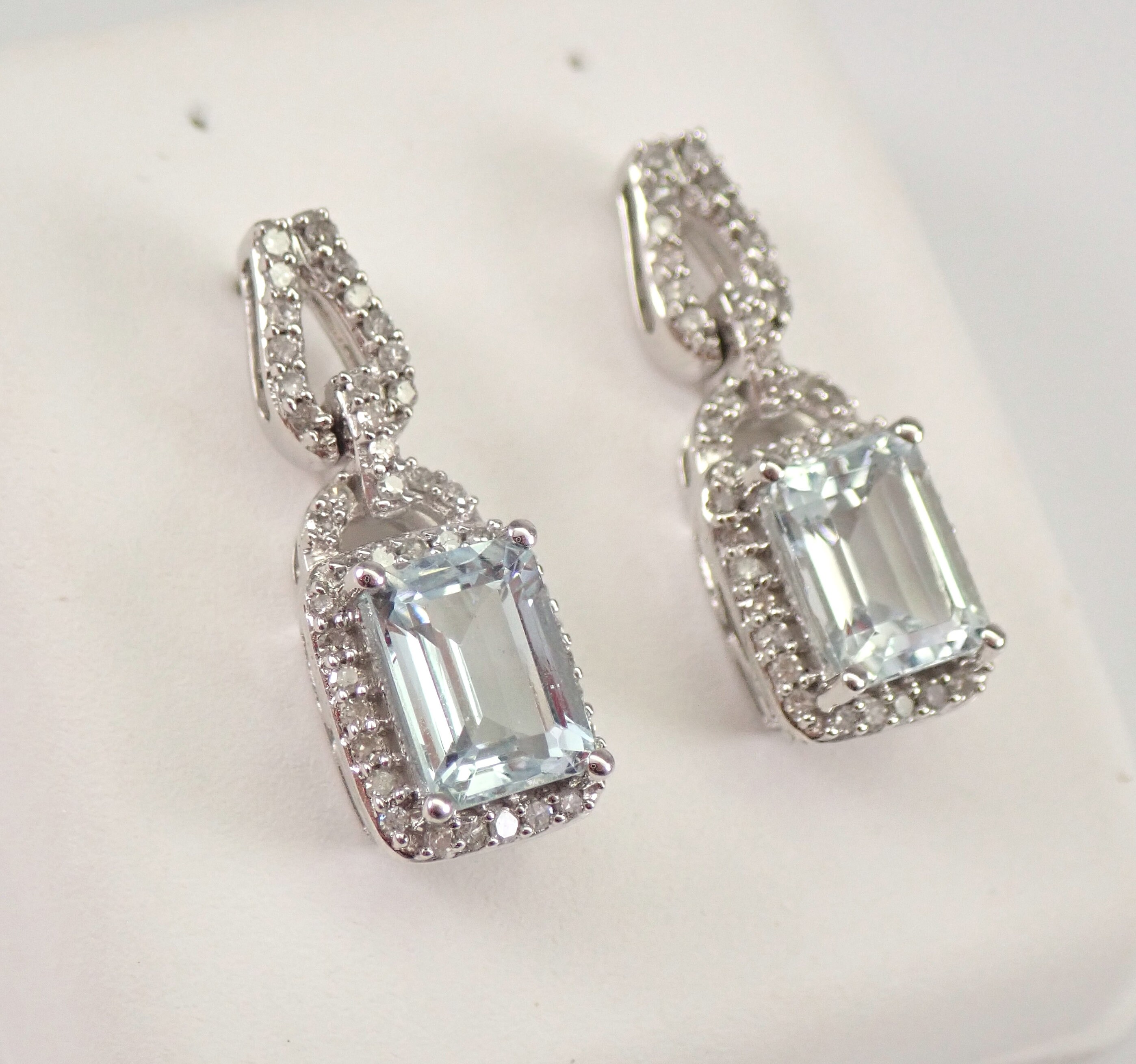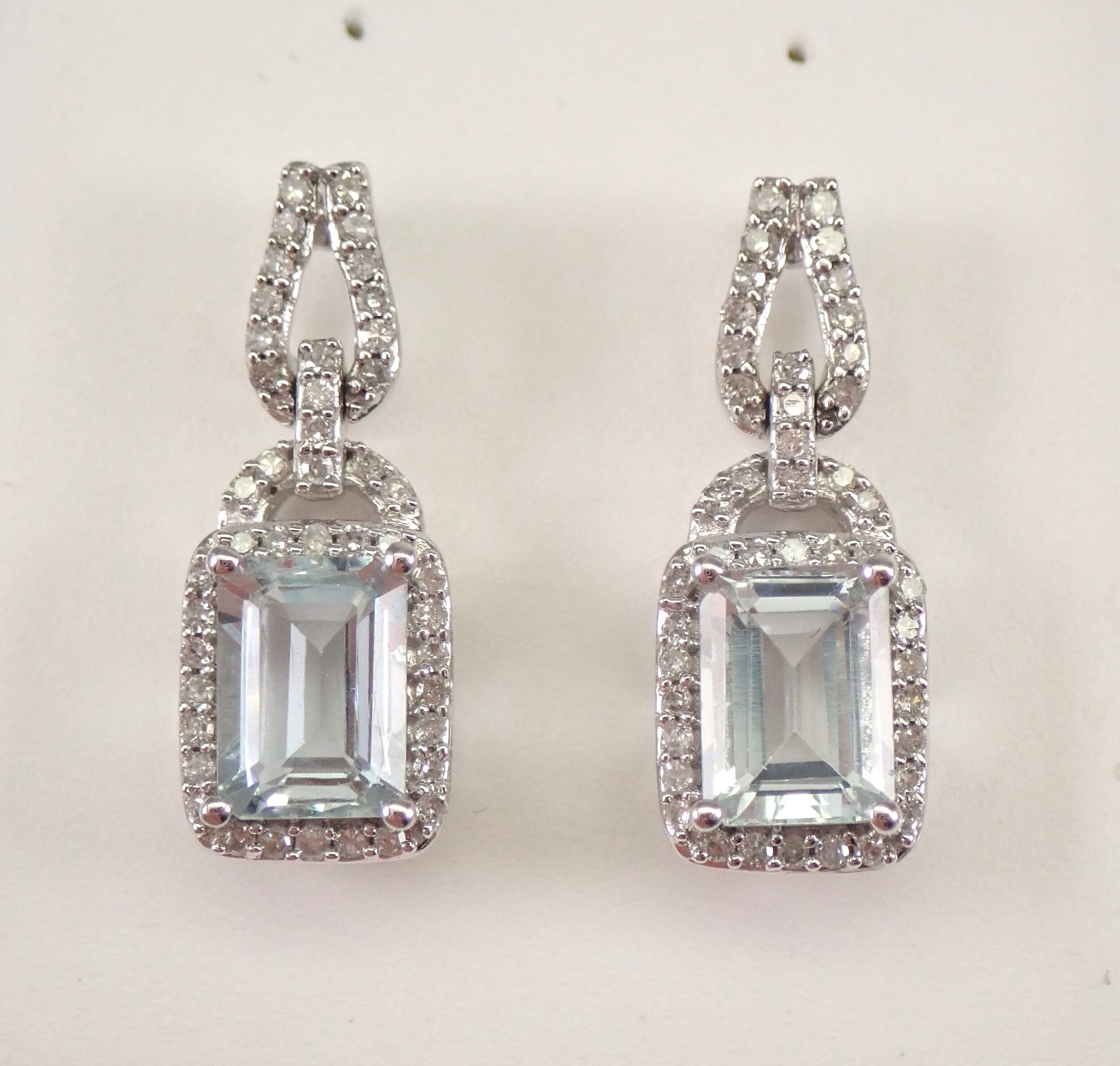White Gold Diamond and Aquamarine Earrings. These earrings are set with two genuine Emerald-Cut Aquamarine and eighty-eight natural Round Brilliant Diamonds. These diamonds are H color, SI/I clarity and weigh a total of .45 carat. The Aquamarine in these earrings are a beautiful aqua blue color, measure 7 X 5 mm each and weigh a total of 2 carats. These earrings are 10KT White Gold and weigh a total of 3.6 grams. These earrings are for pierced ears, measure 19 mm in length and have friction post backings. These earrings will be accompanied by an appraisal with the retail replacement value of $1,485.00. I will ship these earrings promptly in a gift box.