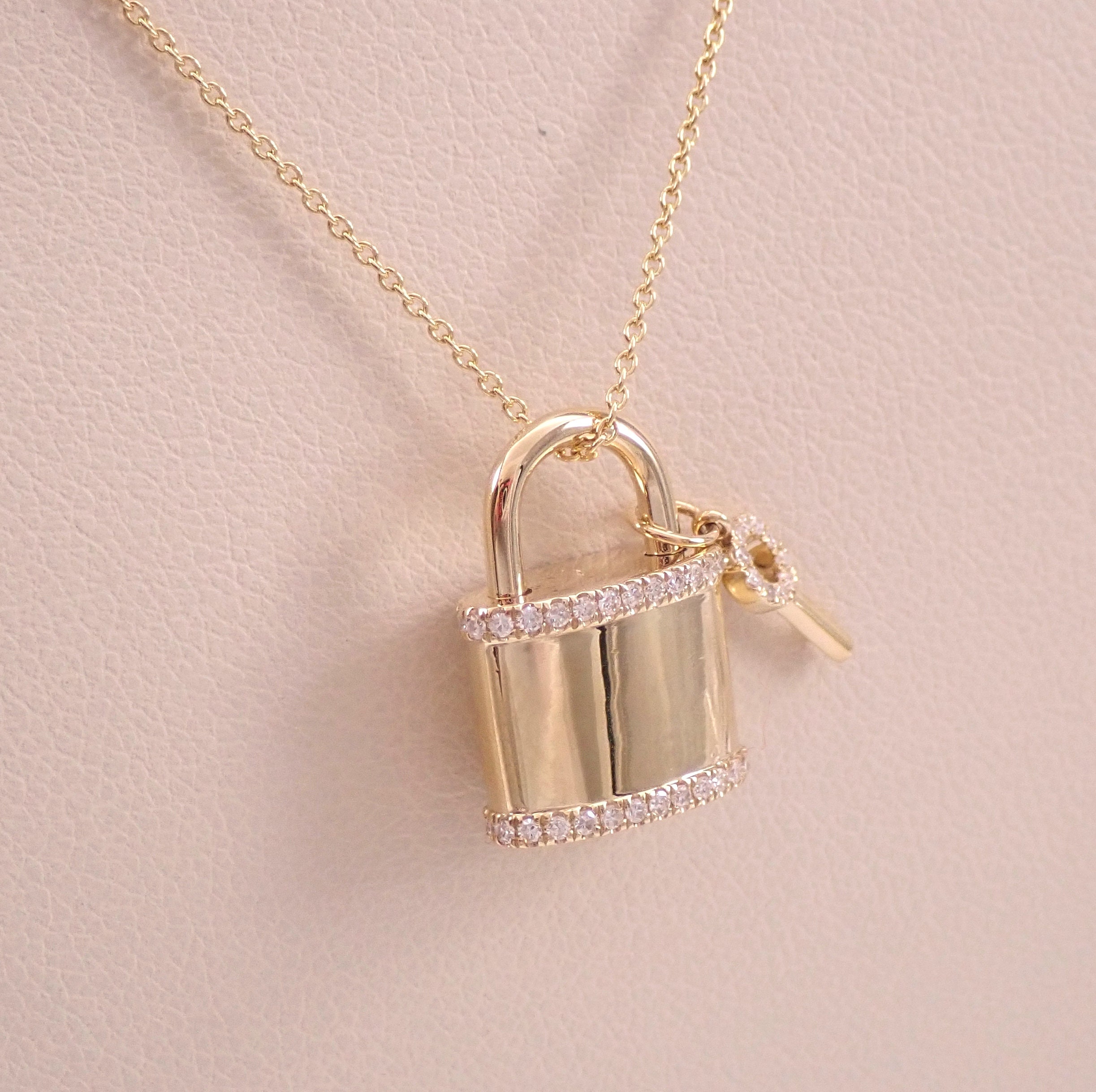 14K Yellow Gold Diamond LOCK and KEY Pendant with Chain. This necklace is set with sixty-two genuine Round Brilliant Diamonds. These diamonds are G color, SI1 clarity and combine to a total weight of .25 carat. The lock measures 15.5 X 11 mm and weighs 5.0 grams with the 18" included chain. The pendant and the chain are both 14K Yellow Gold and accompanied by an appraisal, valued at $2,285.00. The necklace will be shipped promptly in a gift box.