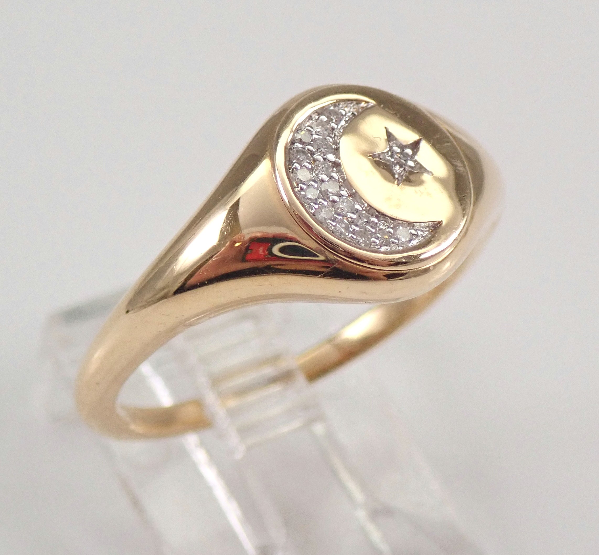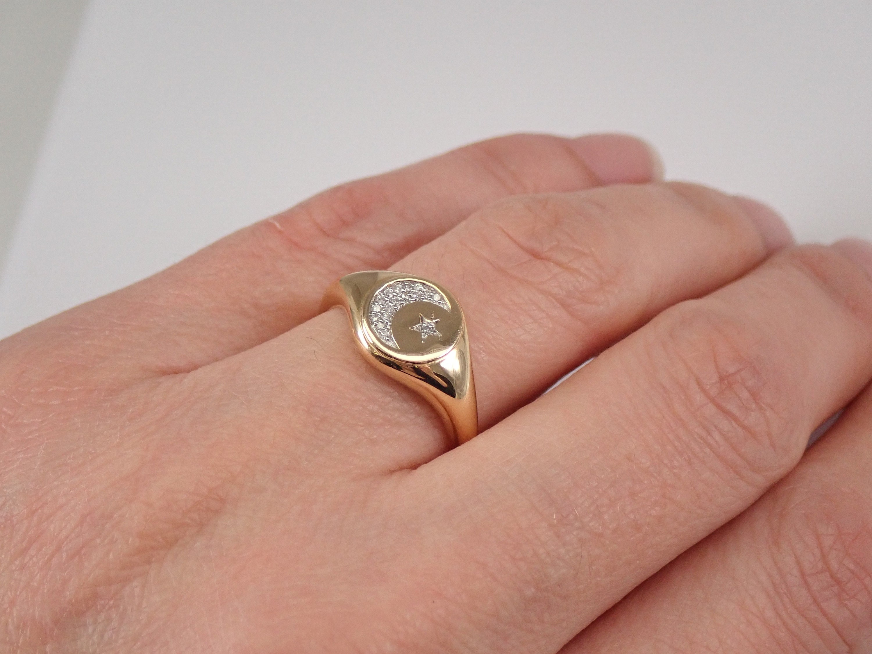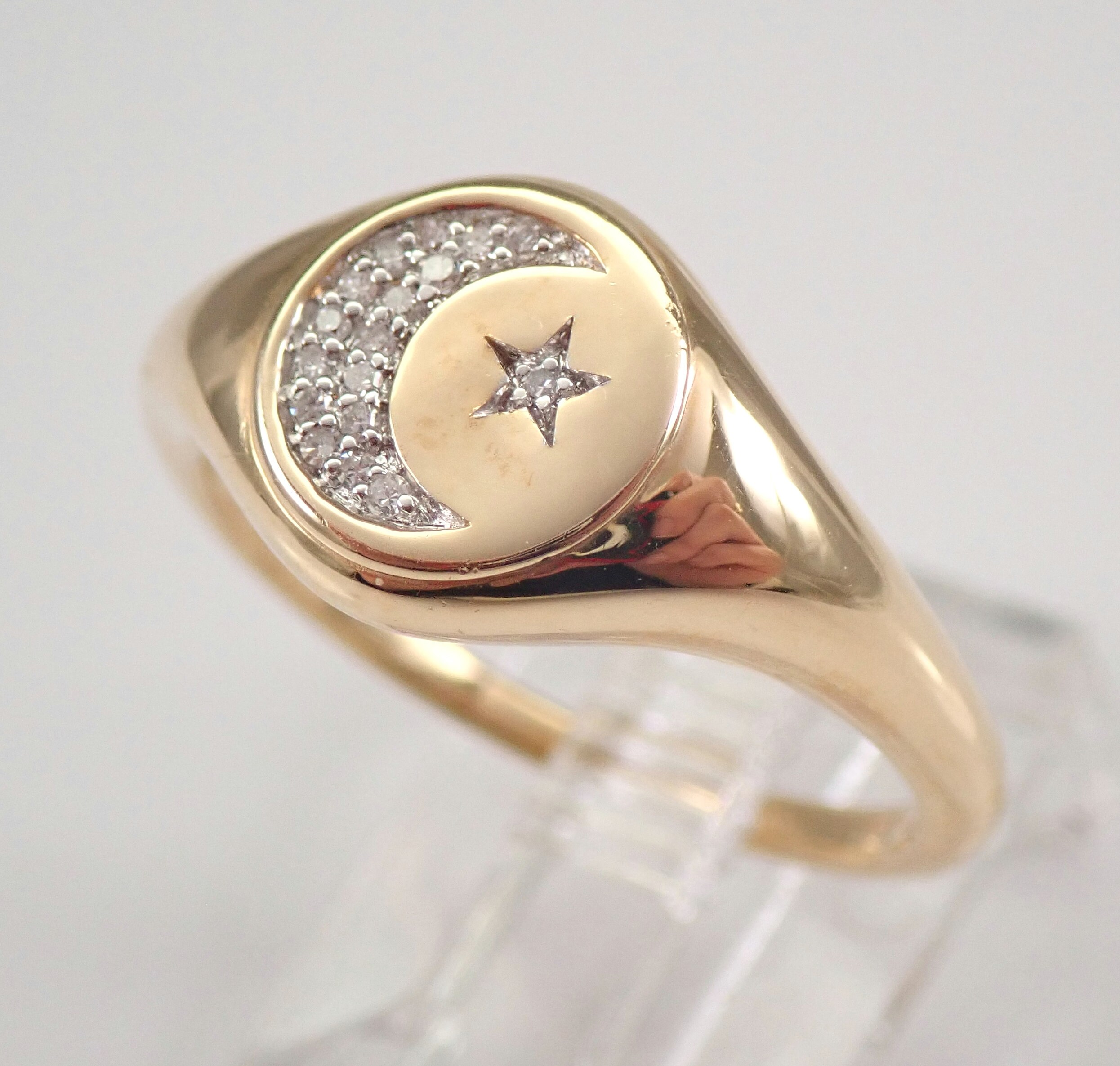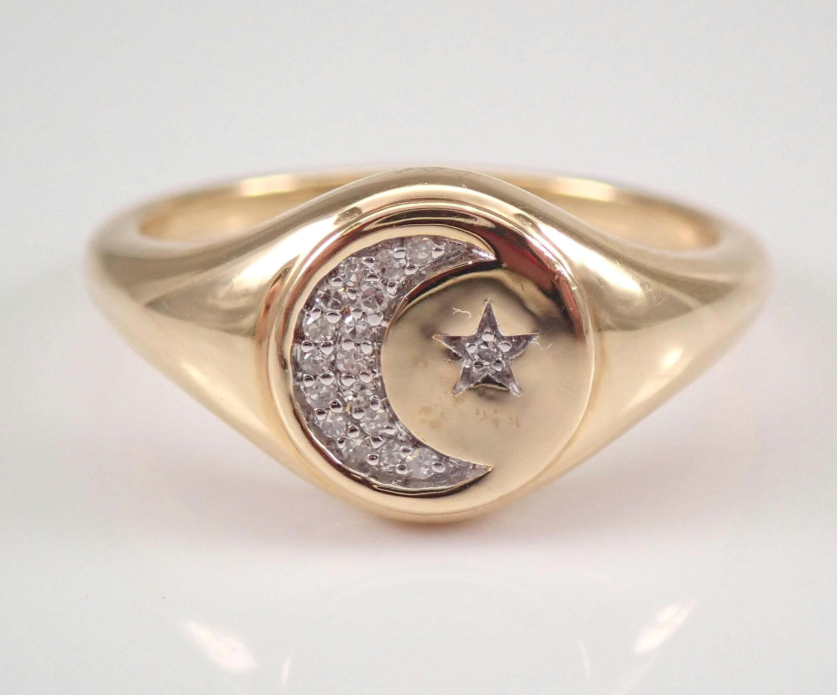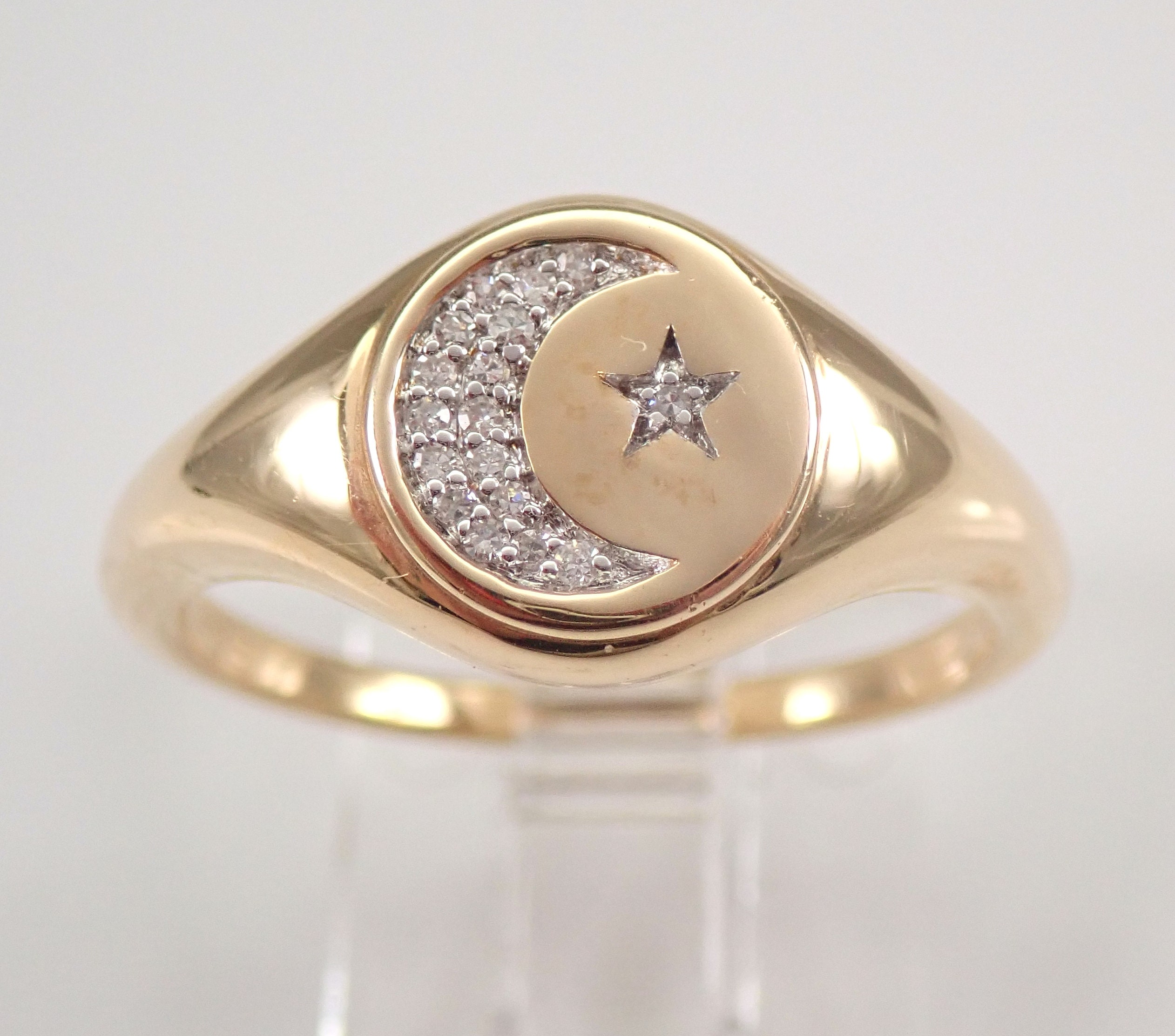 14K Yellow Gold Diamond Star and Moon Signet Ring. This ring is set with eighteen genuine Round Brilliant Diamonds. These diamonds are G/H color, SI clarity and weigh a total of .10 carats. This ring is 14KT Yellow Gold, weighs 3.4 grams and is a finger size 7, which can be resized (please inquire about sizing with the finger size that you need). This ring will be accompanied by an appraisal with the retail replacement value of $1,395.00. I will ship this ring promptly in a gift box.