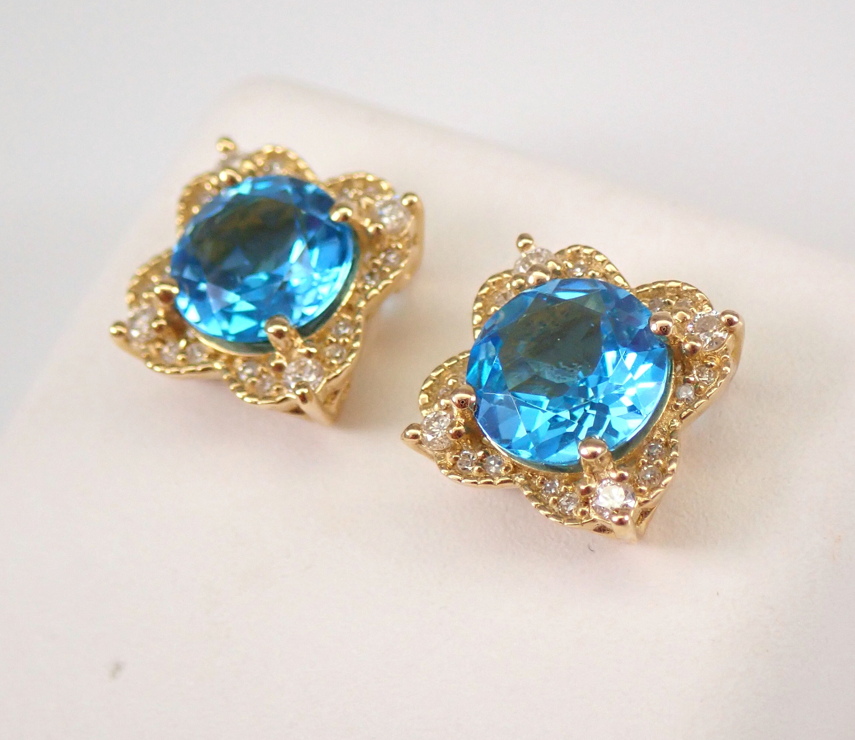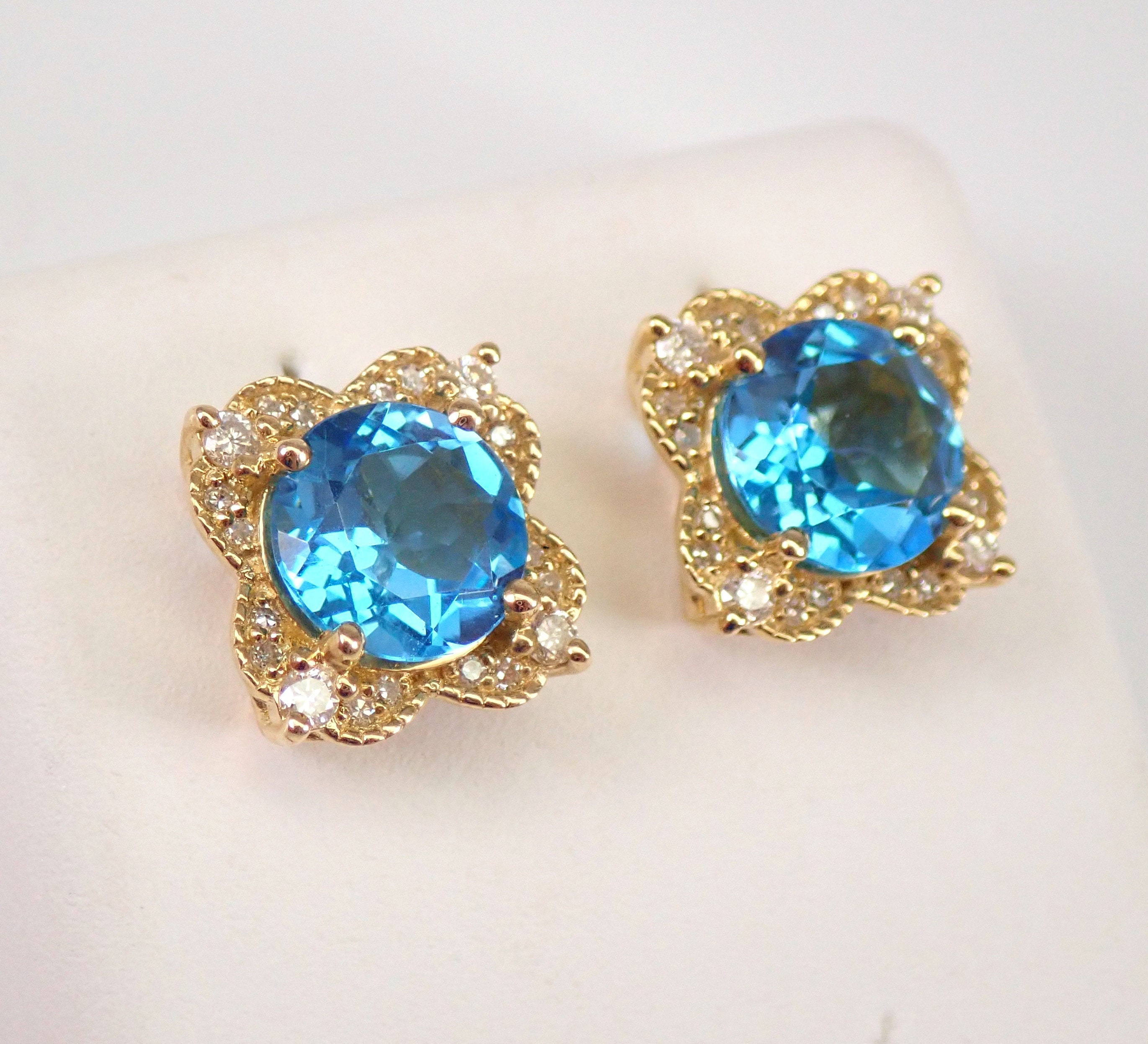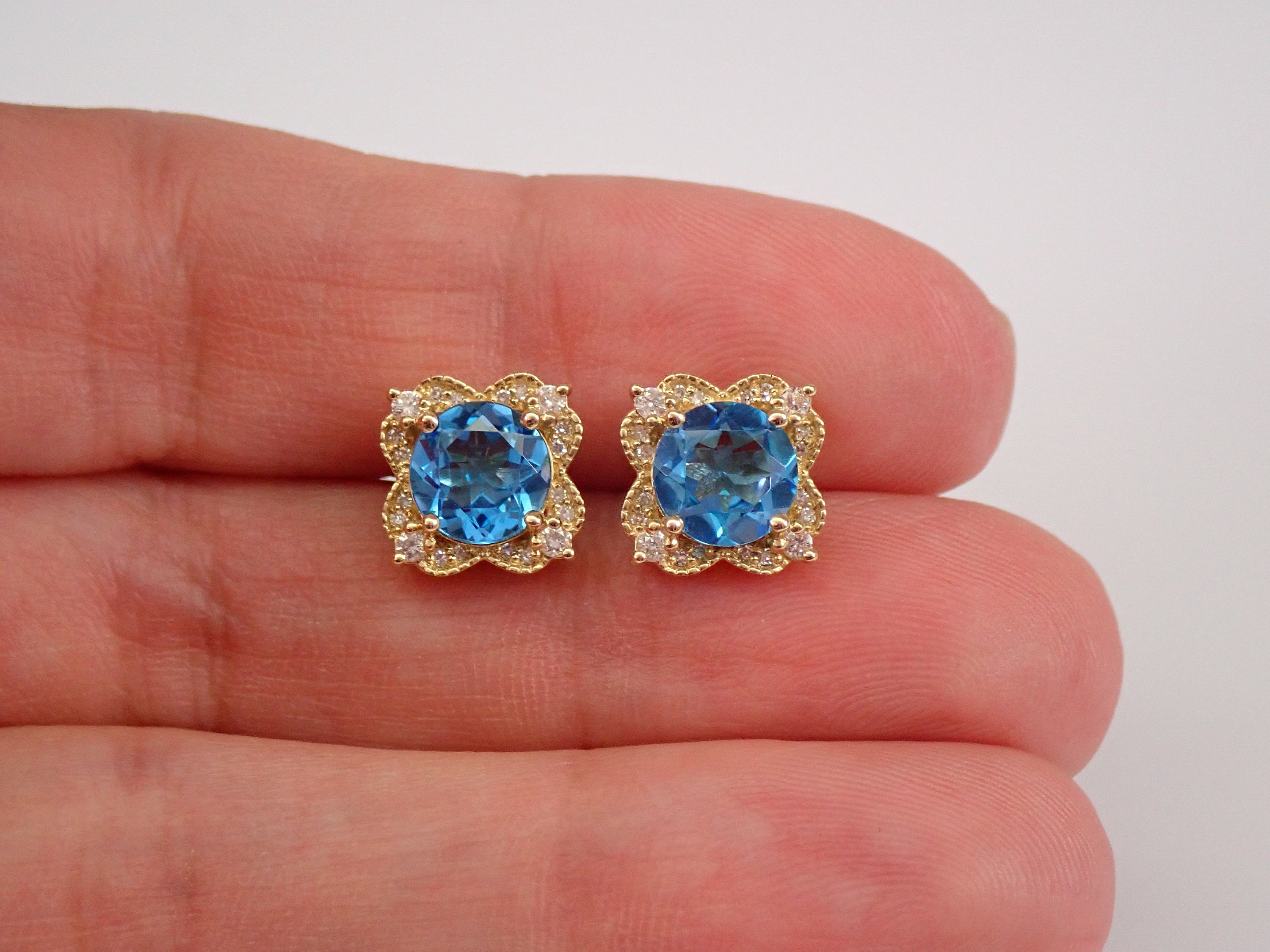 Yellow Gold Diamond and Blue Topaz Halo Stud Earrings.