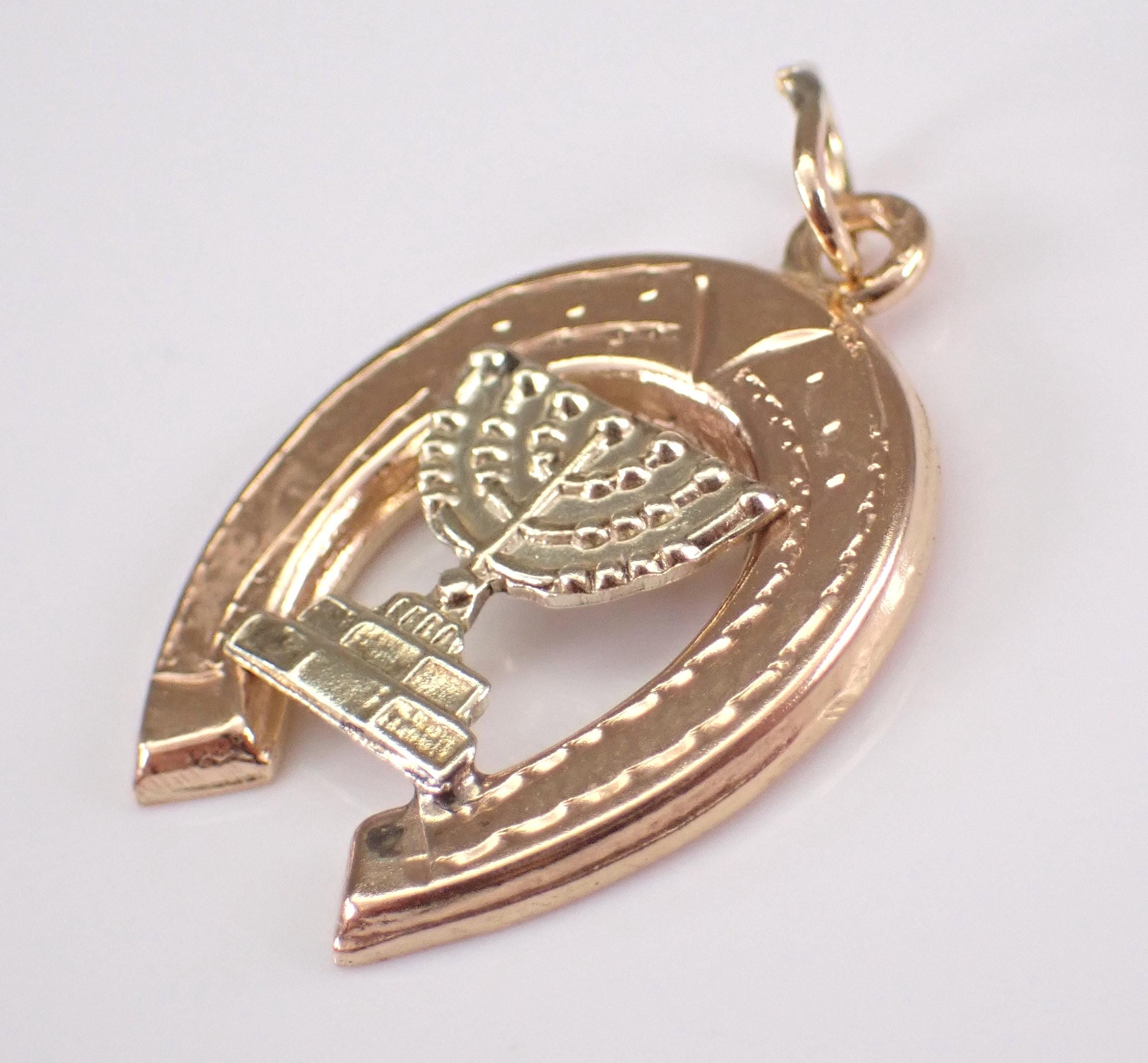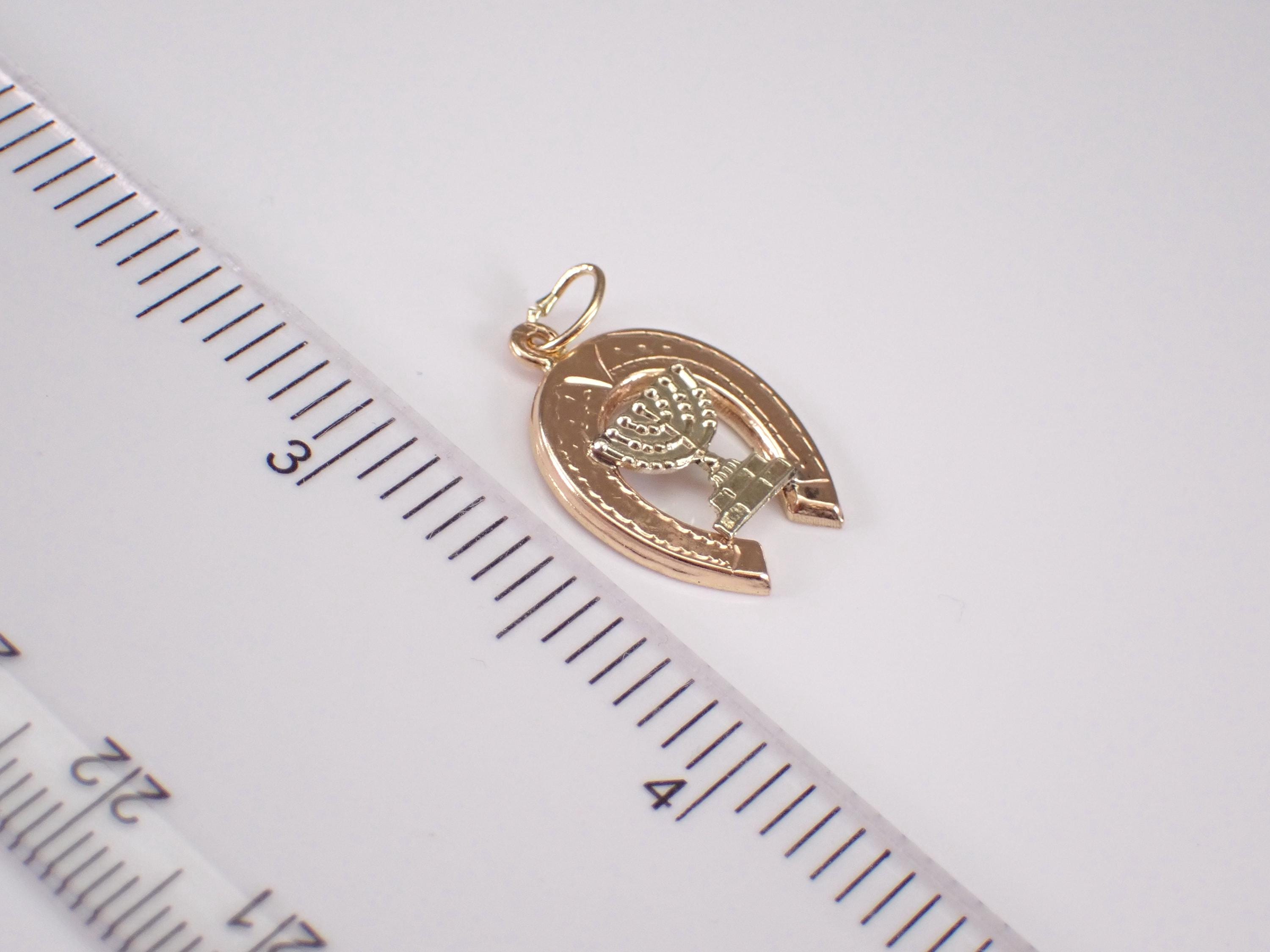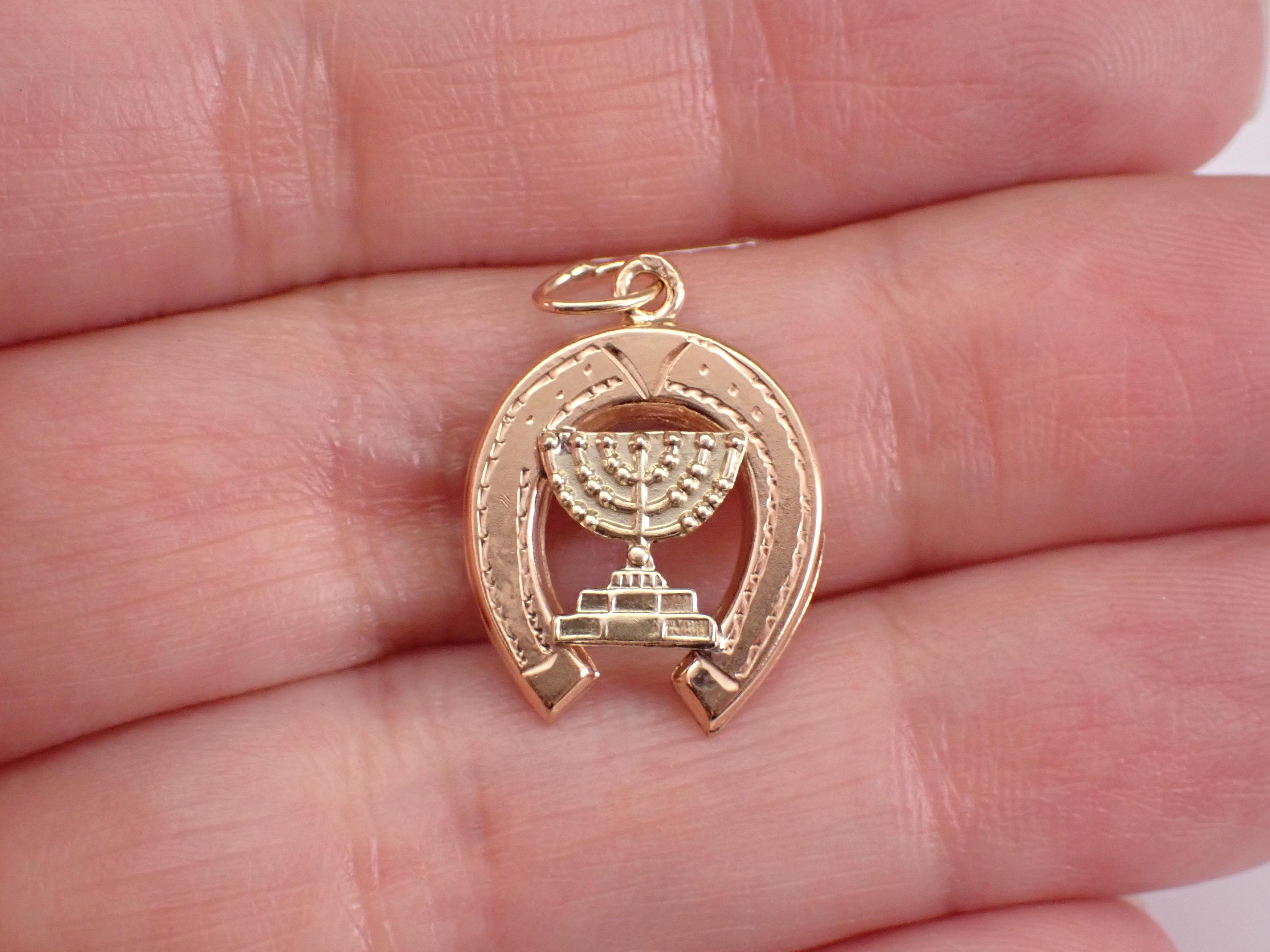 Vintage 14K Yellow Gold Menorah and Horseshoe Charm Pendant. This charm is 14K Two Toned Gold (acid tested) and measures 16.5 X 15 mm without the bail. This estate pendant weighs 1.3 grams. I will ship this pendant promptly in a gift pouch.