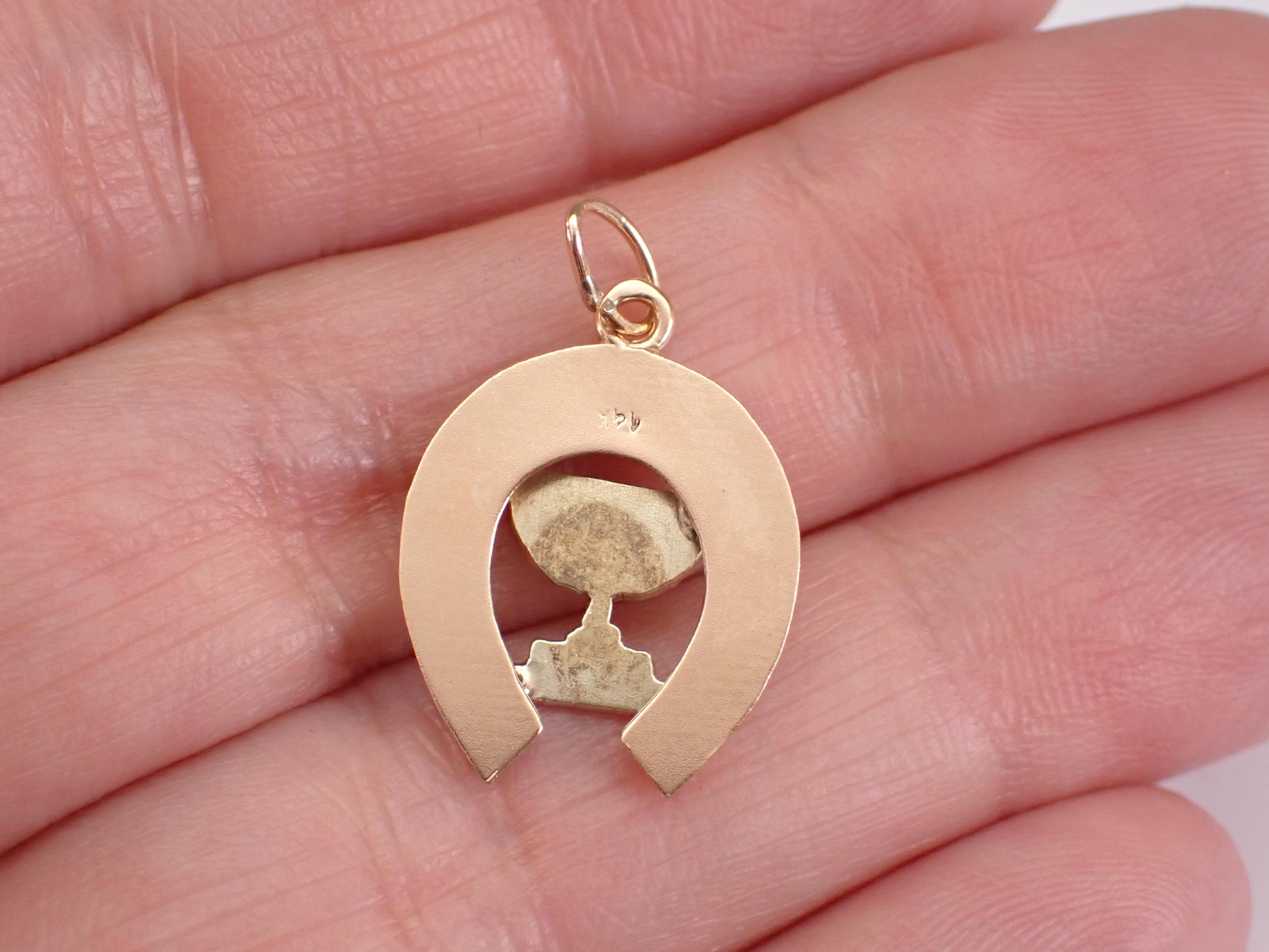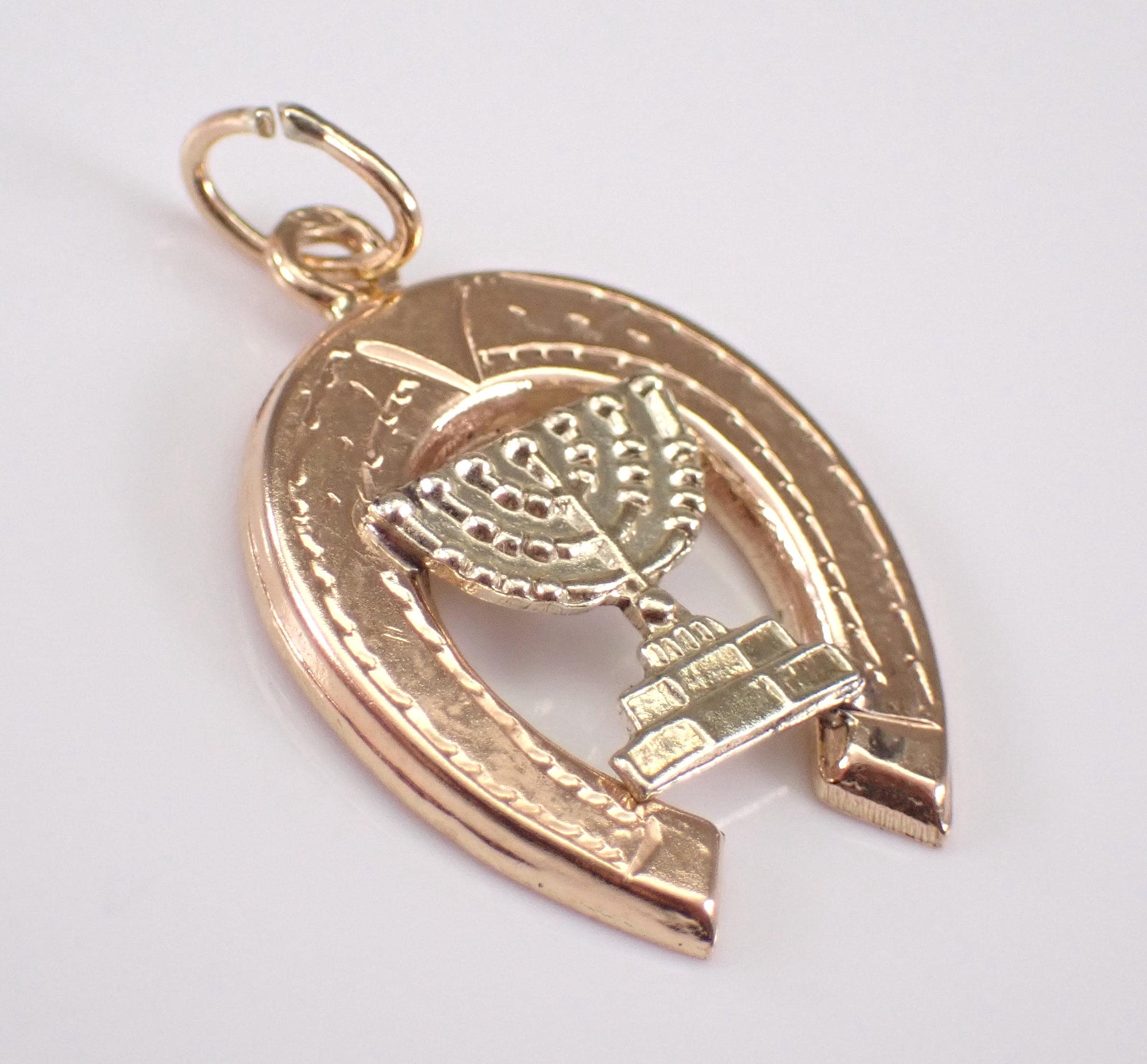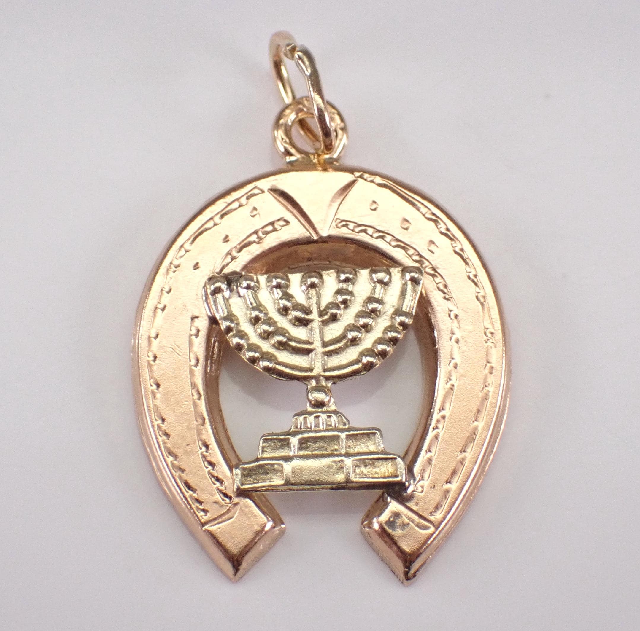 Vintage 14K Yellow Gold Menorah and Horseshoe Charm Pendant. This charm is 14K Two Toned Gold (acid tested) and measures 16.5 X 15 mm without the bail. This estate pendant weighs 1.3 grams. I will ship this pendant promptly in a gift pouch.