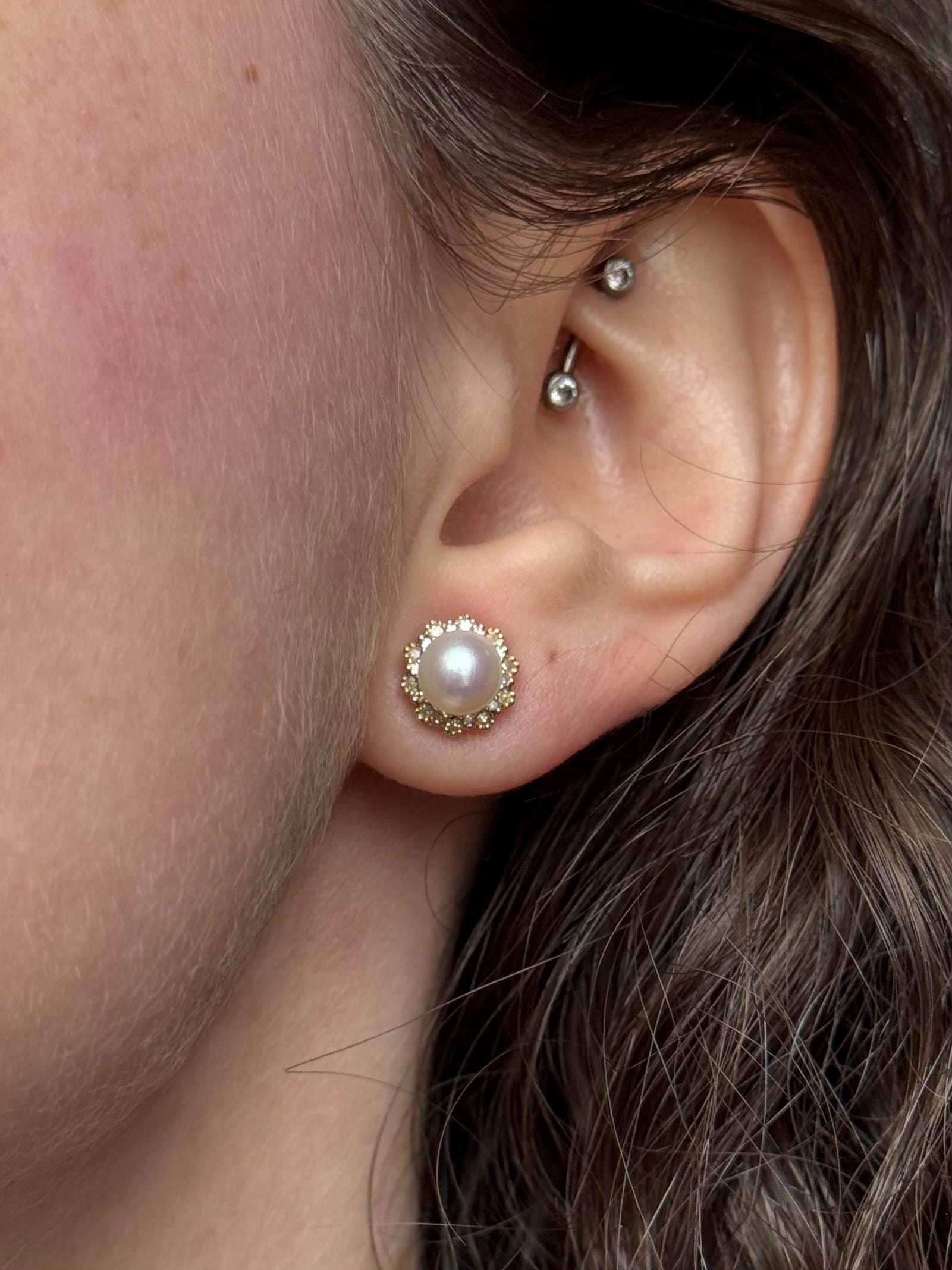 14K Yellow Gold Pearl and Diamond Halo Stud Earrings. These earrings are set with two Round White Pearls and forty genuine Round Diamonds. These Pearls measure 6.5 mm in diameter each. The Diamonds in these earrings are H color, I1 clarity and weigh a total of .18 carat. These earrings are 14KT Yellow Gold and weigh a total of 2.4 grams. These earrings are for pierced ears, measure 9 mm in diameter and the earrings have friction post backings. These earrings will be accompanied by an appraisal written by a GIA Certified Diamond Grader with the retail replacement value of $1,279.00. I will ship these earrings promptly in a gift box.