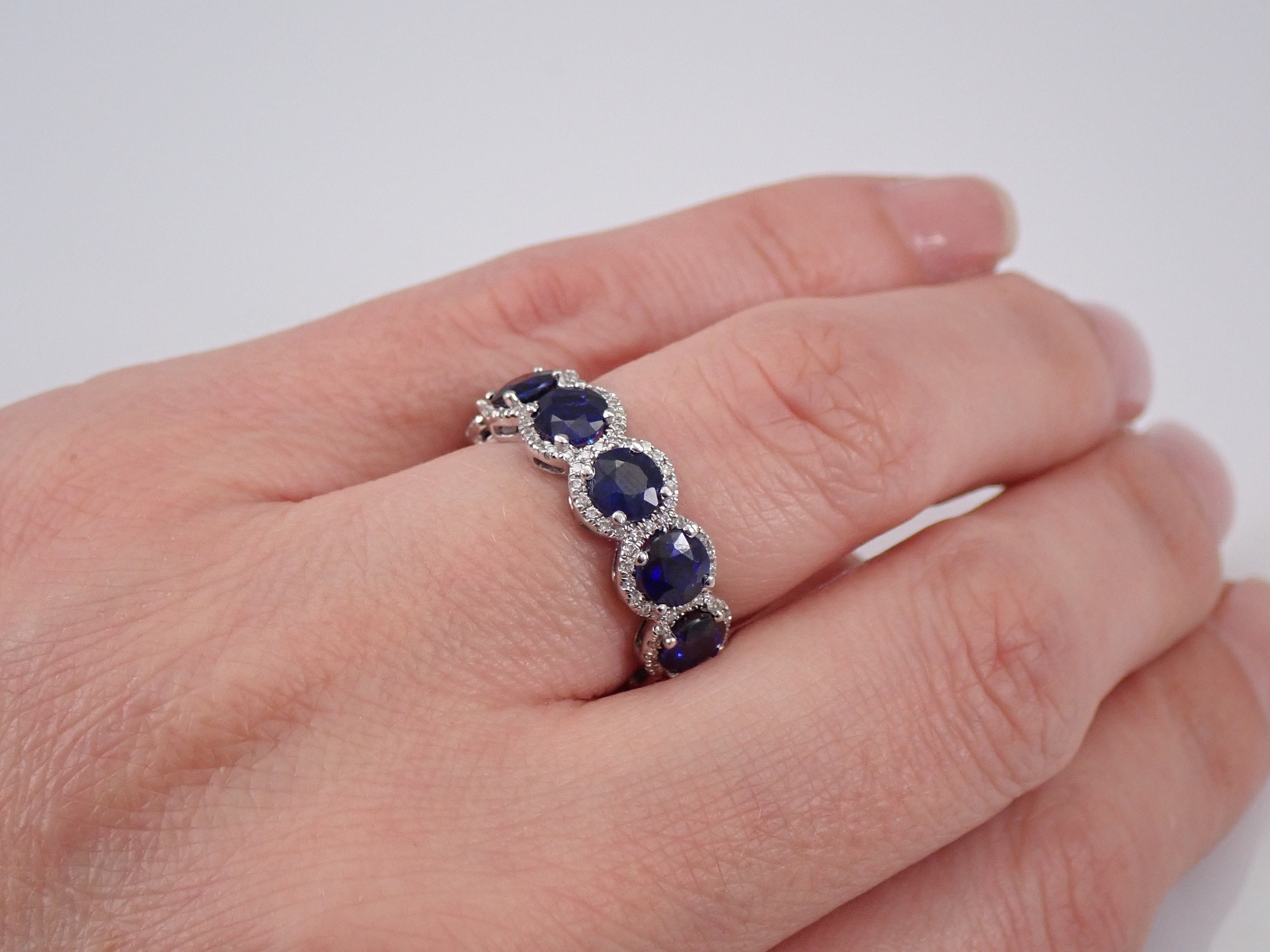 18K White Gold Diamond and Sapphire Wedding Eternity Ring Anniversary Band. This ring is set with eleven Round Blue Sapphires and one hundred and sixty-seven (167) genuine Round Brilliant Diamonds. These diamonds are H color, SI clarity and weigh a total of .69 carats. The Sapphires in this ring weigh a total of 5.64 carats. This ring is 18KT White Gold, weighs 5.2 grams, measures 7 mm in width and is a finger size 6 1/2. This ring will also be accompanied by an appraisal by a GIA Certified Diamond Grader with the replacement value of $9,285.00. I will ship this ring promptly in a beautiful gift box.