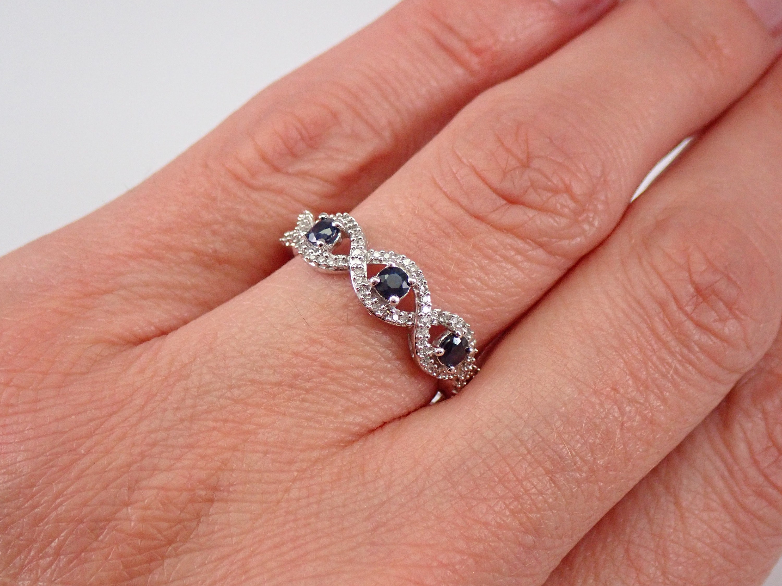 White Gold Diamond and Sapphire Wedding Ring Anniversary Band. This ring is set with seventy-two genuine Round Brilliant Diamonds and three natural Round Sapphires. These diamonds are H color, I1 clarity and weigh a total of .25 carat. The Sapphires in this ring weigh a total of .30 carat. This ring is 10KT White Gold, weighs 2.3 grams, the band measures 5.5 mm in width and is a finger size 7, can be resized (please inquire about sizing with the finger size you need). This ring will also be accompanied by an appraisal by a GIA Certified Diamond Grader with the replacement value of $1,379.00. I will ship this ring promptly in a beautiful gift box.