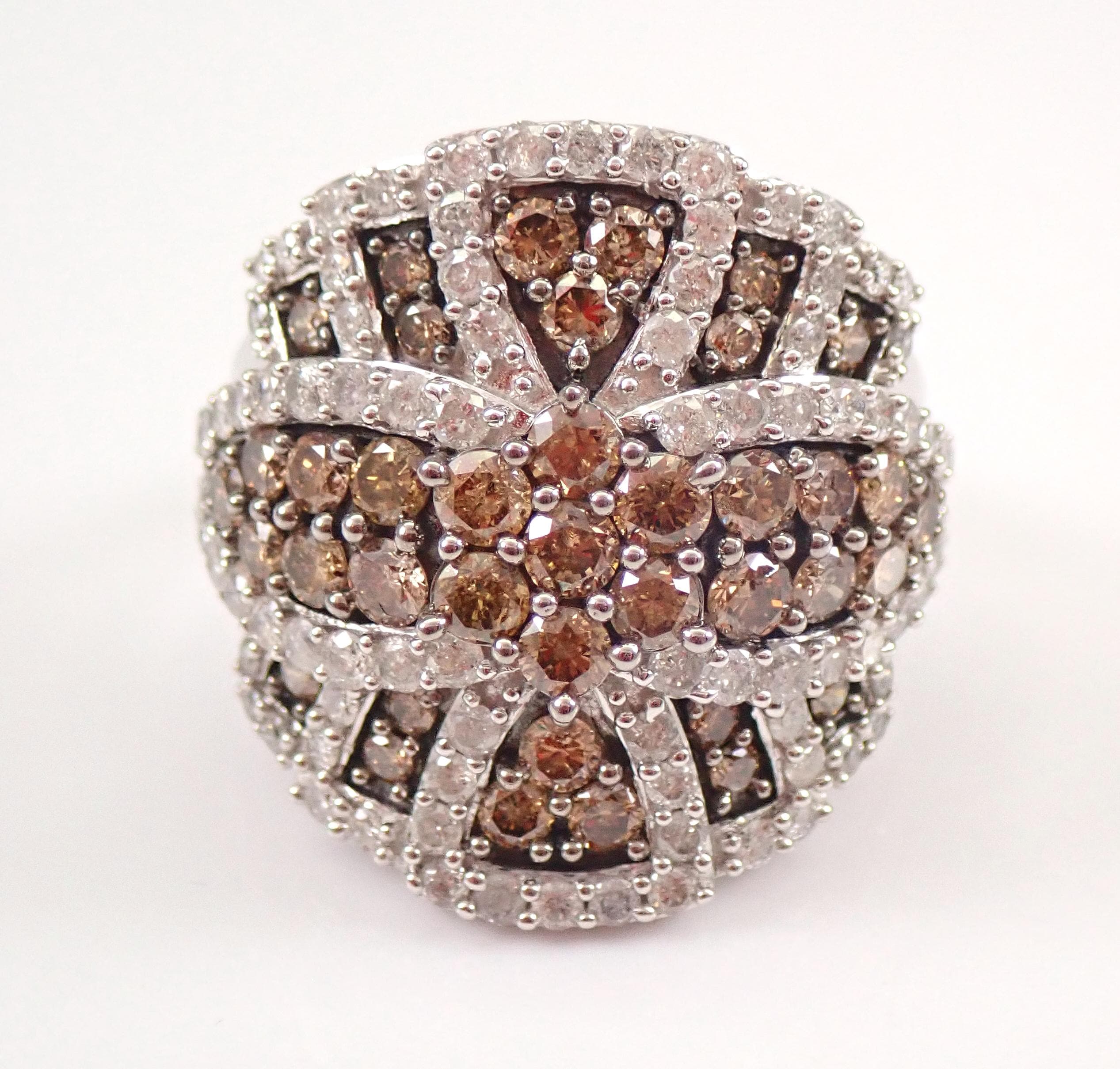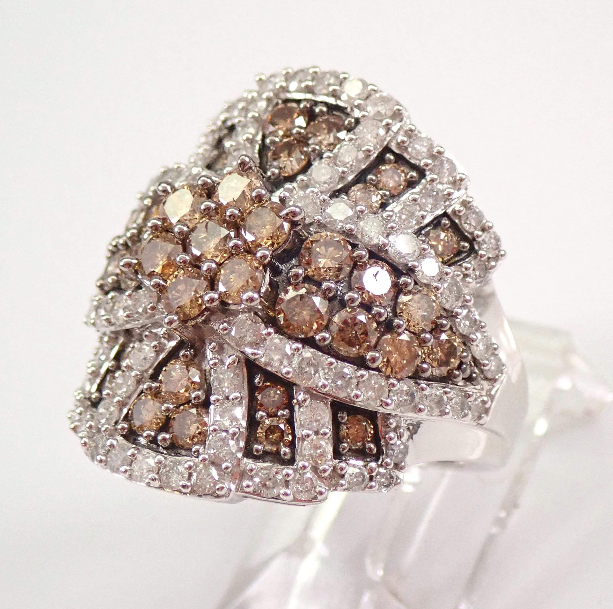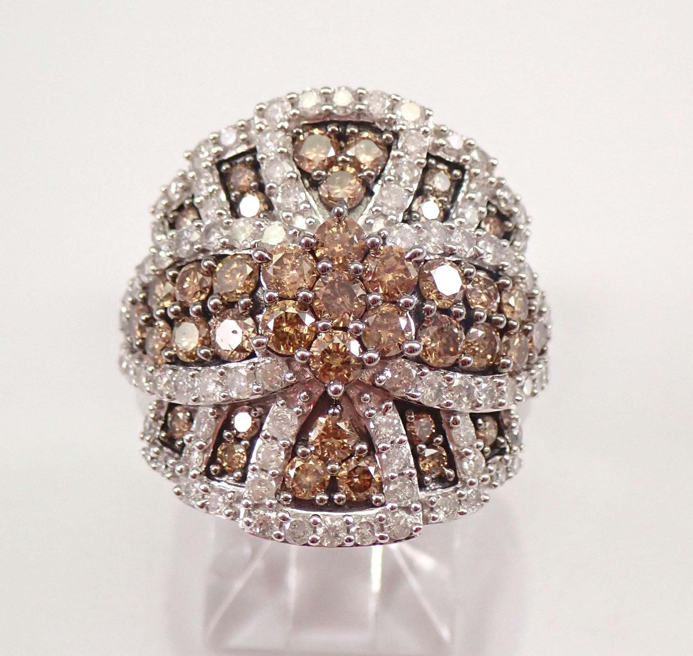White Gold Cognac and White Diamond Cluster Ring. This ring is set with thirty-three natural Round Brilliant Cognac colored Diamonds and eighty-four genuine Round Brilliant White Diamonds. These diamonds are H color (white diamonds), SI2/I1 clarity and weigh a total of 3.00 carats. This ring is 10KT White Gold, weighs 8.0 grams, measures 22 mm in width and is a finger size 7, which can be slightly sized (please inquire about sizing with the finger size you need). The ring will be accompanied by an appraisal by a GIA Certified Diamond Grader with the retail replacement value of $3,895.00. I will ship this ring promptly in a gift box.