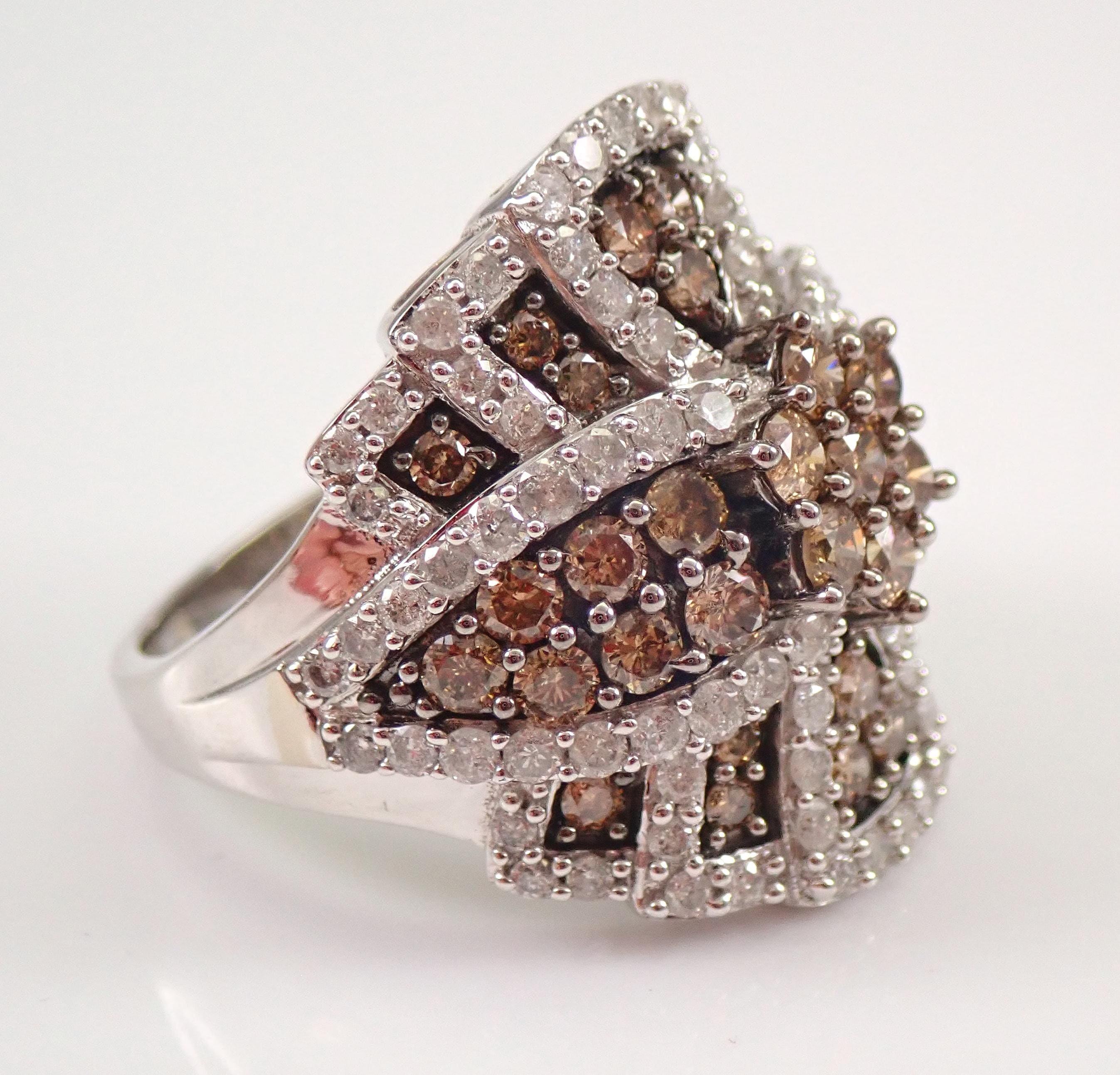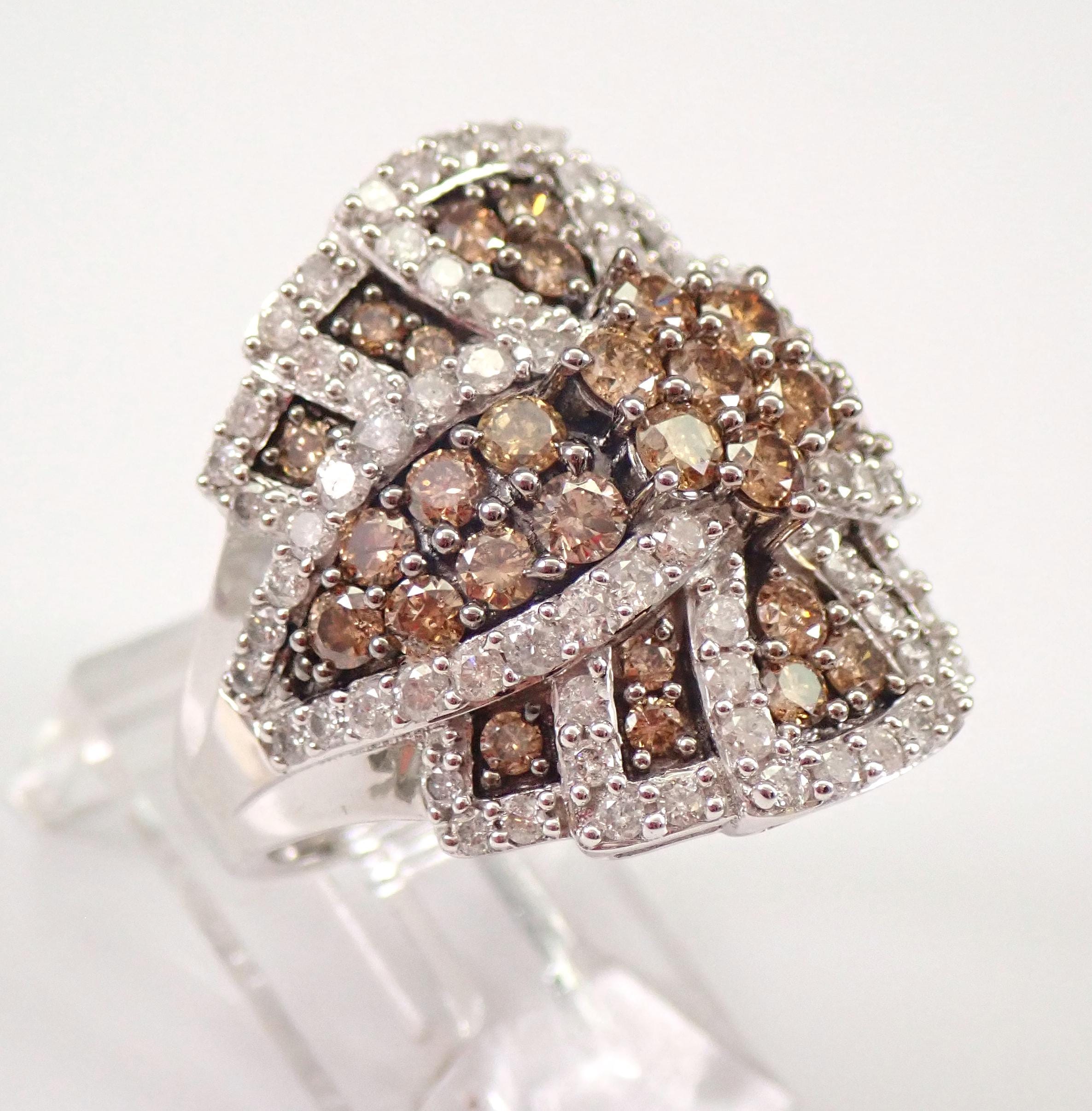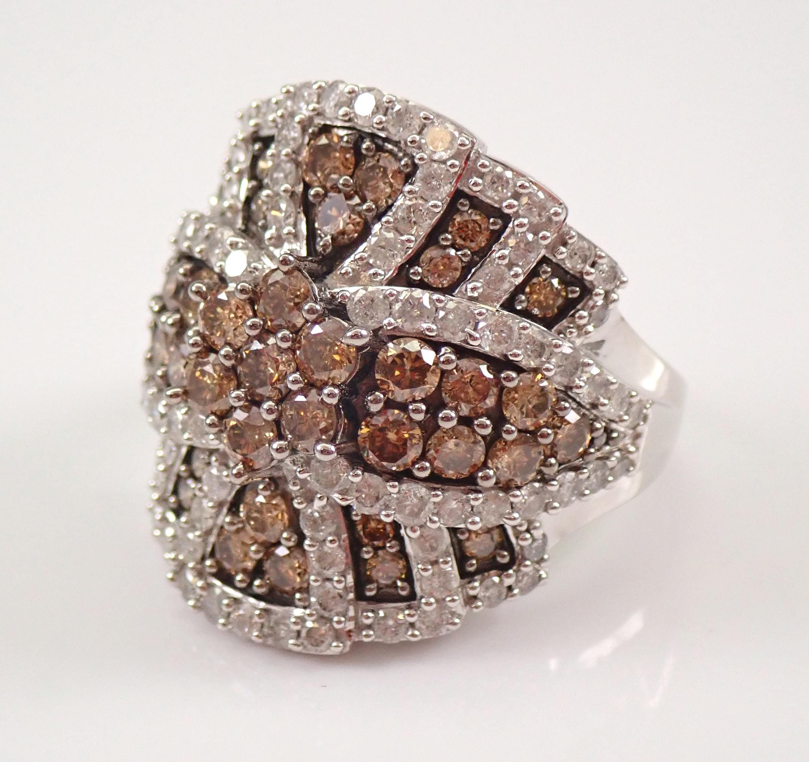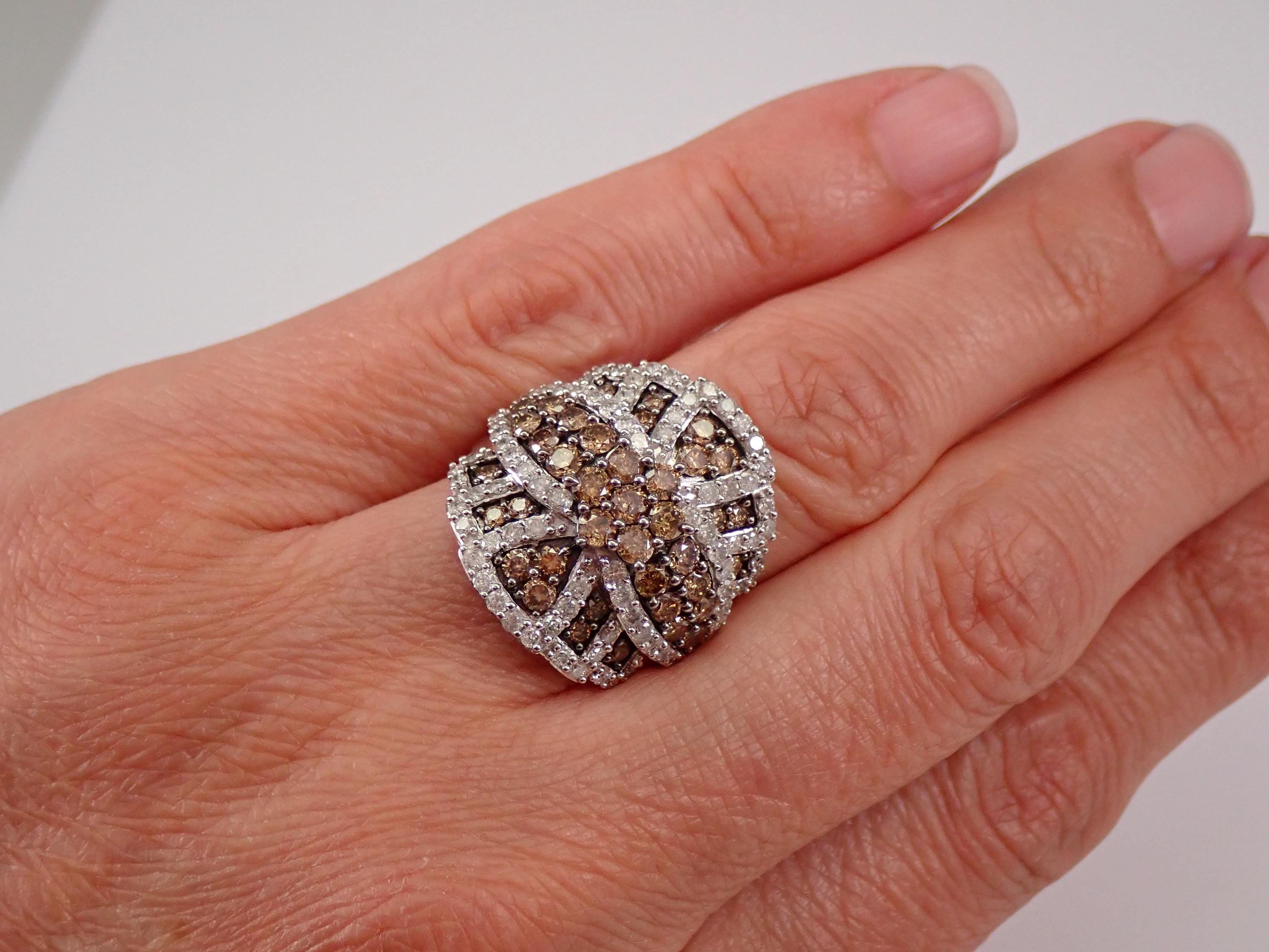 White Gold Cognac and White Diamond Cluster Ring. This ring is set with thirty-three natural Round Brilliant Cognac colored Diamonds and eighty-four genuine Round Brilliant White Diamonds. These diamonds are H color (white diamonds), SI2/I1 clarity and weigh a total of 3.00 carats. This ring is 10KT White Gold, weighs 8.0 grams, measures 22 mm in width and is a finger size 7, which can be slightly sized (please inquire about sizing with the finger size you need). The ring will be accompanied by an appraisal by a GIA Certified Diamond Grader with the retail replacement value of $3,895.00. I will ship this ring promptly in a gift box.