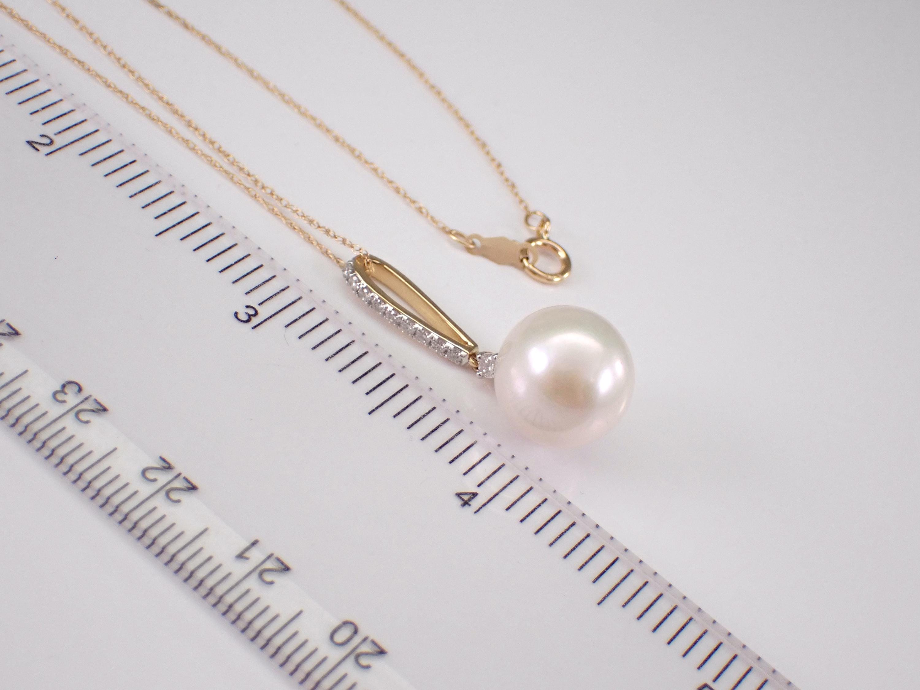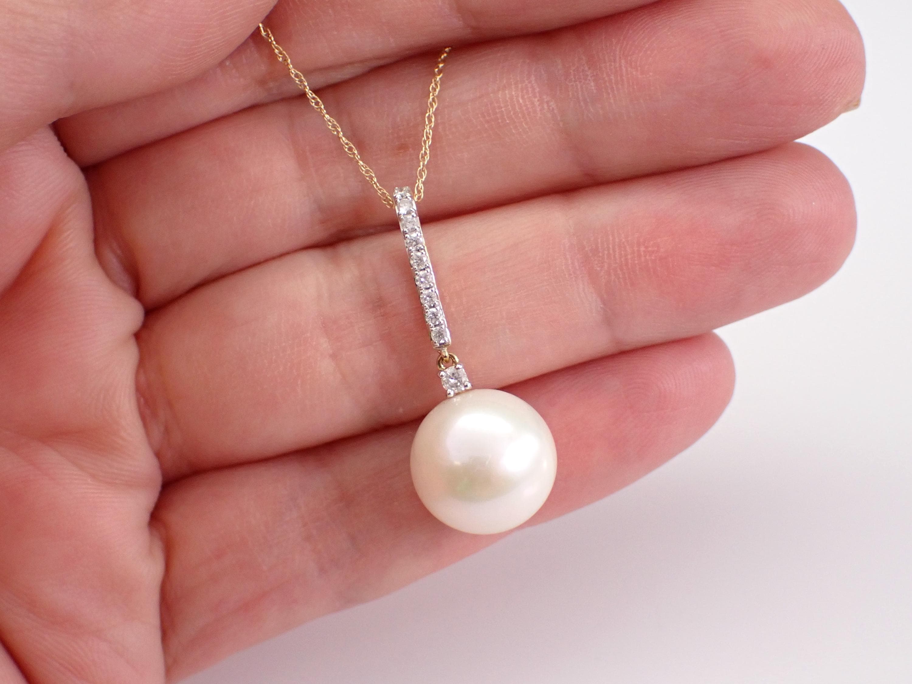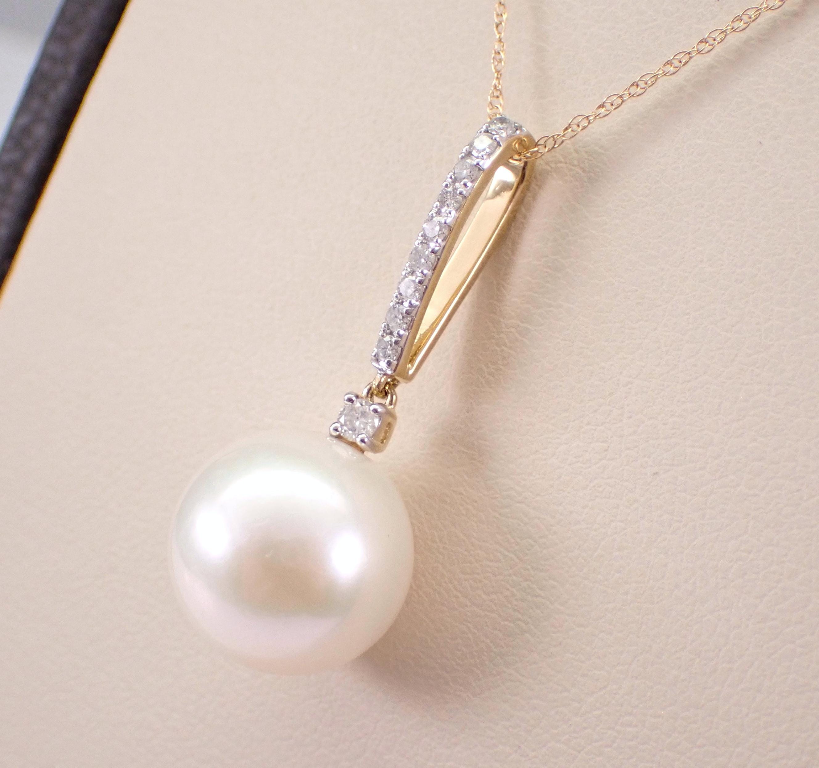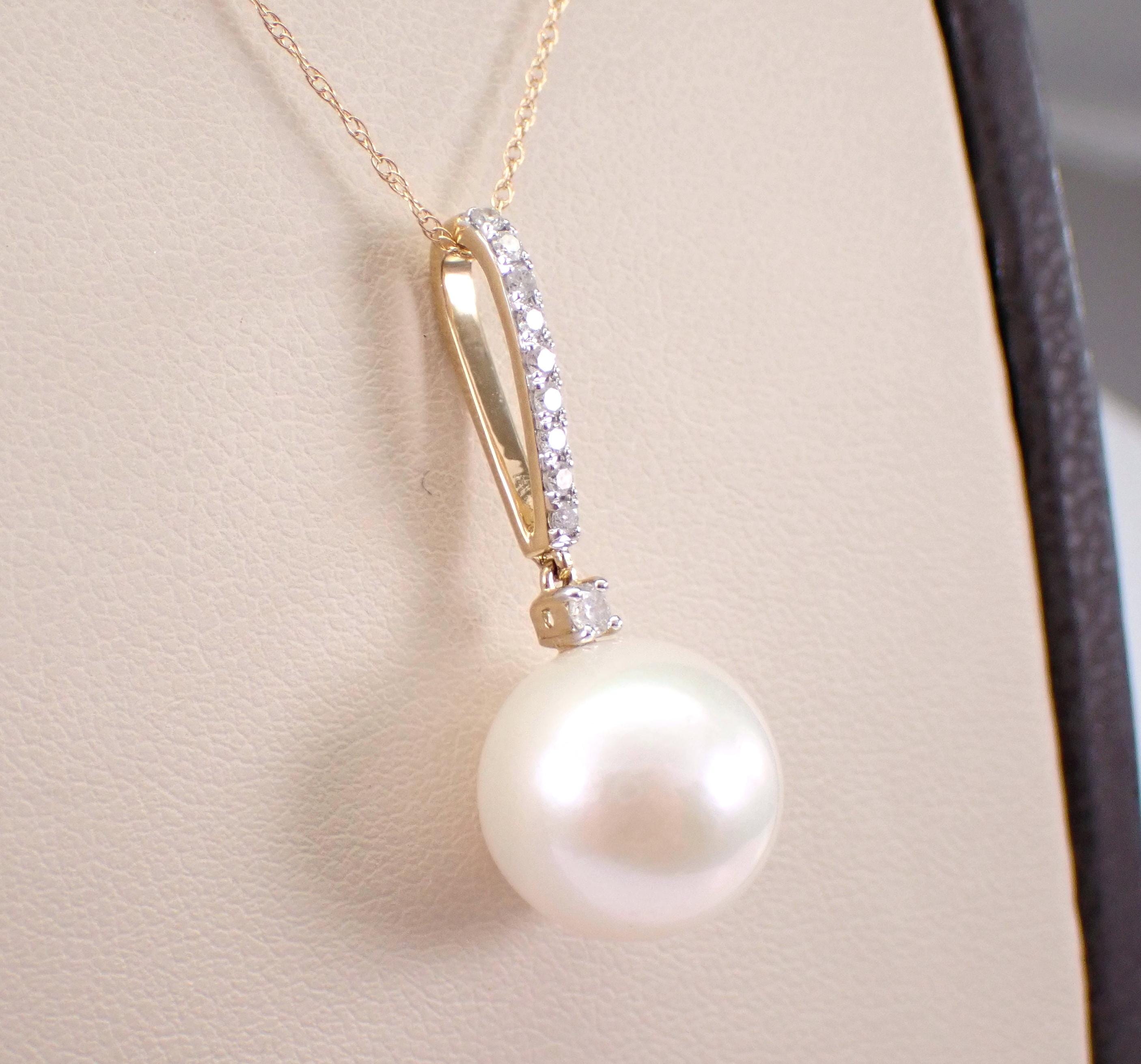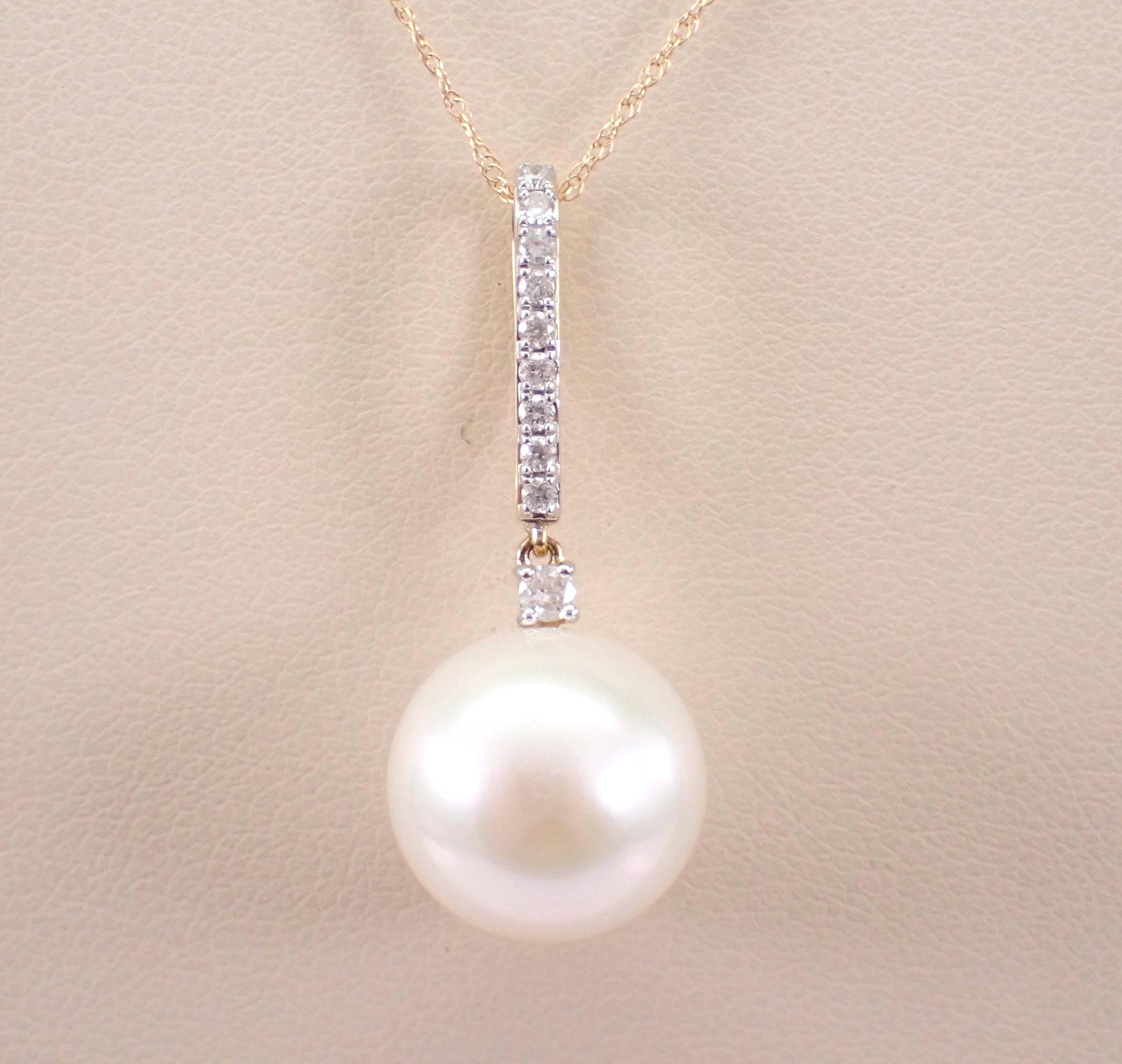 14K Yellow Gold Diamond and Pearl Pendant Necklace with Chain. This pendant is set with one Cultured Pearl and ten genuine Round Brilliant Diamonds. The diamonds in this pendant are G/H color, I1 clarity and weigh a total of .15 carat. The pearl in this pendant measures 12.6 mm in diameter. This pendant comes with an 18" 14KT Yellow Gold chain. The pendant along with the chain weigh a total of 4.0 grams and the pendant measures 31 mm in length. This necklace will be accompanied by an appraisal written by a GIA Certified Diamond Grader with the retail replacement value of $1,685.00. I will ship this necklace promptly in a beautiful gift box.