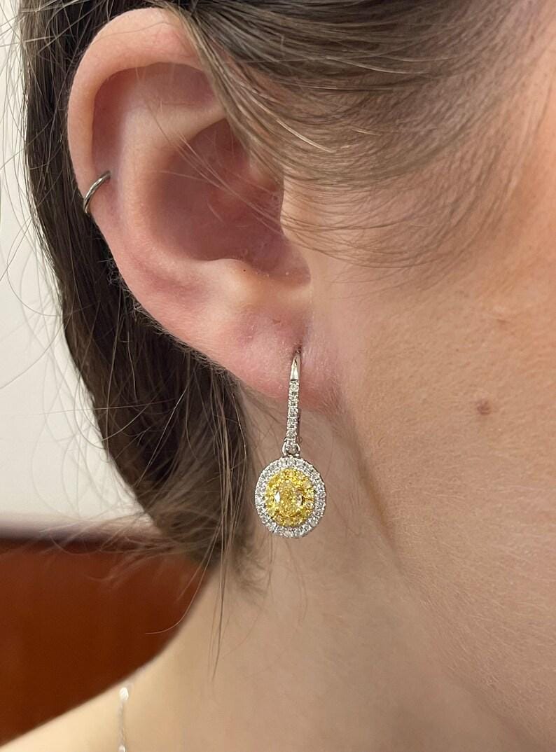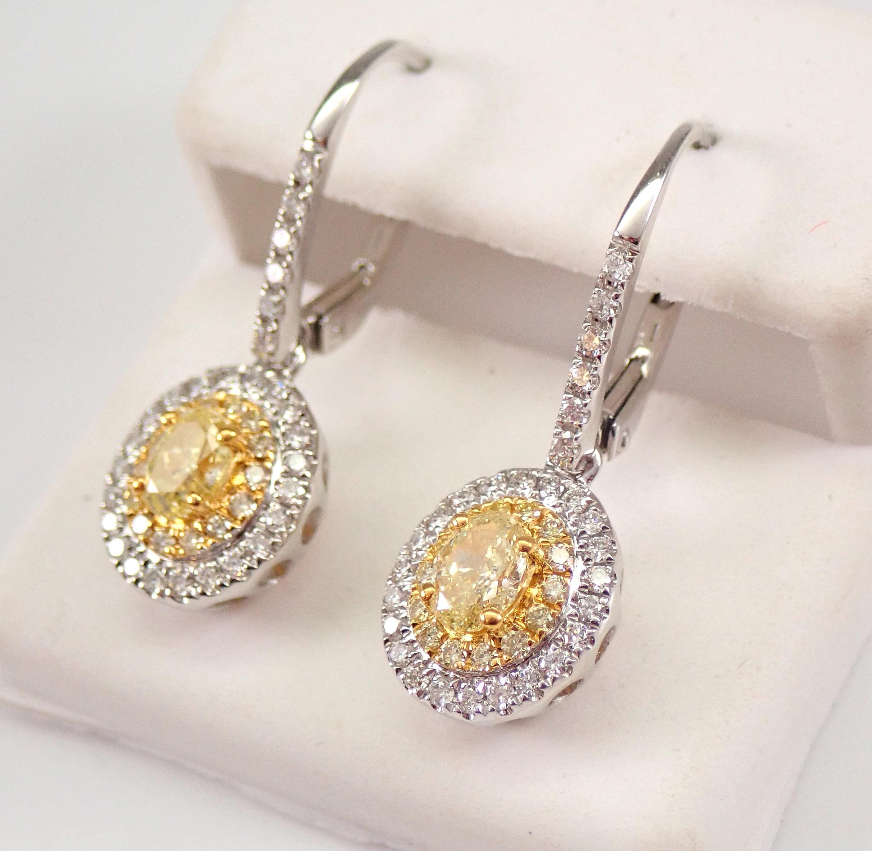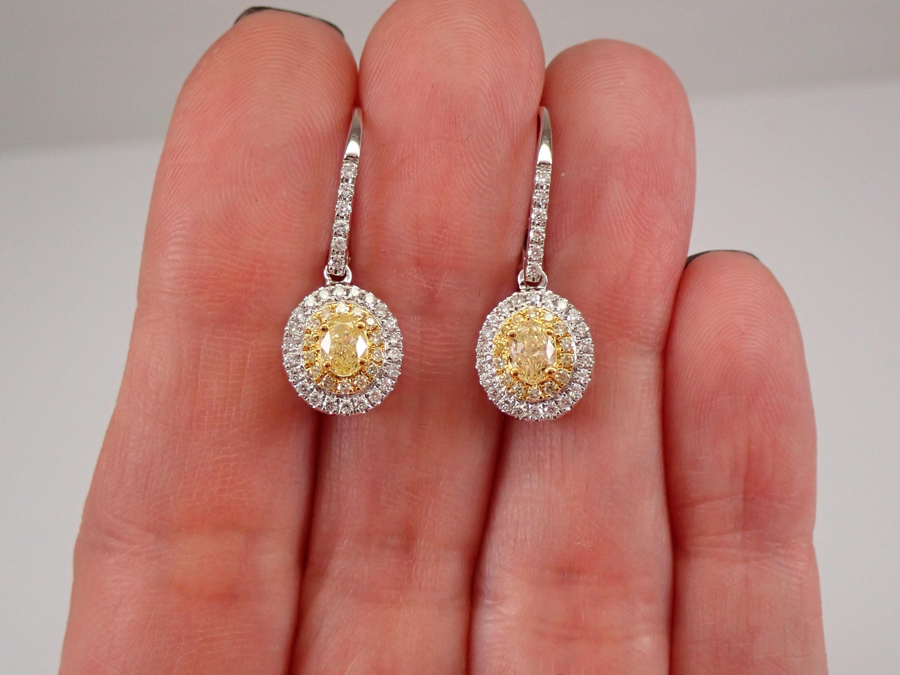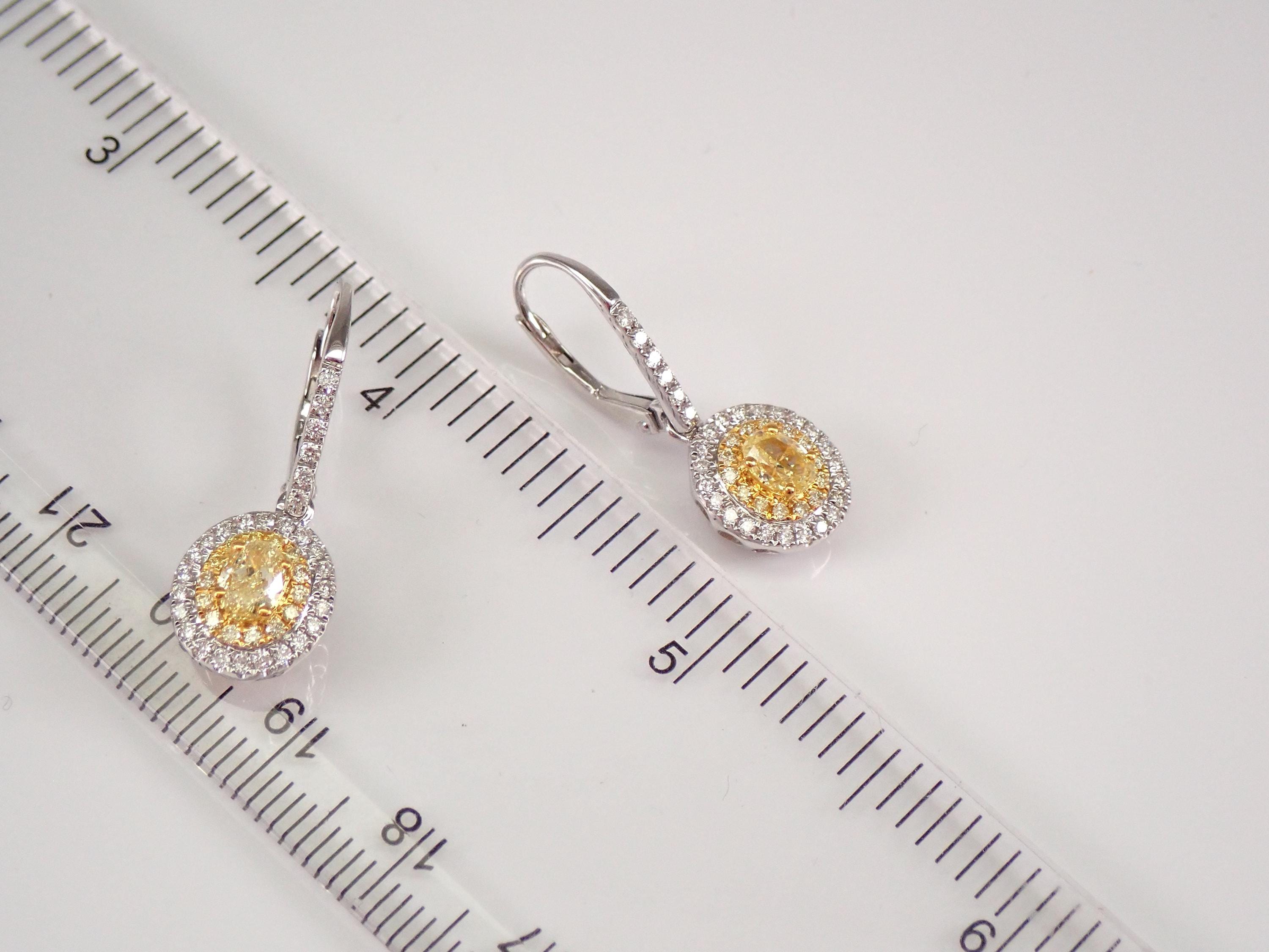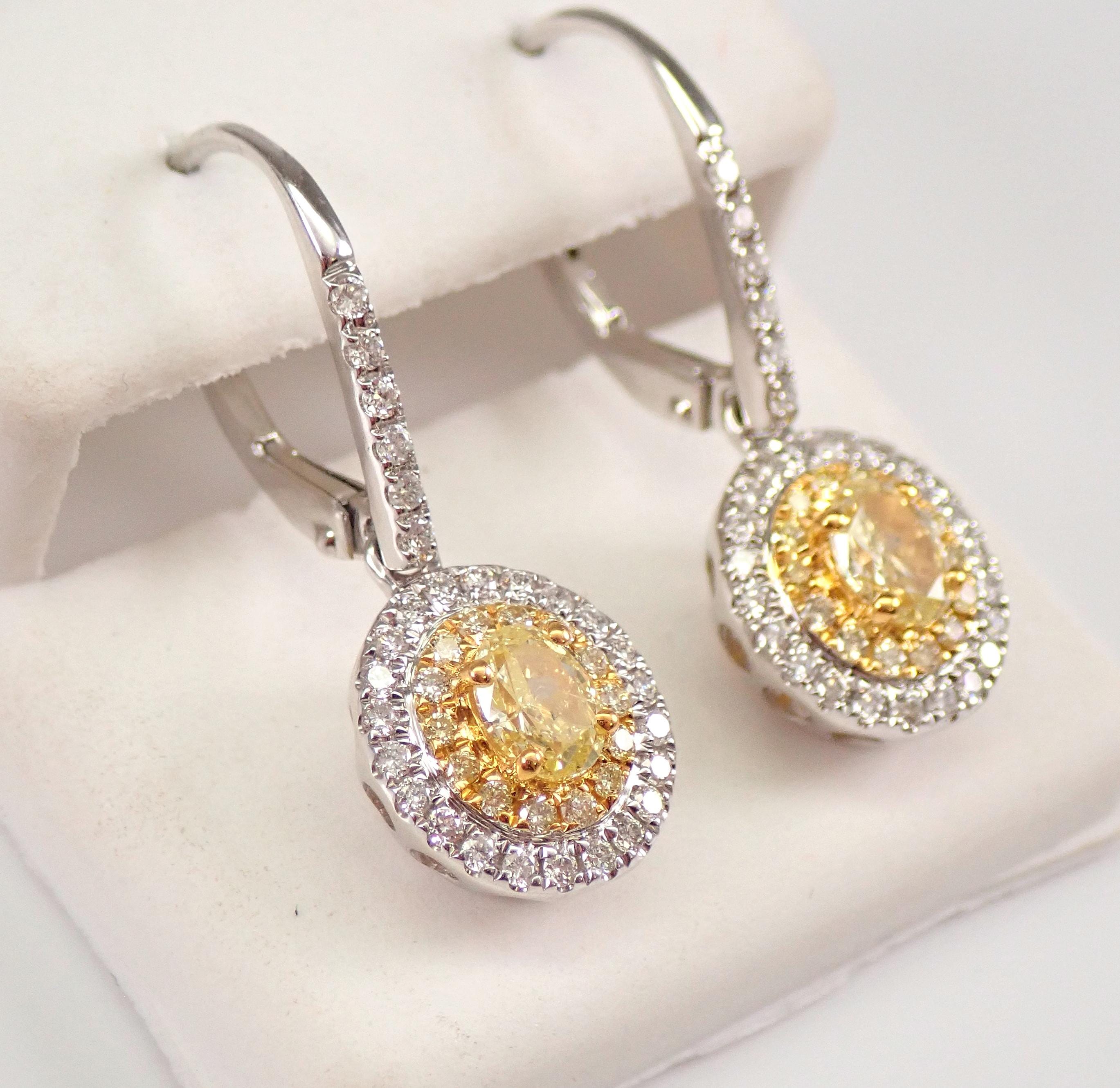 18K White Gold Diamond Halo Dangle Drop Earrings. These earrings are set with one Oval Brilliant Canary Diamond in the center of each earring. These Canary Diamonds are natural yellow color, are SI1 in clarity and weigh a total of .64 carat. There are also fourteen natural Round Brilliant Canary small Diamonds and twenty-eight natural Round Brilliant White Diamonds set in EACH earring. These Diamonds are very sparkly and brilliant, H color (white), SI clarity and amount to a total weight of .48 carat. These earrings are 18K White Gold (the yellow diamonds are set in yellow gold), weigh 4.6 grams and measure 26 mm in length. These earrings are for pierced ears and have secure leverback clasps. These earrings will be accompanied by an appraisal written by a GIA Certified Diamond Grader with the retail replacement value of $5,895.00. I will ship these earrings promptly in a gift box.