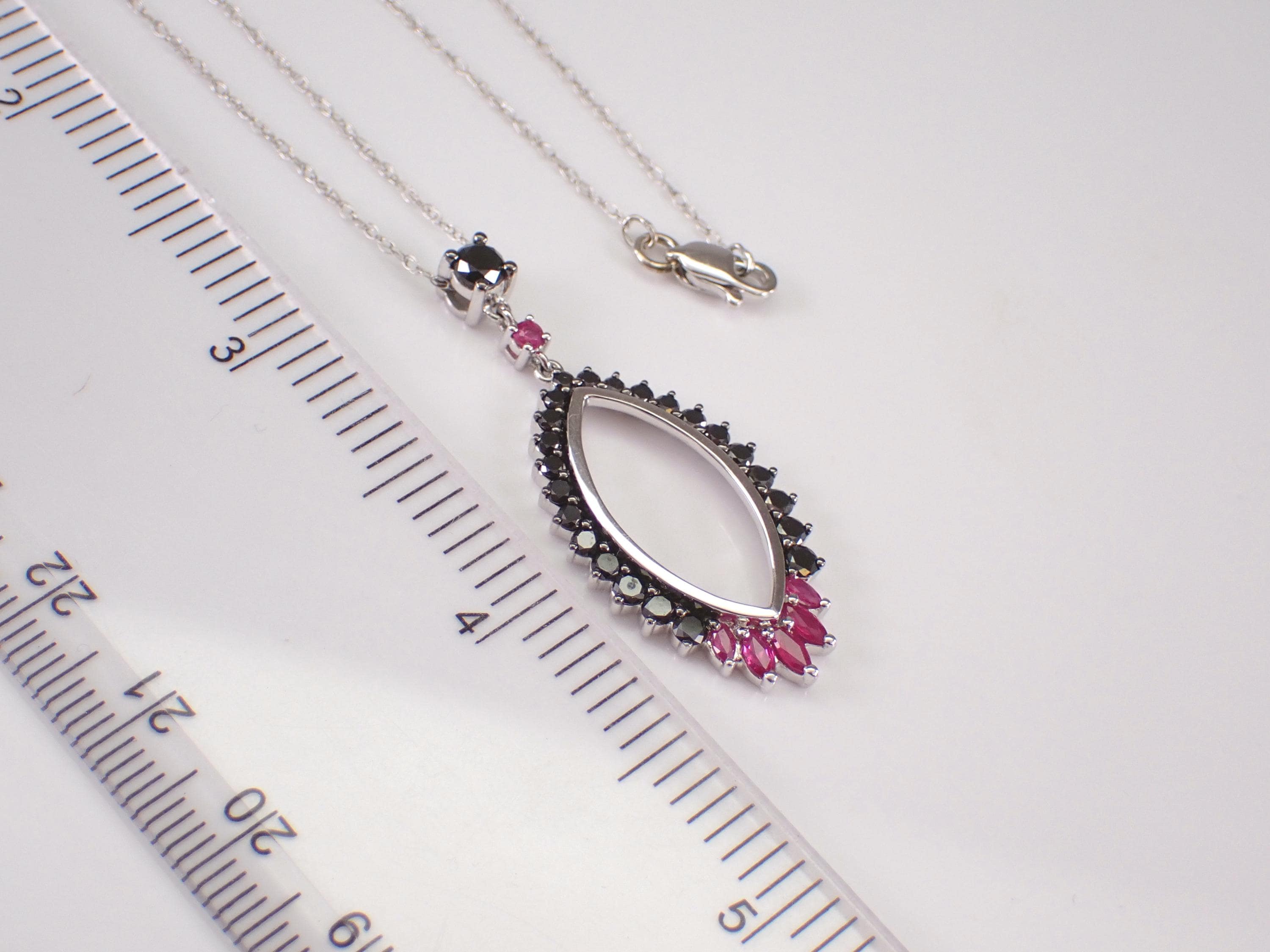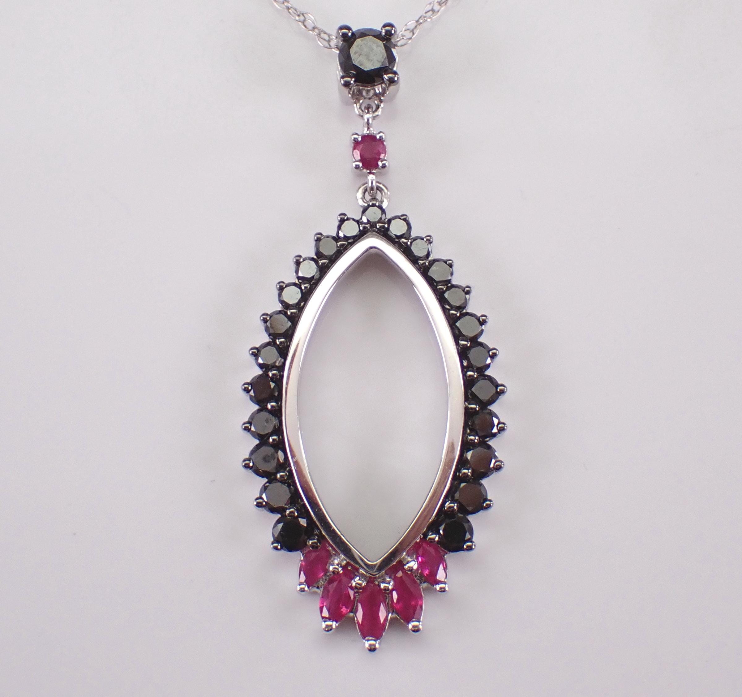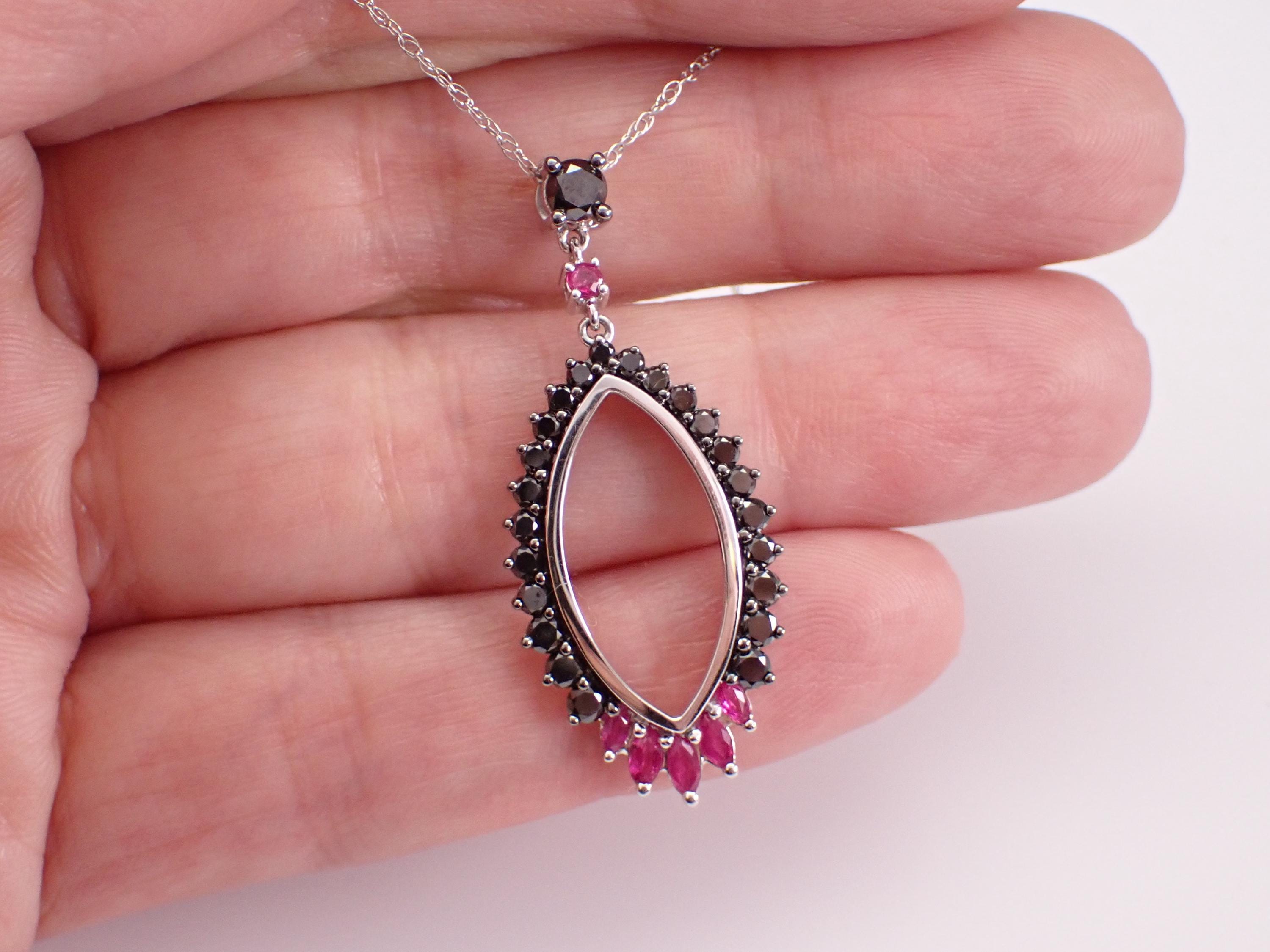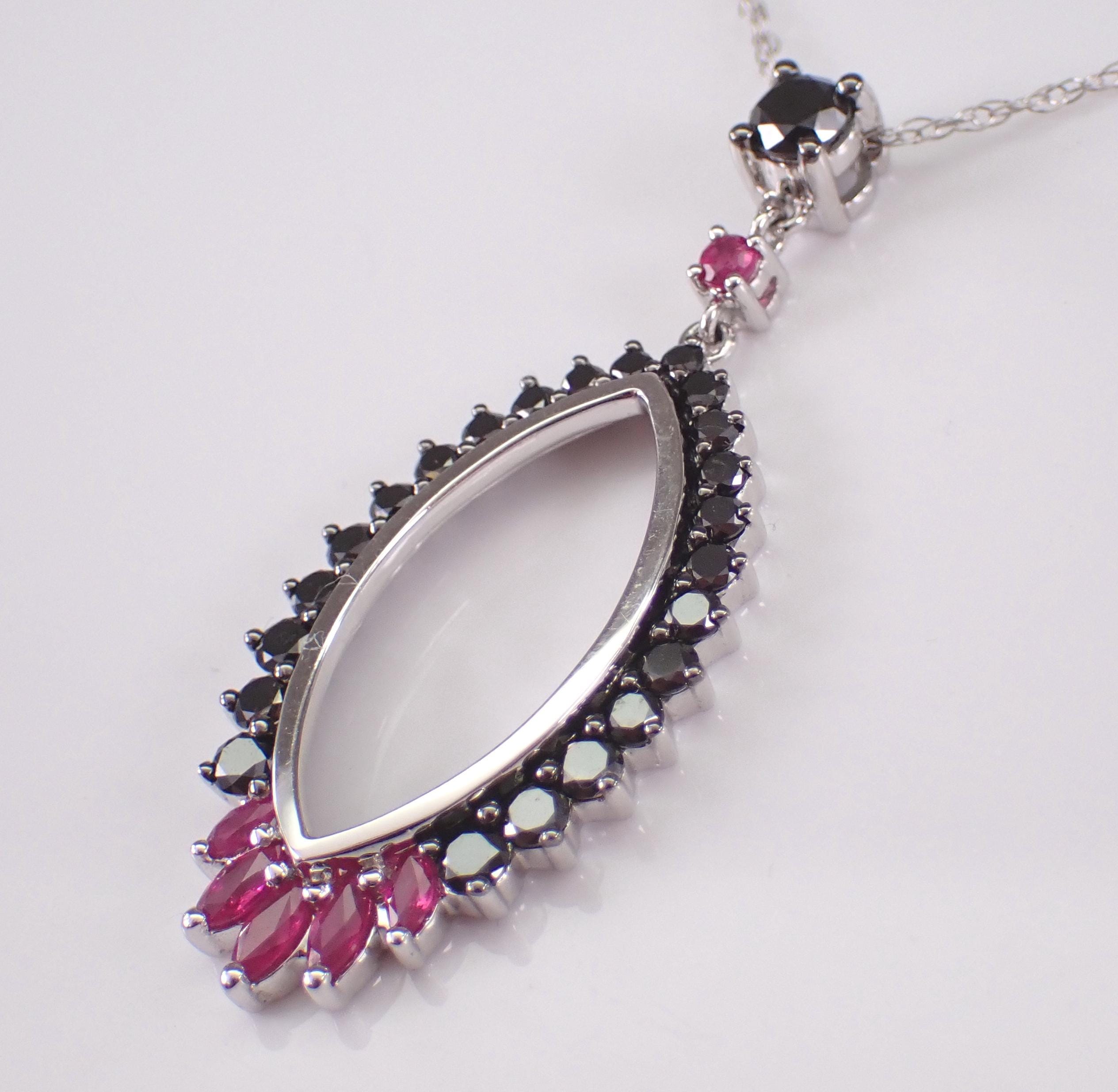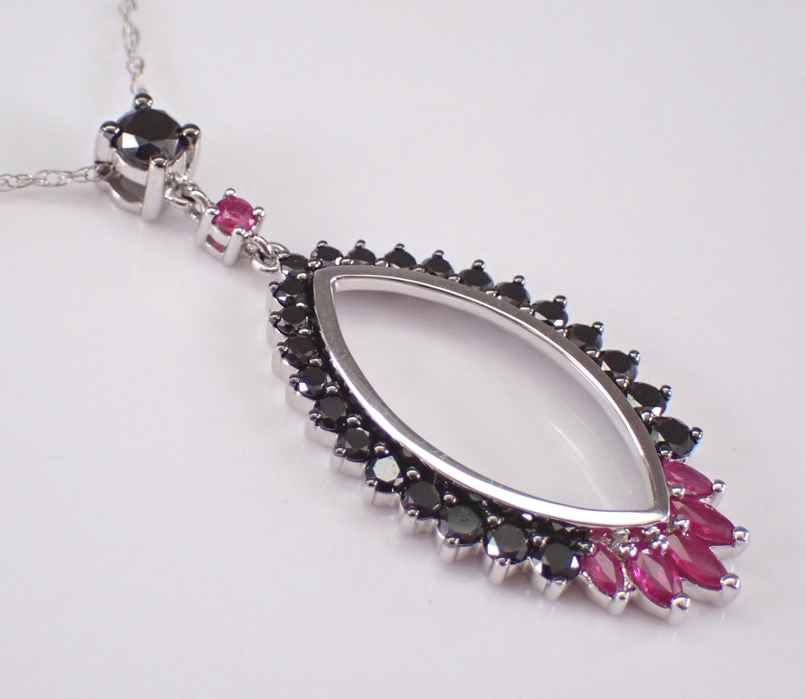 14K White Gold Black Diamond and Ruby Pendant with Chain. This pendant is set with twenty-four genuine natural round black diamonds, one Round Ruby and five Marquise Rubies. These diamonds are SI clarity and weigh a total of .65 carat. The rubies weigh a total of .25 carat. This pendant is 14KT White Gold and comes with an 18" 14KT White Gold chain. Both the pendant and chain weigh a total of 4.0 grams and the pendant measures 39 X 16 mm. This necklace will be accompanied by an appraisal written by a GIA Certified Diamond Grader with the retail replacement value of $2,085.00. I will ship this necklace promptly in a beautiful gift box.