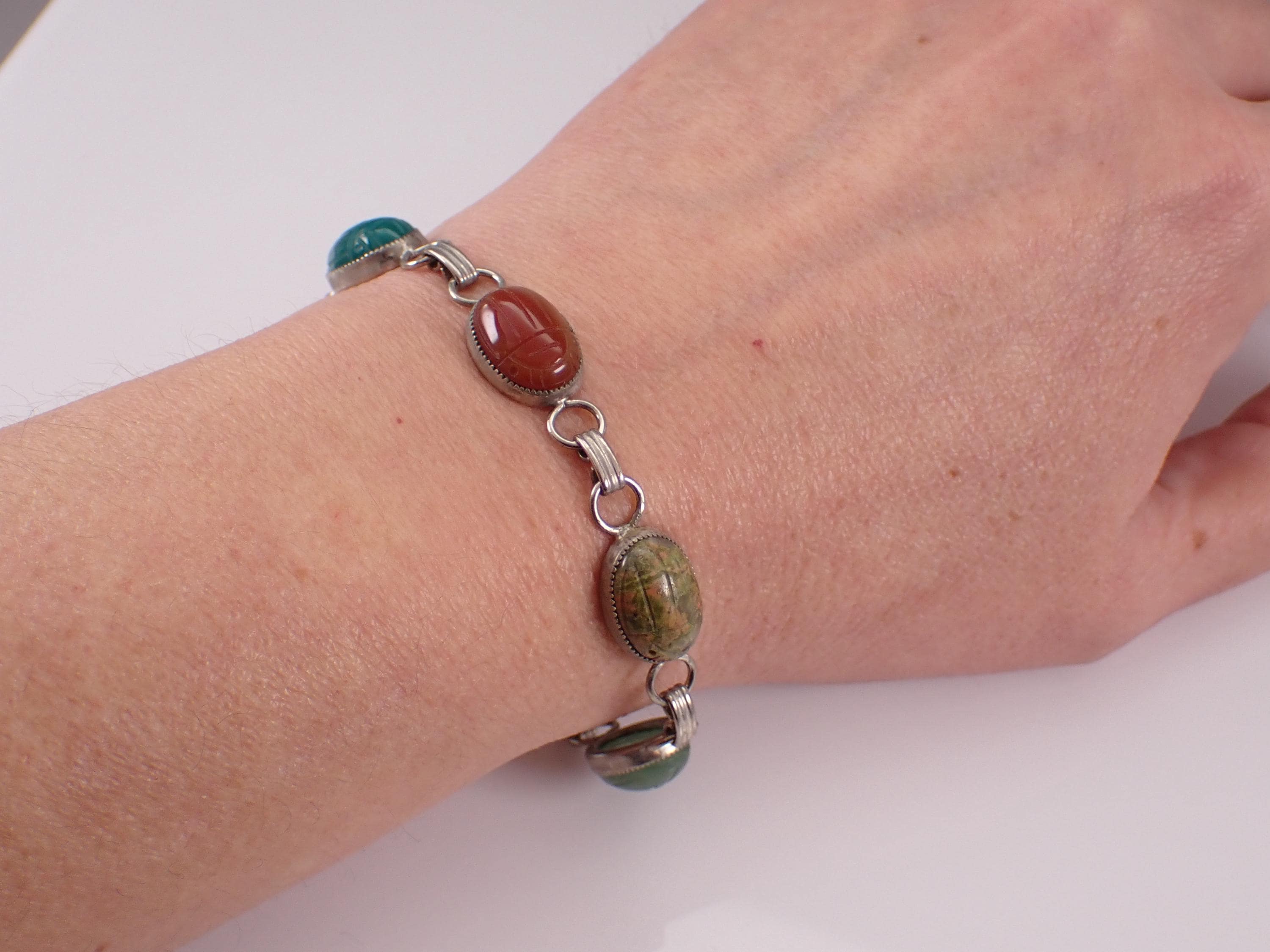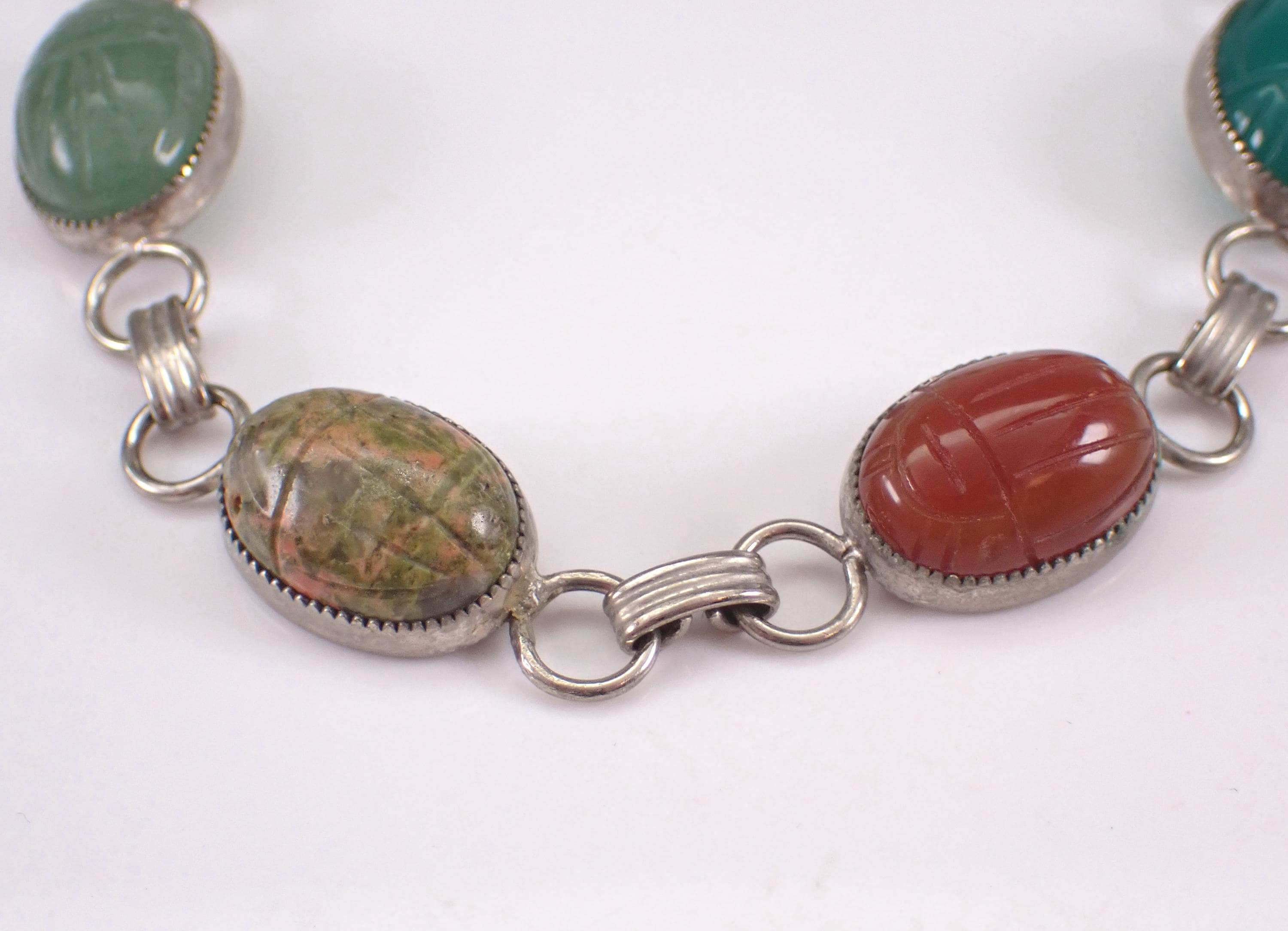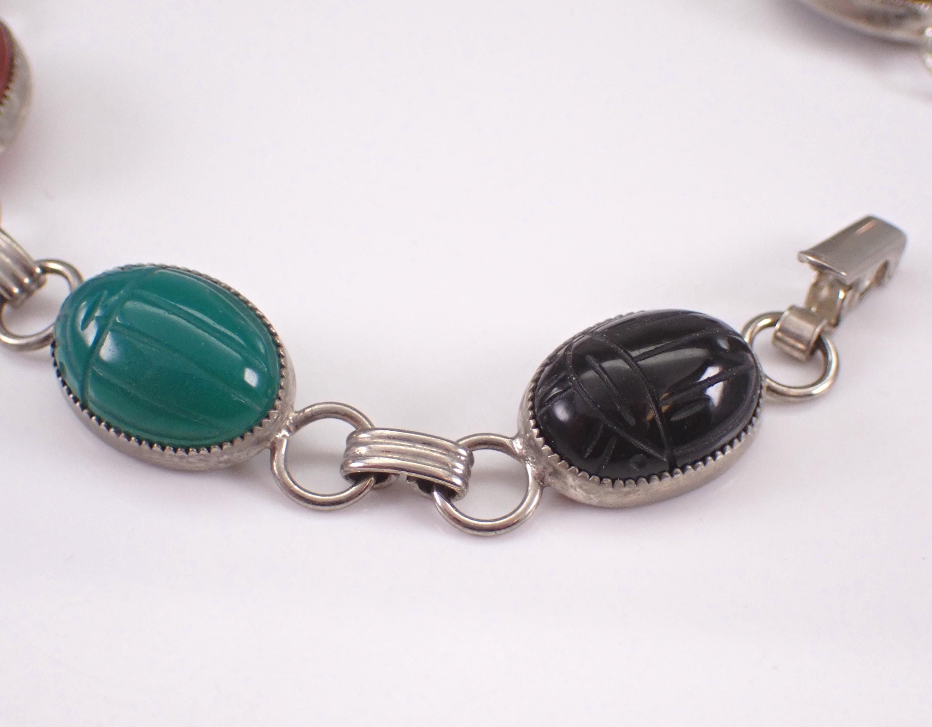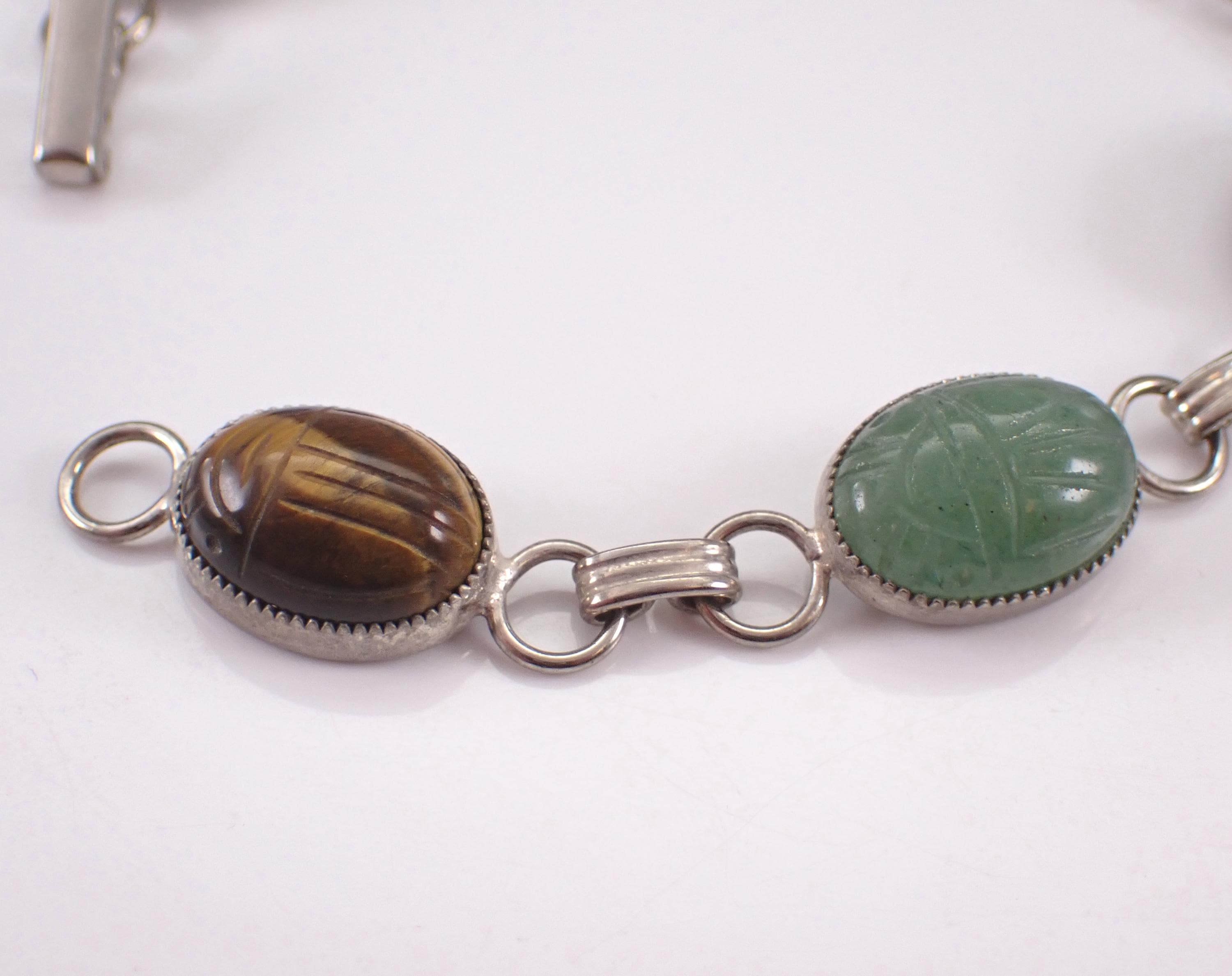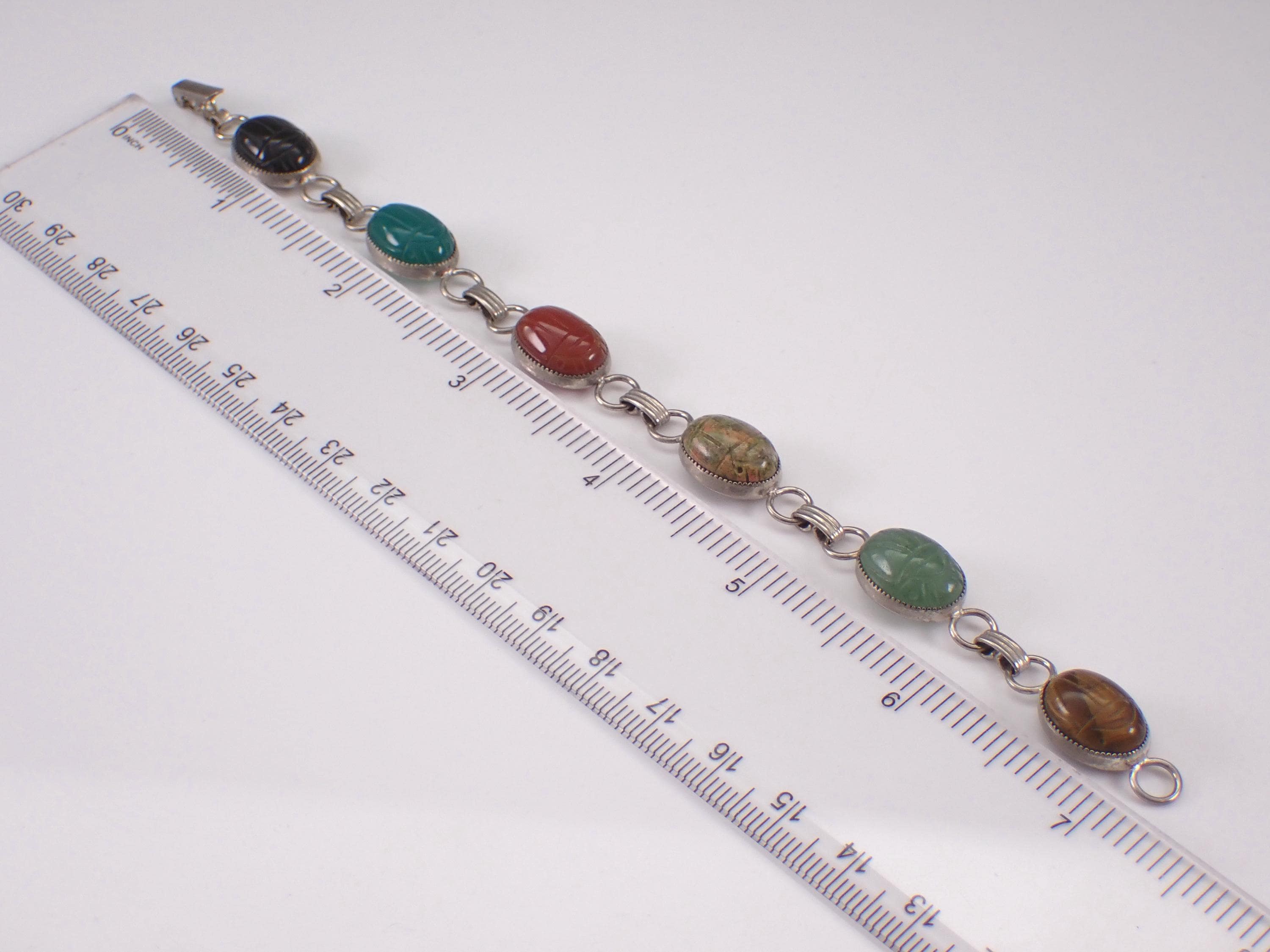 Sterling Silver Vintage Retro Scarab Bracelet. This bracelet is set with all genuine gemstones. These gemstones are: Onyx, Green Onyx, Carnelian, Jasper, Aventurine and Tigers Eye. These Scarabs measure 13 X 9.5 mm each. The bracelet weighs 12.7 grams and measures 7" in length. I will ship this bracelet promptly in a gift pouch.