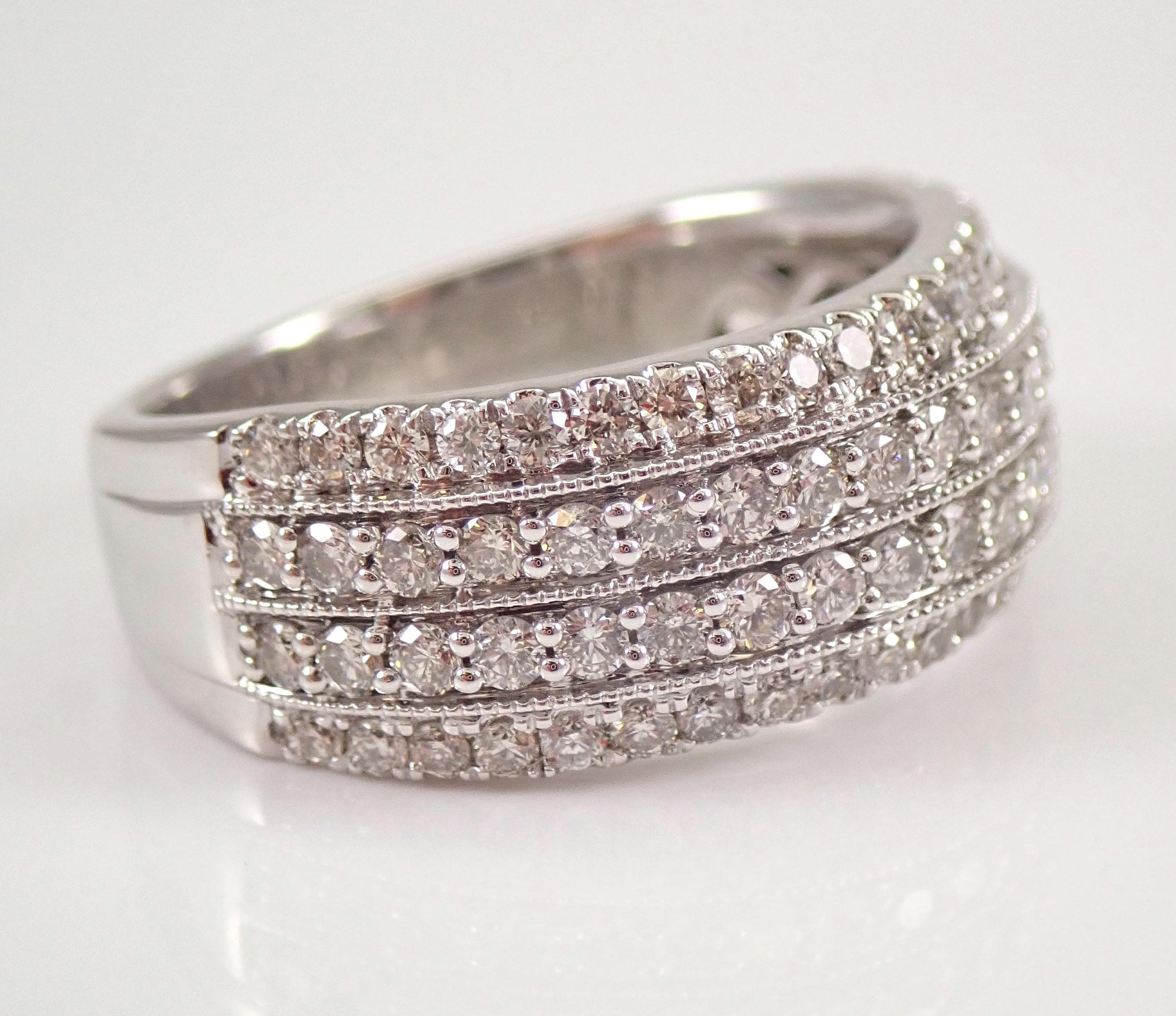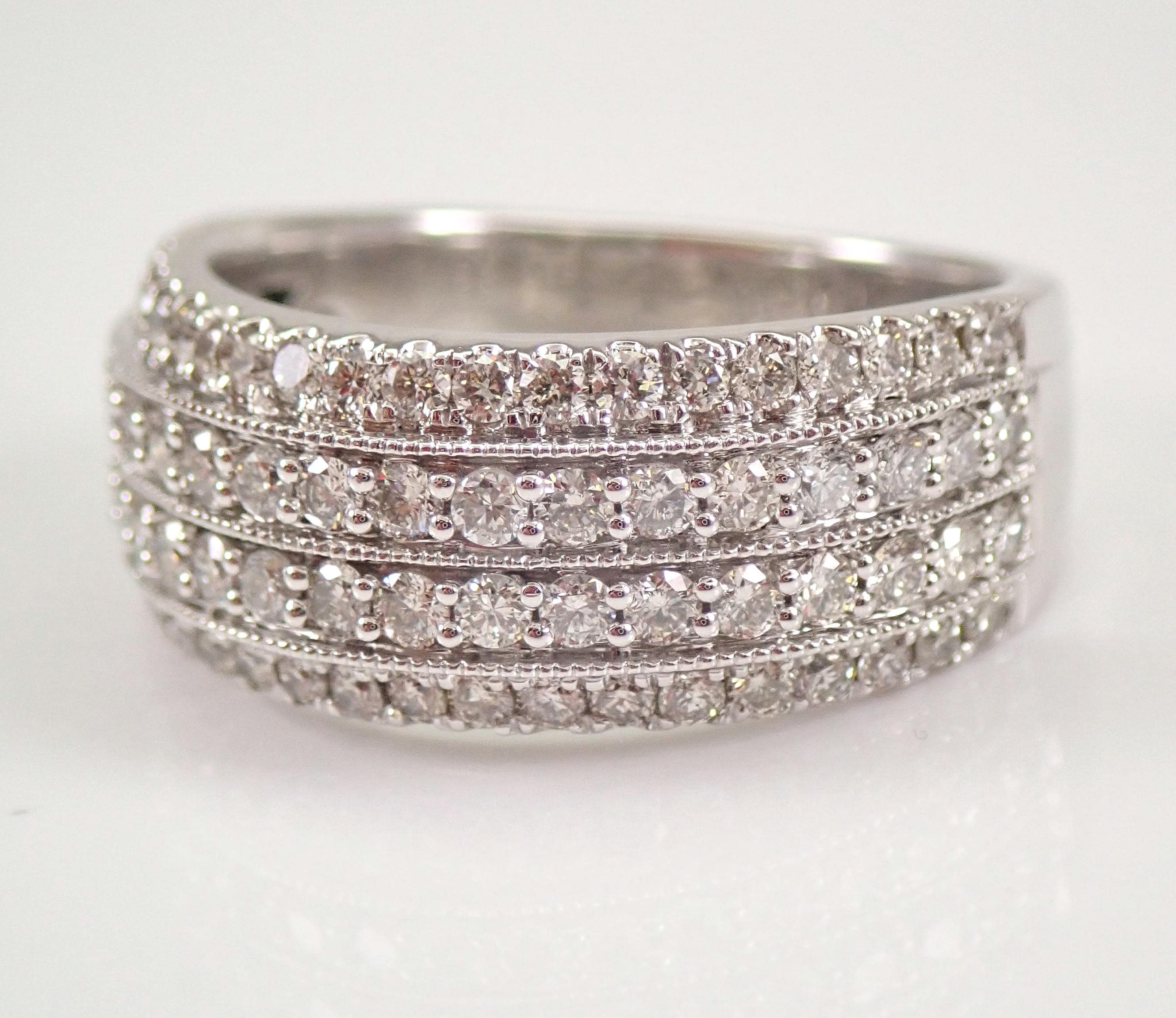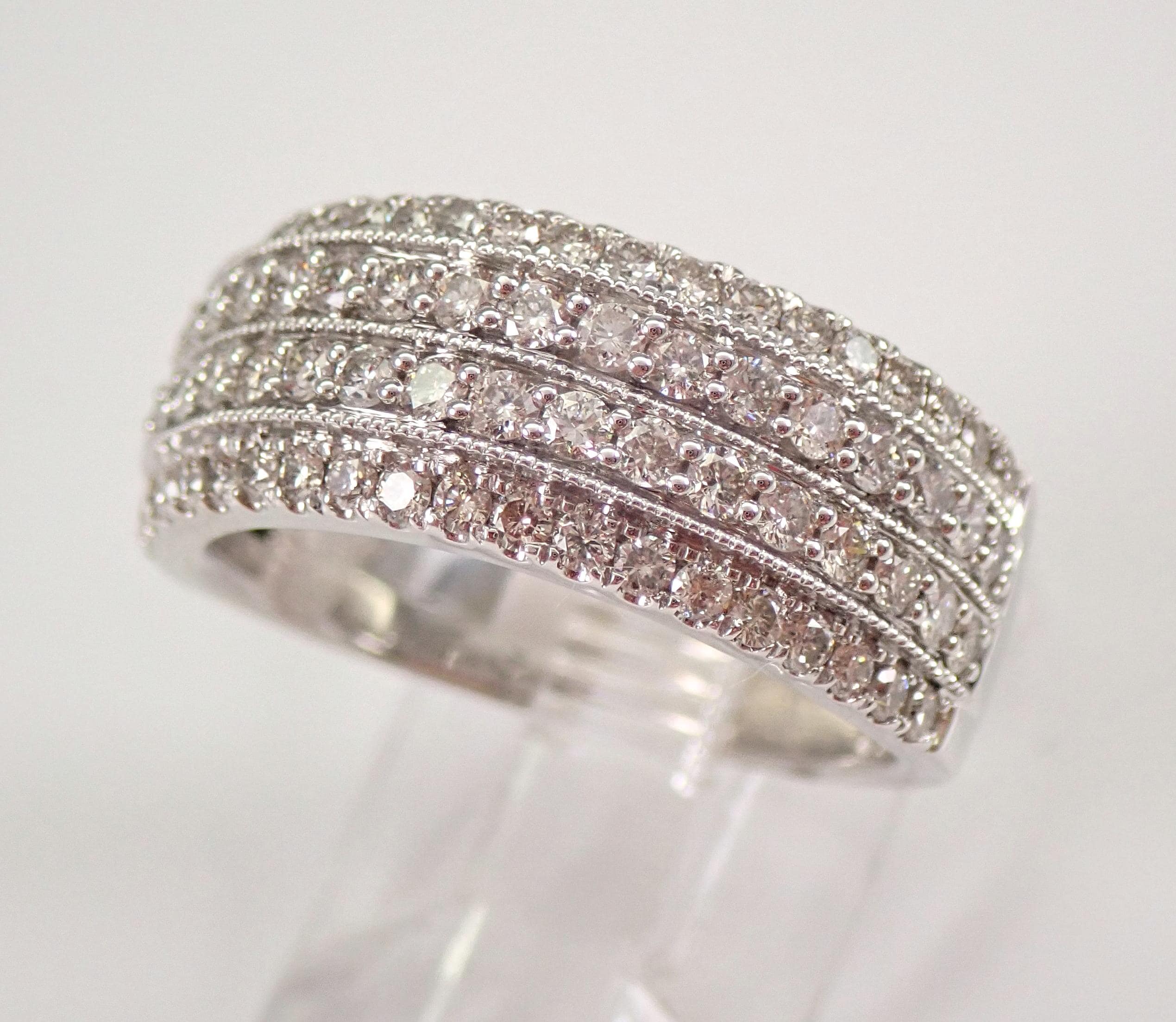 White Gold Diamond Wedding Ring Anniversary Band. This ring is set with eighty genuine round brilliant diamonds. These diamonds are I color, SI/I1 clarity and weigh a total of 1.03 carat. This ring is 10KT White Gold, weighs 5.7 grams, measures 8 mm in width and is a finger size 6 3/4, can be resized (please inquire about sizing with the finger size you need). This ring will be accompanied by an appraisal written by a GIA Certified Diamond Grader with the retail replacement value of $2,895.00. I will ship this ring promptly in a beautiful gift box.