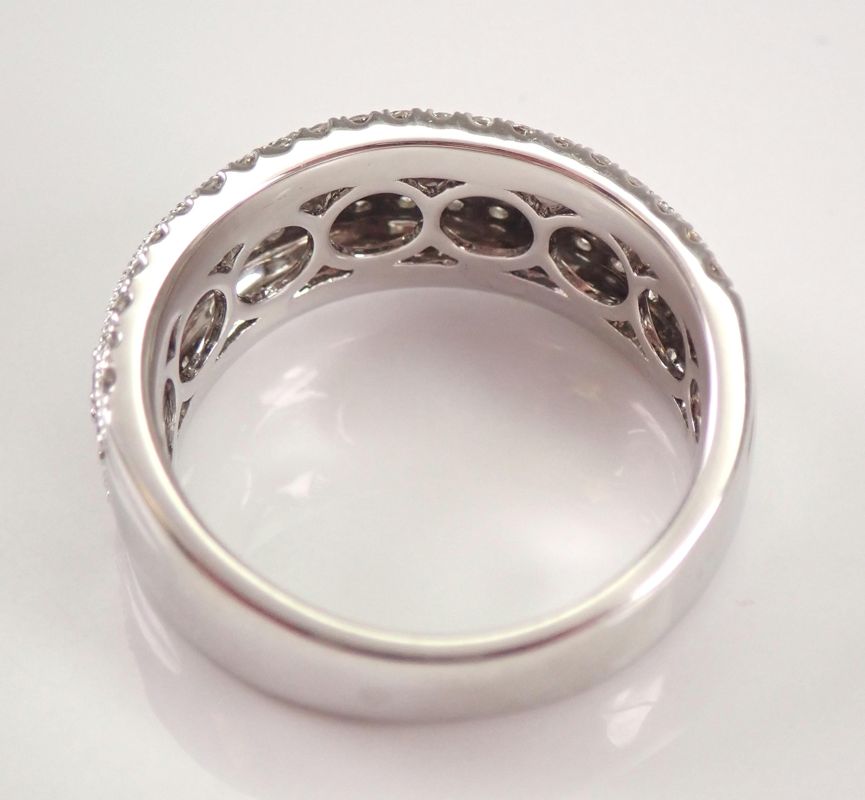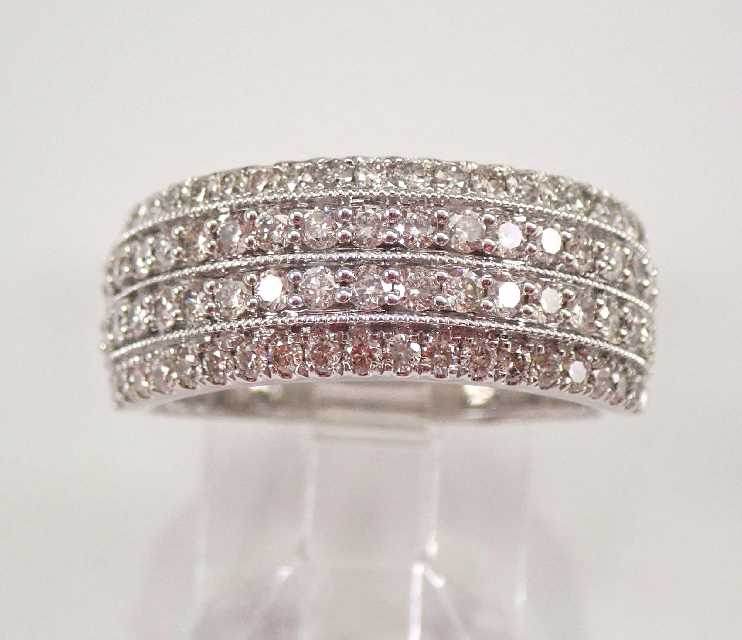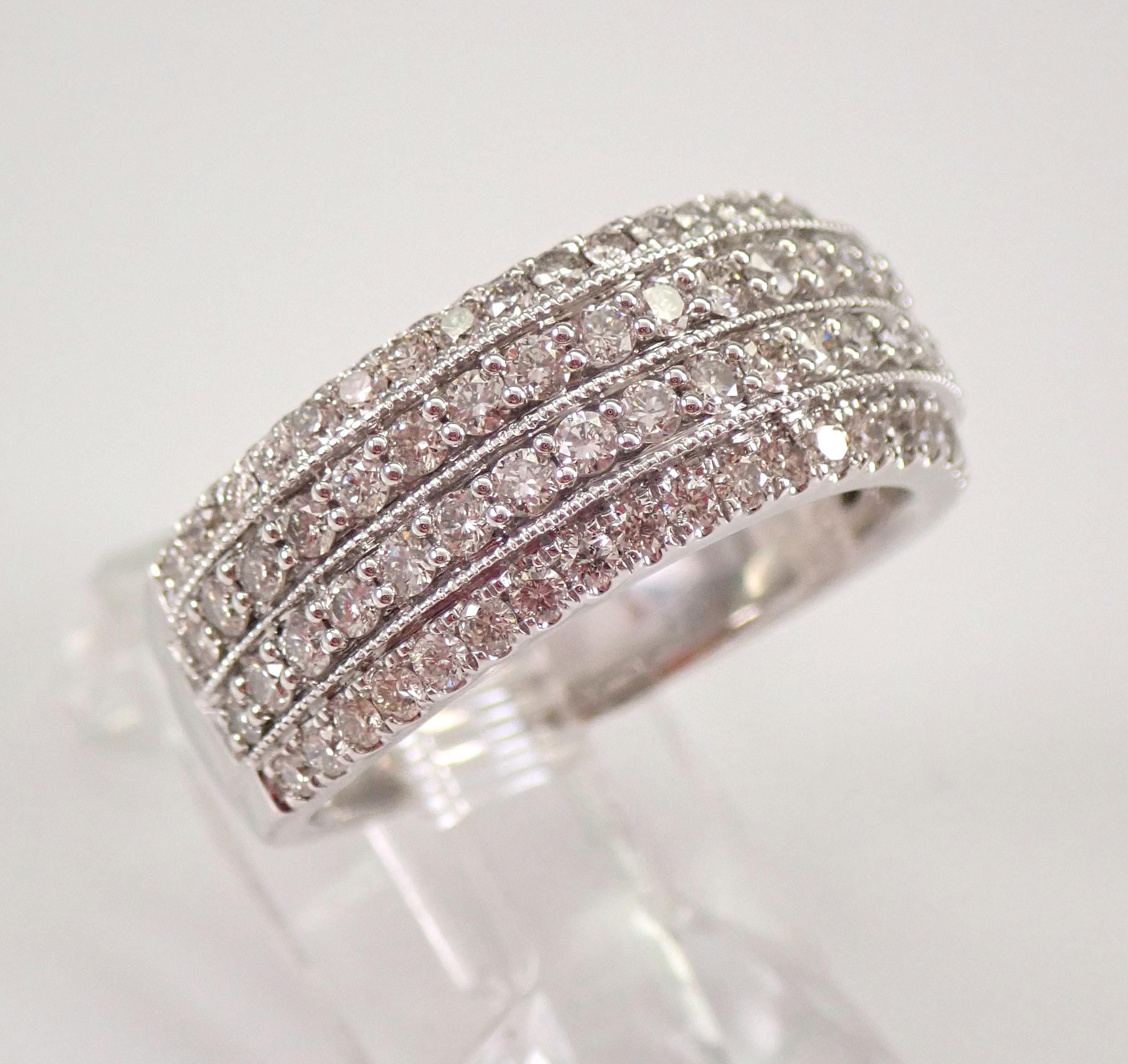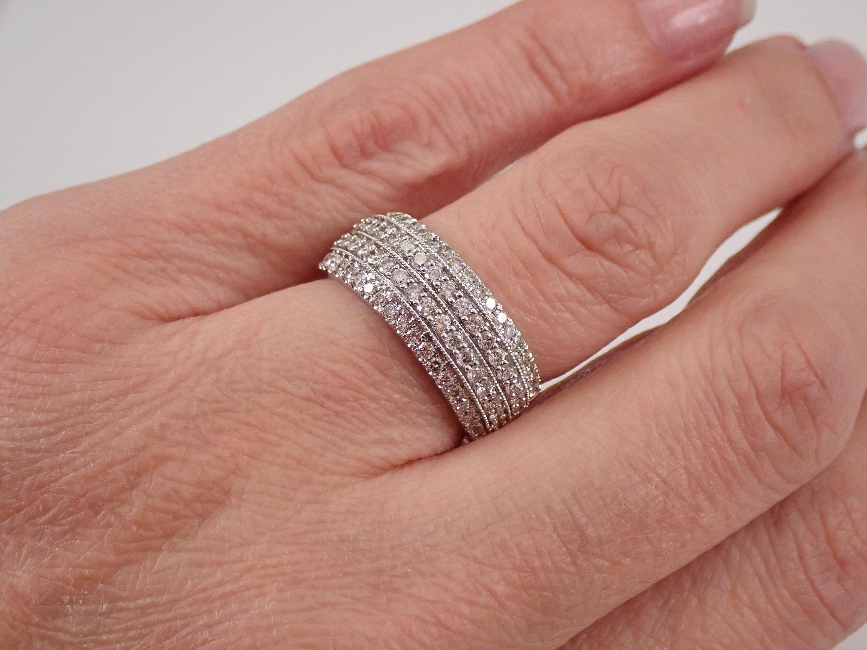White Gold Diamond Wedding Ring Anniversary Band. This ring is set with eighty genuine round brilliant diamonds. These diamonds are I color, SI/I1 clarity and weigh a total of 1.03 carat. This ring is 10KT White Gold, weighs 5.7 grams, measures 8 mm in width and is a finger size 6 3/4, can be resized (please inquire about sizing with the finger size you need). This ring will be accompanied by an appraisal written by a GIA Certified Diamond Grader with the retail replacement value of $2,895.00. I will ship this ring promptly in a beautiful gift box.