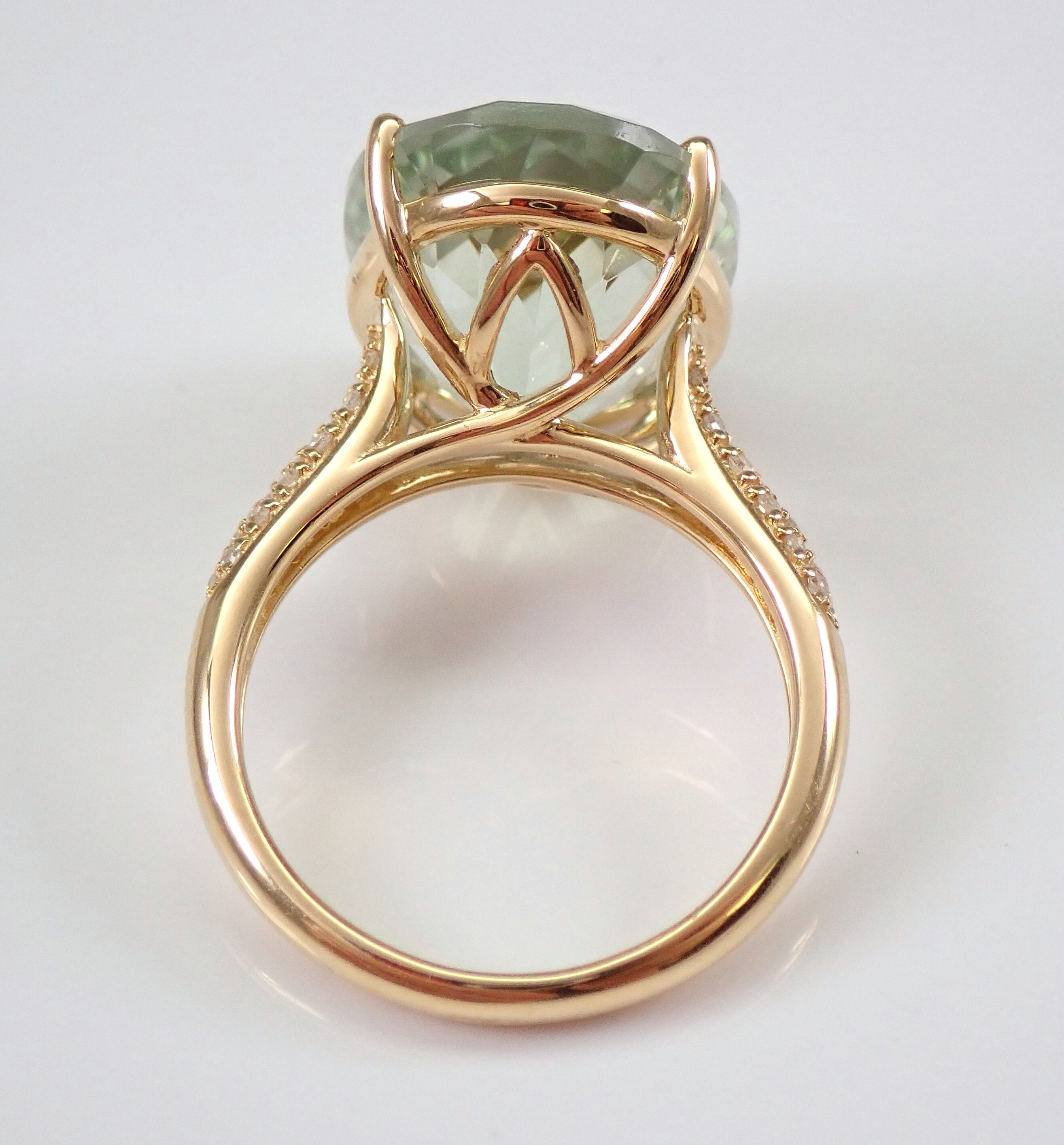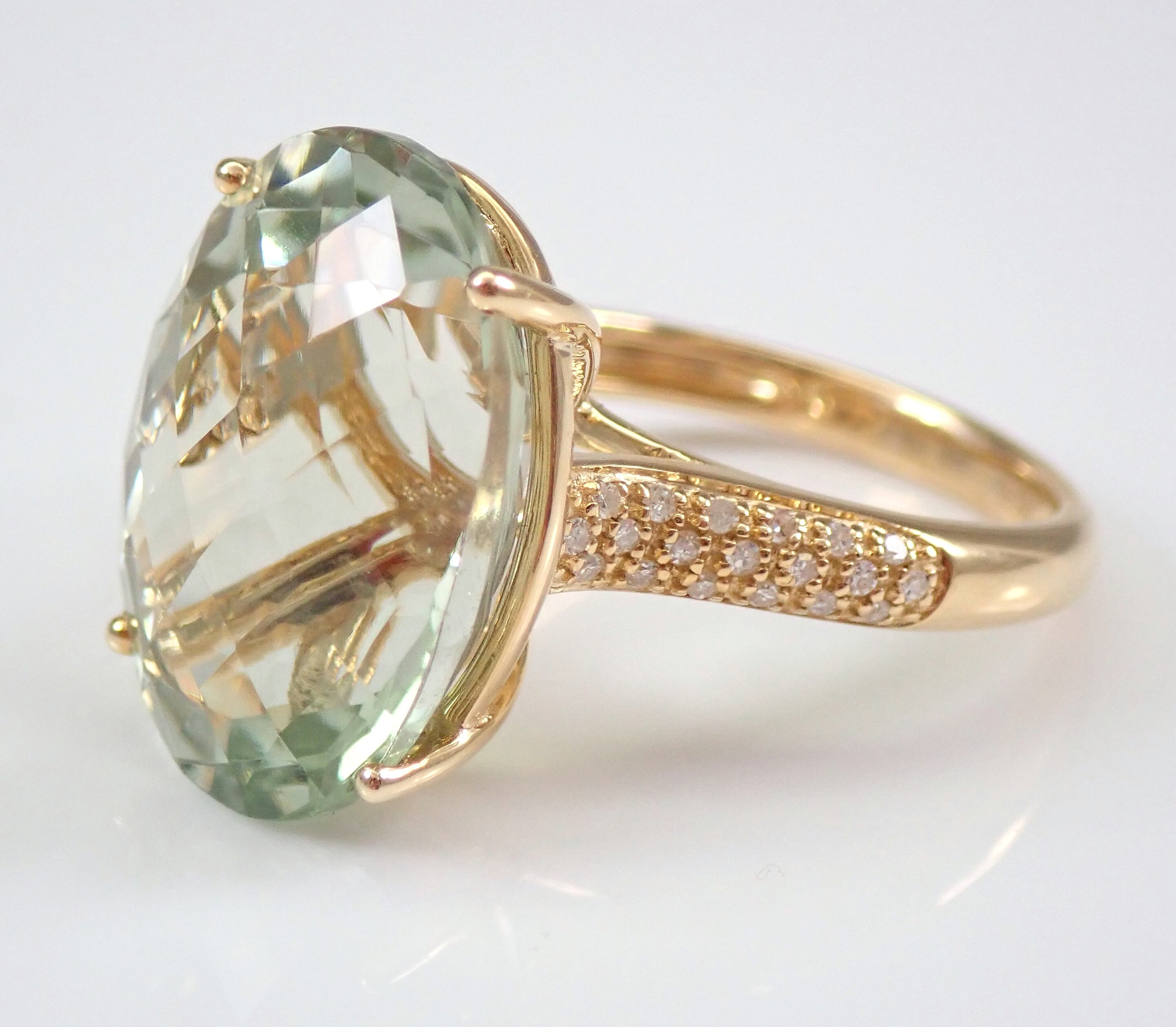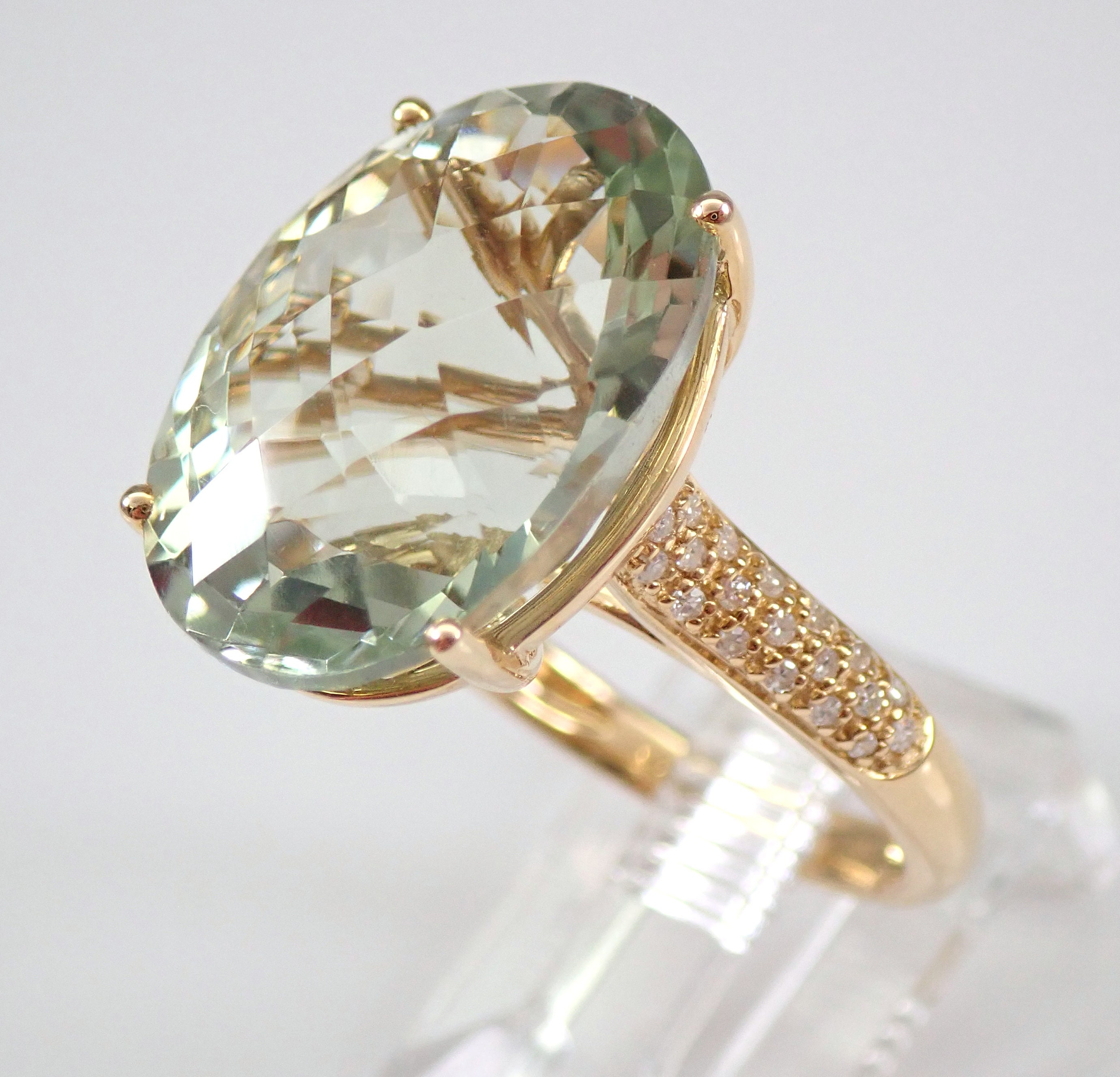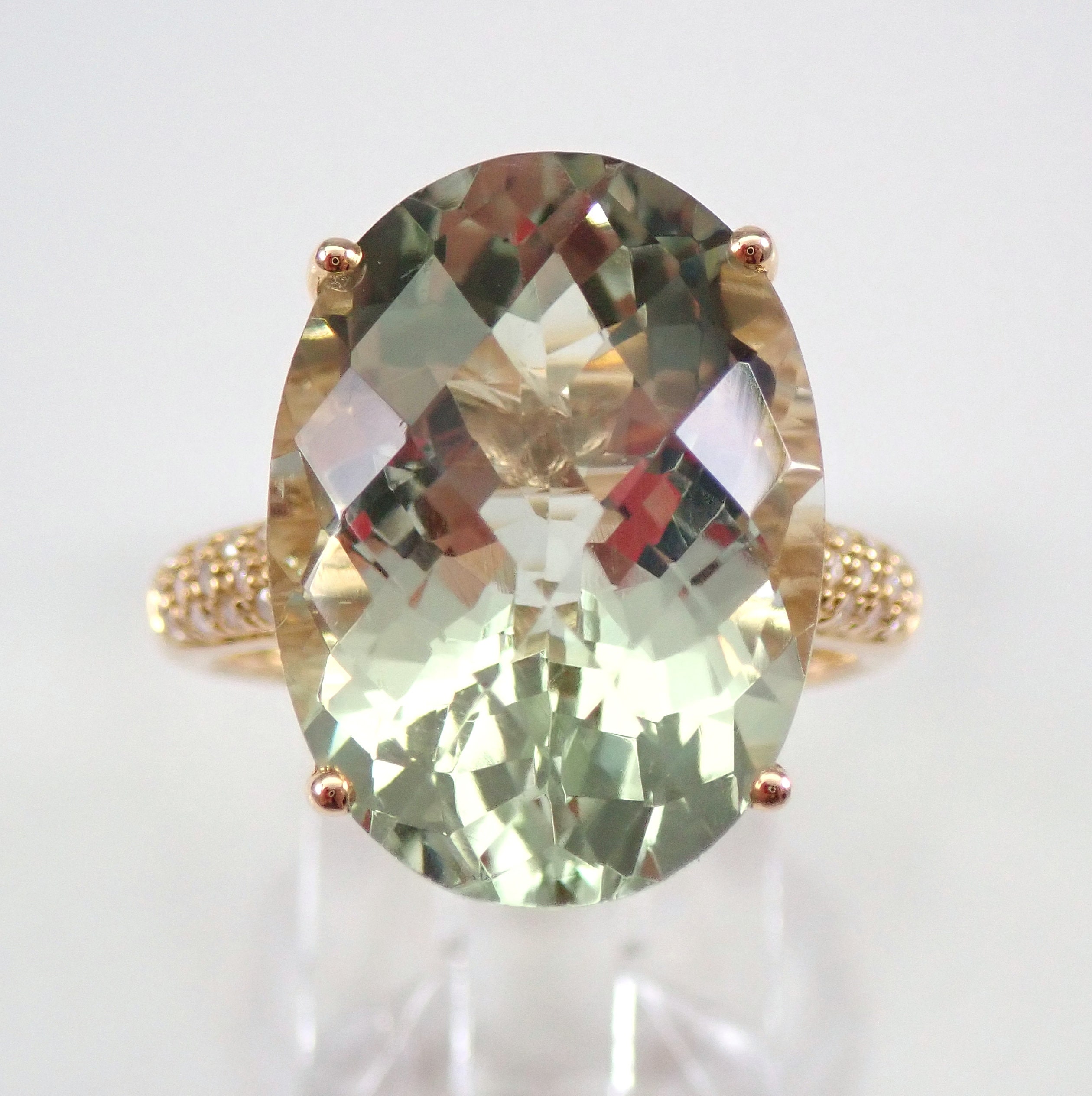 14K Yellow Gold Diamond and Green Amethyst Engagement Ring. This ring is set with one genuine Oval Green Amethyst in the center and thirty-eight natural Round Brilliant Diamonds. These diamonds are H color, SI clarity and weigh a total of .15 carat. The Green Amethyst is a pale green color, measures 18 X 13 mm and weighs 9 carats. This ring is 14KT Yellow Gold, weighs 6.6 grams and is a finger size 7, which is resizable free of charge (please inquire about sizing with the finger size you need). The ring will be accompanied by an appraisal by a GIA Certified Diamond Grader with the retail replacement value of $1,895.00. I will ship this ring promptly in a gift box.