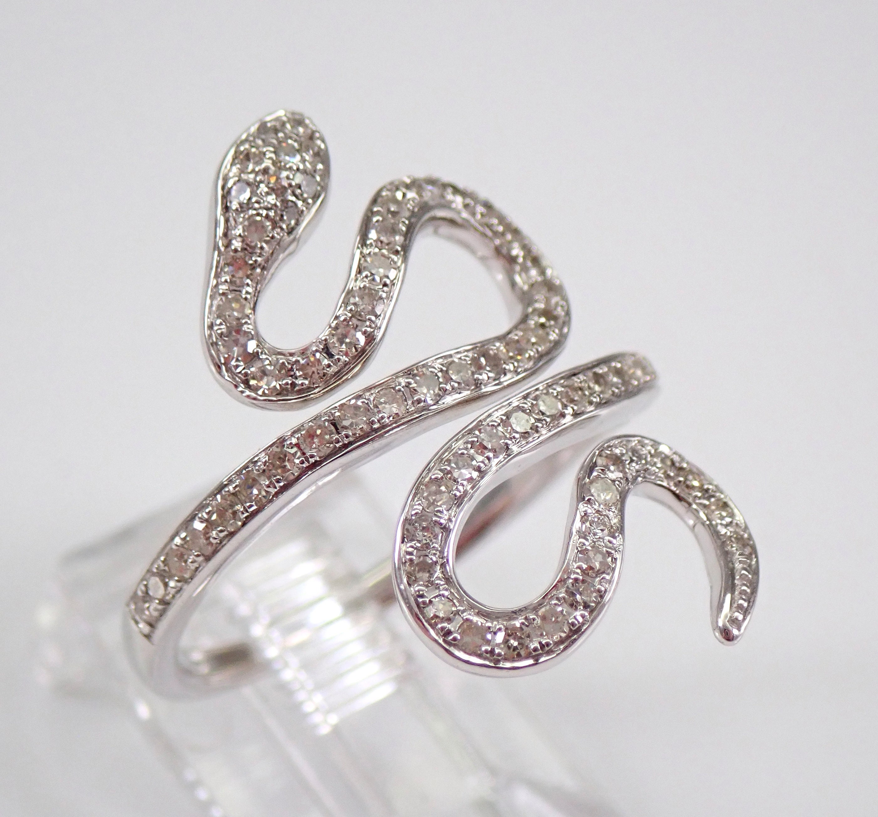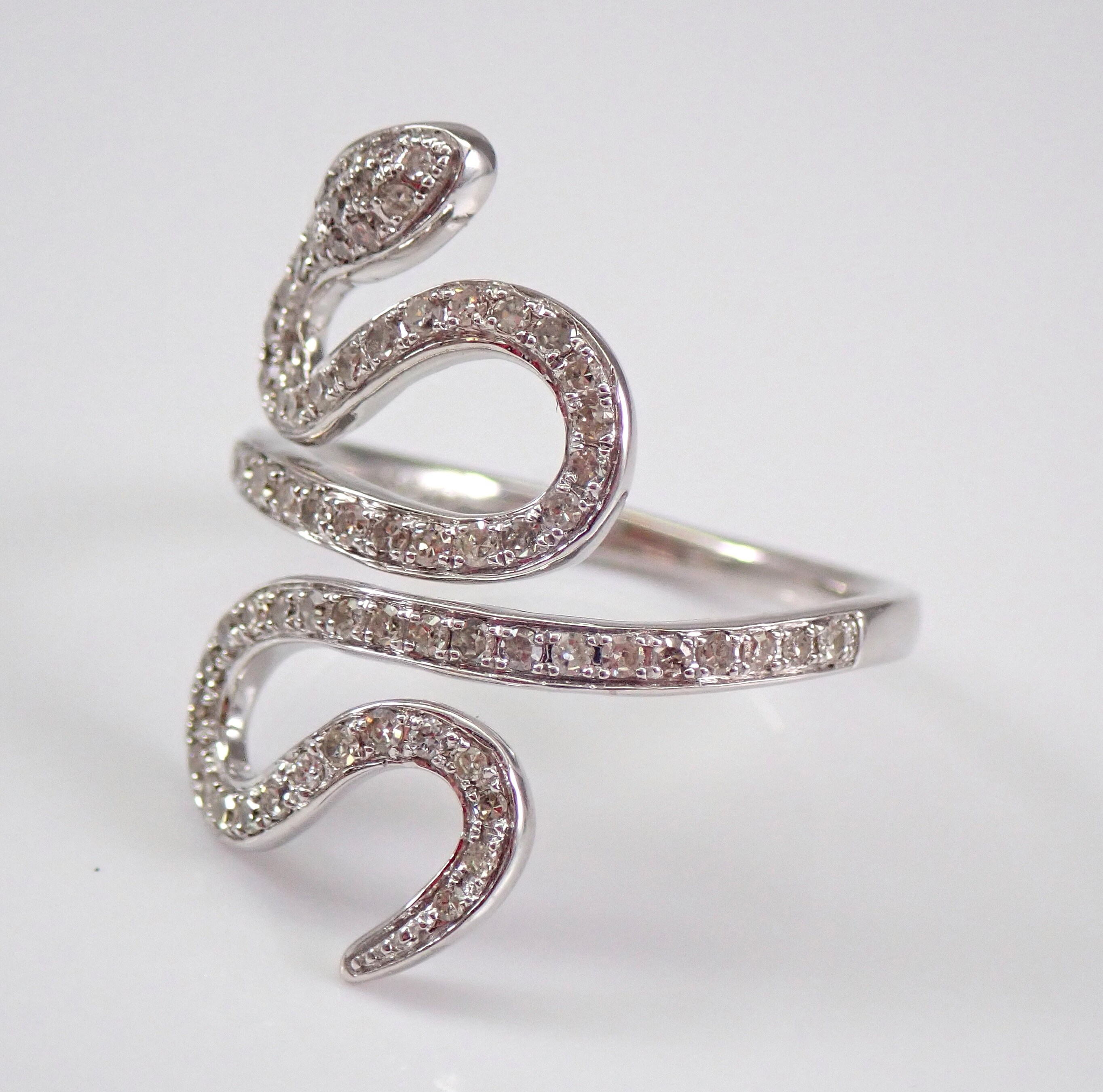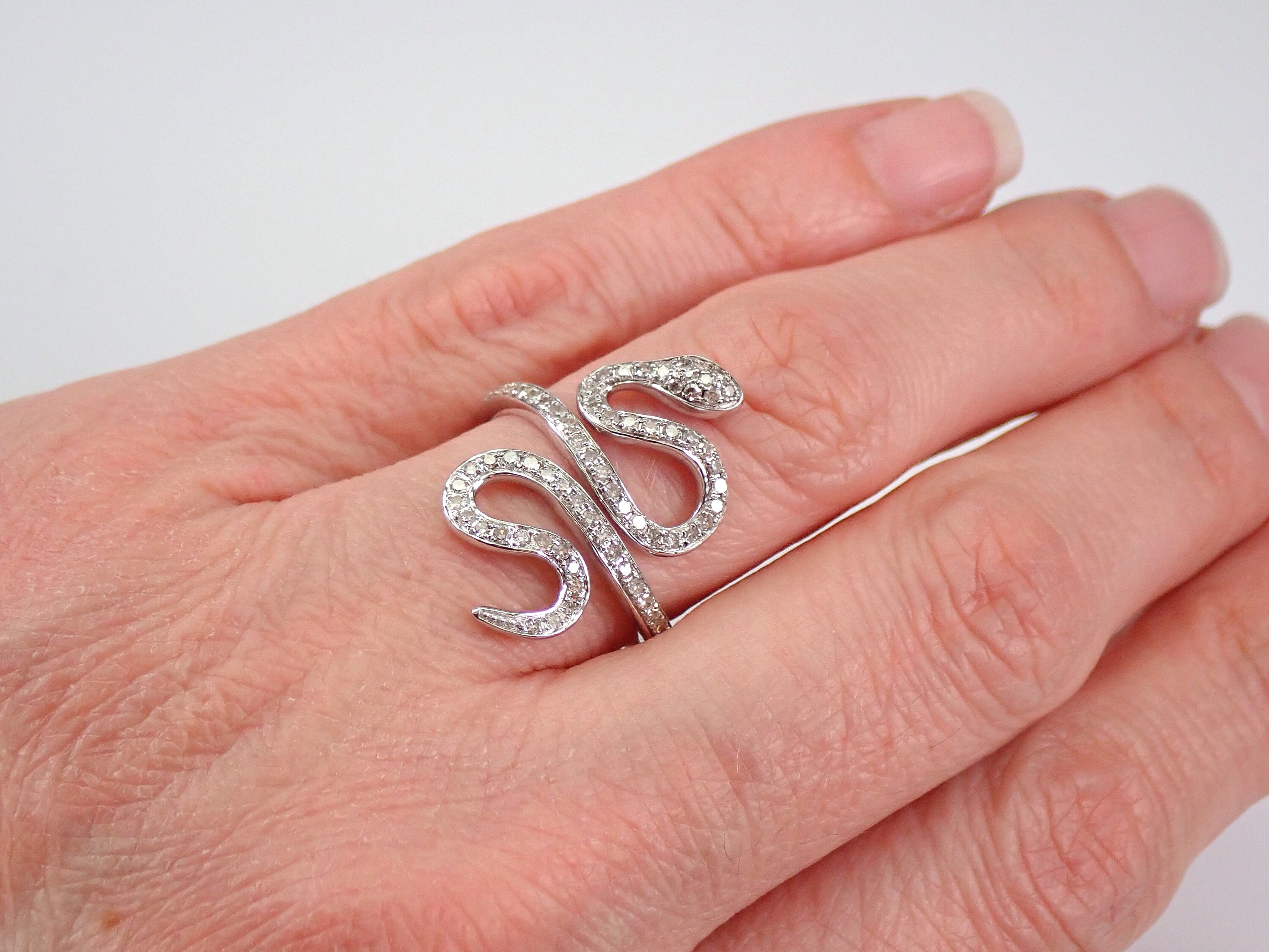 14K White Gold Diamond Snake Ring. This ring is set with seventy-four genuine Round Brilliant Diamonds. These Diamonds are I color, SI/I1 clarity and weigh a total of 1/2 carat. This ring is 14K White Gold, weighs 4.6 grams and is a finger size 7 1/2, can be sized free of charge, please inquire with the finger size that you need. This ring measures 23 mm along the finger. This ring will be accompanied by an appraisal with the retail replacement value of $1,579.00. I will ship this ring promptly in a gift box.