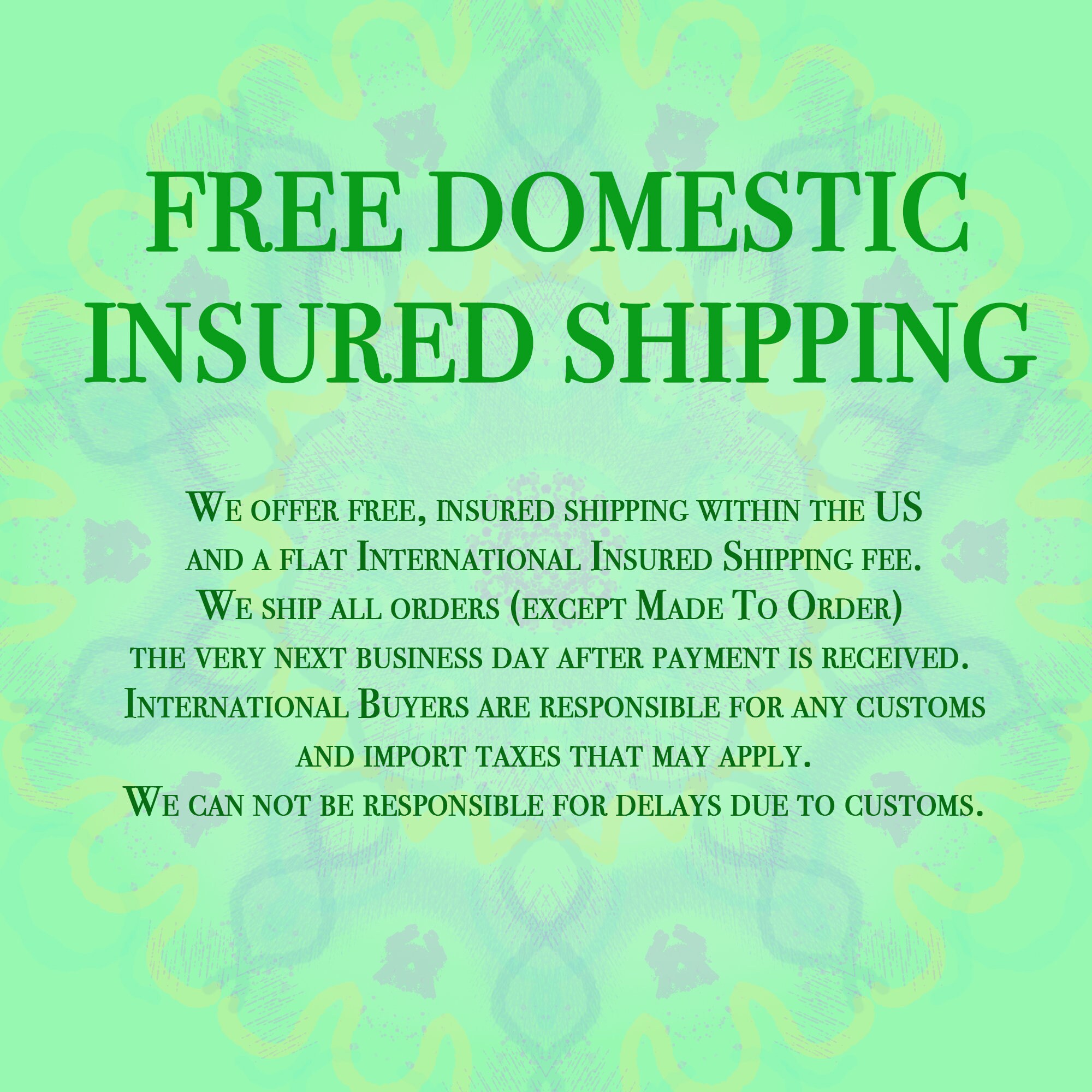We offer free, insured shipping within the US and a flat International Insured Shipping fee. We ship all orders (except Made To Order) the very next business day after payment is received. International Buyers are responsible for any customs and import taxes that may apply. We can not be responsible for delays due to customs.