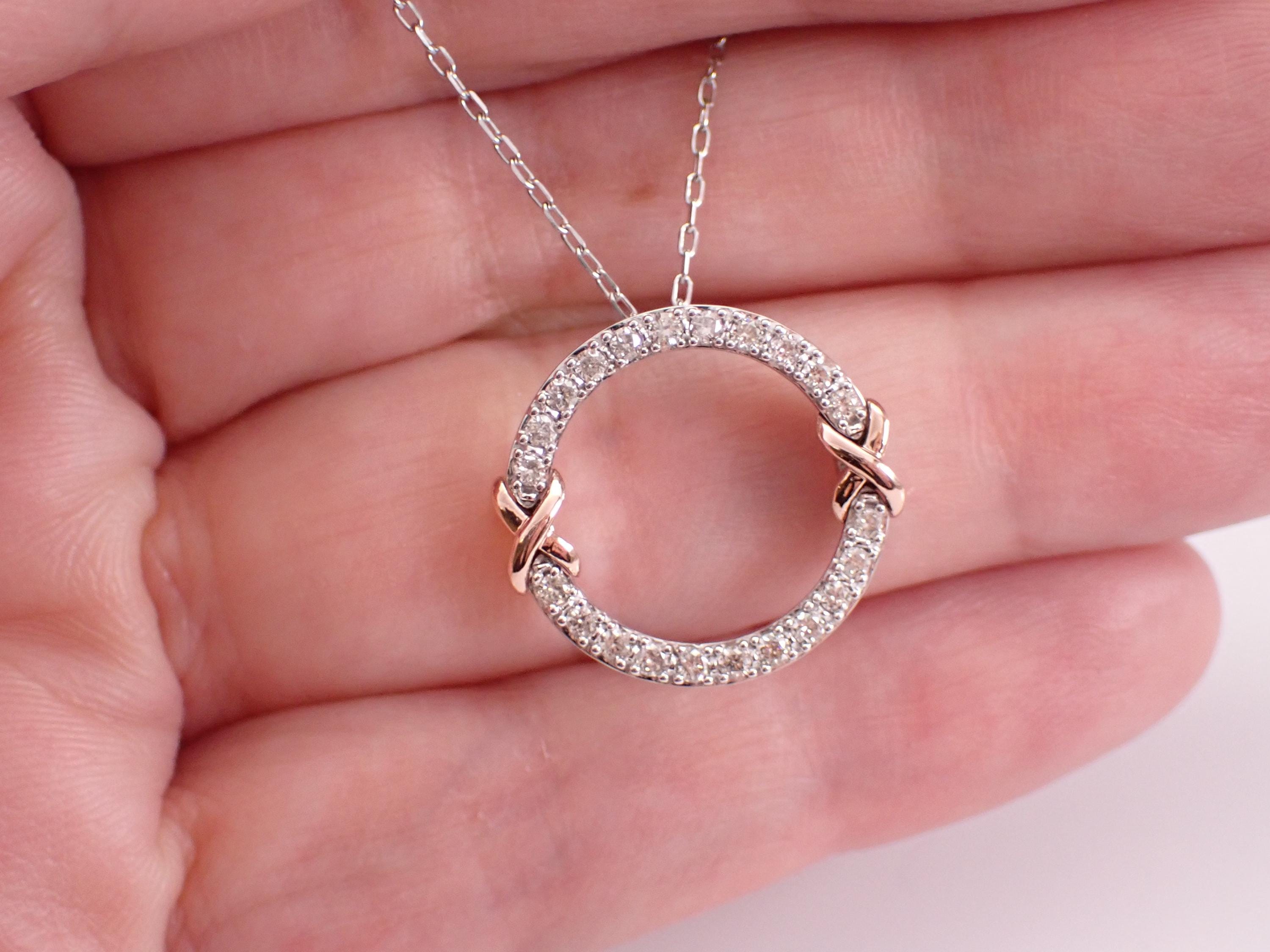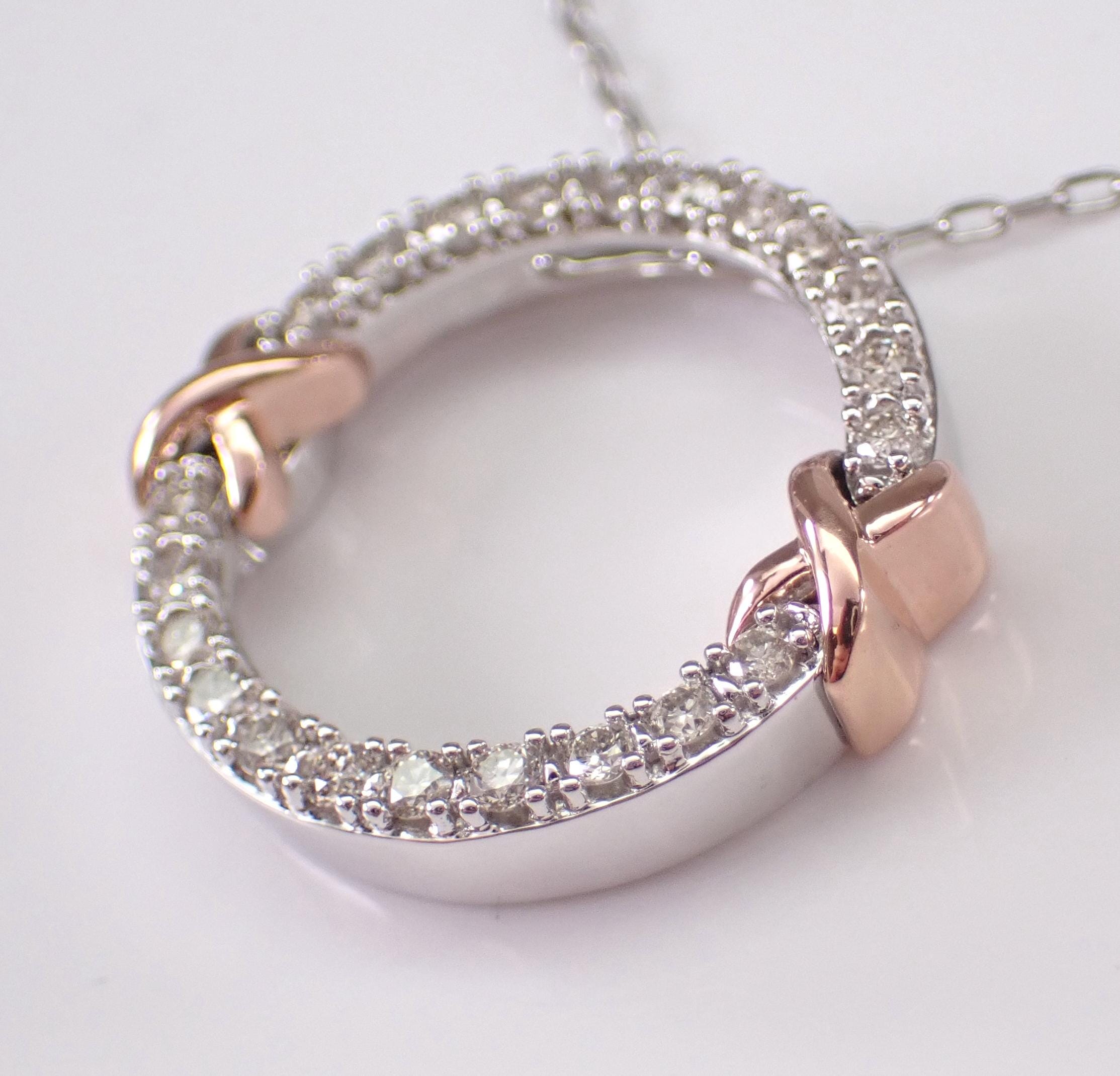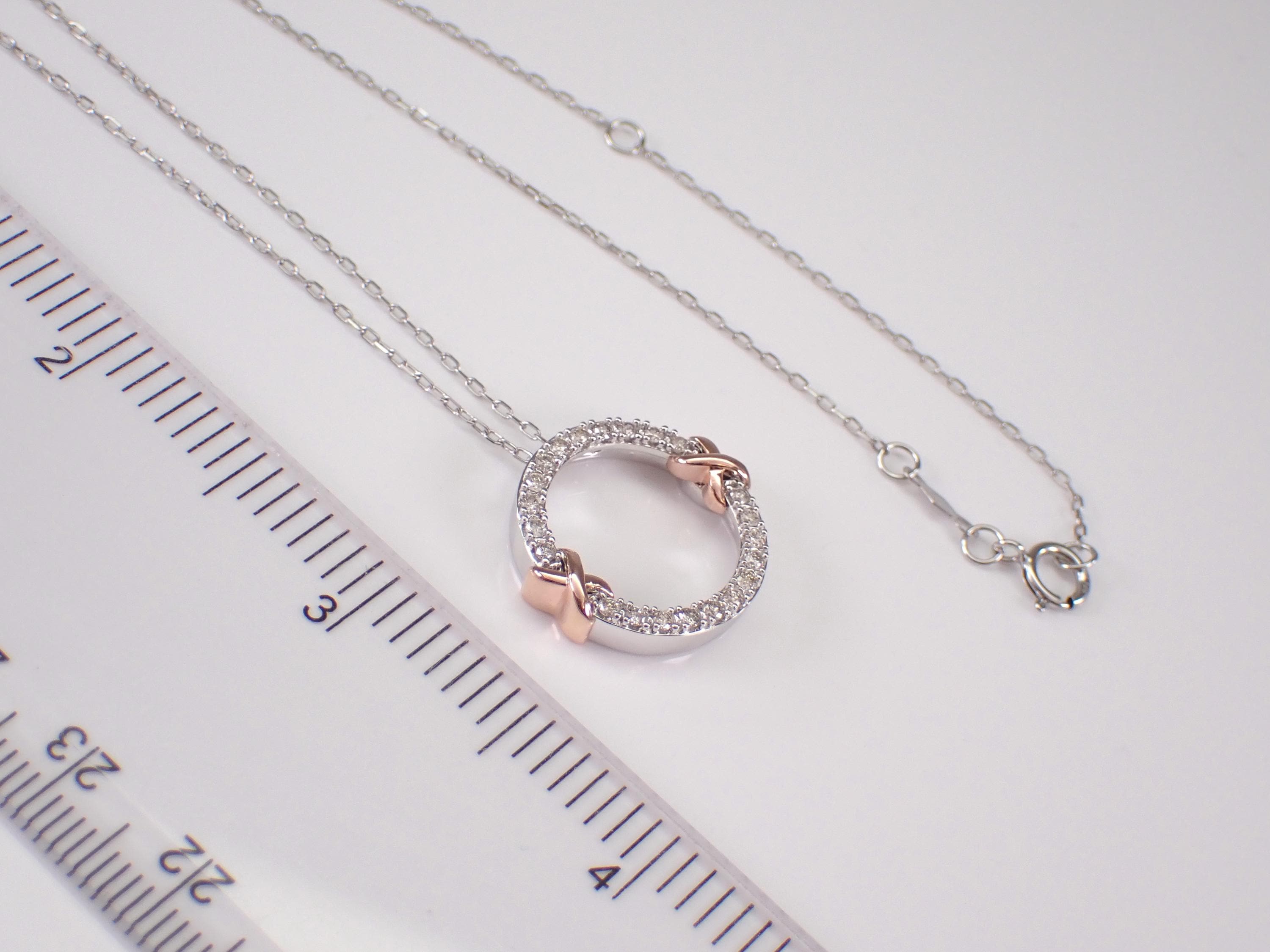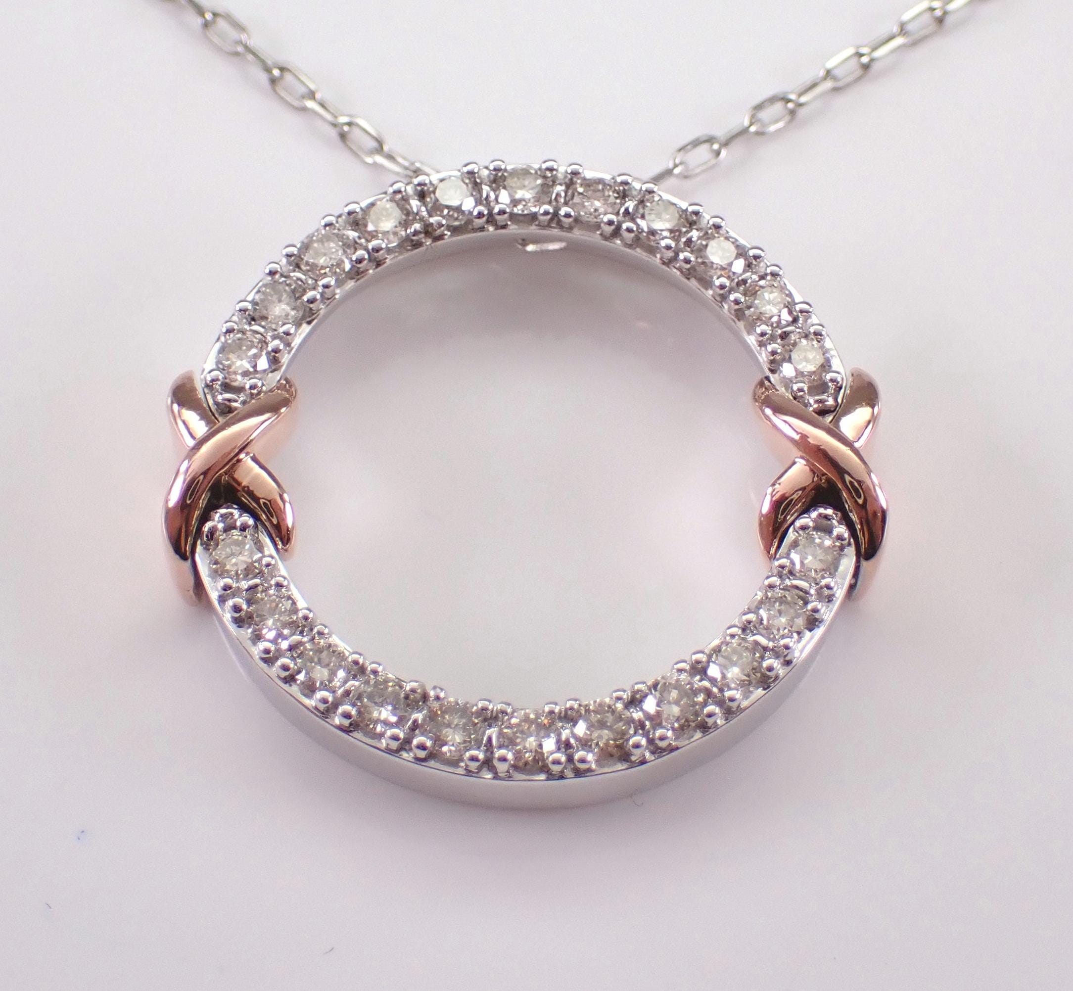 White Gold Diamond Circle Pendant Necklace with Chain. This pendant is set with twenty-two genuine natural round brilliant diamonds. These diamonds are H color, I clarity and weigh a total of .34 carat. This pendant is 10KT White Gold with Rose Gold accents and comes with an 18" 10KT White Gold chain. Both the pendant and chain weigh a total of 3.6 grams and the pendant measures 18 mm in diameter. This necklace will be accompanied by an appraisal written by a GIA Certified Diamond Grader with the retail replacement value of $1,679.00. I will ship this necklace promptly in a beautiful gift box.