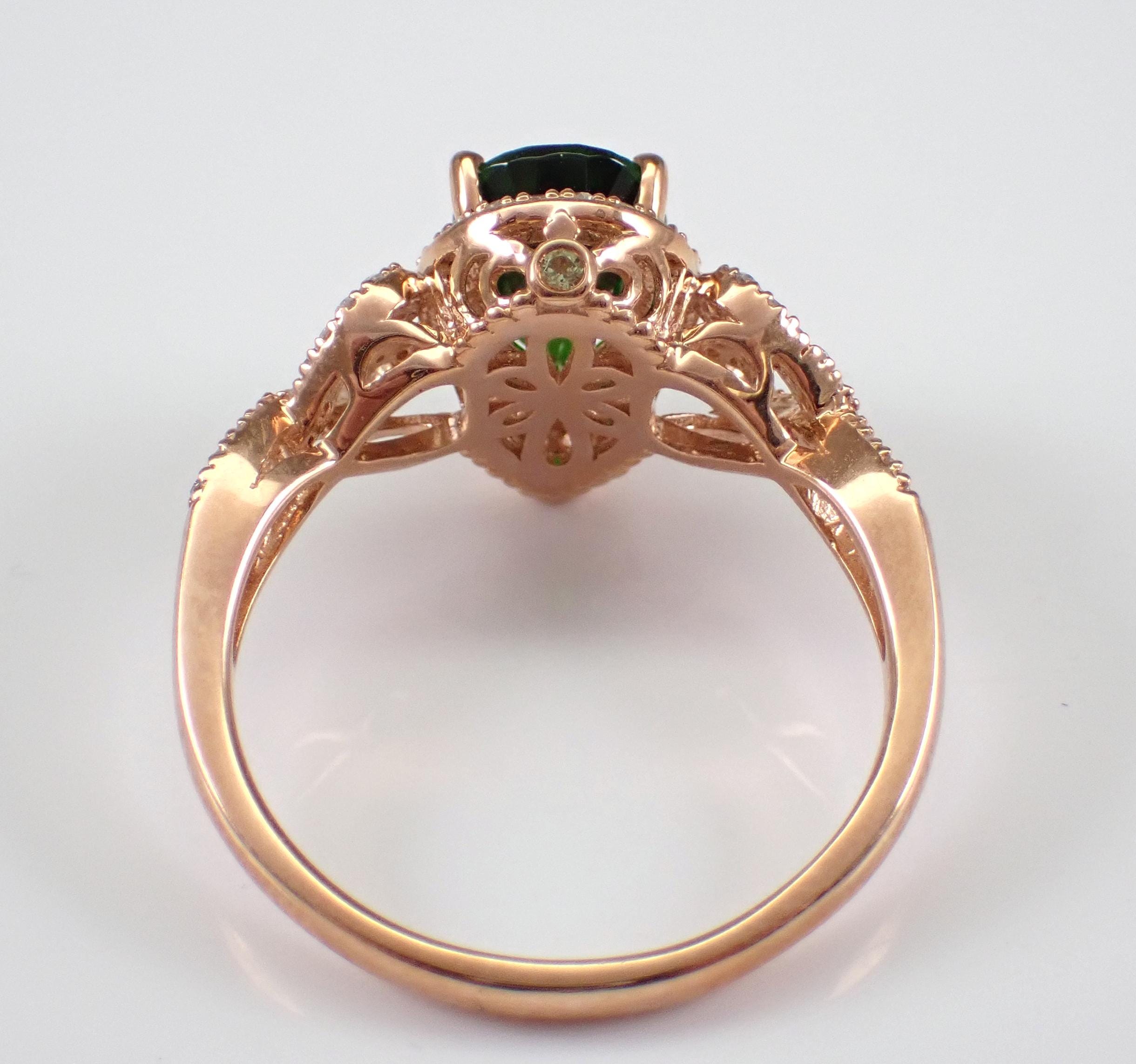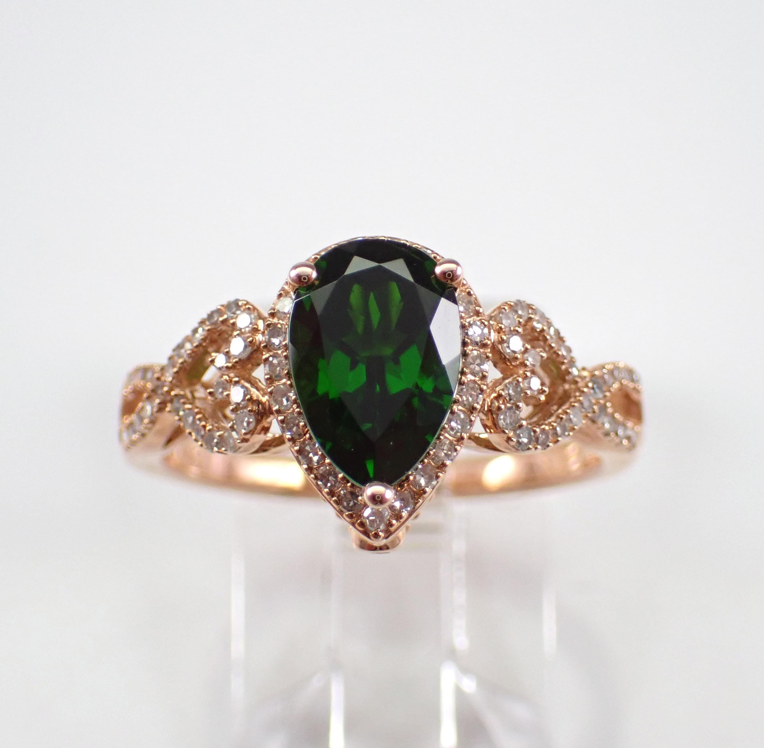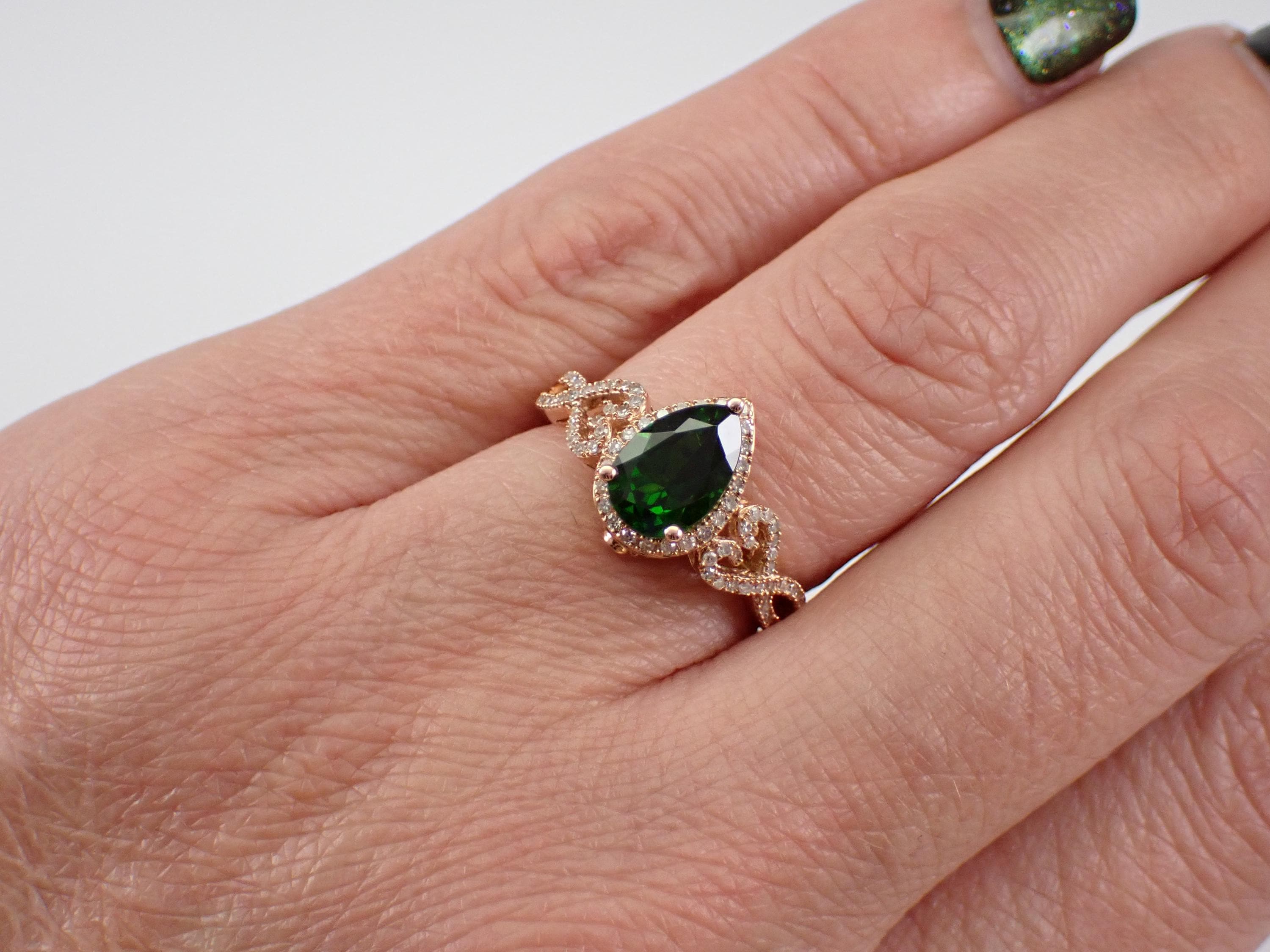 Solid Rose Gold Chrome Diopside and Diamond Engagement Ring. This ring is set with one Pear shaped Chrome Diopside in the center and seventy-three natural Round Diamonds. The center Gemstone is a deep green color, measures 9 X 6 mm and weighs 1 carat. The diamonds in this ring are H color, SI/I1 clarity and weigh a total of .30 carat. This ring is 10K Rose Gold, weighs 3.2 grams and is a finger size 7, which can be resized (please inquire about sizing with the finger size you need). This ring will be accompanied by an appraisal written by a GIA Certified Diamond Grader with the retail replacement value of $1,495.00. I will ship this ring promptly in a beautiful gift box.