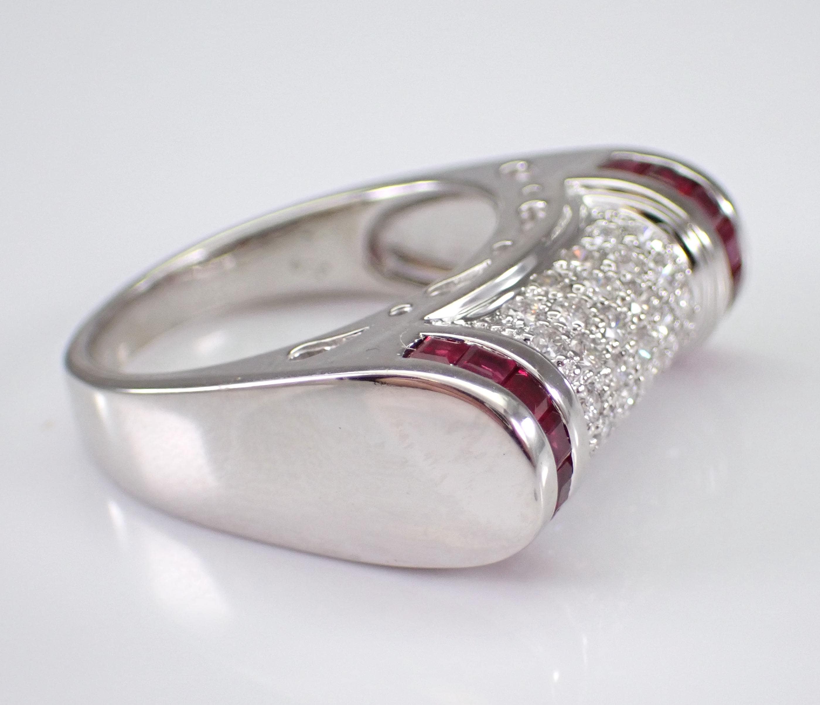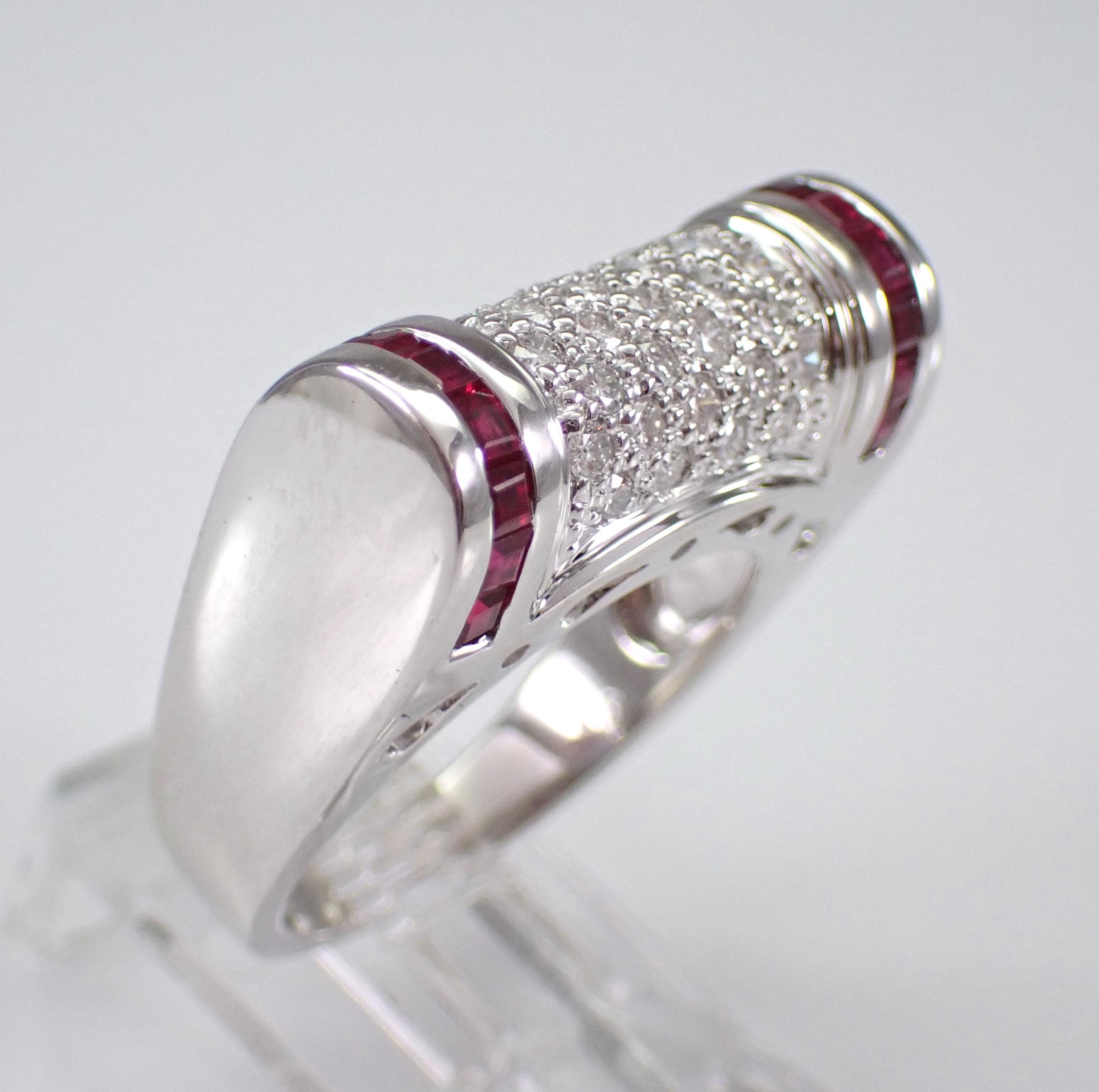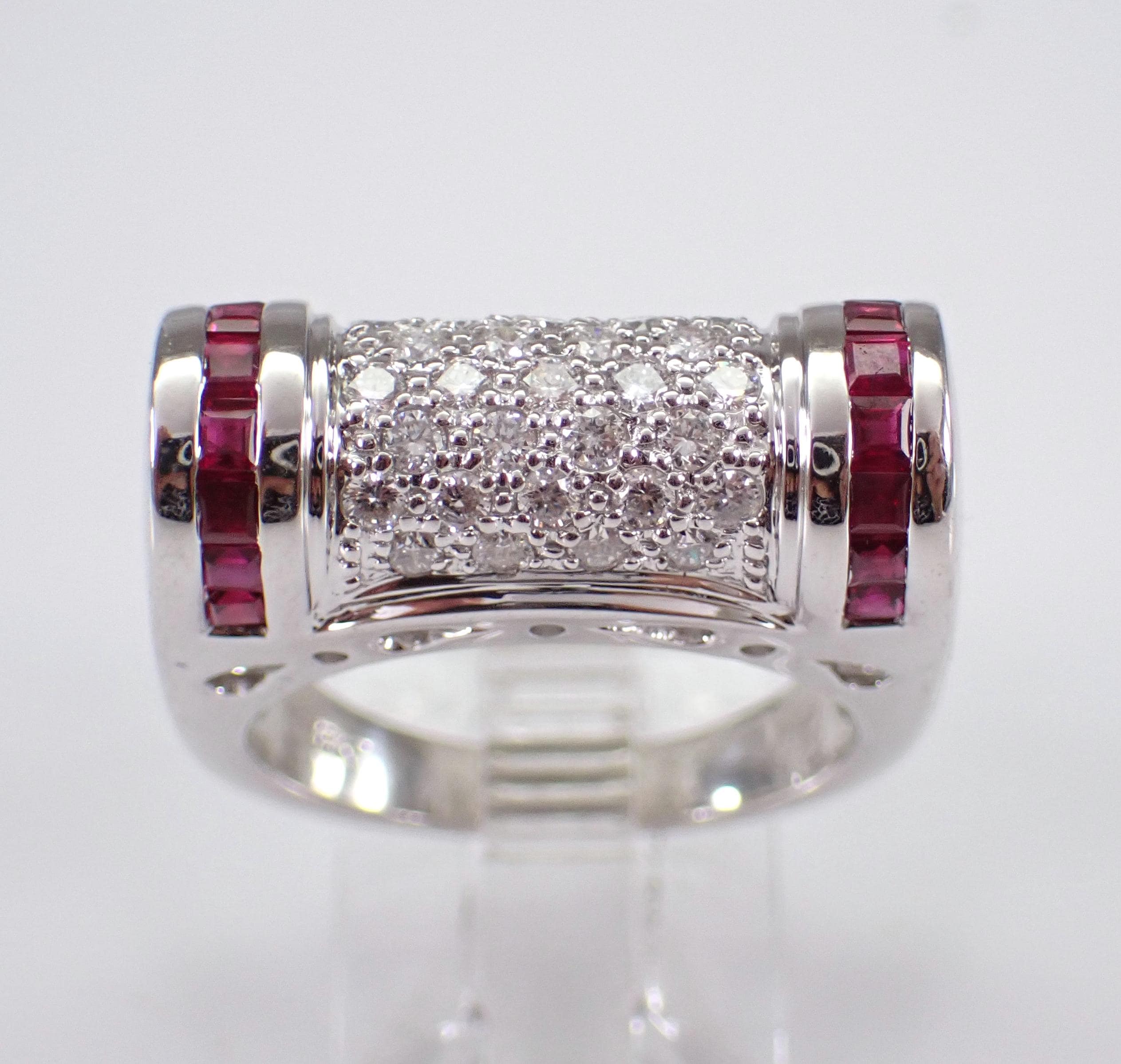 18K White Gold Diamond and Ruby wedding ring anniversary band. This ring is set with thirty-one genuine Round Brilliant Diamonds and sixteen natural Square Rubies. These diamonds are G color, SI clarity and weigh a total of 1/2 carat. The Rubies in this ring are a Blood Red color and weigh a total of 1/2 carat. This ring is 18KT White Gold, weighs 10.9 grams, measures 8.5 mm in width and is a finger size 7, can be resized (please inquire about sizing with the finger size you need). This ring will also be accompanied by an appraisal by a GIA Certified Diamond Grader with the replacement value of $4,985.00. I will ship this ring promptly in a beautiful gift box.