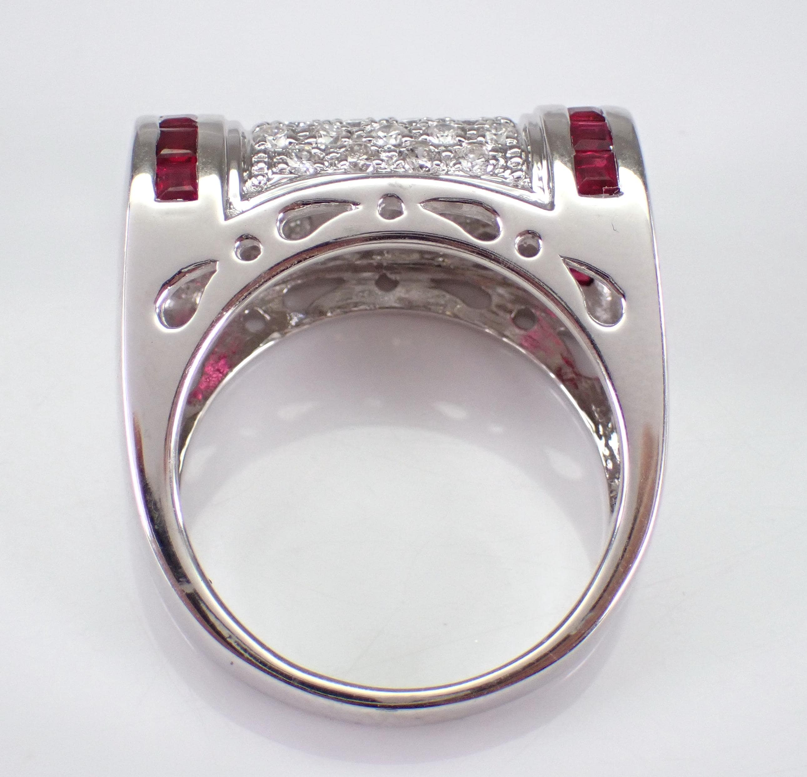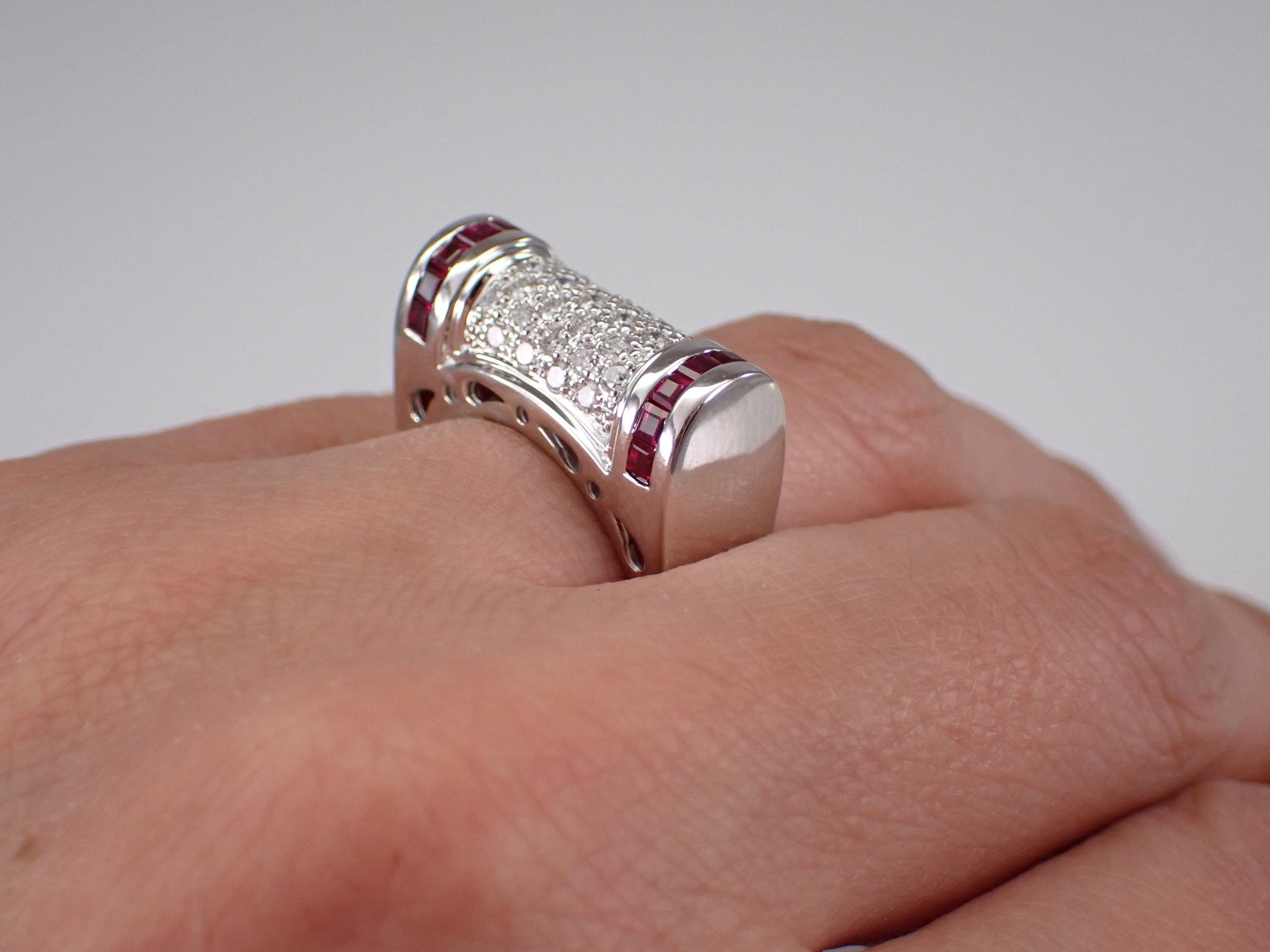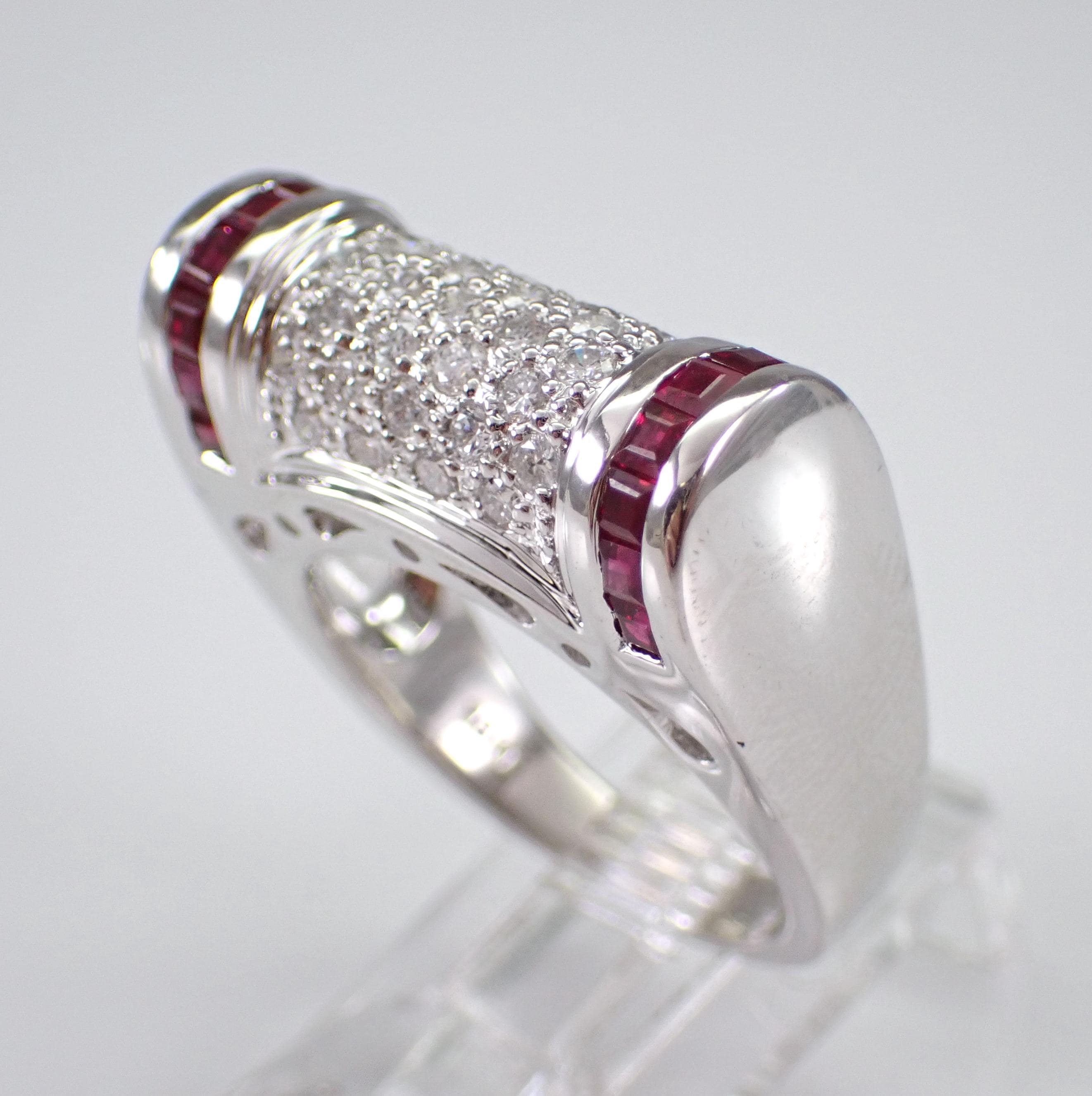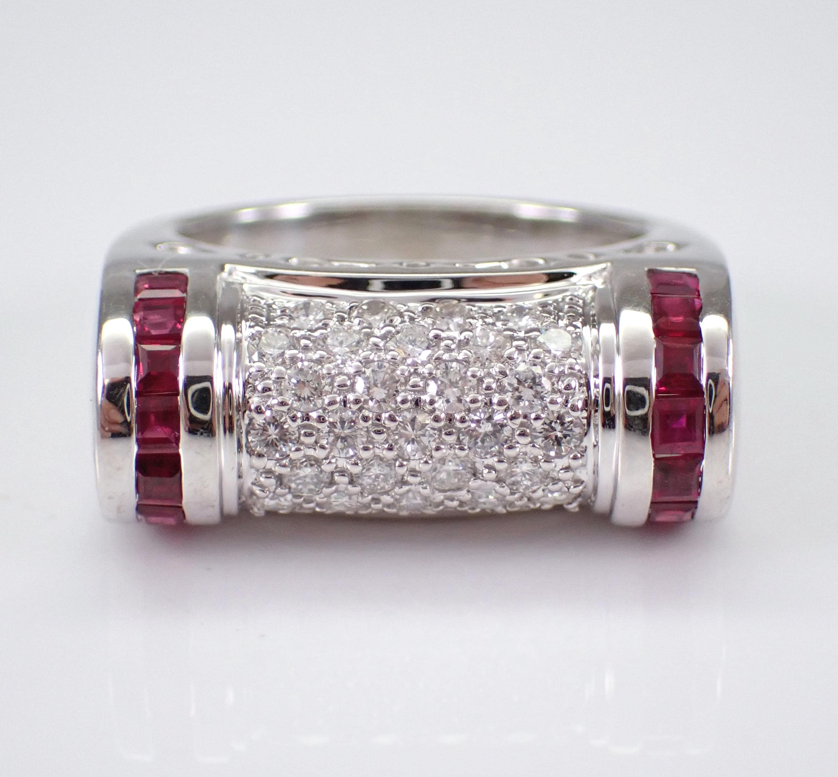 18K White Gold Diamond and Ruby wedding ring anniversary band. This ring is set with thirty-one genuine Round Brilliant Diamonds and sixteen natural Square Rubies. These diamonds are G color, SI clarity and weigh a total of 1/2 carat. The Rubies in this ring are a Blood Red color and weigh a total of 1/2 carat. This ring is 18KT White Gold, weighs 10.9 grams, measures 8.5 mm in width and is a finger size 7, can be resized (please inquire about sizing with the finger size you need). This ring will also be accompanied by an appraisal by a GIA Certified Diamond Grader with the replacement value of $4,985.00. I will ship this ring promptly in a beautiful gift box.