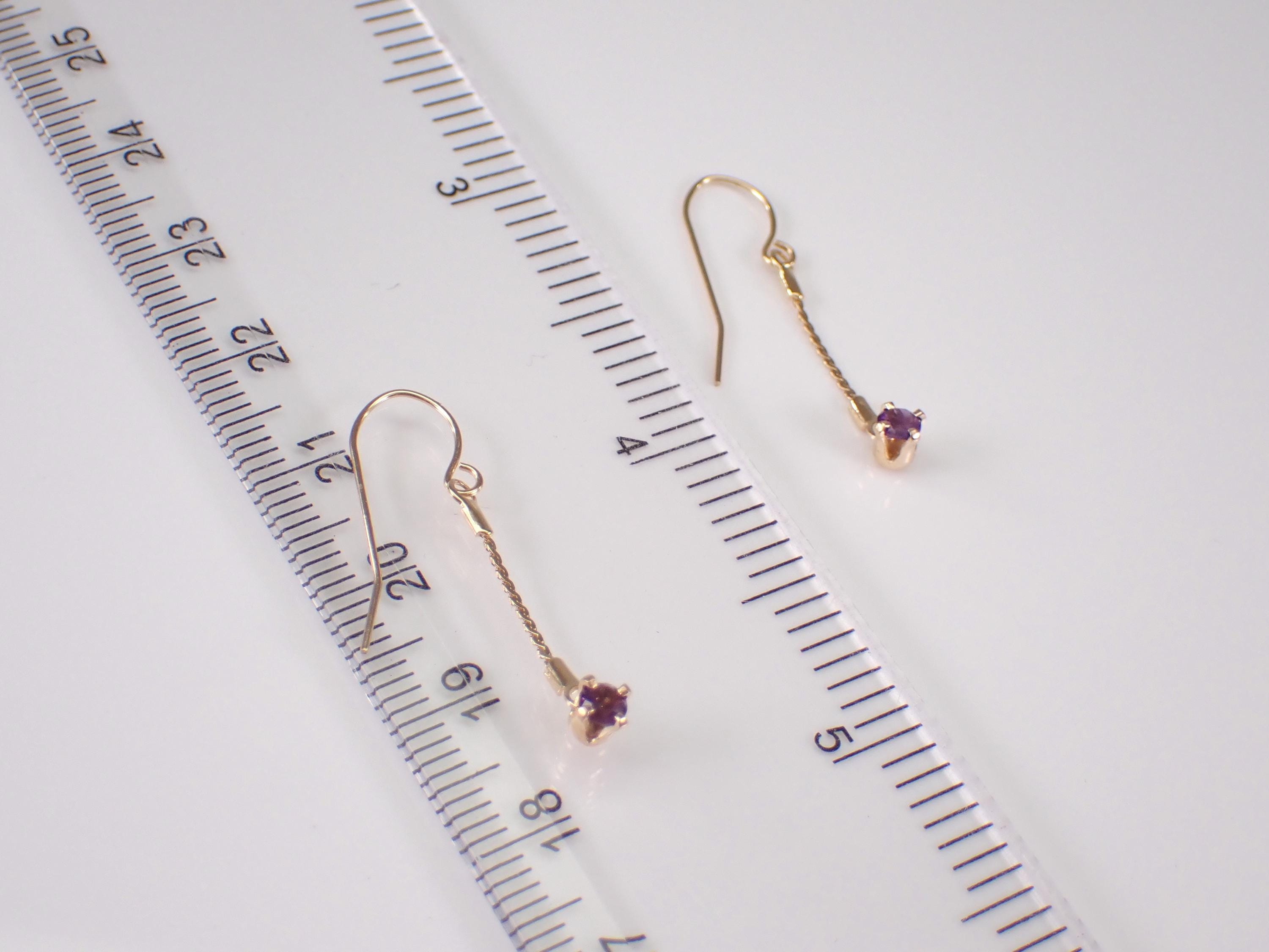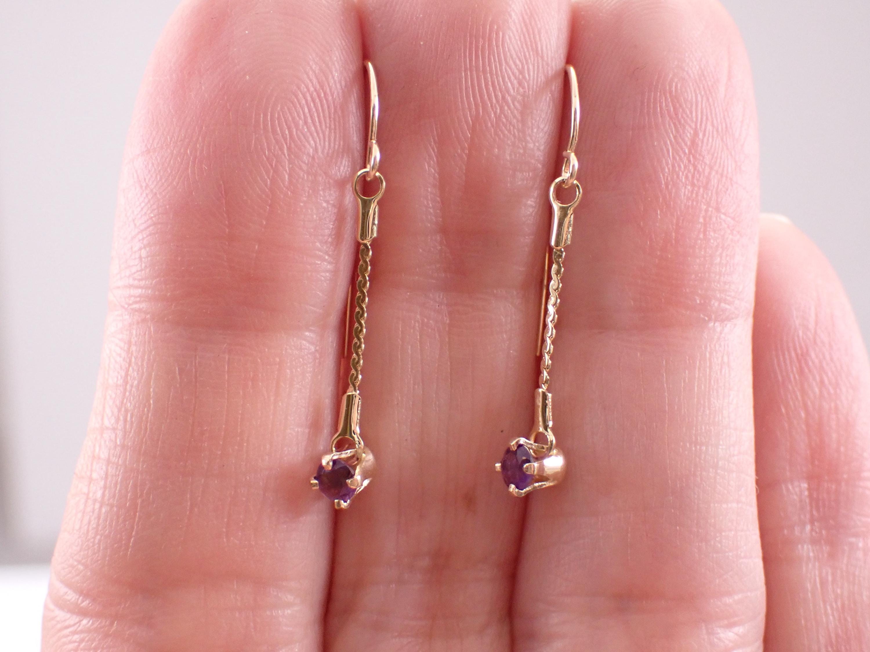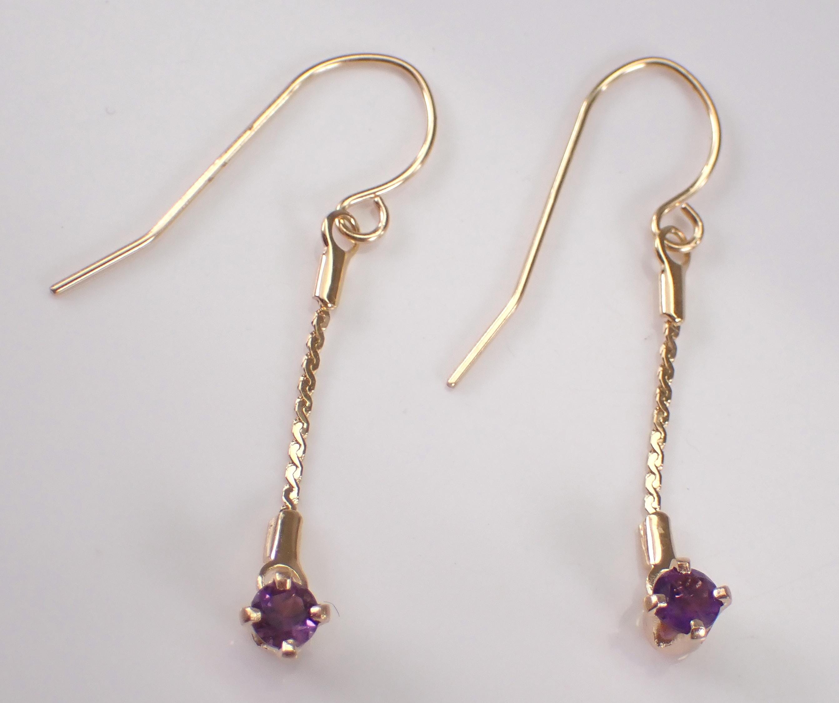 Vintage 14k Yellow Gold Amethyst Earrings. These earrings are set with two genuine Round Amethysts set in these earrings. The Amethyst measure 3 mm in diameter each and is set in a four prong setting to dangle off the kidney wire hook. These earrings weigh a total of .8 grams and measure 1 1/4" in length. I will ship these earrings promptly in a gift box.
