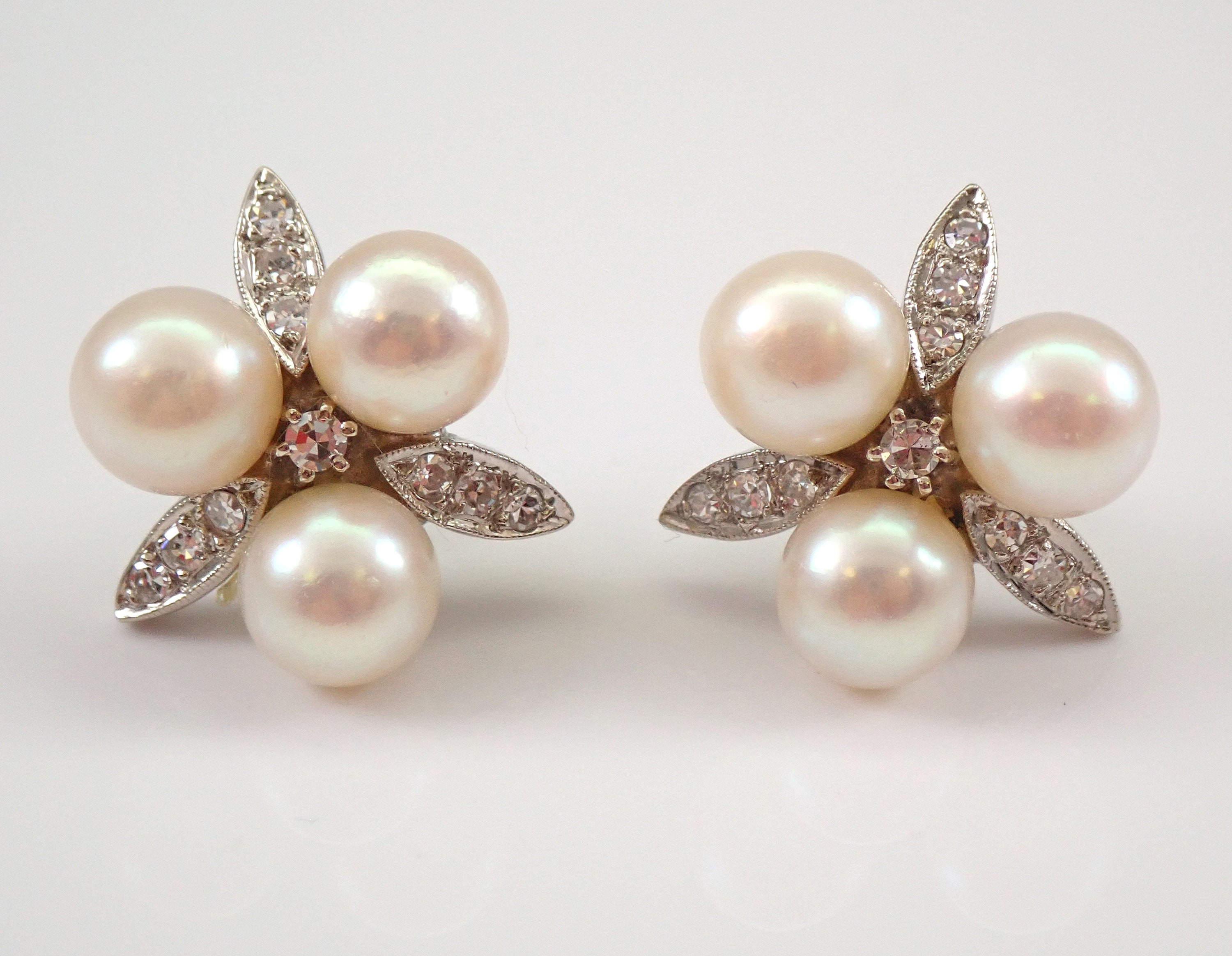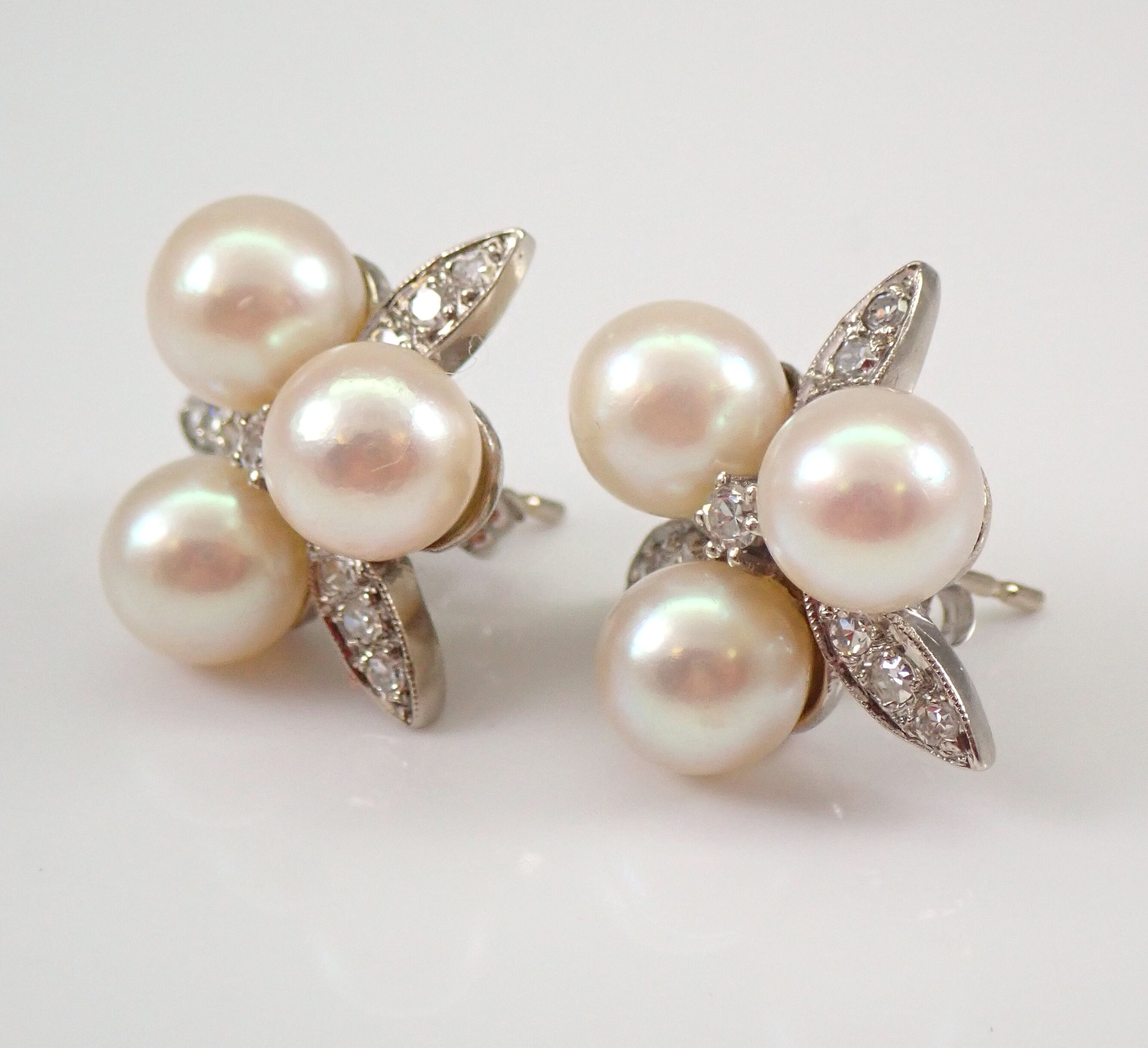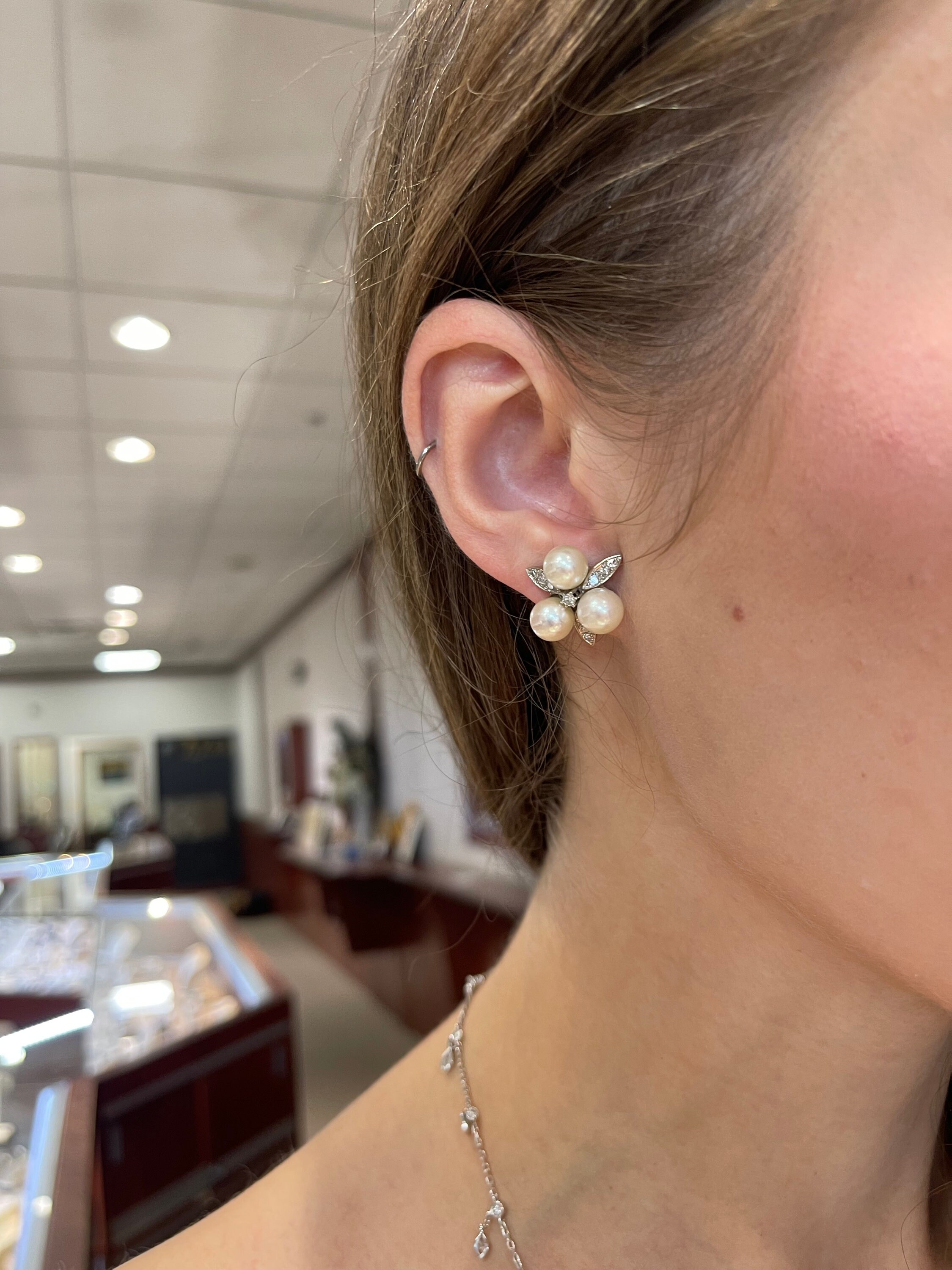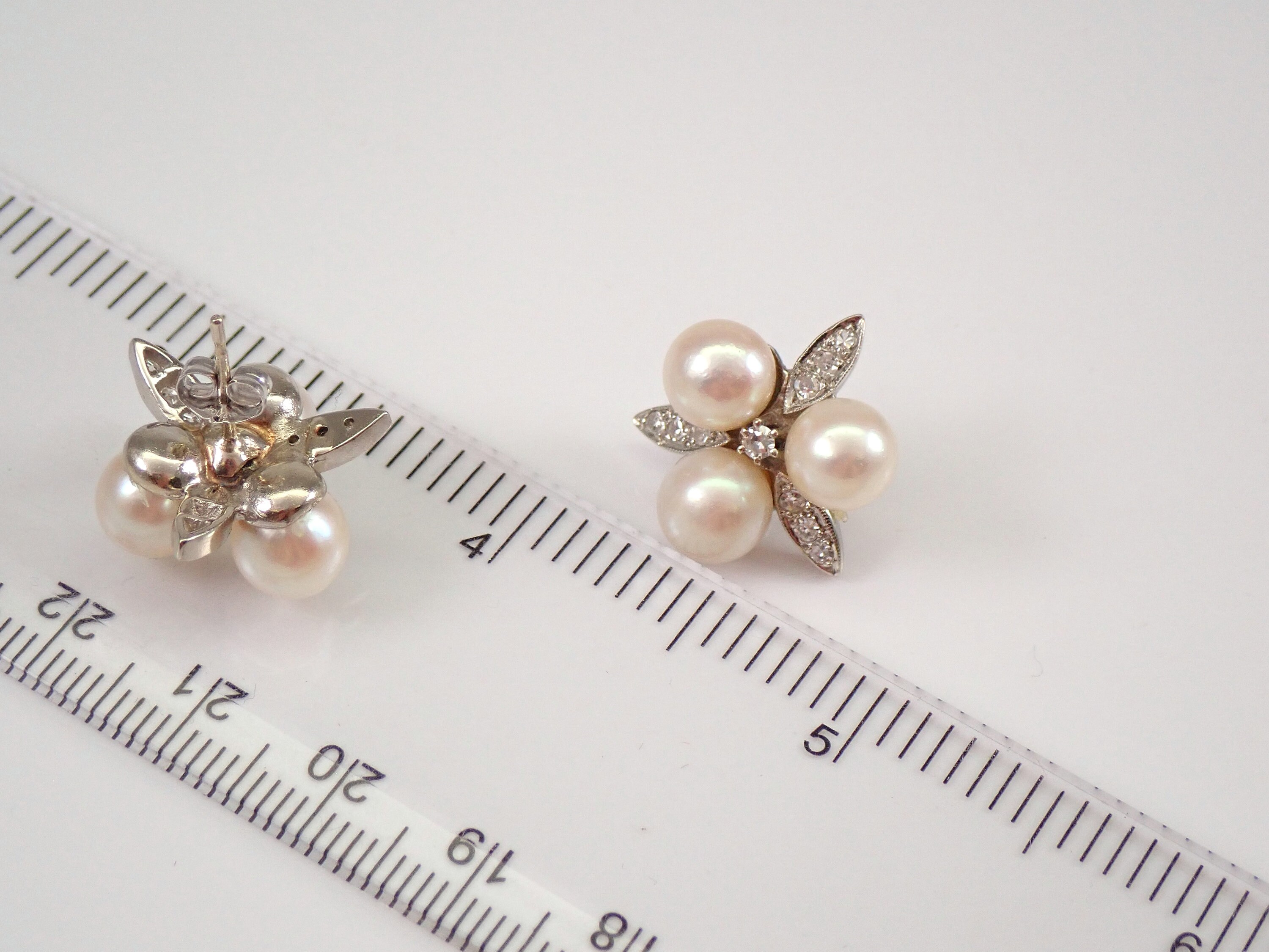 14K White Gold Pearl and Diamond Stud Earrings. These earrings are set with six Round White Pearls and twenty genuine Round Diamonds. These Pearls measure 7 mm in diameter each. The Diamonds in these earrings are F color, VS clarity and weigh a total of .30 carat. These earrings are 14KT White Gold and weigh a total of 7.8 grams. These earrings are for pierced ears, measure 17 X 17 mm and the earrings have friction post backings. These earrings will be accompanied by an appraisal written by a GIA Certified Diamond Grader with the retail replacement value of $3,495.00. I will ship these earrings promptly in a gift box.