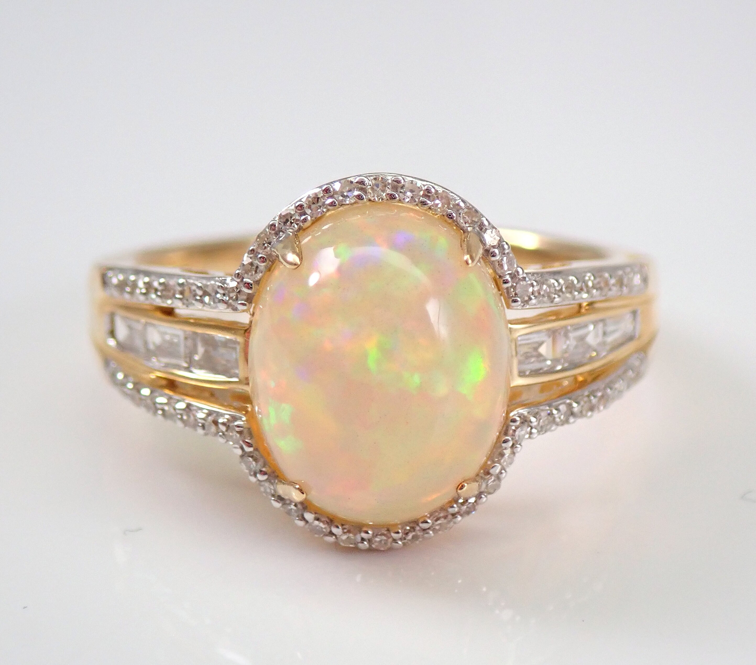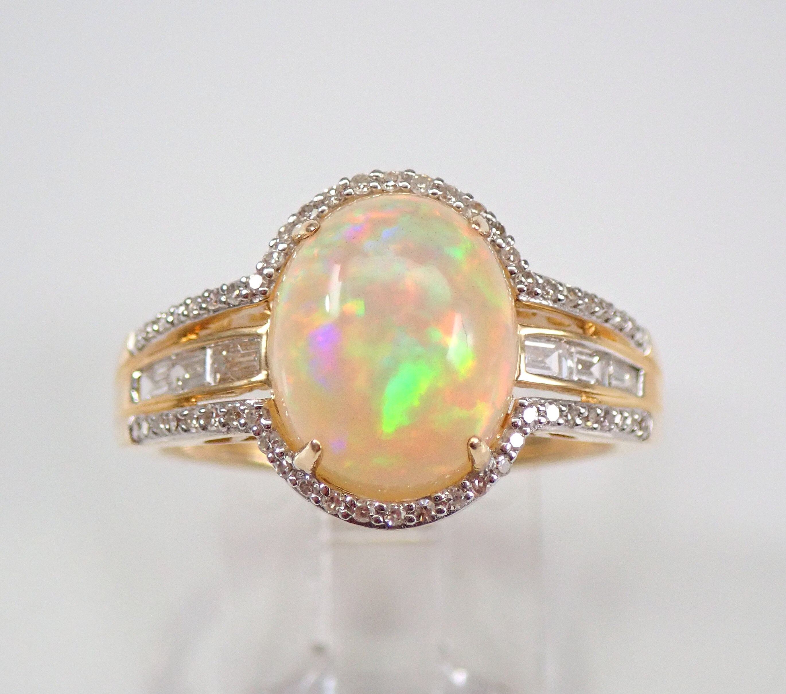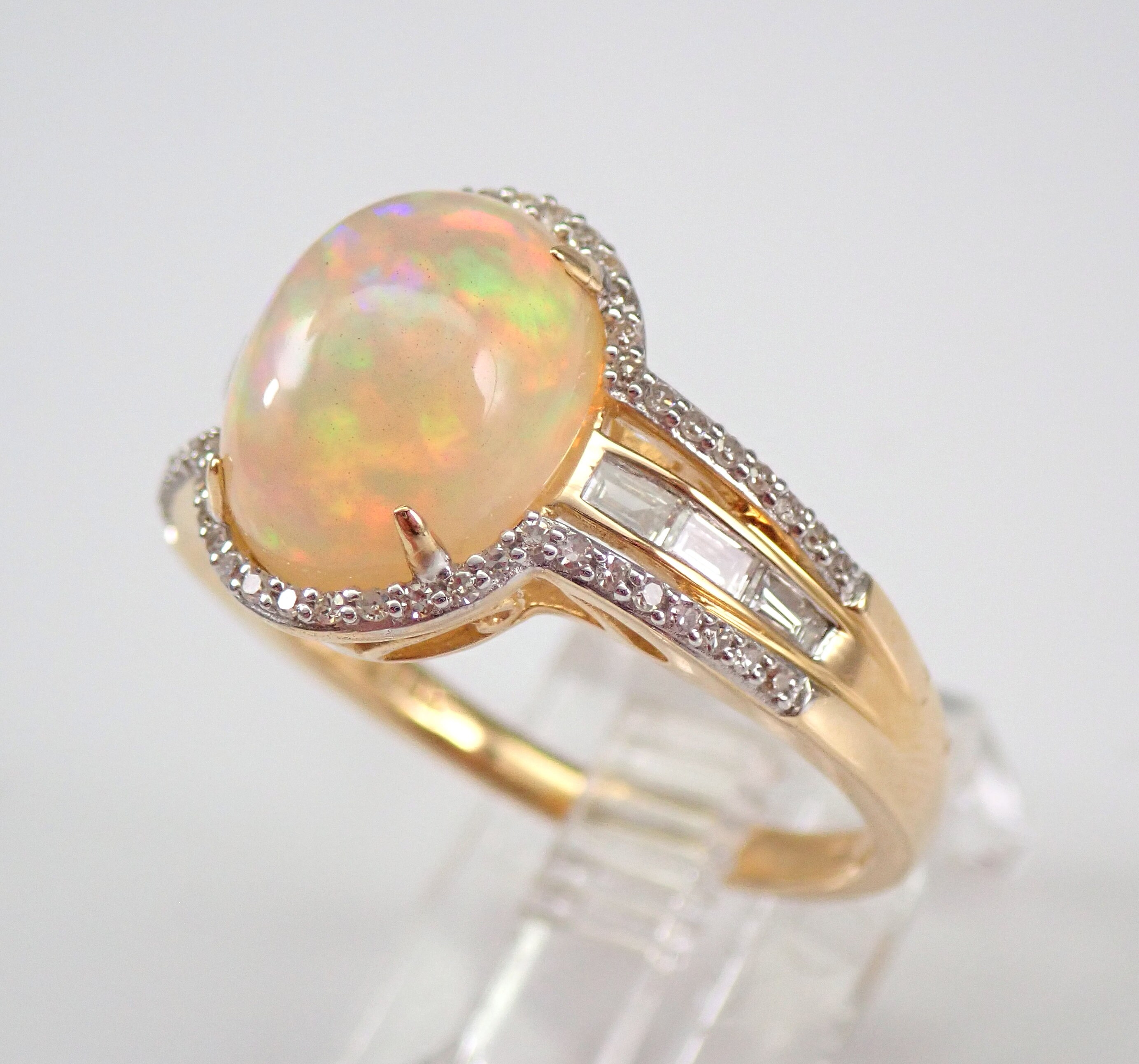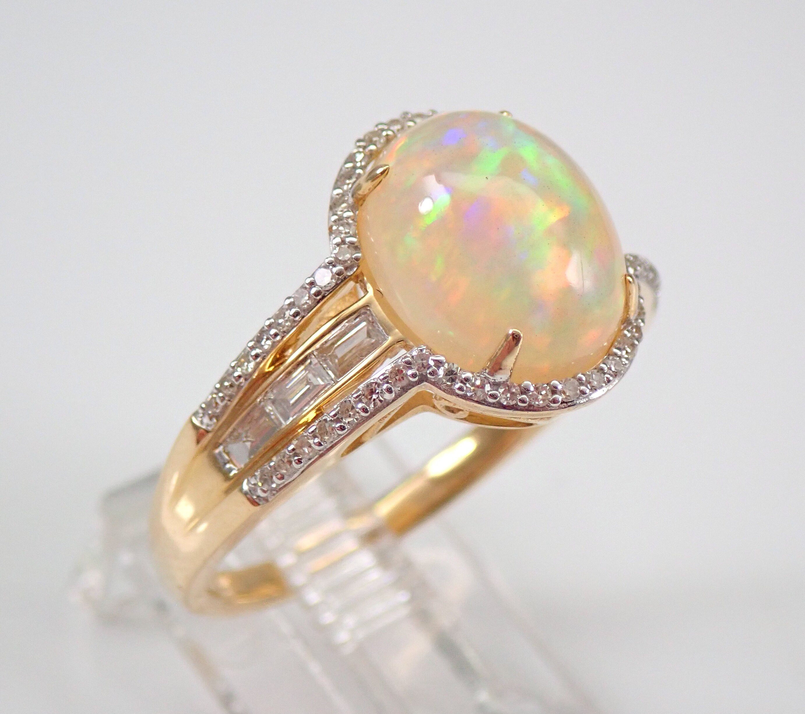 14K Yellow Gold Diamond and Opal Engagement Ring. This ring is set with one genuine Oval Ethiopian Opal in the center, fifty-four genuine round brilliant diamonds and six natural Baguette Diamonds. The Opal measures 11 X 9 mm and weighs 2 carats. The diamonds in this ring are H color, SI1/VS2 clarity and weigh a total of .40 carat. This ring is 14KT Yellow Gold, weighs 4.1 grams and is a finger size 8, which can be resized free of charge (please inquire about sizing with the finger size you need). This ring will be accompanied by an appraisal written by a GIA Certified Diamond Grader with the retail replacement value of $2,495.00. I will ship this ring promptly in a beautiful gift box.