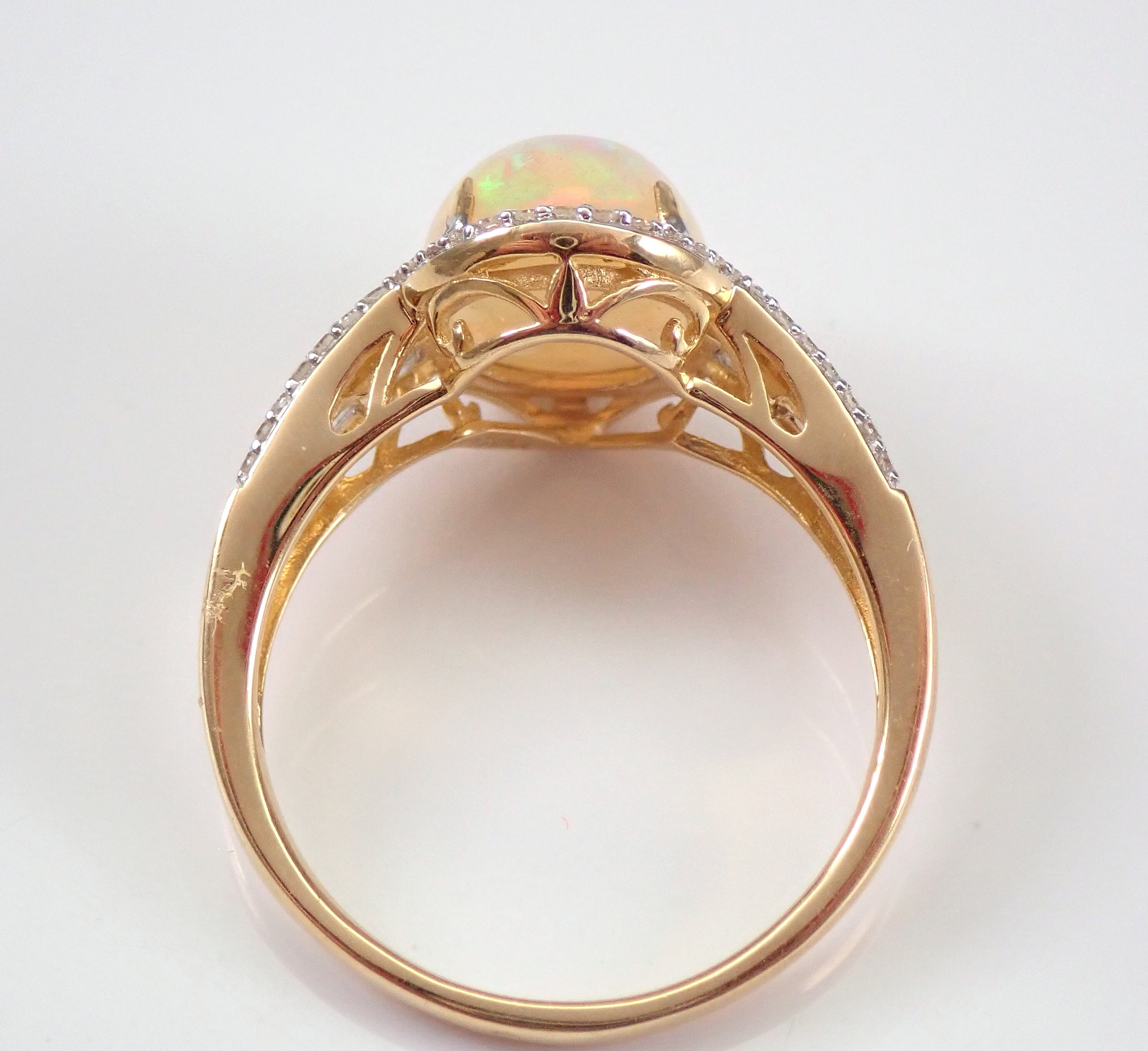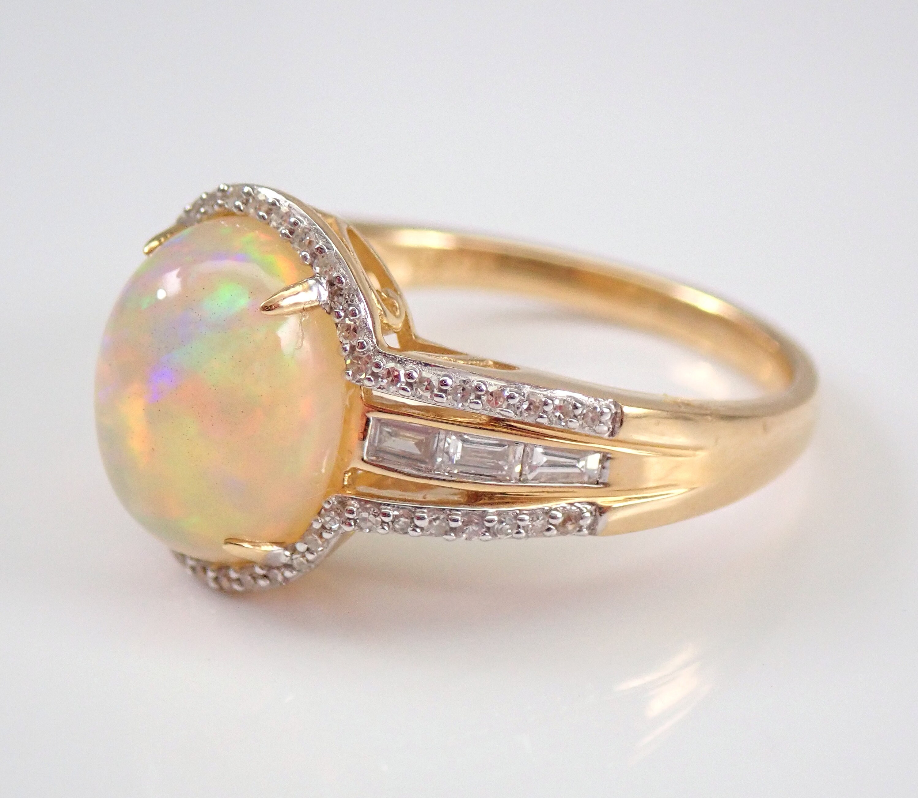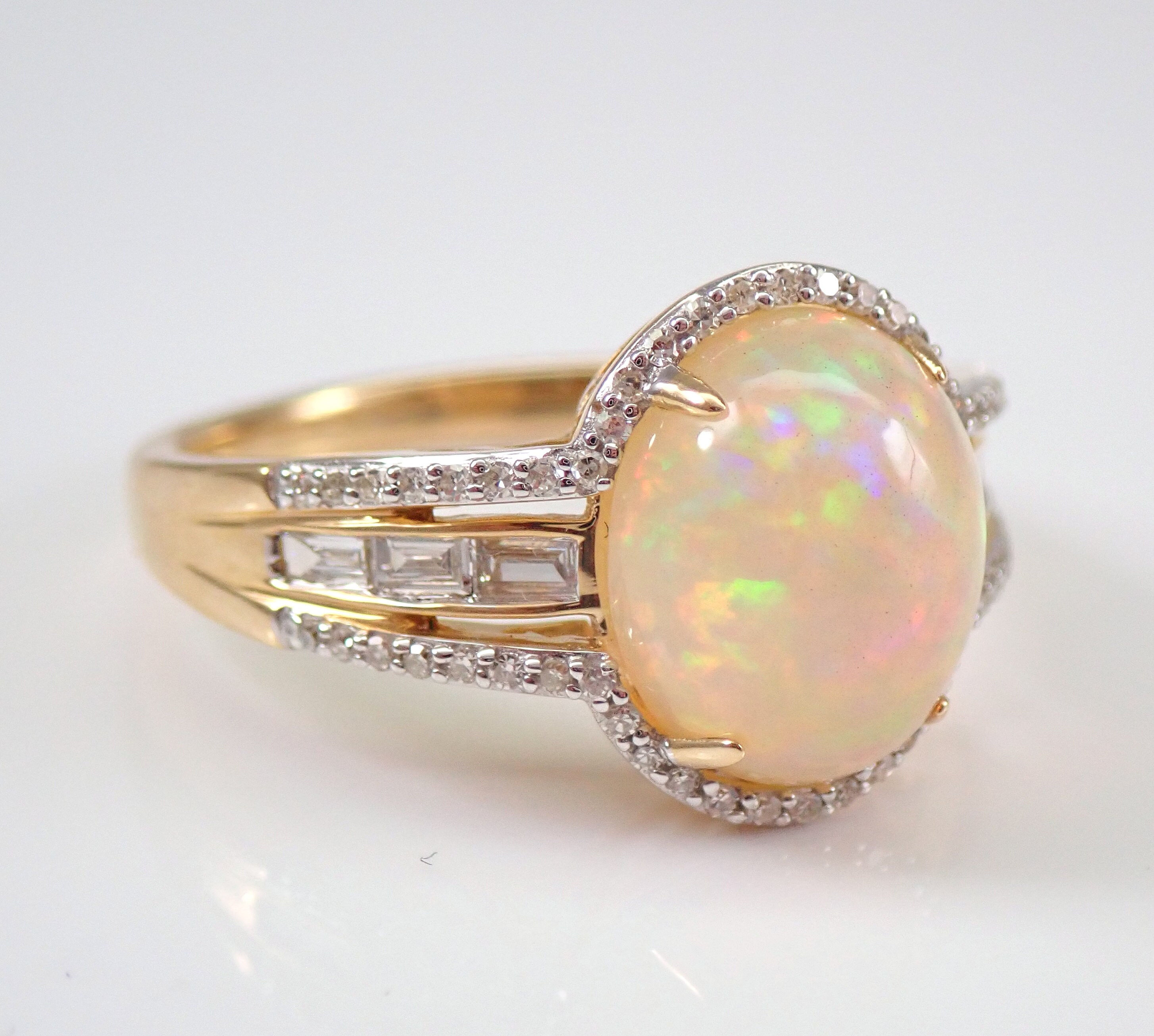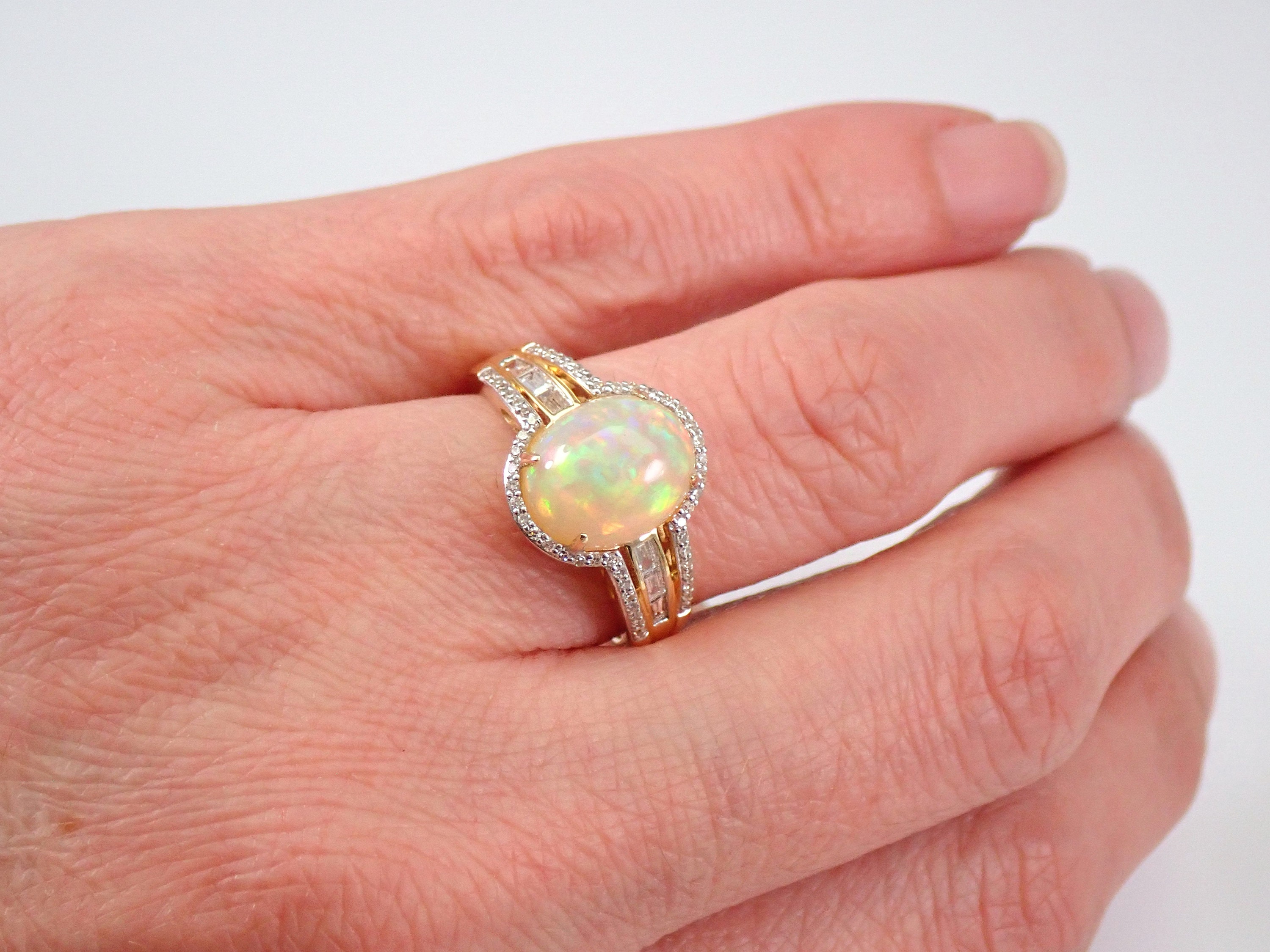 14K Yellow Gold Diamond and Opal Engagement Ring. This ring is set with one genuine Oval Ethiopian Opal in the center, fifty-four genuine round brilliant diamonds and six natural Baguette Diamonds. The Opal measures 11 X 9 mm and weighs 2 carats. The diamonds in this ring are H color, SI1/VS2 clarity and weigh a total of .40 carat. This ring is 14KT Yellow Gold, weighs 4.1 grams and is a finger size 8, which can be resized free of charge (please inquire about sizing with the finger size you need). This ring will be accompanied by an appraisal written by a GIA Certified Diamond Grader with the retail replacement value of $2,495.00. I will ship this ring promptly in a beautiful gift box.