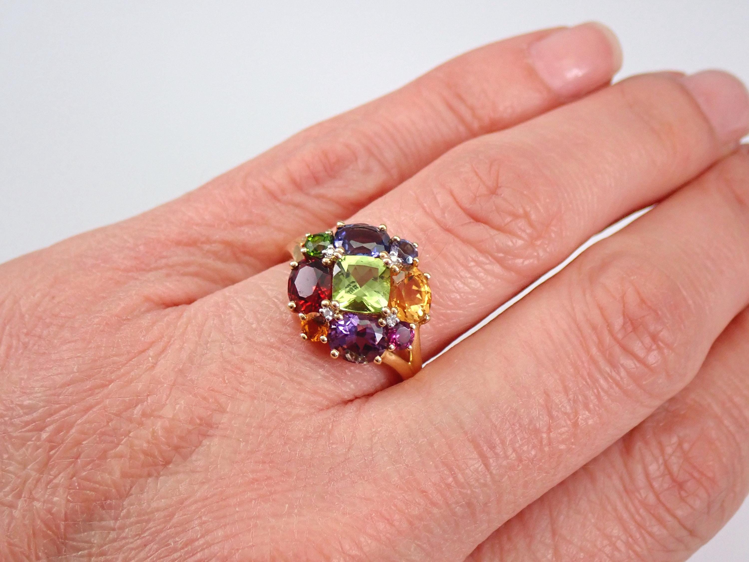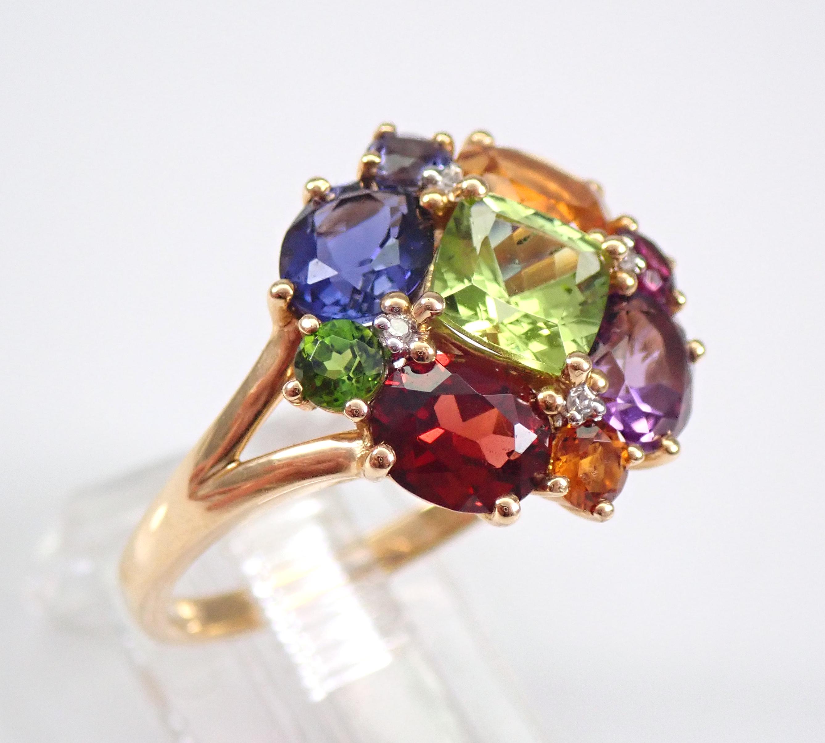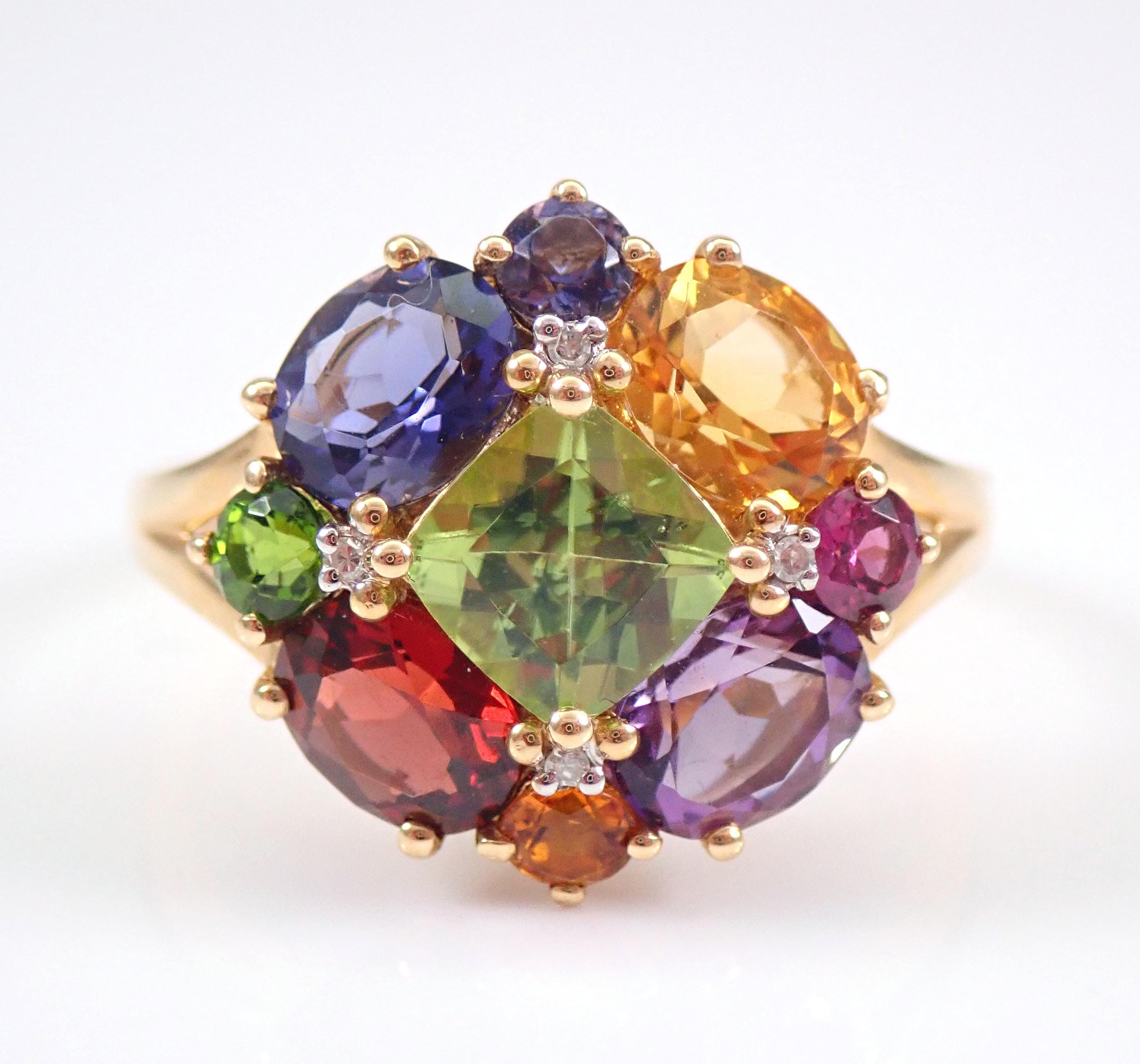 14K Yellow Gold Multi Color Gemstone and Diamond Ring. This ring is set with one Cushion Cut Peridot in the center. This peridot measures 6 X 6 mm. There are four Oval gemstones set around the center. These Ovals are: Amethyst, Garnet, Citrine and Tanzanite. There are also natural Round Gemstones, these are: Iolite, Tsavorite, Garnet and Citrine. The Round Brilliant Diamond accents in this ring are also set in the corners of the center gem. These diamonds are H color, I clarity and weigh a total of .04 carat. The gemstones in this ring weigh a total of 2 3/4 carats. This ring is 14KT Yellow Gold, weighs 3.9 grams and is a finger size 7, which can be resized (please inquire about sizing with the finger size you need). This ring will be accompanied by an appraisal by a GIA Certified Diamond Grader with the retail replacement value of $1,485.00. I will ship this ring promptly in a gift box.