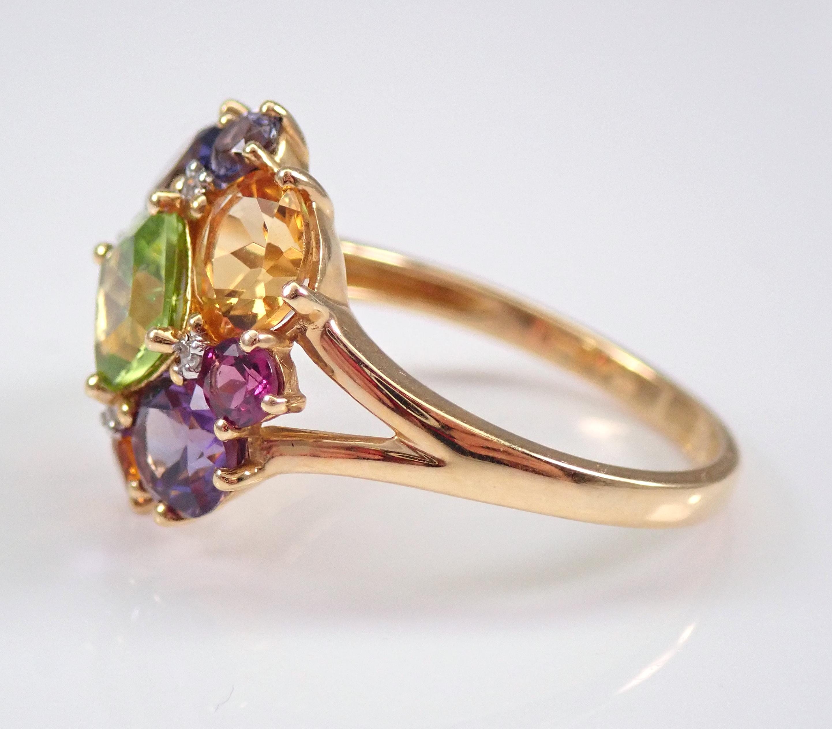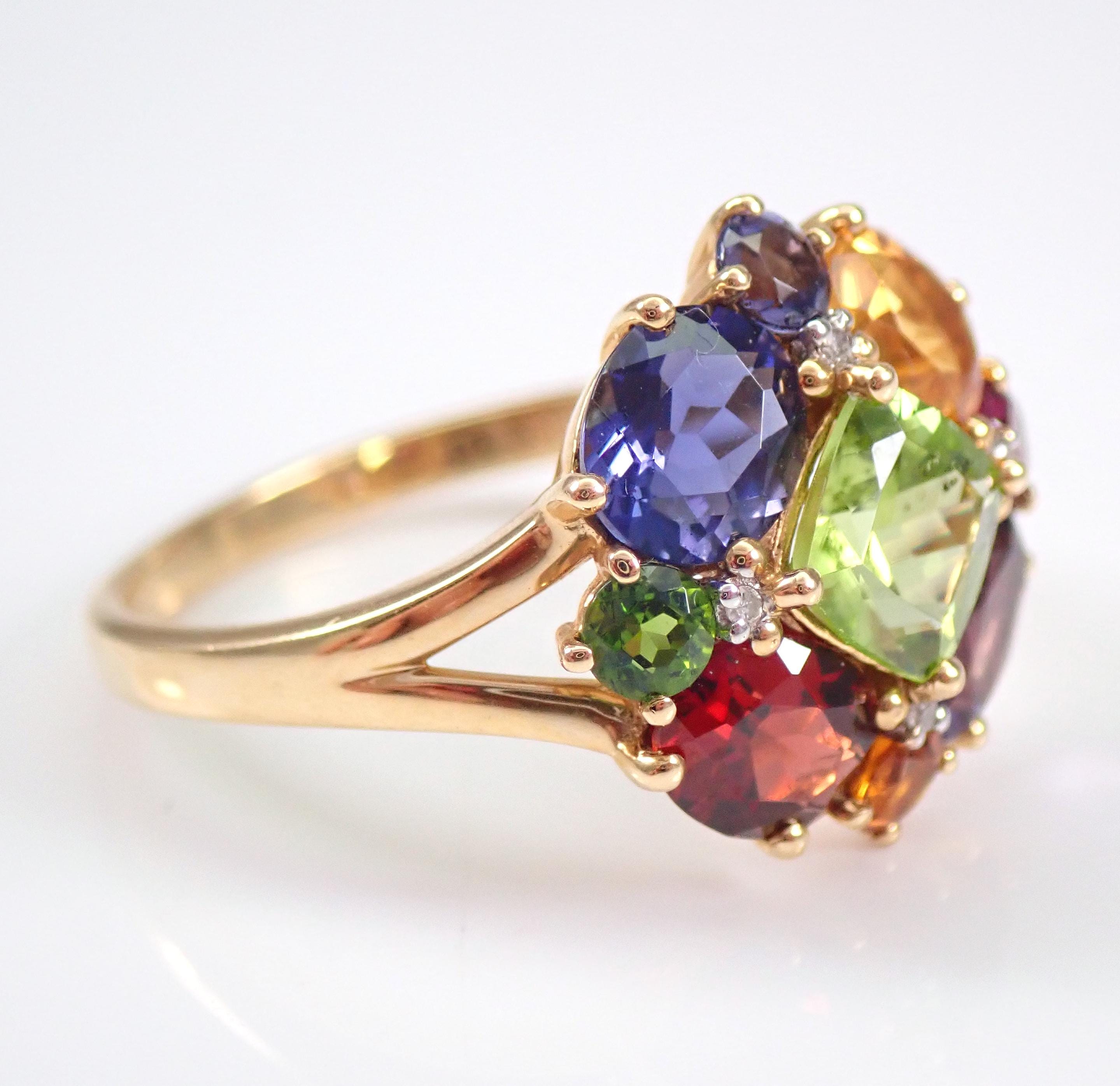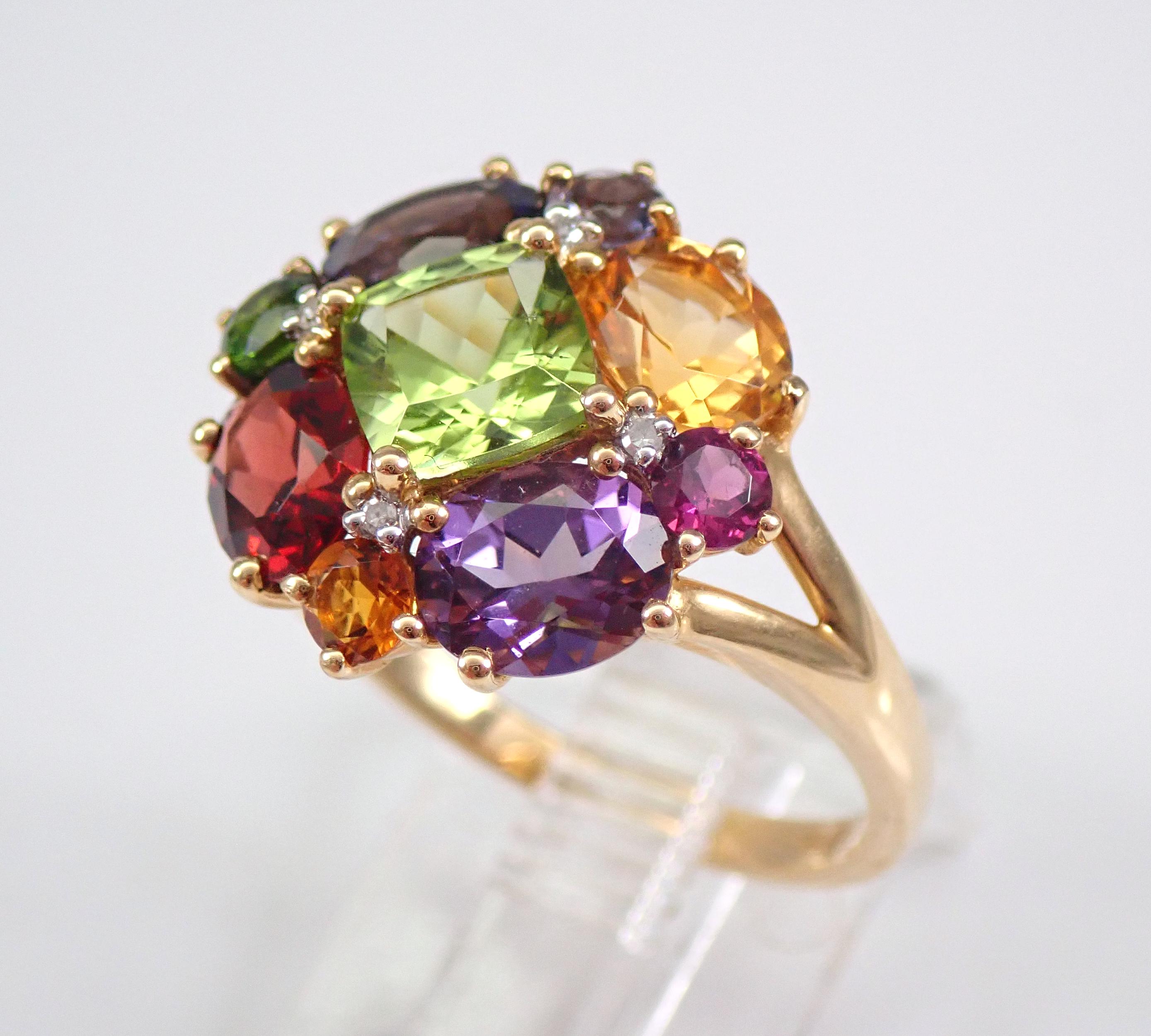 14K Yellow Gold Multi Color Gemstone and Diamond Ring. This ring is set with one Cushion Cut Peridot in the center. This peridot measures 6 X 6 mm. There are four Oval gemstones set around the center. These Ovals are: Amethyst, Garnet, Citrine and Tanzanite. There are also natural Round Gemstones, these are: Iolite, Tsavorite, Garnet and Citrine. The Round Brilliant Diamond accents in this ring are also set in the corners of the center gem. These diamonds are H color, I clarity and weigh a total of .04 carat. The gemstones in this ring weigh a total of 2 3/4 carats. This ring is 14KT Yellow Gold, weighs 3.9 grams and is a finger size 7, which can be resized (please inquire about sizing with the finger size you need). This ring will be accompanied by an appraisal by a GIA Certified Diamond Grader with the retail replacement value of $1,485.00. I will ship this ring promptly in a gift box.