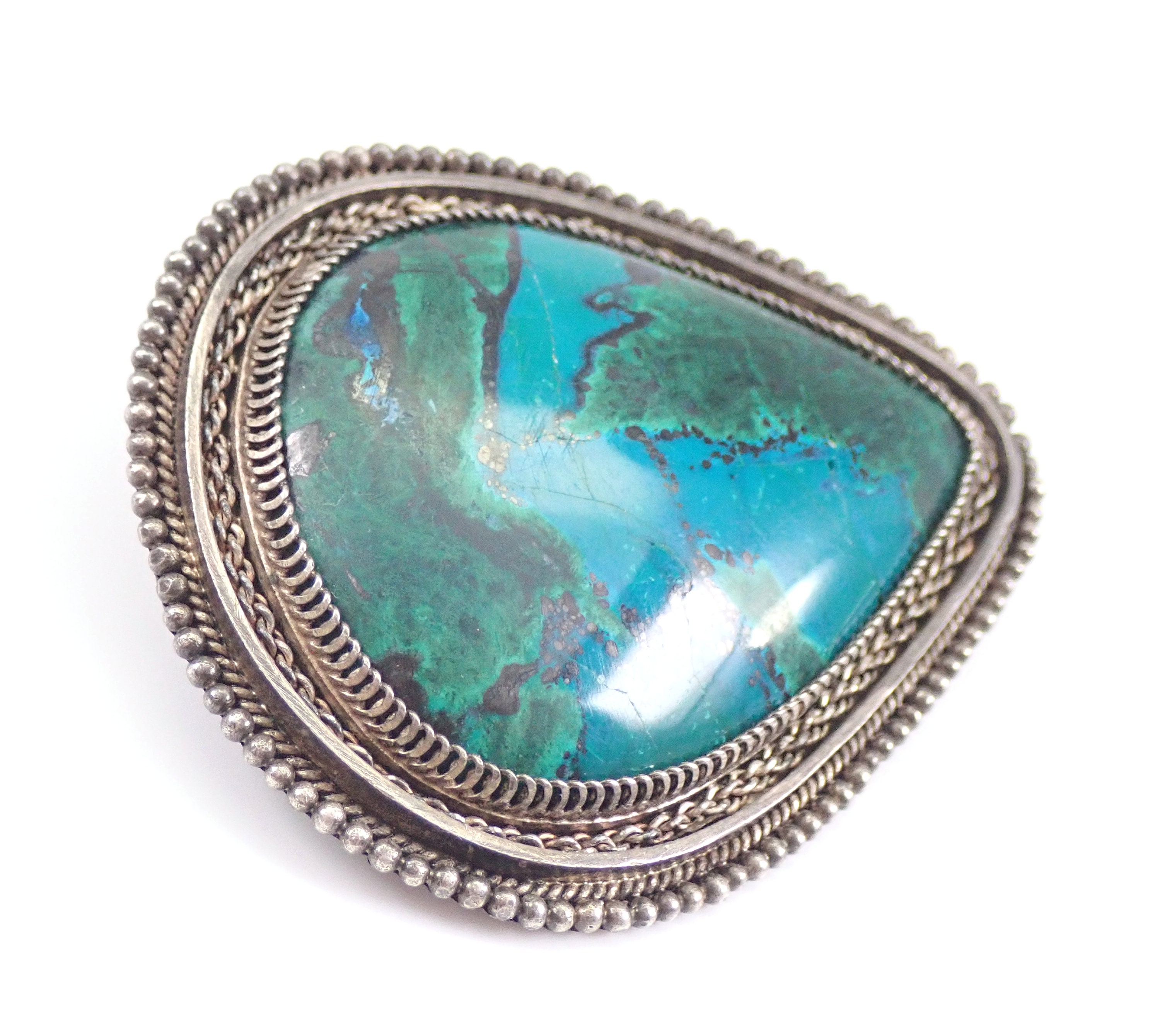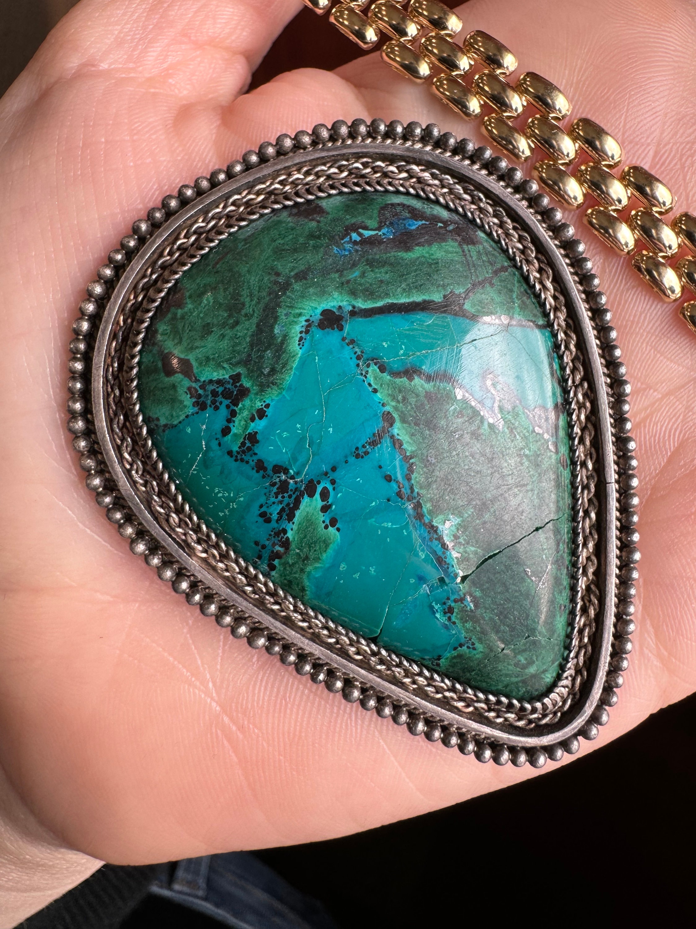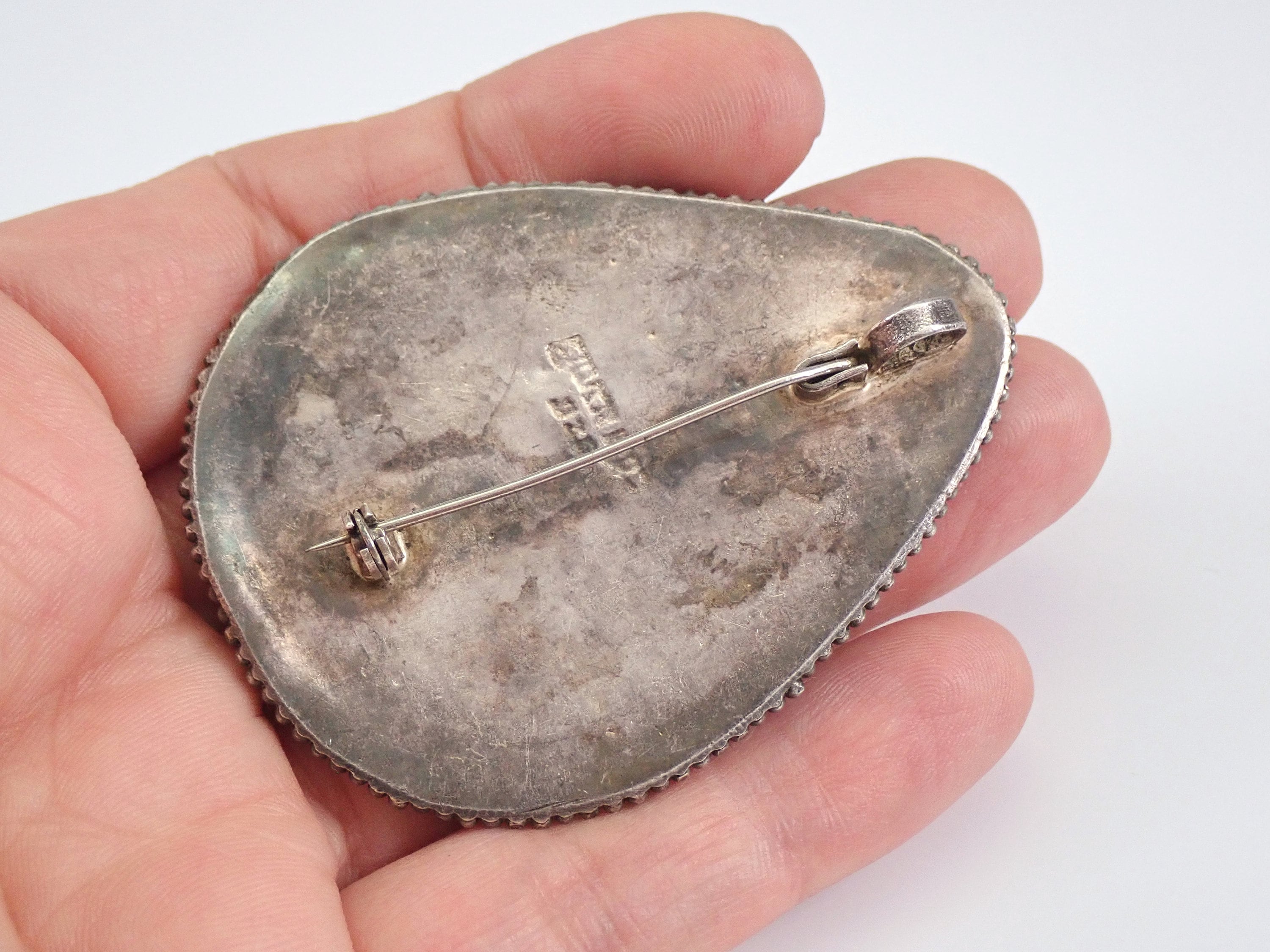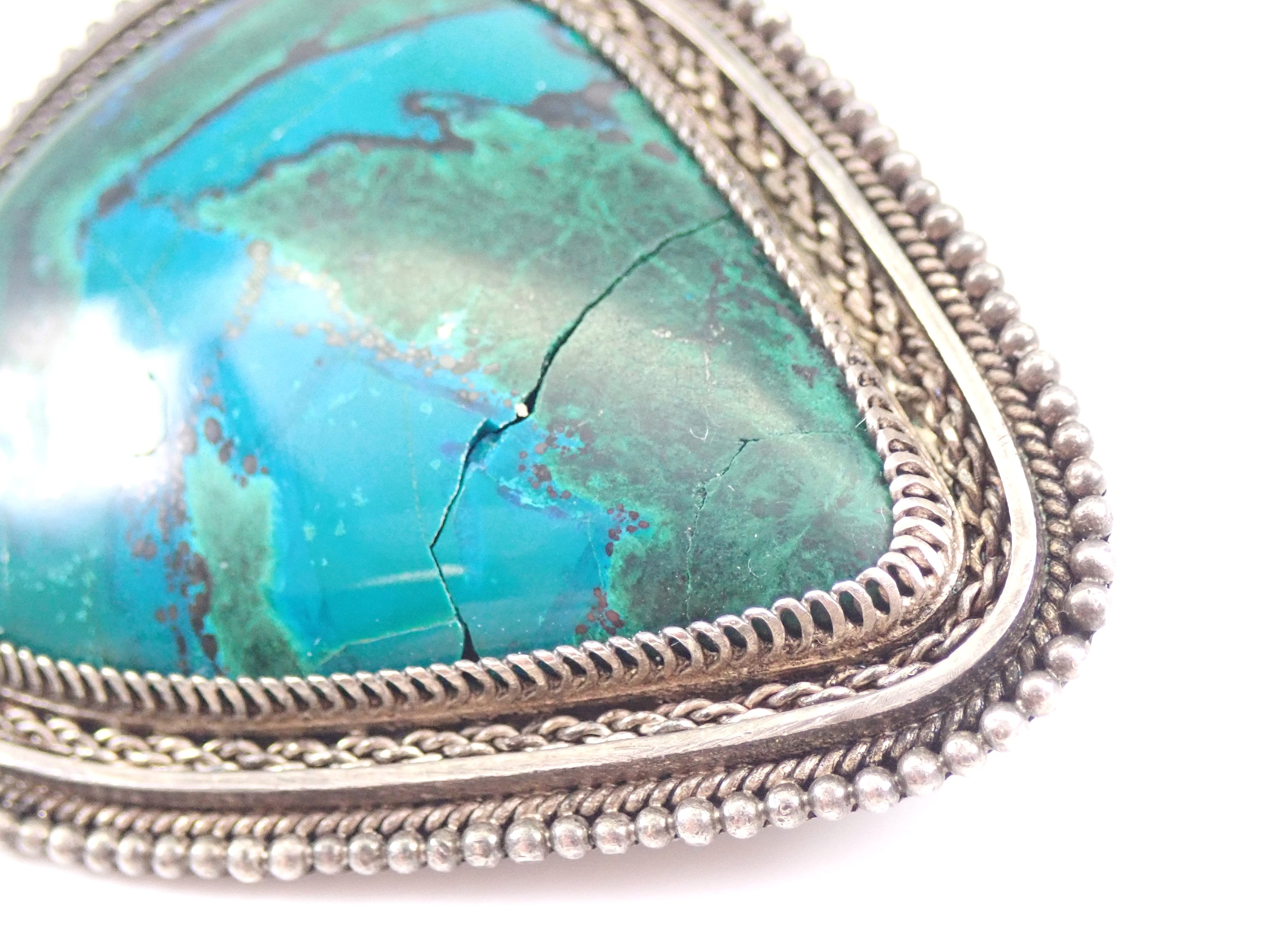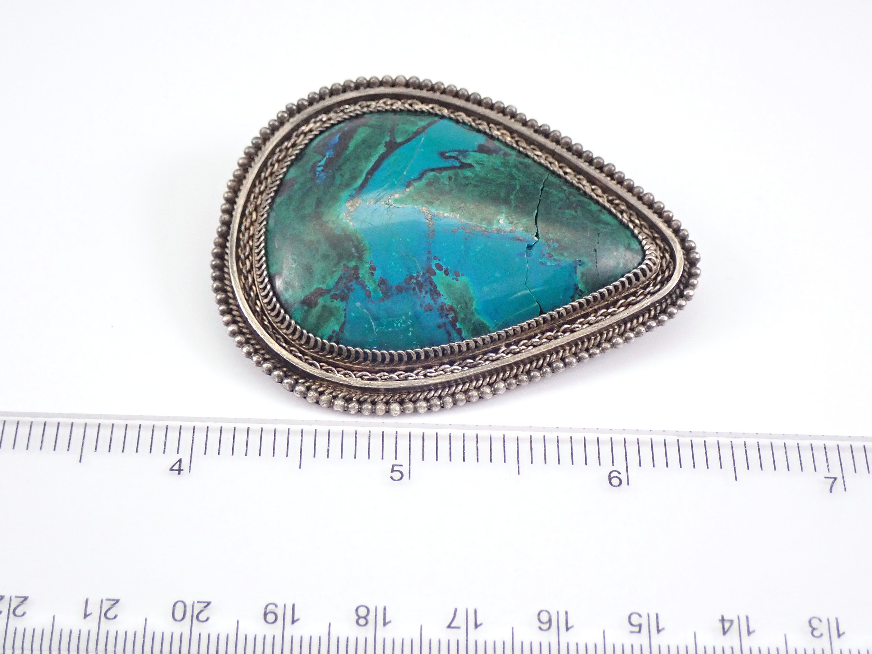 Genuine sterling silver unique artisan brooch set with a large Turquoise Gemstone (not certain about the gem being genuine or created). This Gemstone has a small crack in the corner which I tried to show on the photos. The brooch has a gorgeous design and decorative halo, it weighs 36.7 grams and measures 2 1/2 X 1 7/8 inches. This gorgeous large piece can also be worn on a chain as a pendant. Will be shipped promptly in a gift pouch.