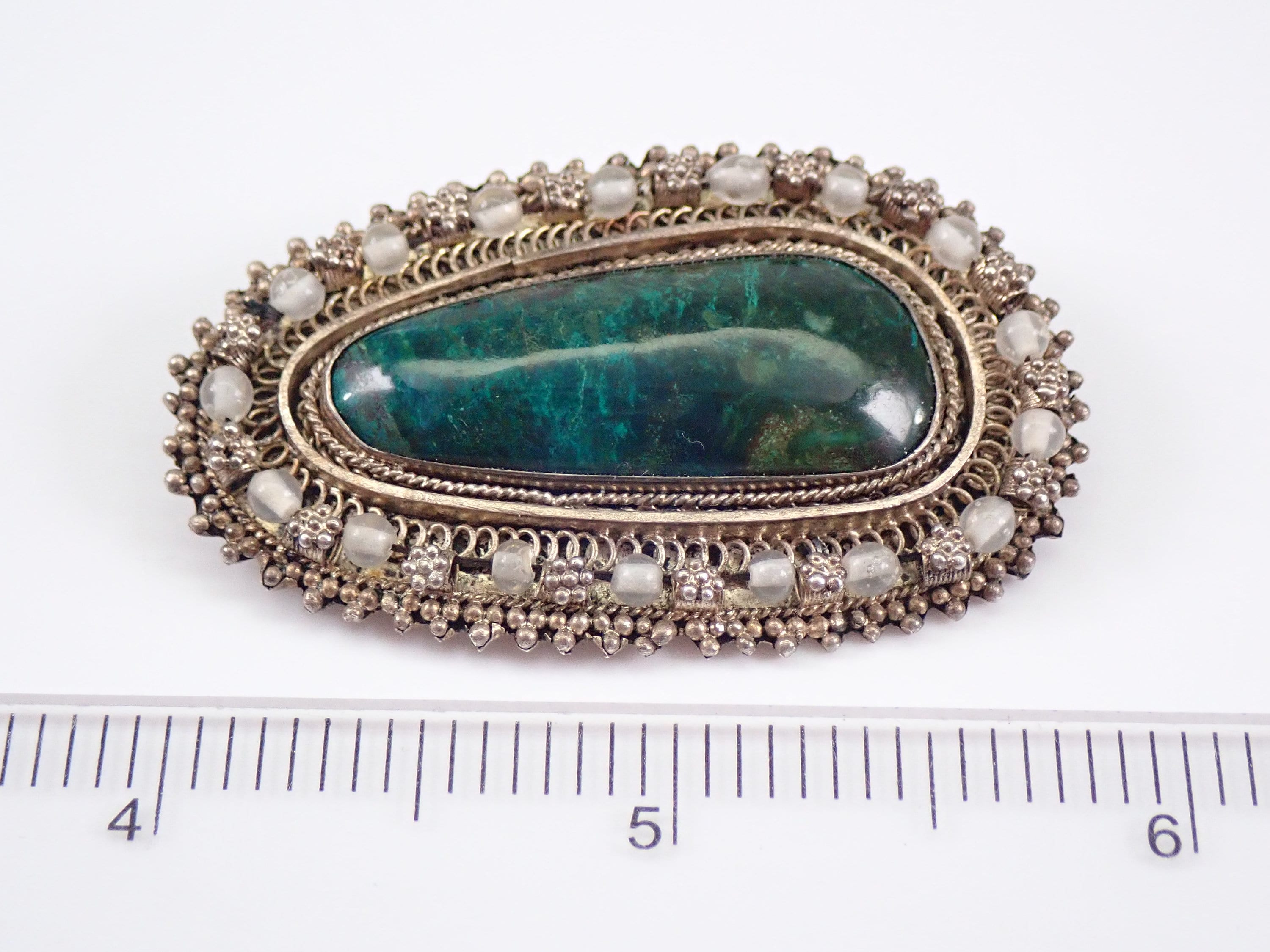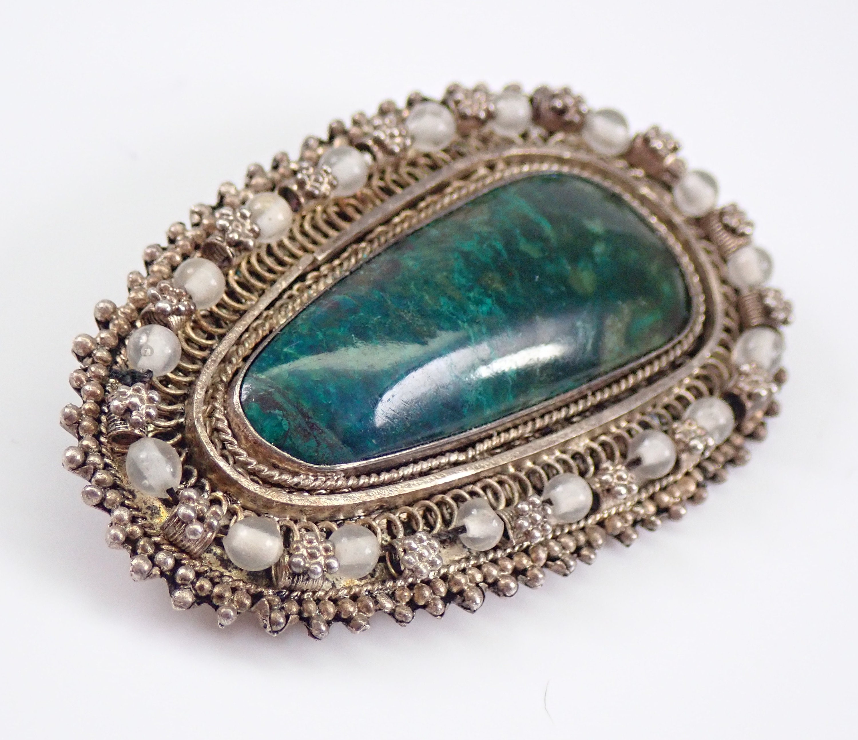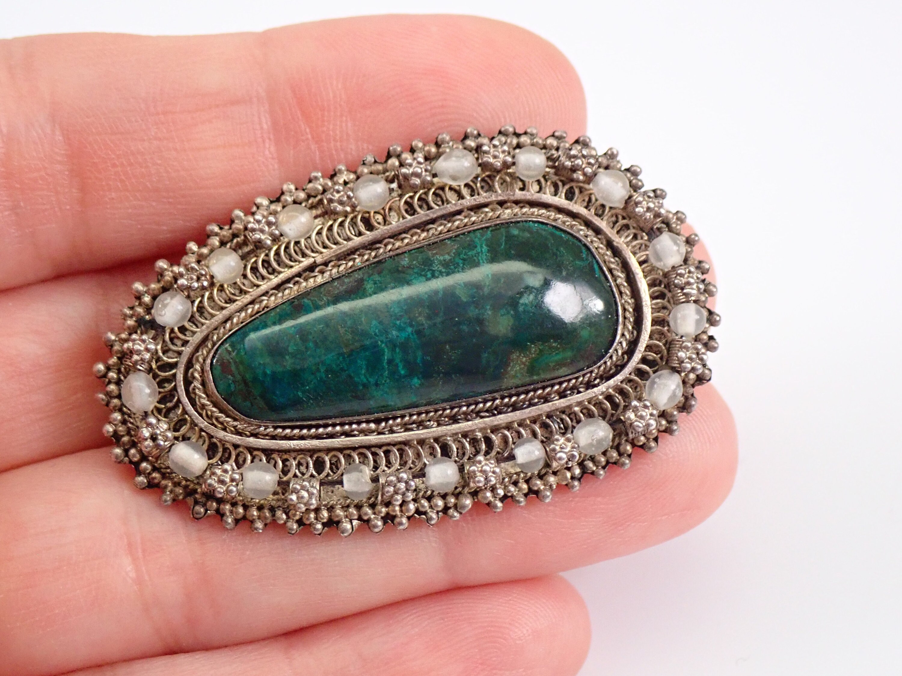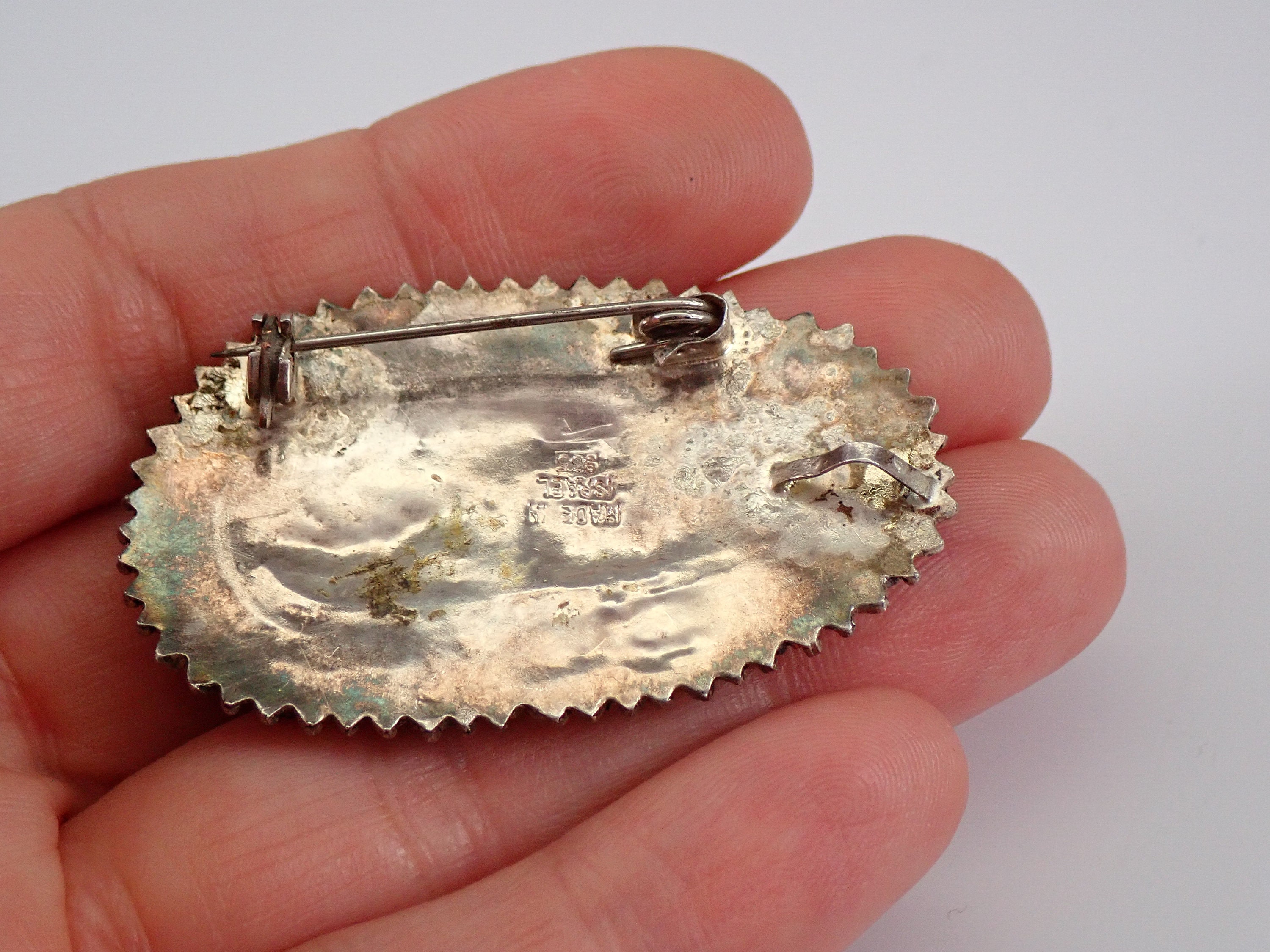 Genuine sterling silver unique artisan brooch set with a large Chrysocolla Gemstone. This brooch has a gorgeous design and decorative halo, it can also be worn on a chain as a pendant. This Pendant weighs 10.8 grams and measures 2 X 1 1/4 inches, and is stamped 935 (finer than Sterling) and Made in Israel. Will be shipped promptly in a gift pouch.