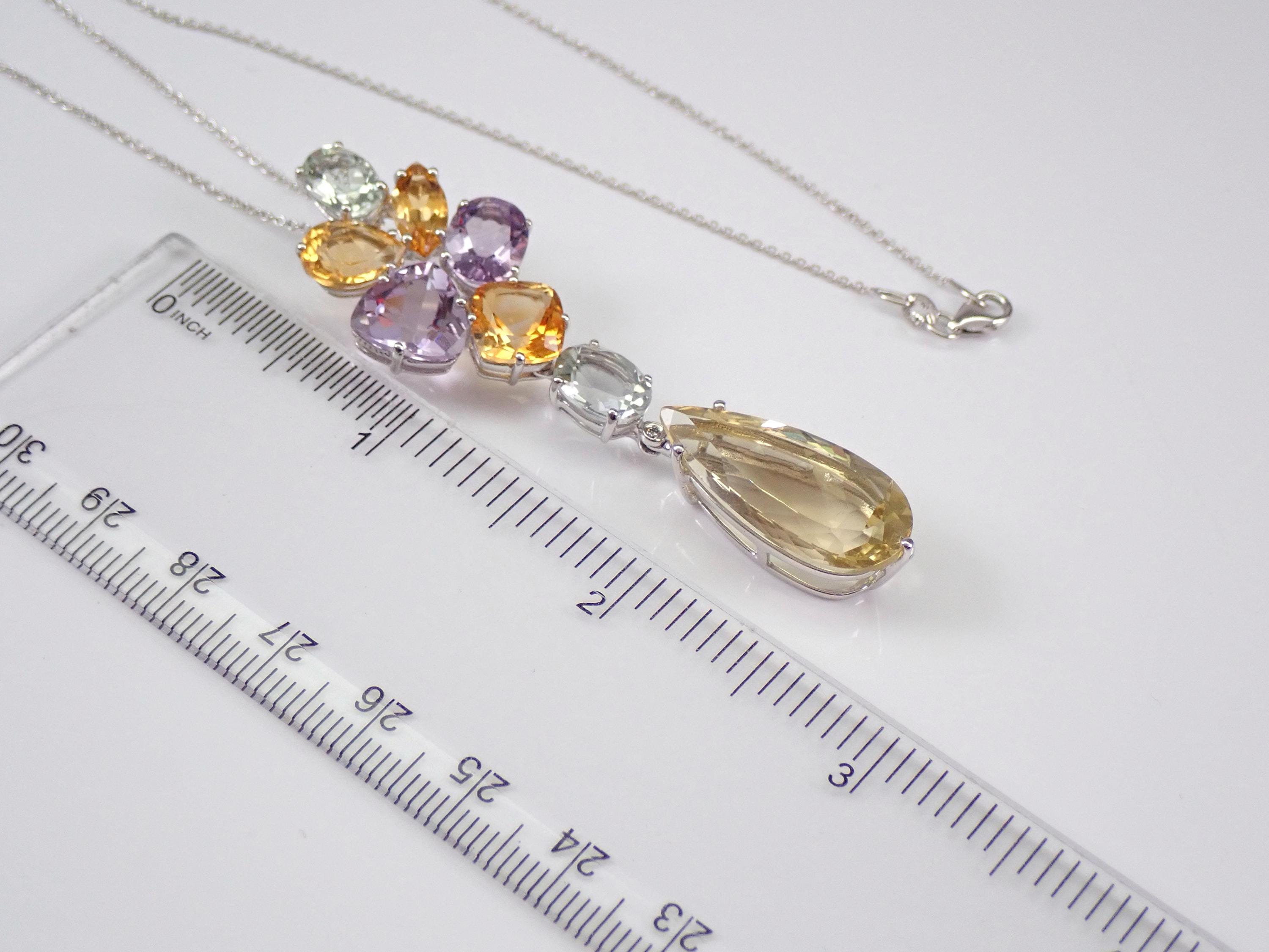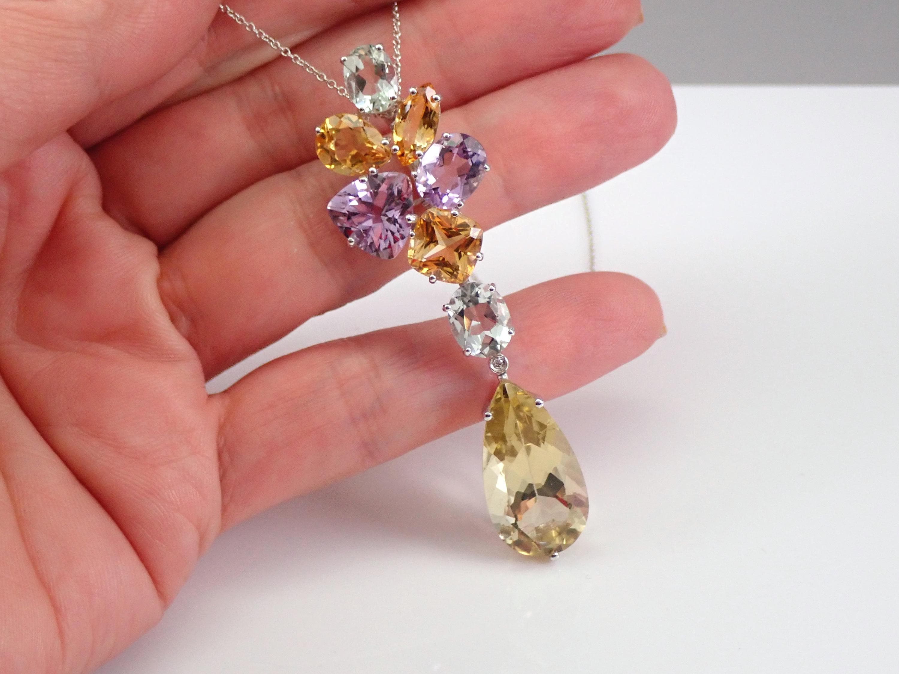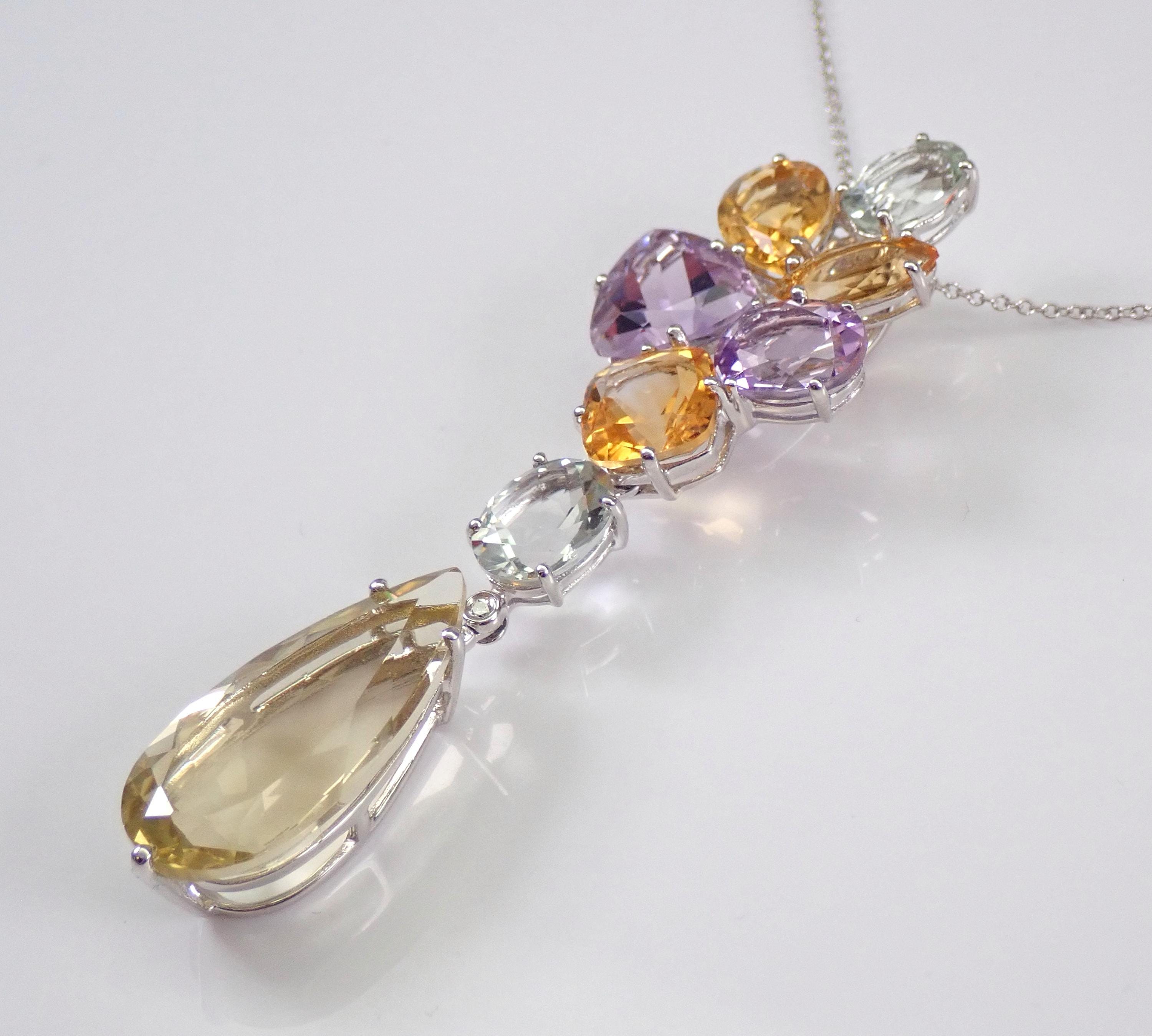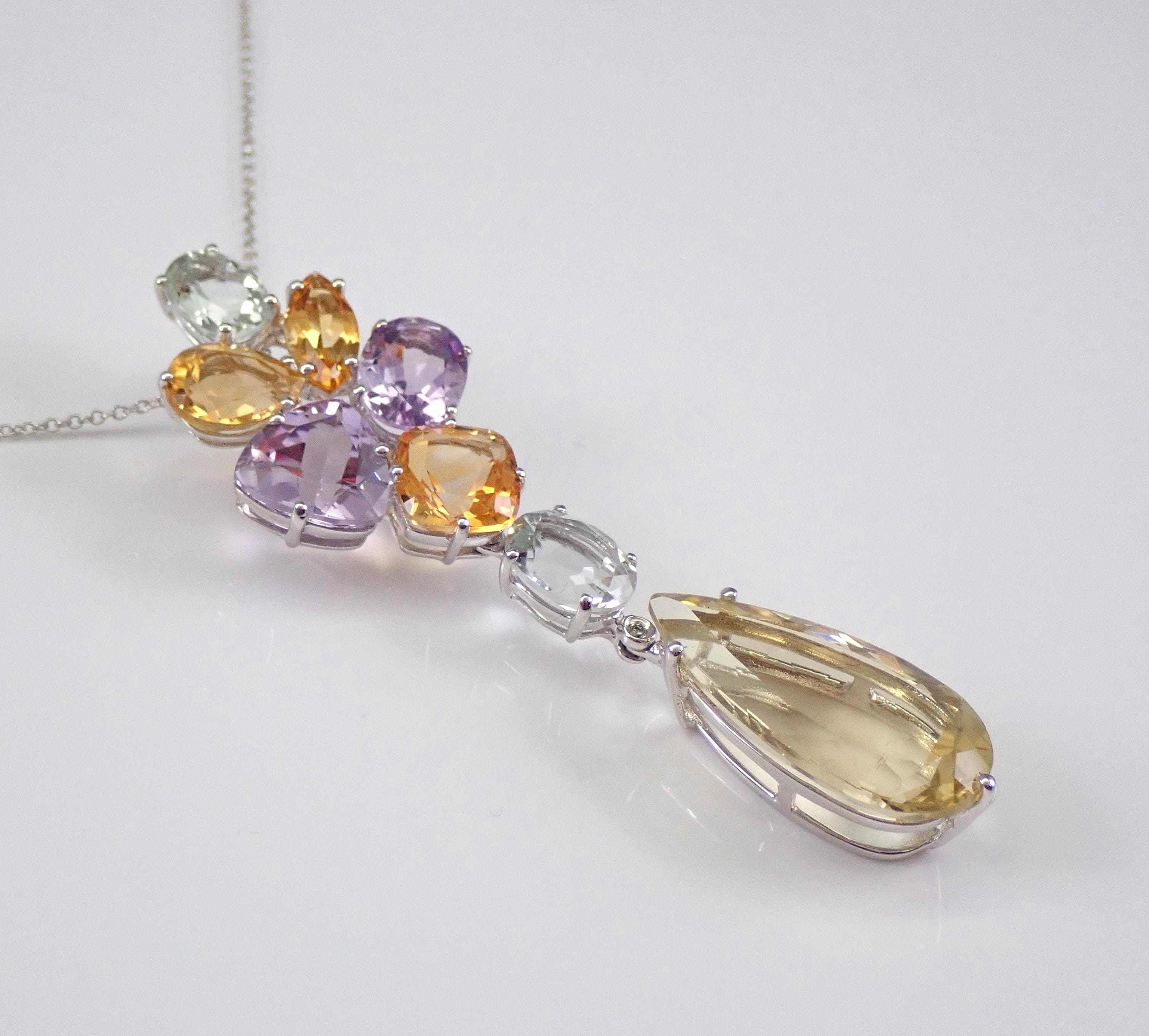 14K White Gold Yellow Topaz, Green Amethyst, Lavender Amethyst, Citrine and Diamond Necklace. All the gemstones in this pendant are 100% Genuine and amount to a total weight of 25 carats. There is one natural diamond bezel set in this pendant. The bottom pear shaped drop is a Yellow Topaz. This Topaz measure 24 X 12 mm. There are also two Oval Green Amethysts/Prasiolite, three genuine Citrine and two genuine Lavender color Amethysts set in this pendant. This necklace is 14KT White Gold and comes with an 18" 14K White Gold chain. This necklace weighs 10.9 grams and the pendant drop measures 2 1/2" in length. This necklace will be accompanied by an appraisal written by a GIA Certified Diamond Grader with the retail replacement value of $2,695.00. I will ship this necklace promptly in a gift box.