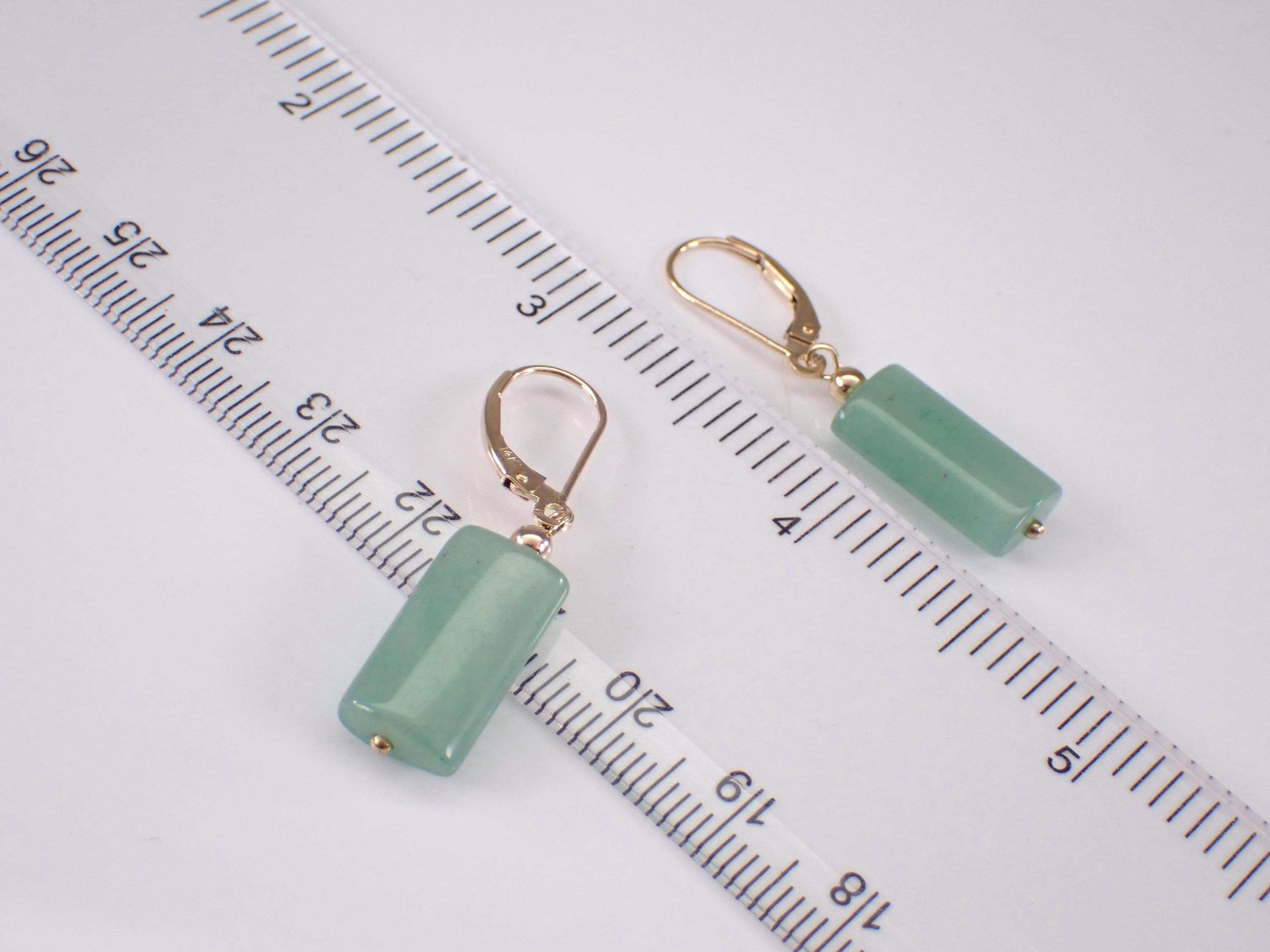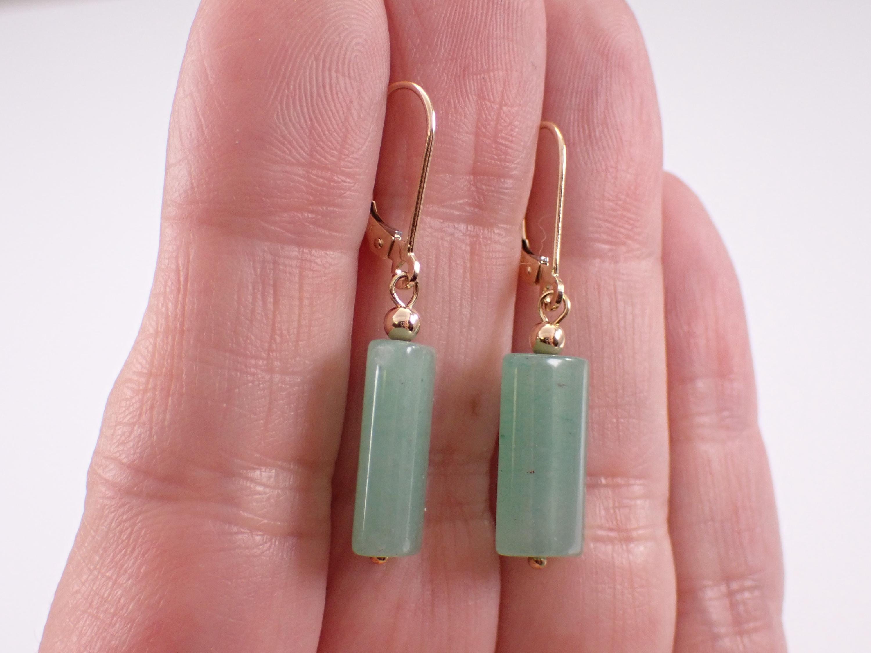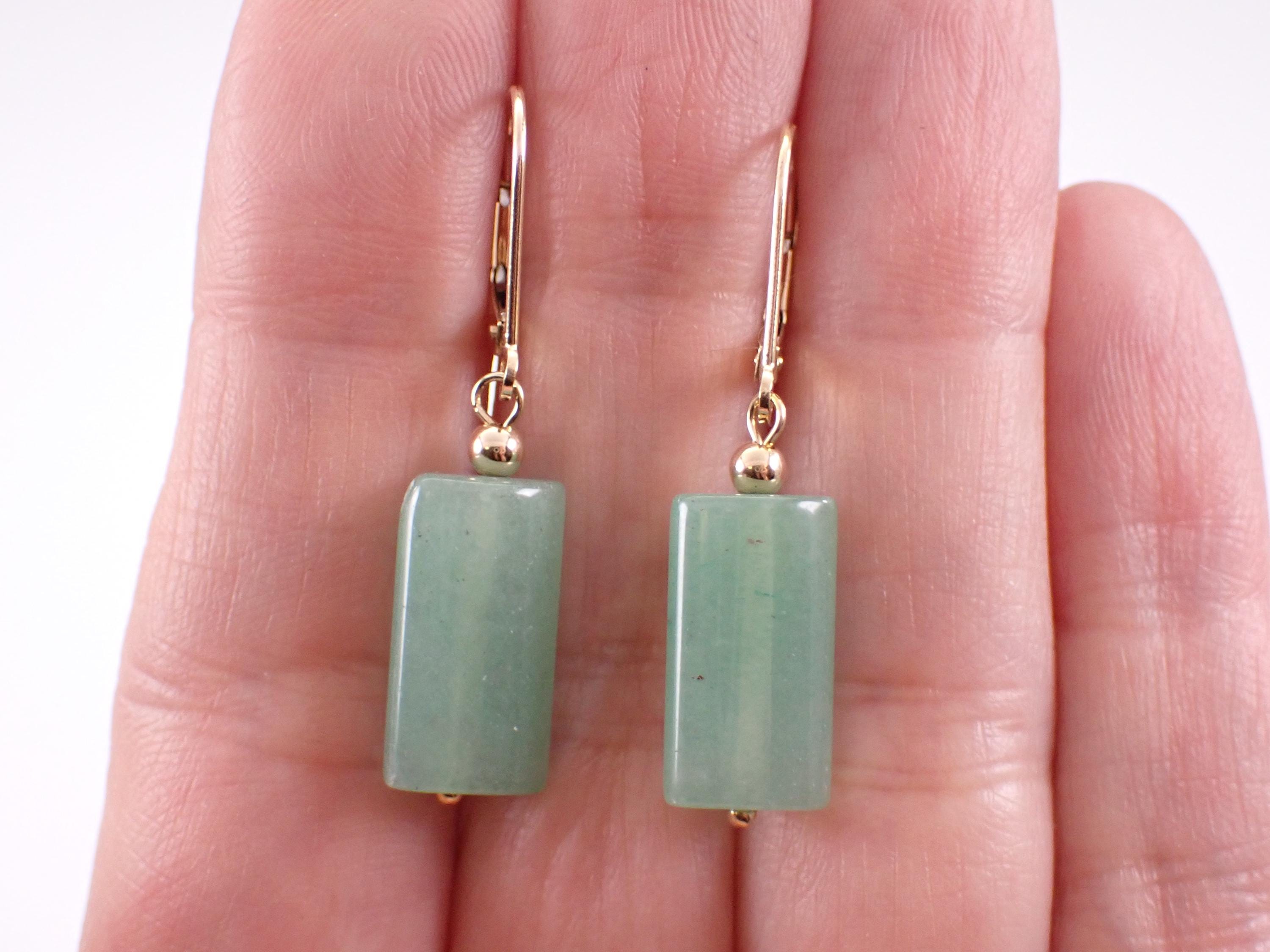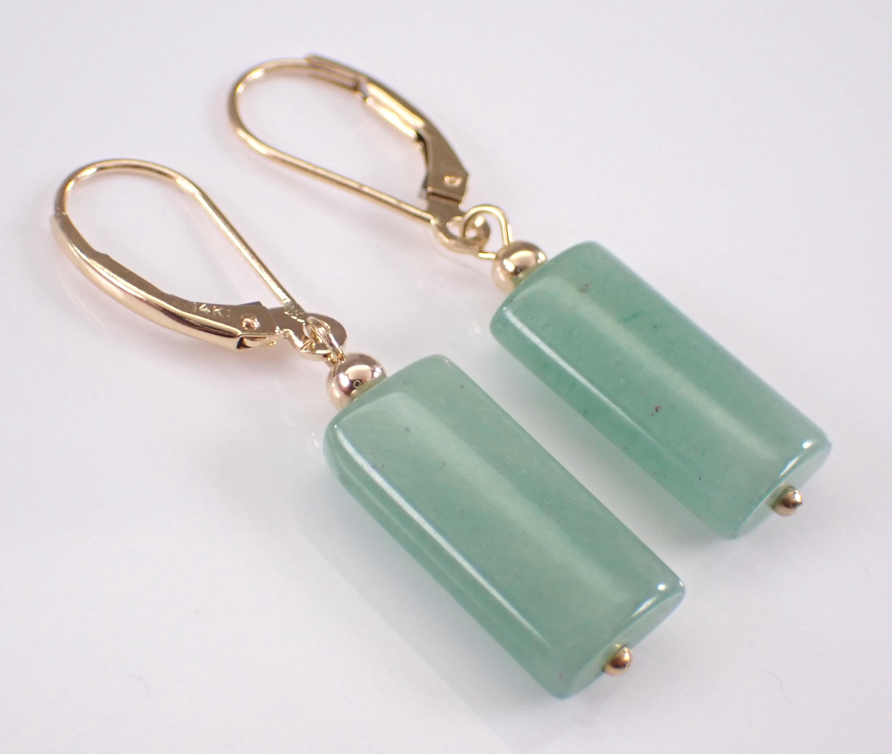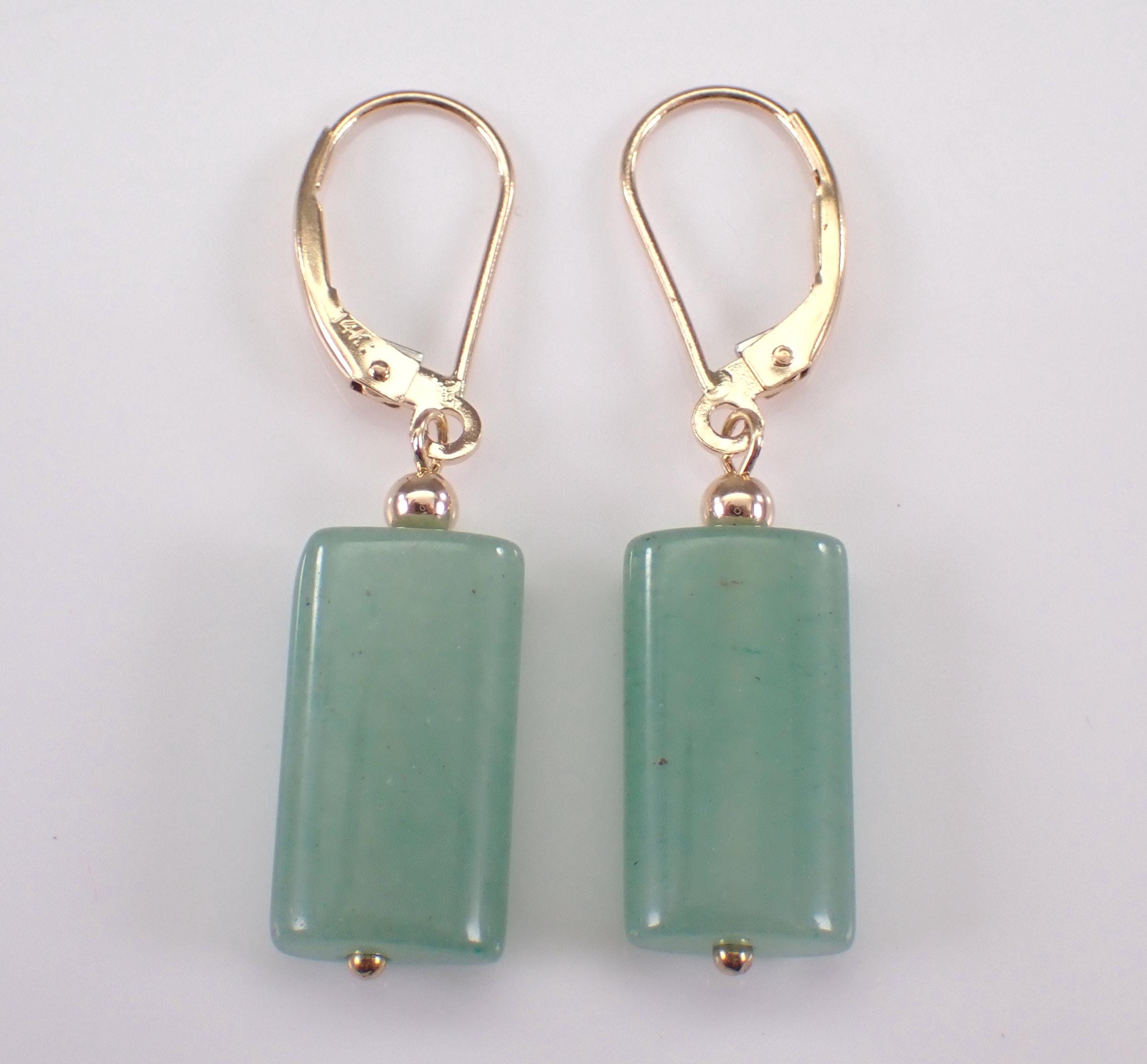 14K Yellow Gold Jade Dangle Earrings. There is one Jade set to dangle off each earring. These Jade measure 16 X 9 mm each. These earrings are 14KT Yellow Gold and weigh a total of 3.6 grams. These earrings are for pierced ears and have leverback clasps. I will ship these earrings promptly in a gift box.