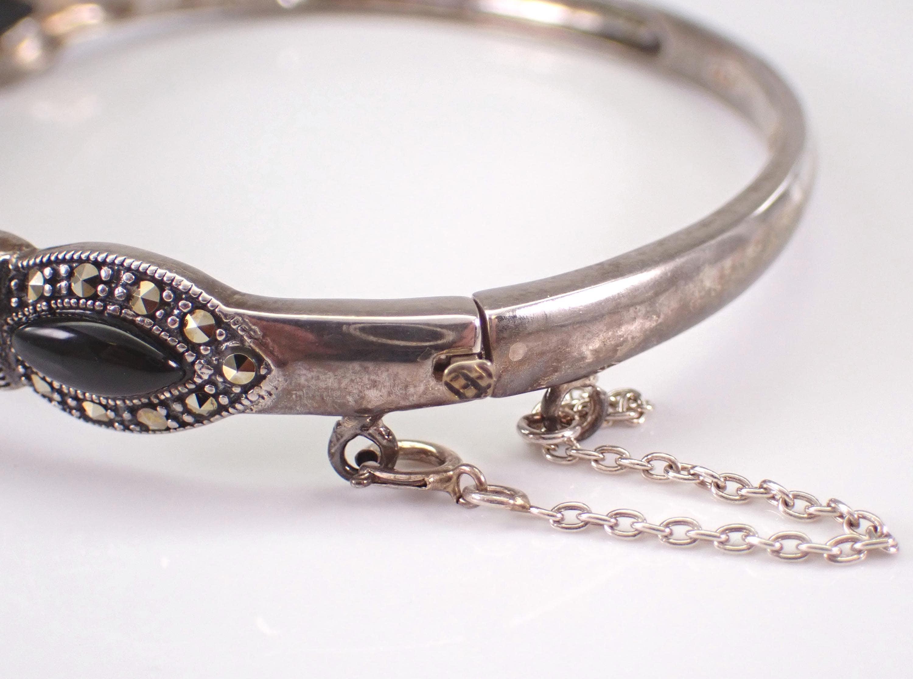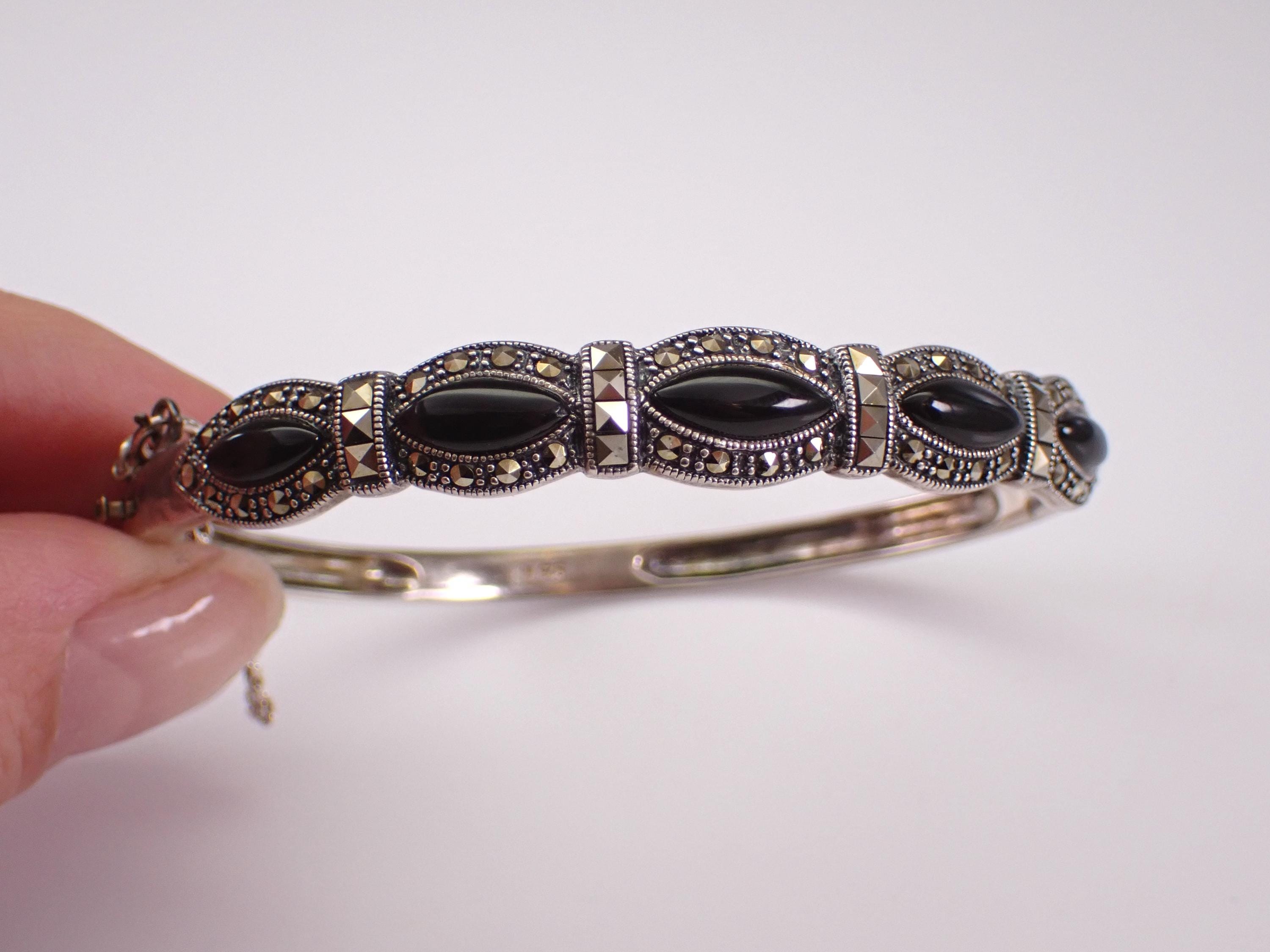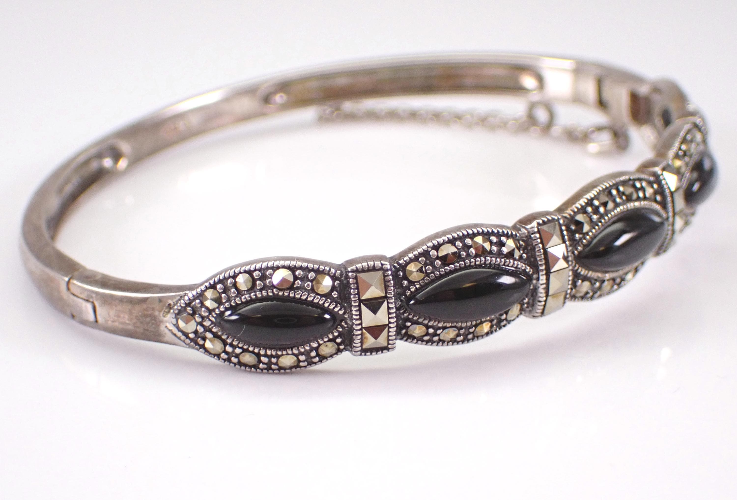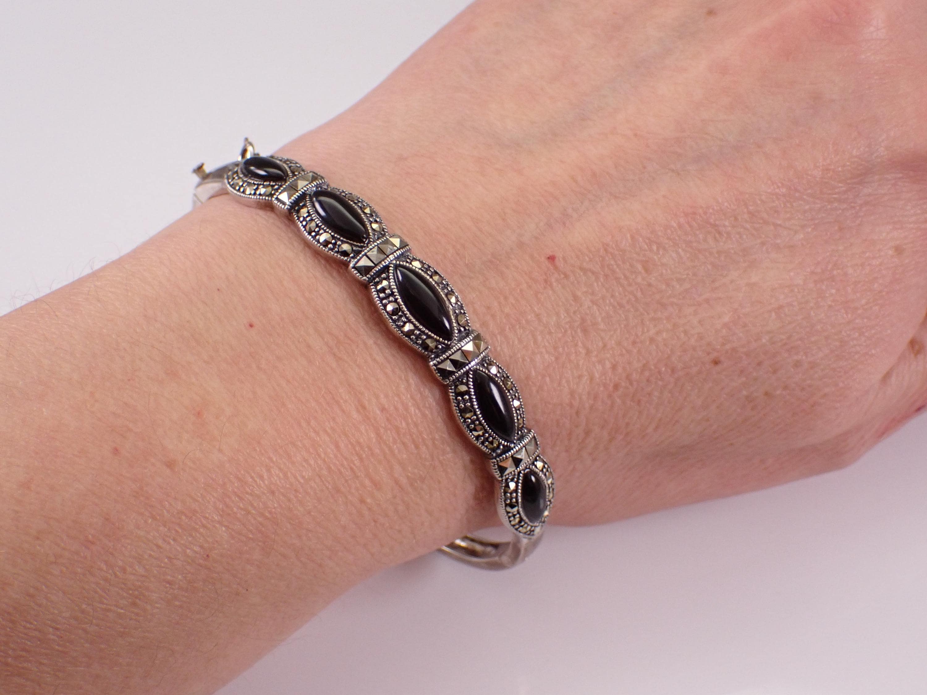 Vintage Unique Sterling Silver Bangle Bracelet Cuff. This bracelet is set with genuine Black Onyx and Marcasites. This bracelet weighs 18.1 grams and fits a standard ladies wrist (approximately 6.5-7"). This bracelet measures 10 mm in width. This bracelet will be shipped promptly in a gift pouch. Makes an awesome gift for any age, graduation, birthday or any special event.