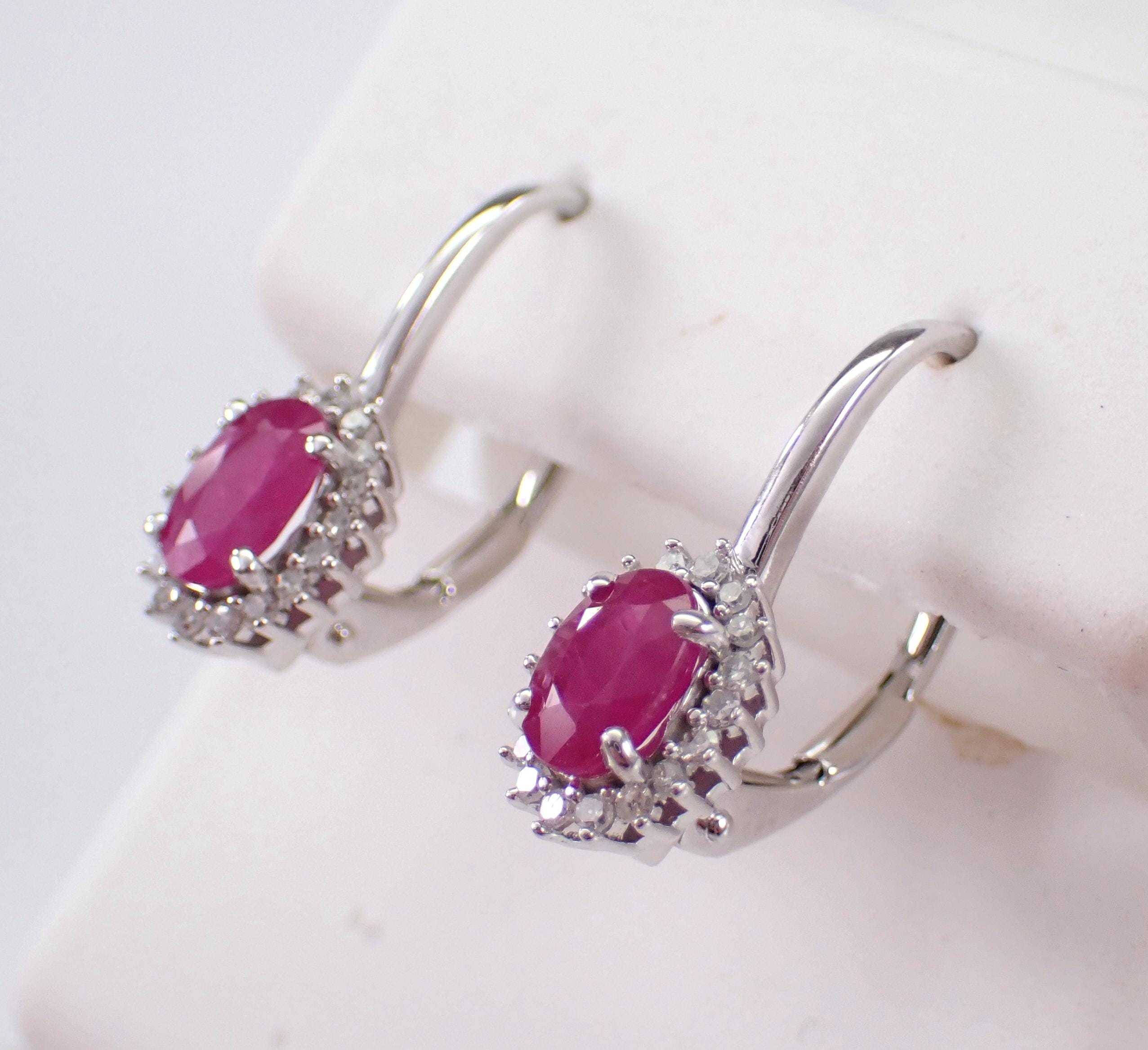 14K White Gold Diamond and Ruby Halo Stud Earrings. These earrings are set with a genuine Oval Ruby in each earring. These Rubies measure 6 X 4 mm each and weigh a total of 1 1/2 carats. There are twenty-two natural Round Brilliant Diamonds set in EACH earring. These Diamonds are H color, SI/I clarity and amount to a total weight of .15 carat. These earrings are 14K White Gold, weigh 1.8 grams and measure 9 X 7 mm each. These earrings are for pierced ears and have screw back post closures. These earrings will be accompanied by an appraisal written by a GIA Certified Diamond Grader with the retail replacement value of $1,375.00. I will ship these earrings promptly in a gift box.