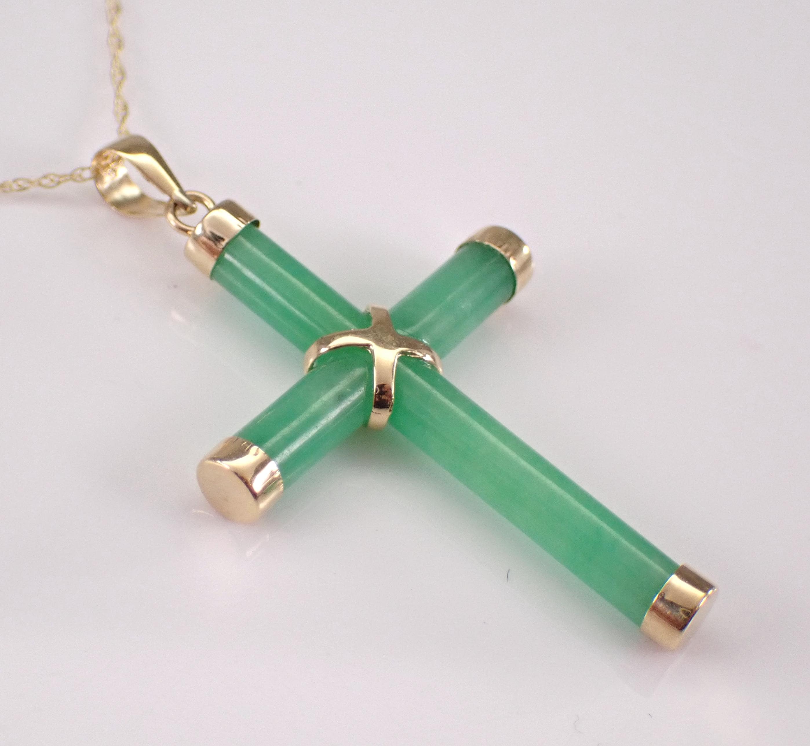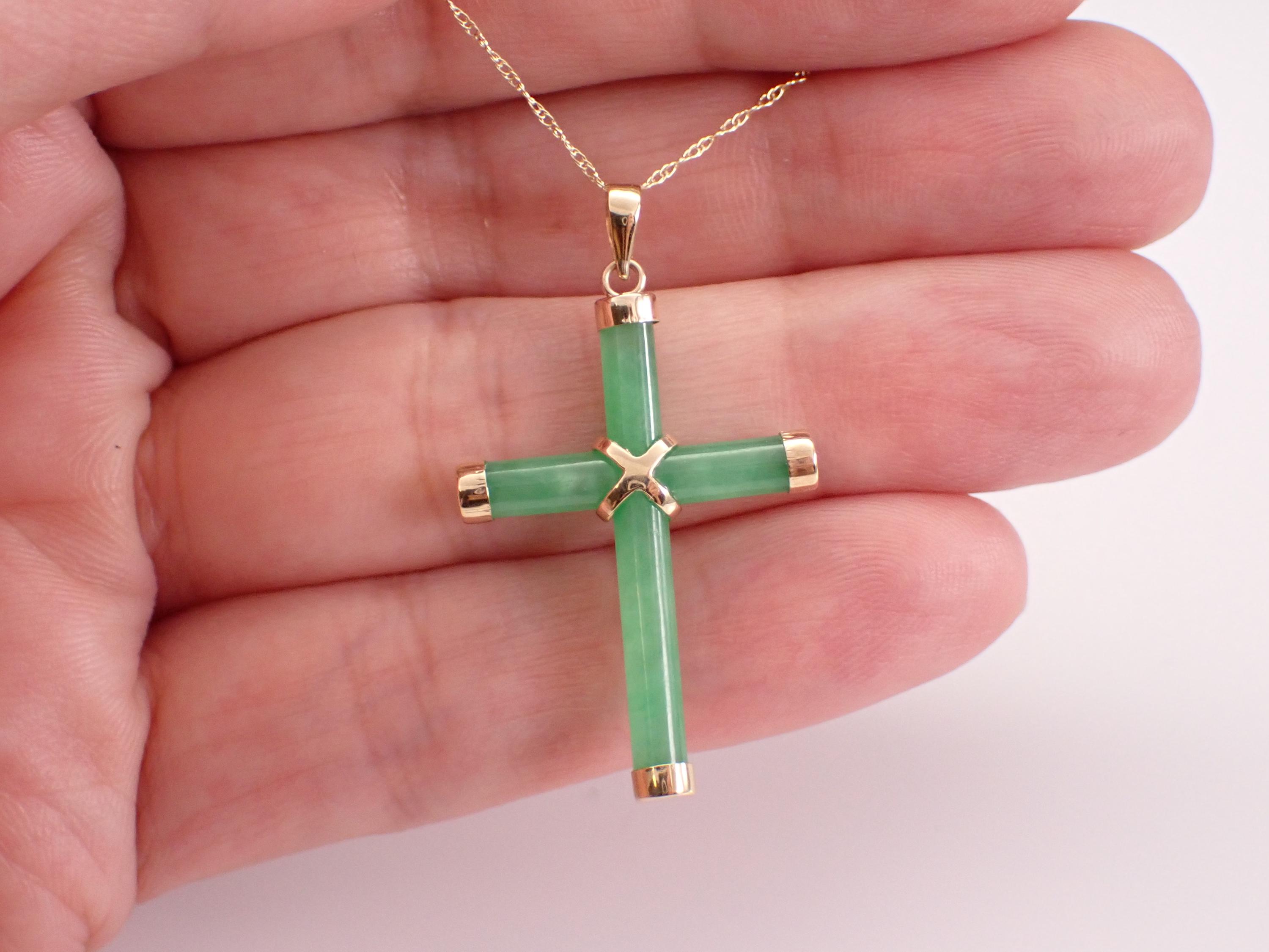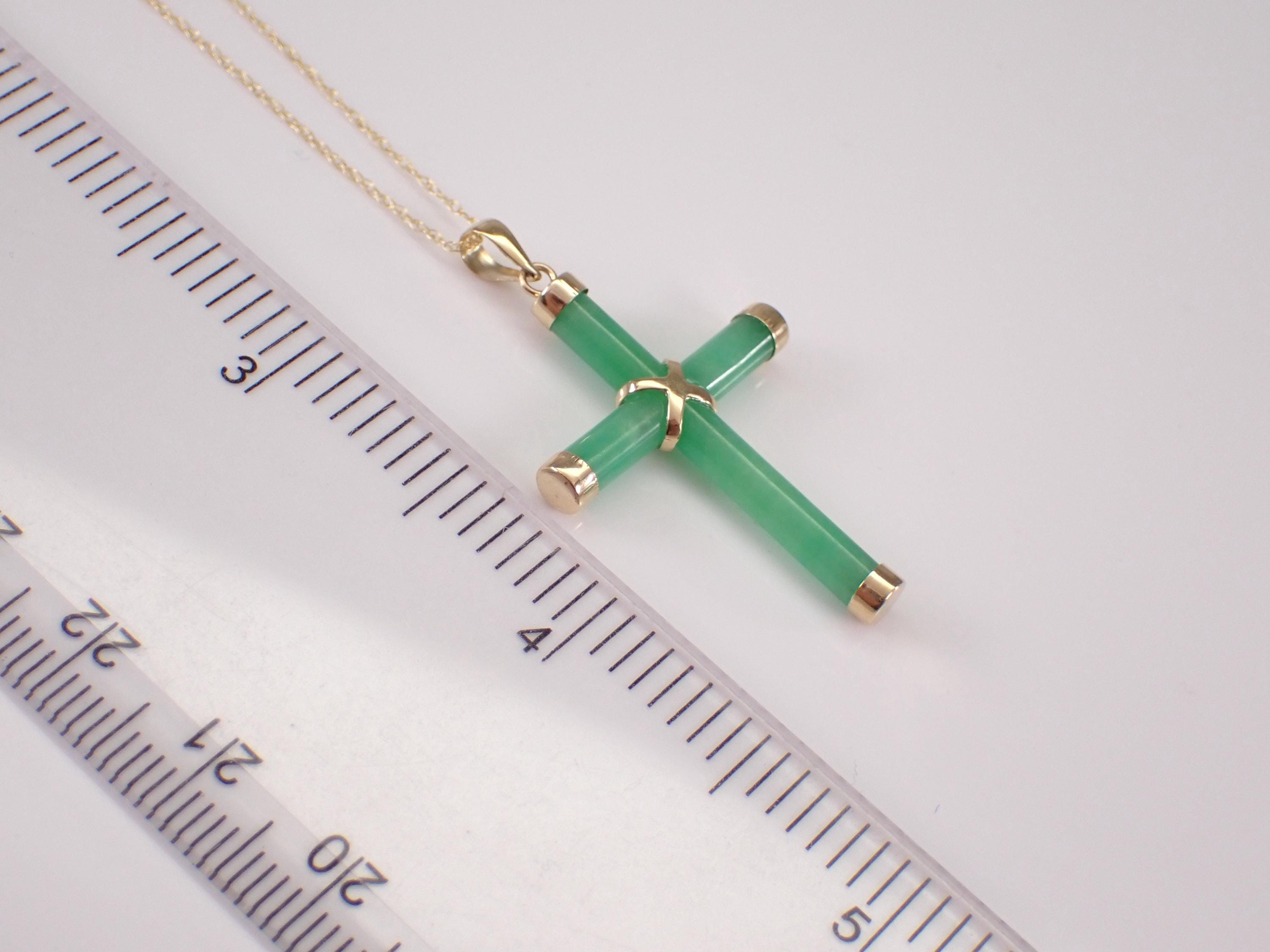14K Yellow Gold Jade Cross Pendant Charm Necklace. This cross is set with genuine Green Jade. This pendant is 14KT Yellow Gold, comes with an 18" 14K Yellow Gold chain and together with the chain weighs 2.1 grams. This cross measures 30 X 21 mm without the bail. I will ship this pendant promptly in a beautiful gift box.