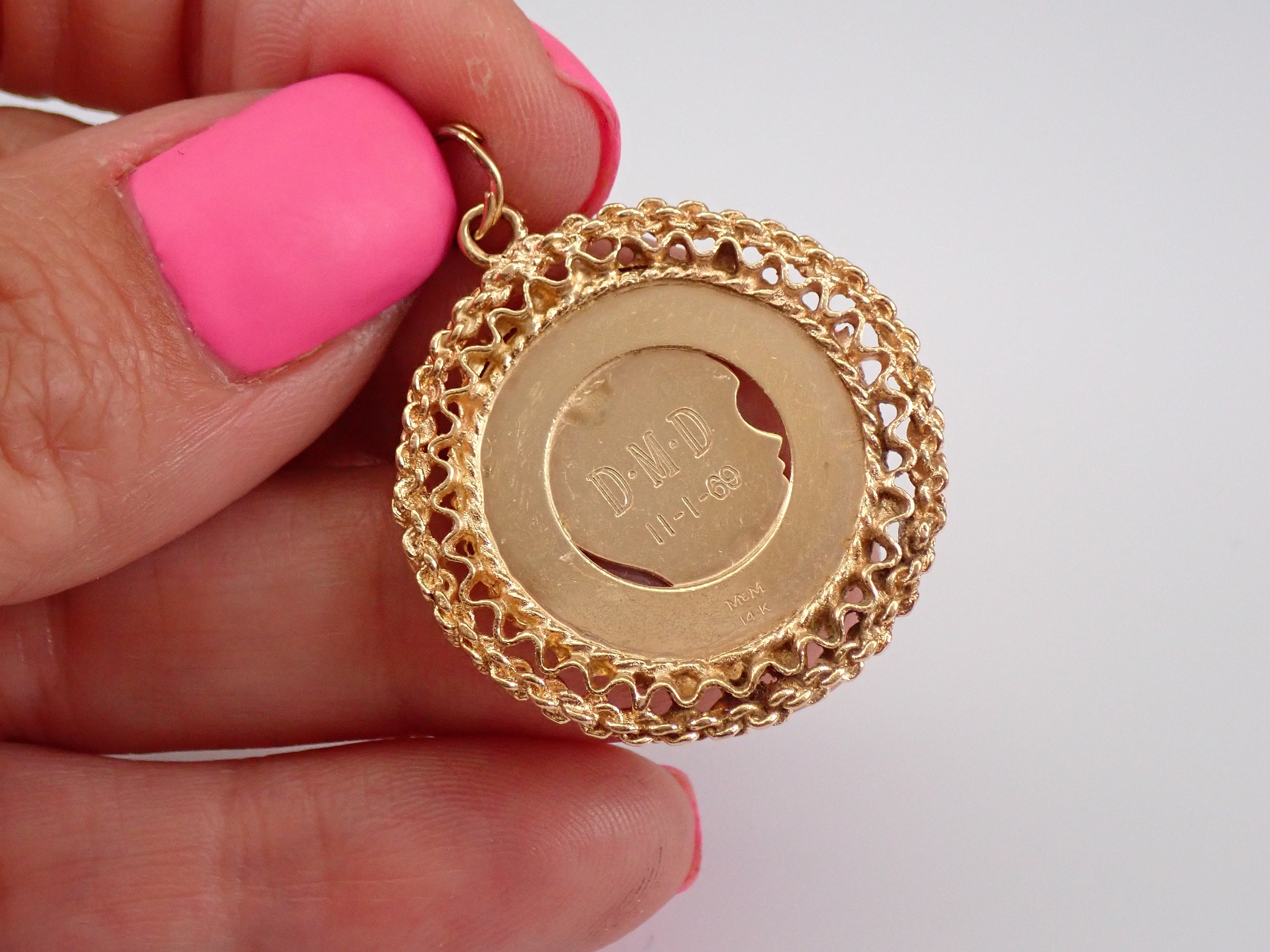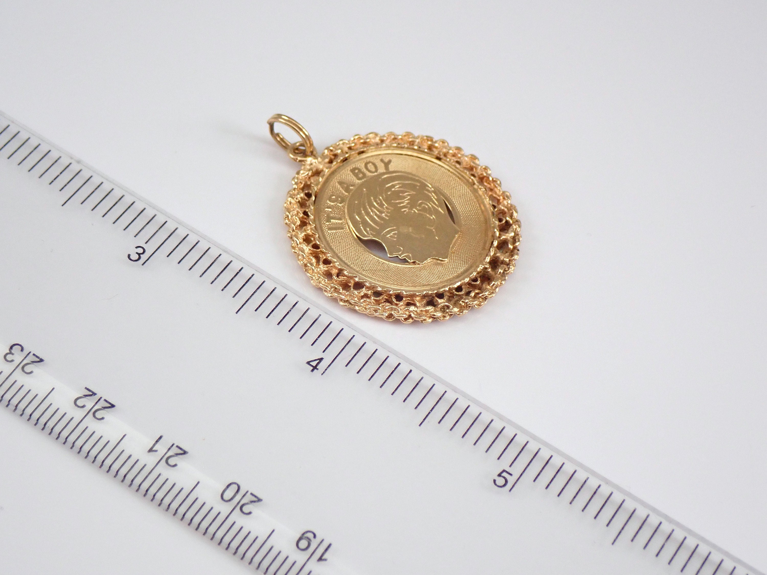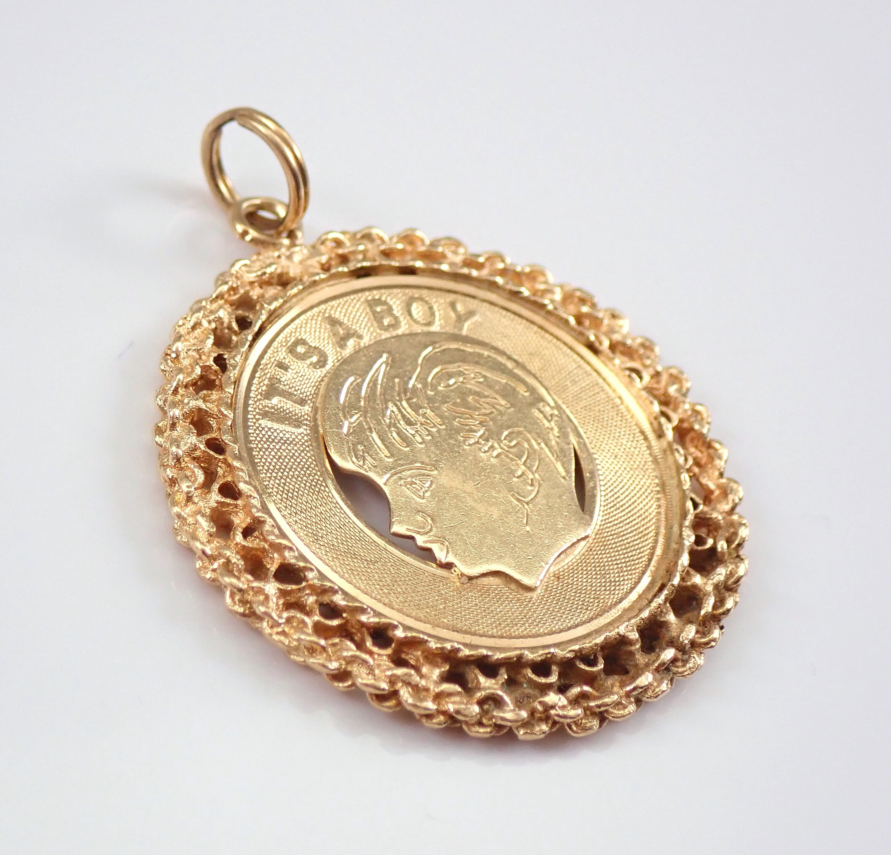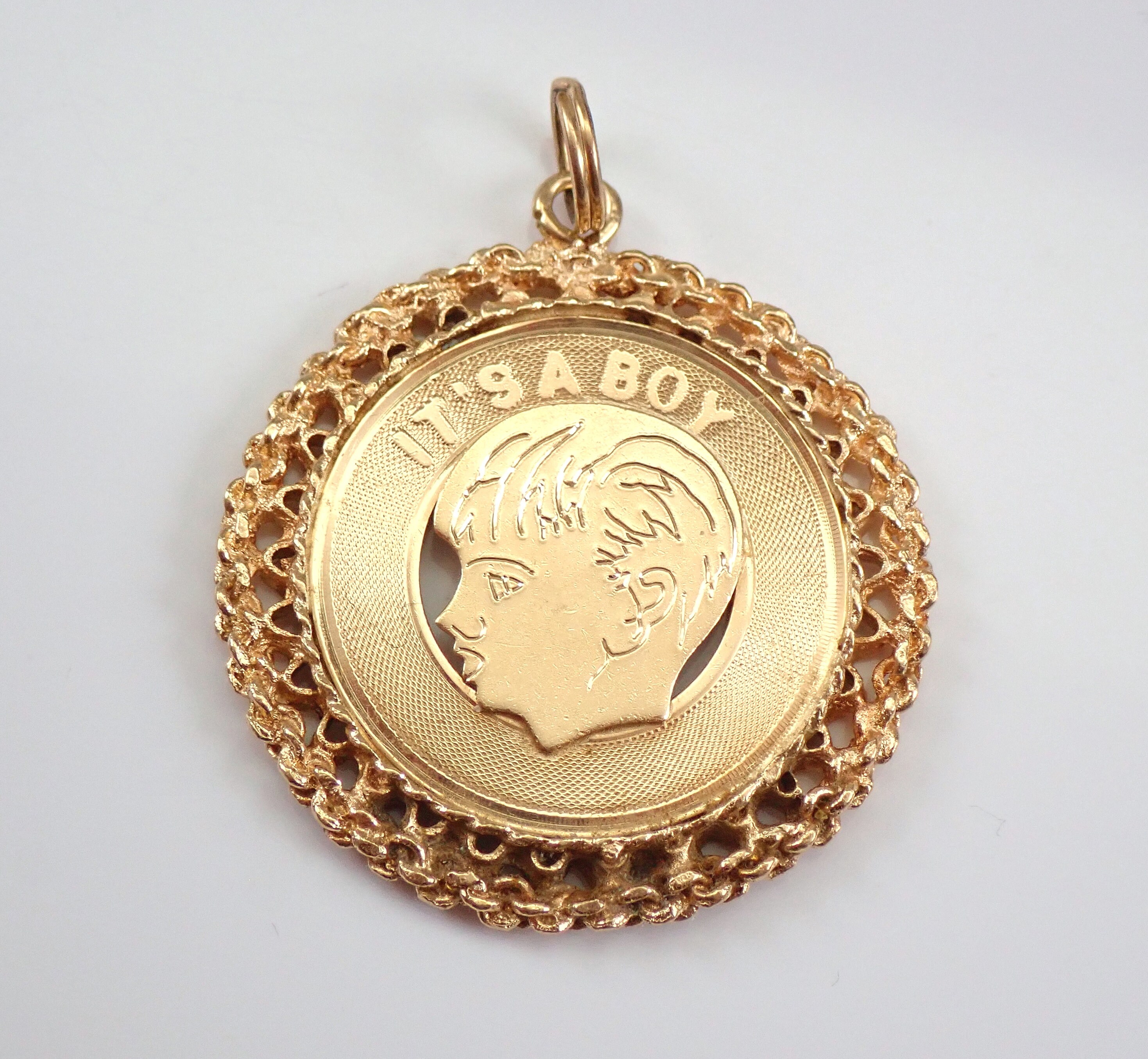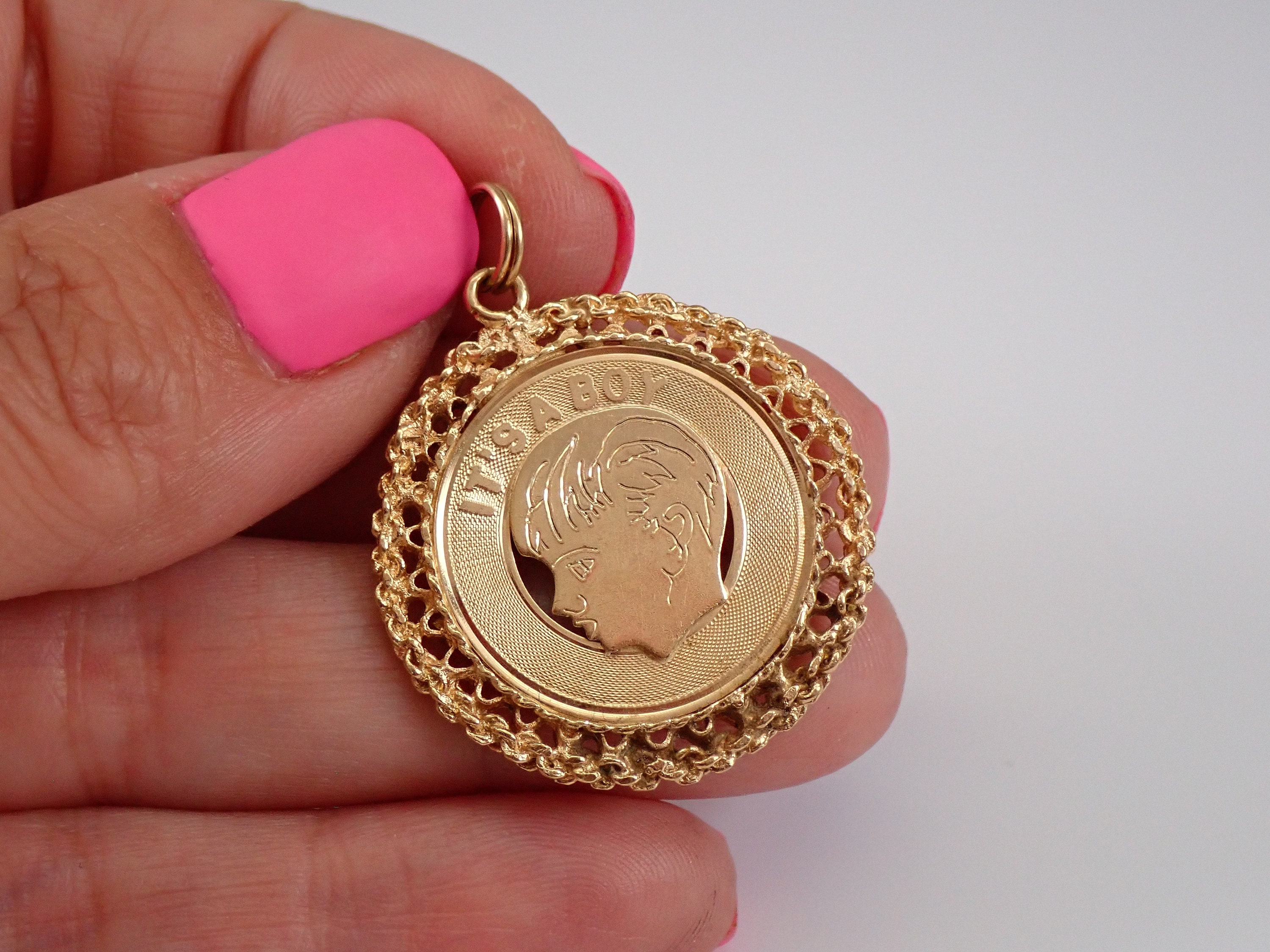 Vintage 14K Yellow Gold "Its A Boy" Charm Pendant. This charm is Solid 14K Yellow gold, measures 29 mm in diameter (1.25") and weighs 5.6 grams. This charm is engraved in the back with initials D-M-D and date 11-1-69. I will ship this pendant promptly in a gift pouch.