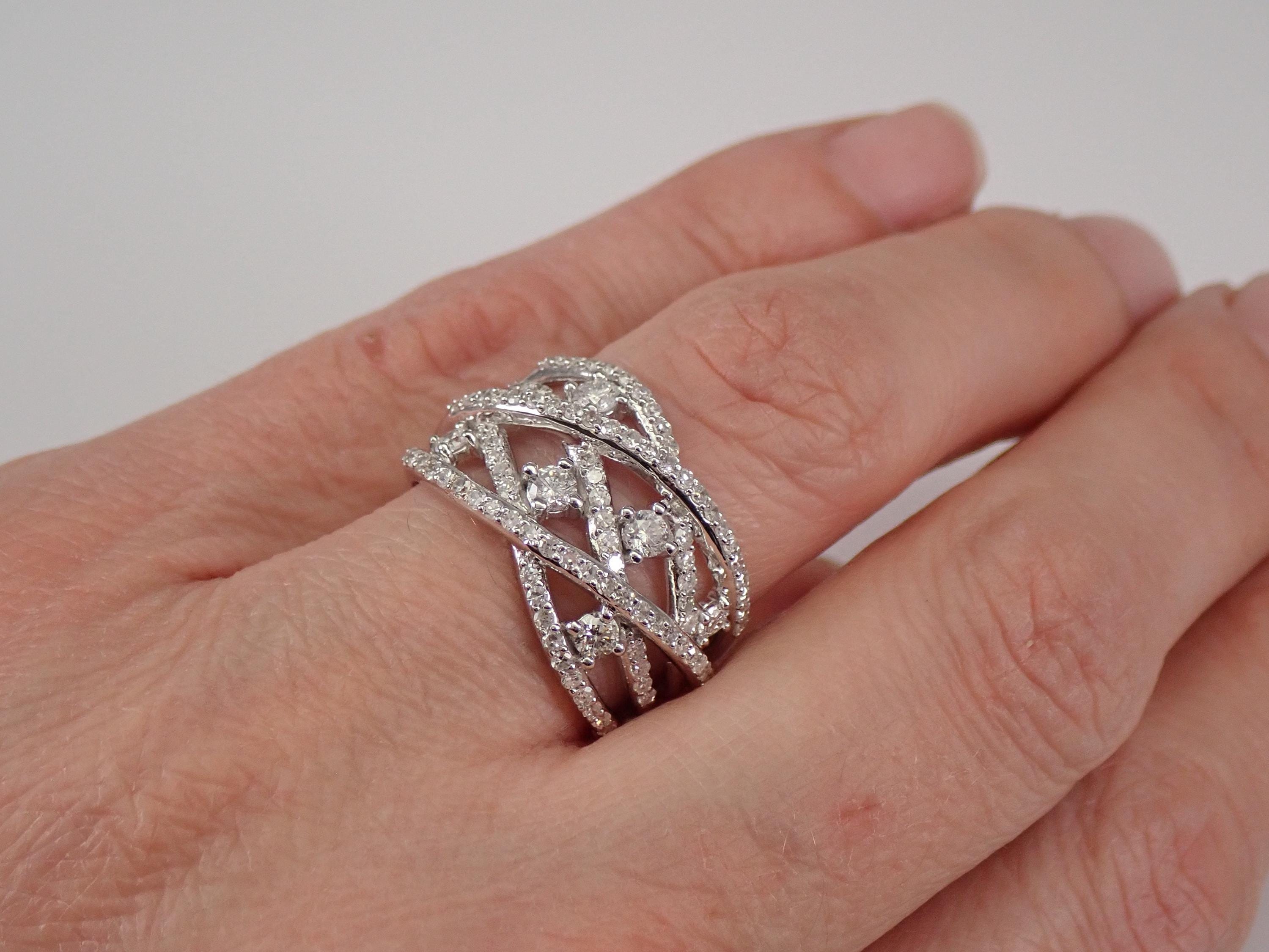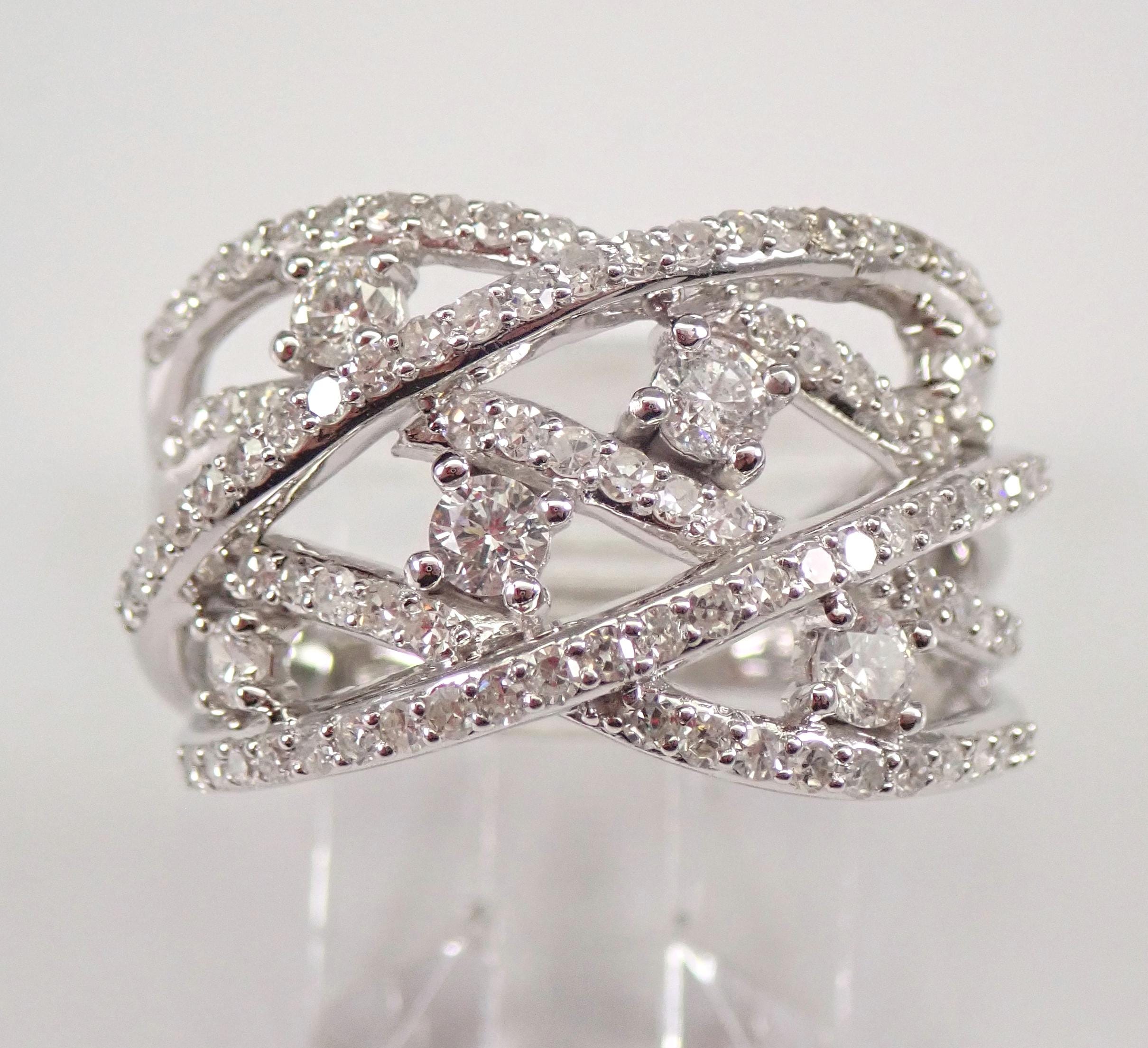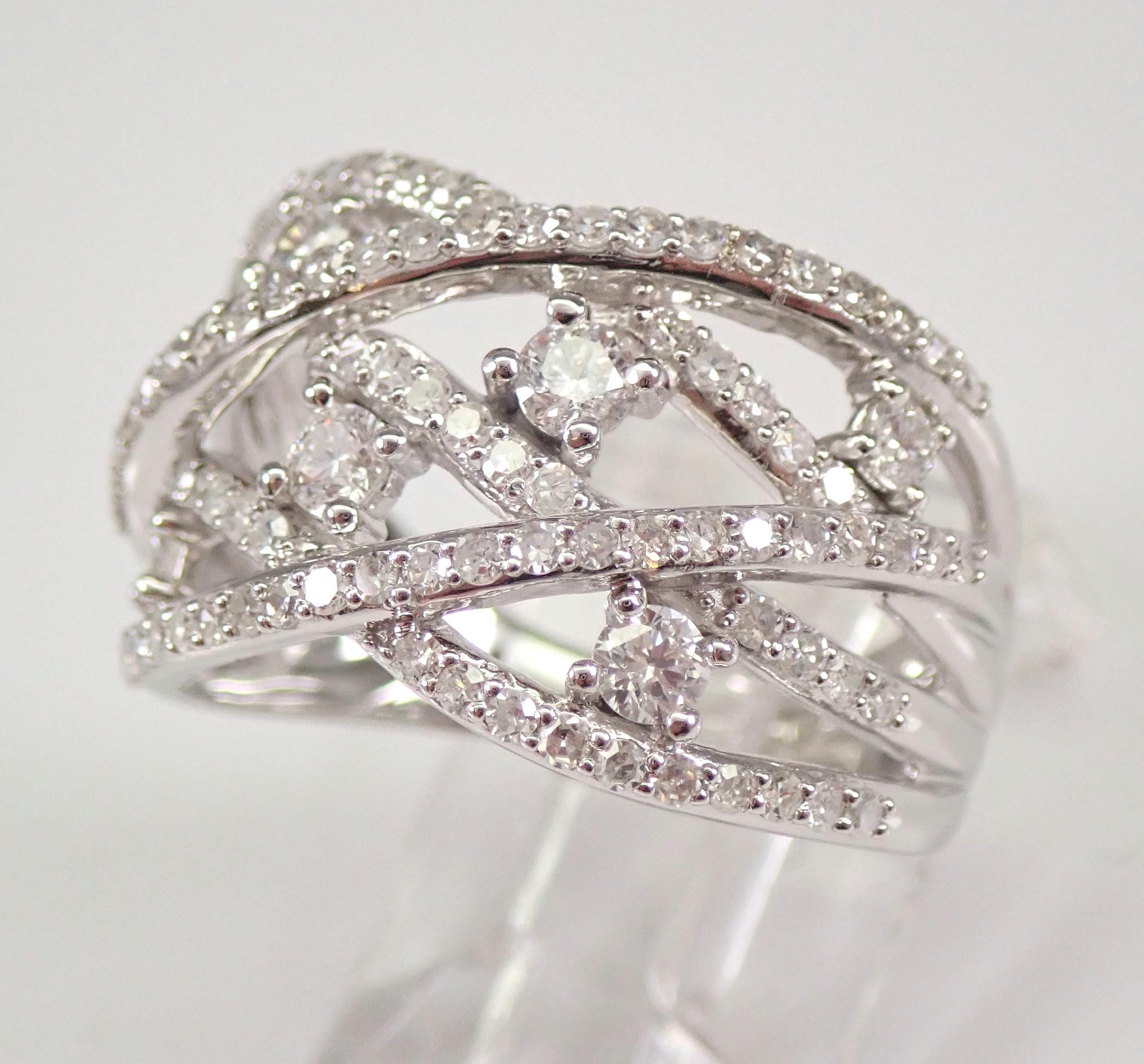 14K White Gold Diamond Crossover Wedding Ring Multi Row Anniversary Band. This ring is set with ninety-seven (97) genuine Round Brilliant Diamonds. These diamonds are H color, SI clarity and weigh a total of 1.00 carat. This ring is 14KT White Gold, weighs 5.3 grams, measures 13 mm in width at its widest point and is a finger size 7, which can be resized (please inquire about sizing with the finger size you need). This ring will be accompanied by an appraisal by a GIA Certified Diamond Grader with the retail replacement value of $3,895.00. I will ship this ring promptly in a gift box.