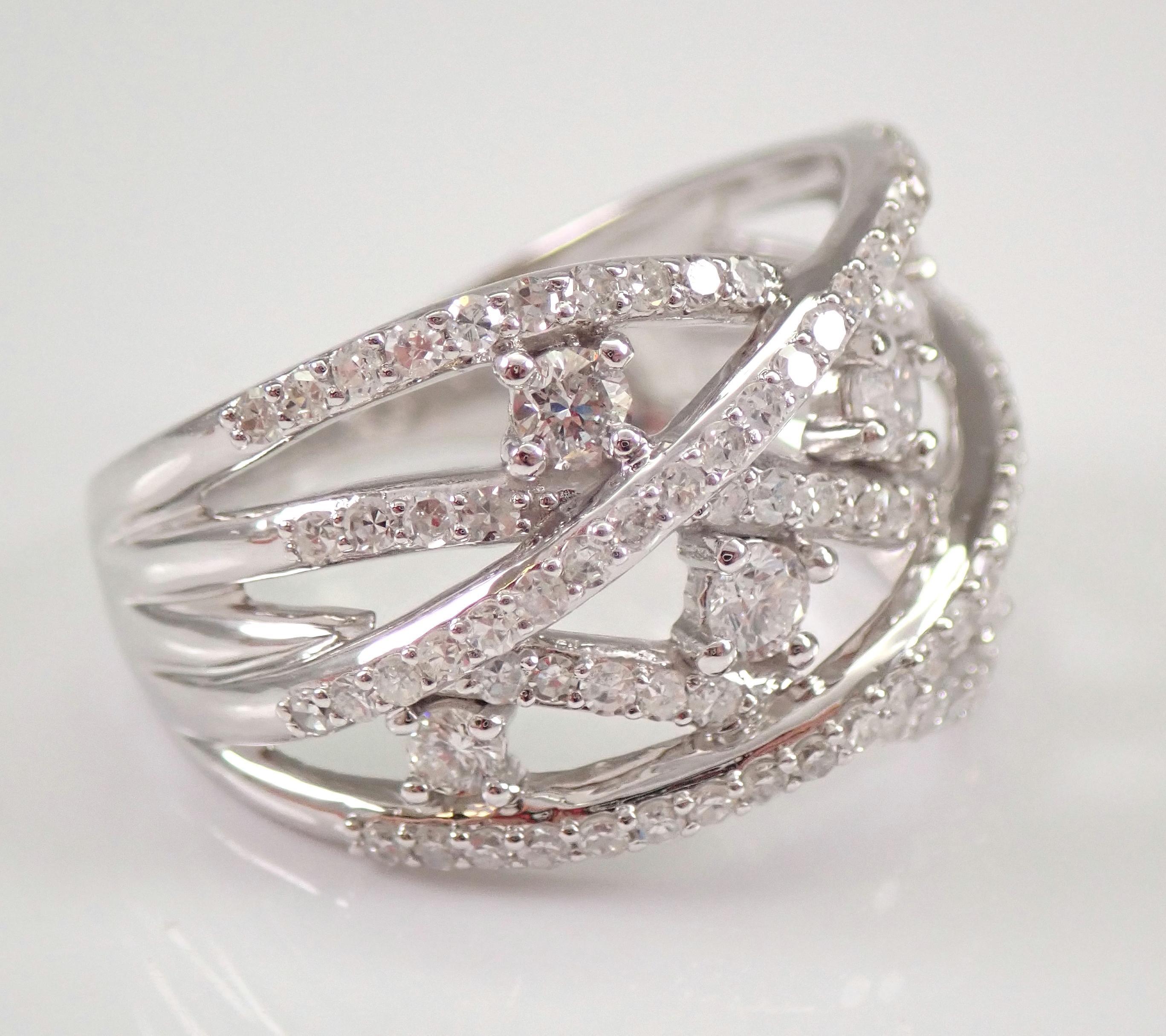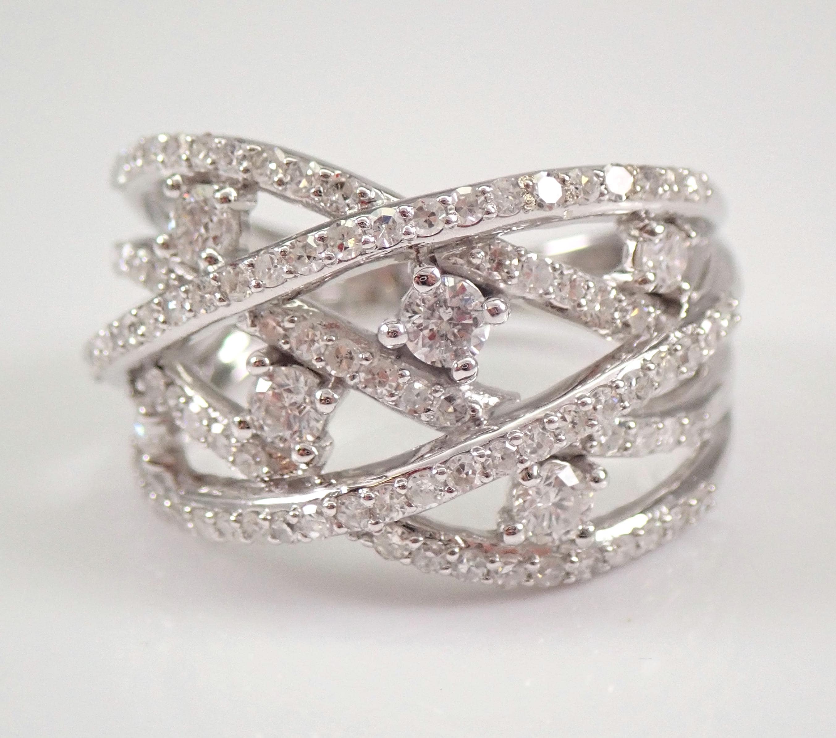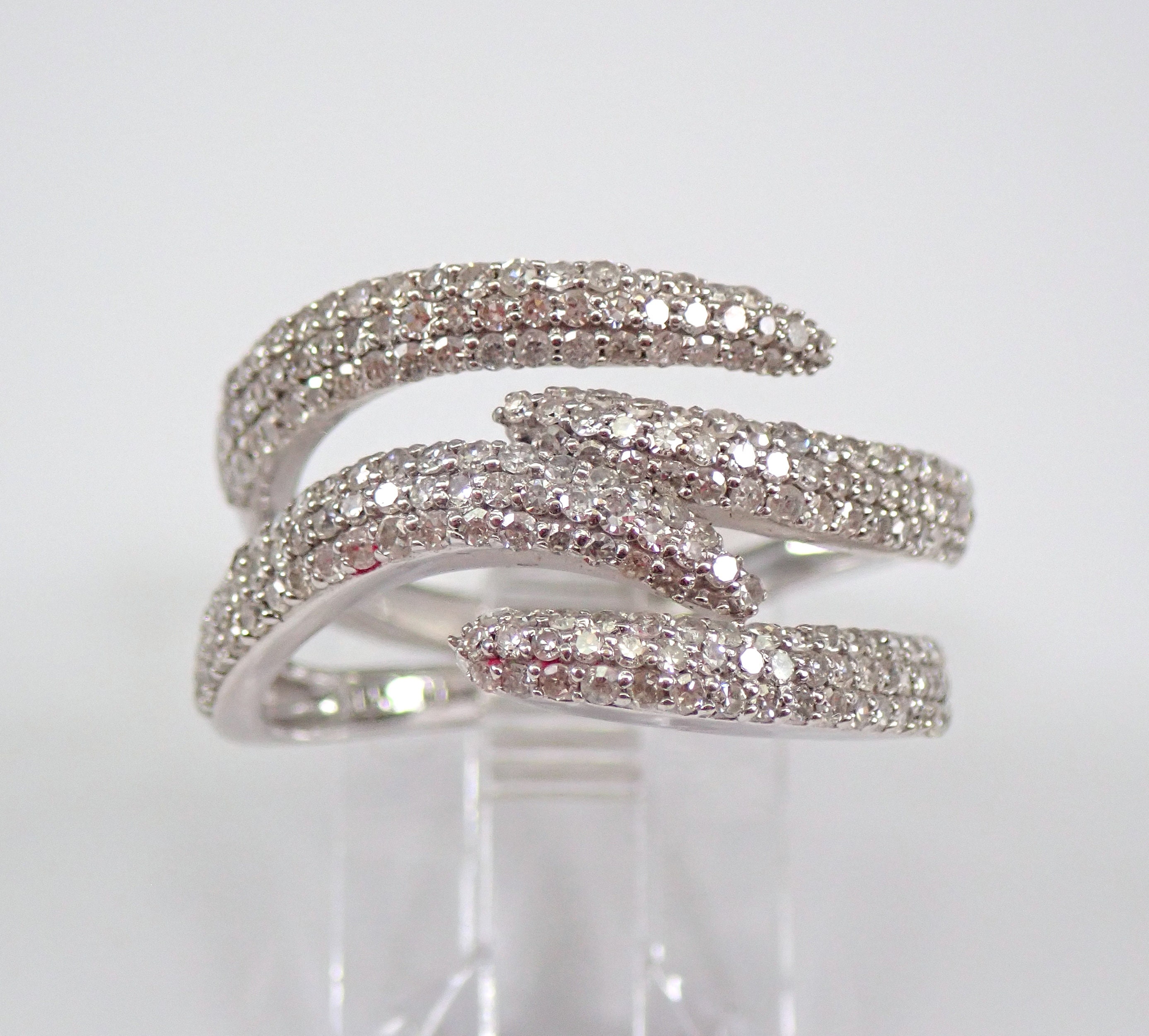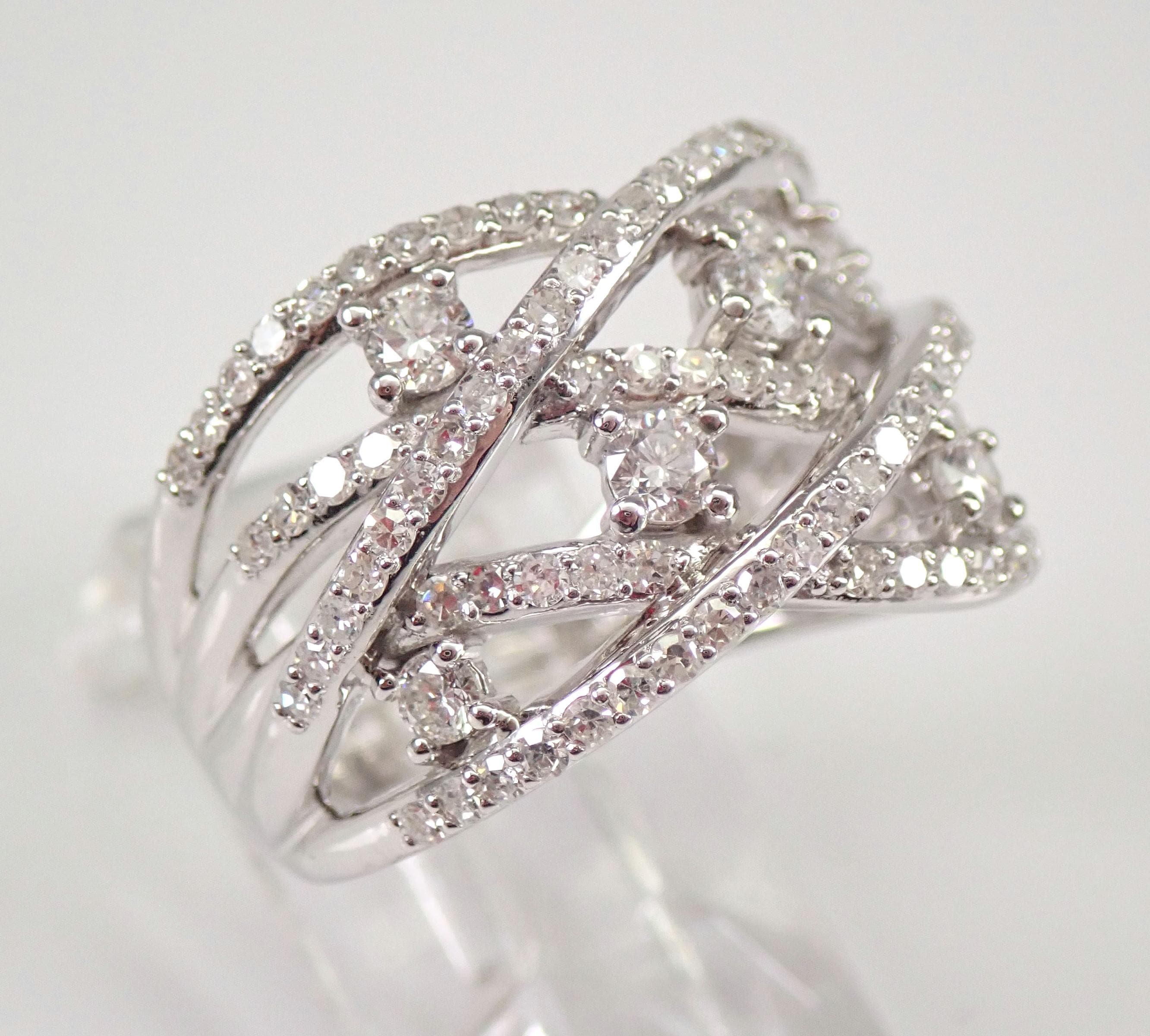 14K White Gold Diamond Crossover Wedding Ring Multi Row Anniversary Band. This ring is set with ninety-seven (97) genuine Round Brilliant Diamonds. These diamonds are H color, SI clarity and weigh a total of 1.00 carat. This ring is 14KT White Gold, weighs 5.3 grams, measures 13 mm in width at its widest point and is a finger size 7, which can be resized (please inquire about sizing with the finger size you need). This ring will be accompanied by an appraisal by a GIA Certified Diamond Grader with the retail replacement value of $3,895.00. I will ship this ring promptly in a gift box.