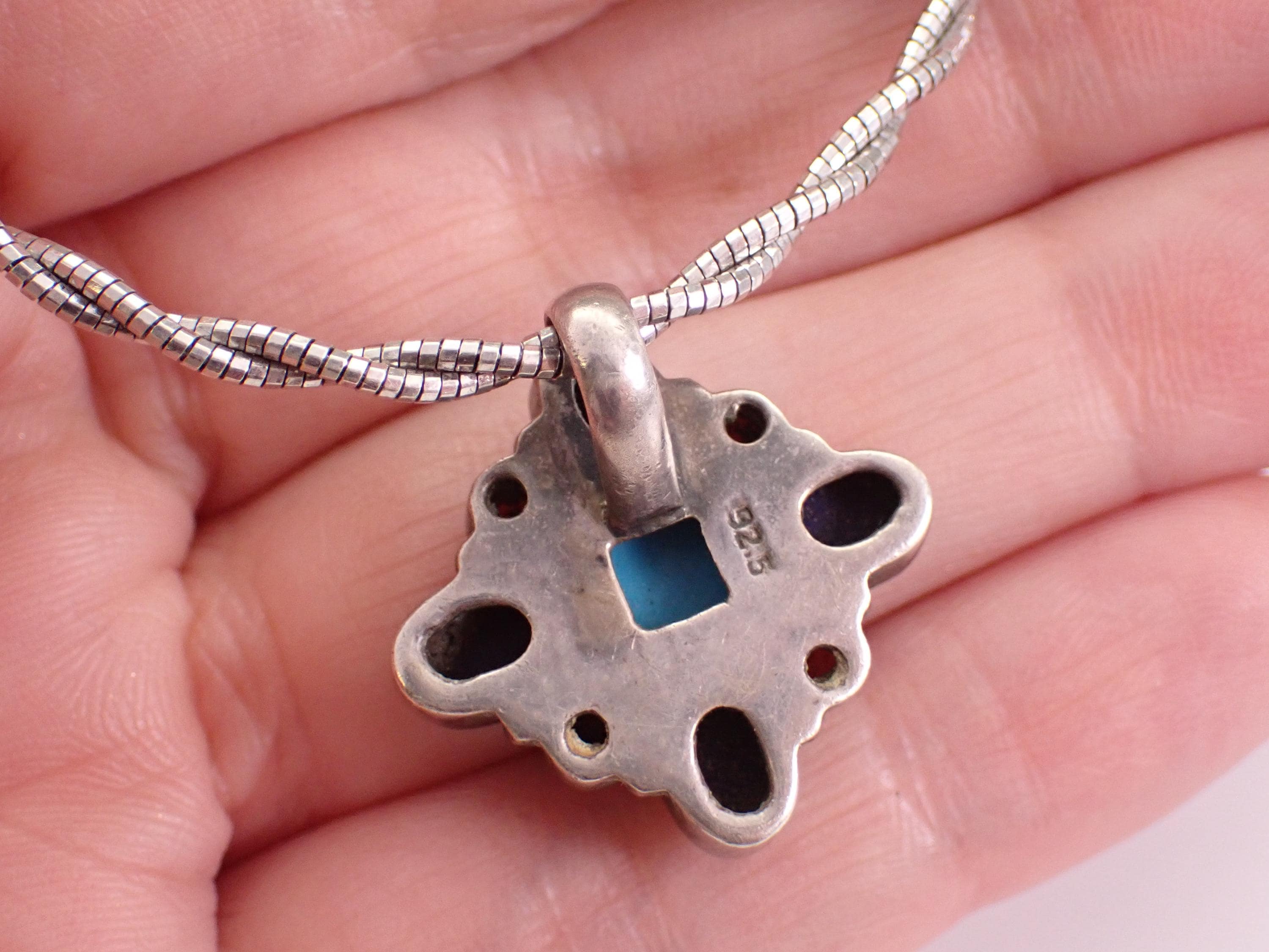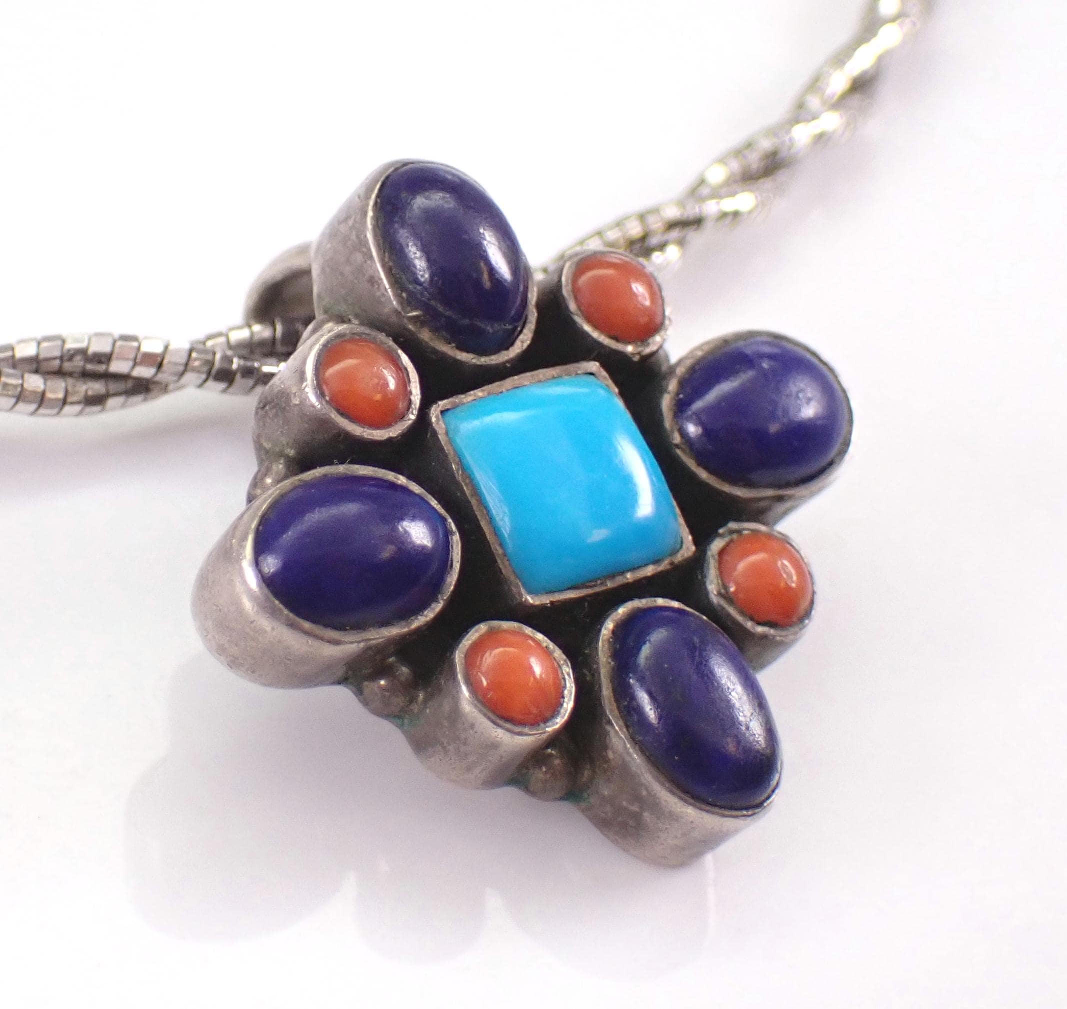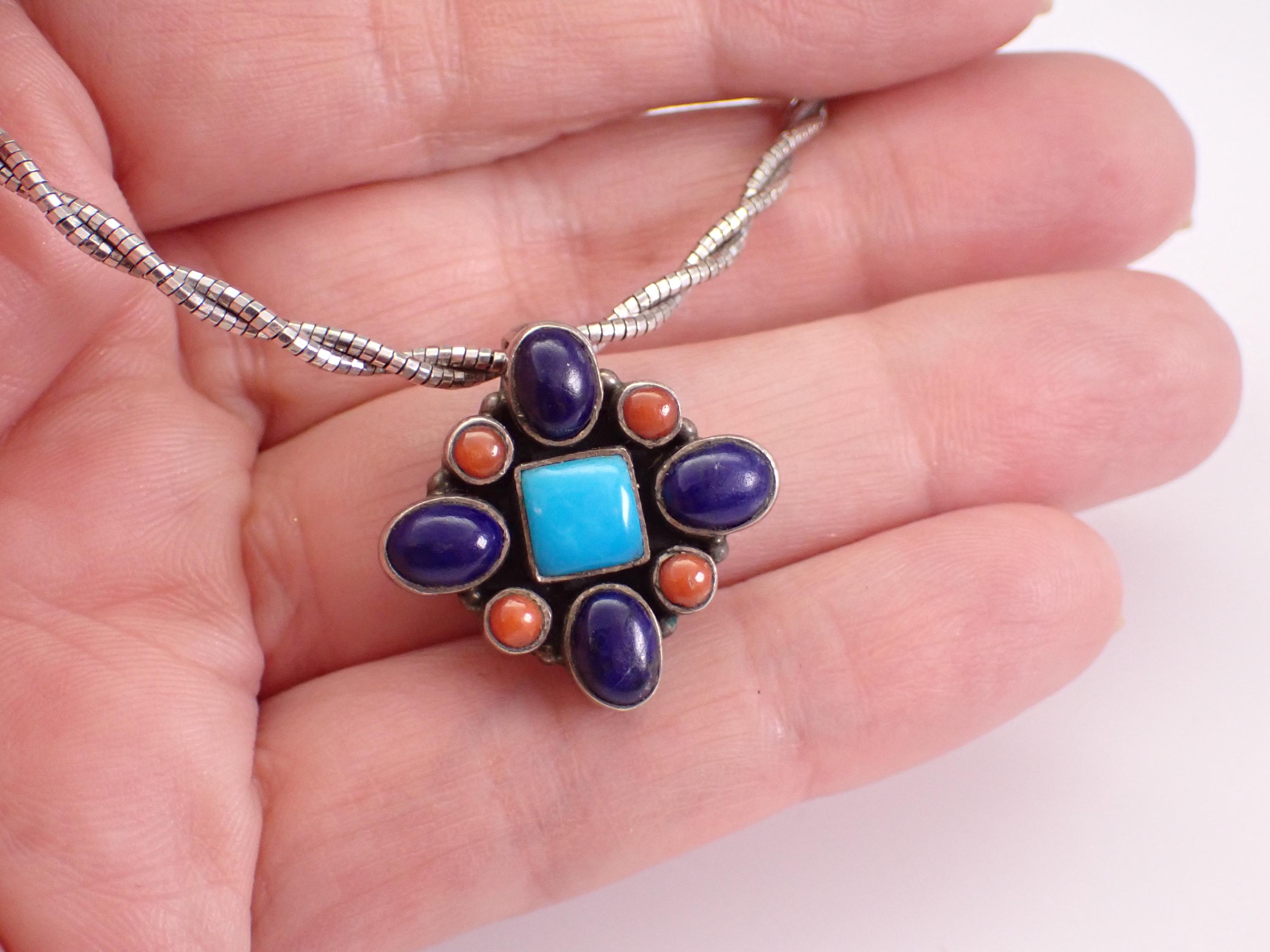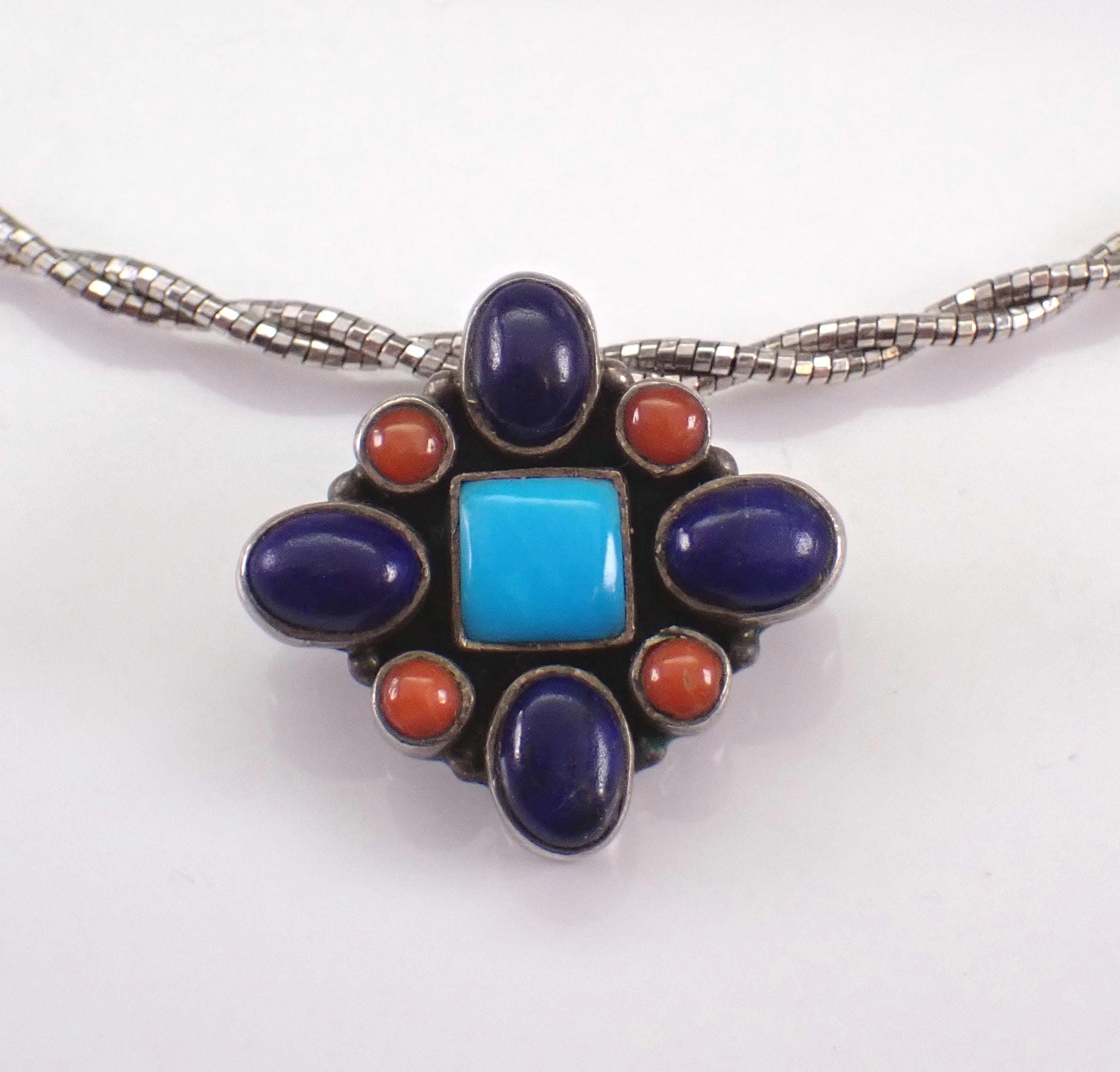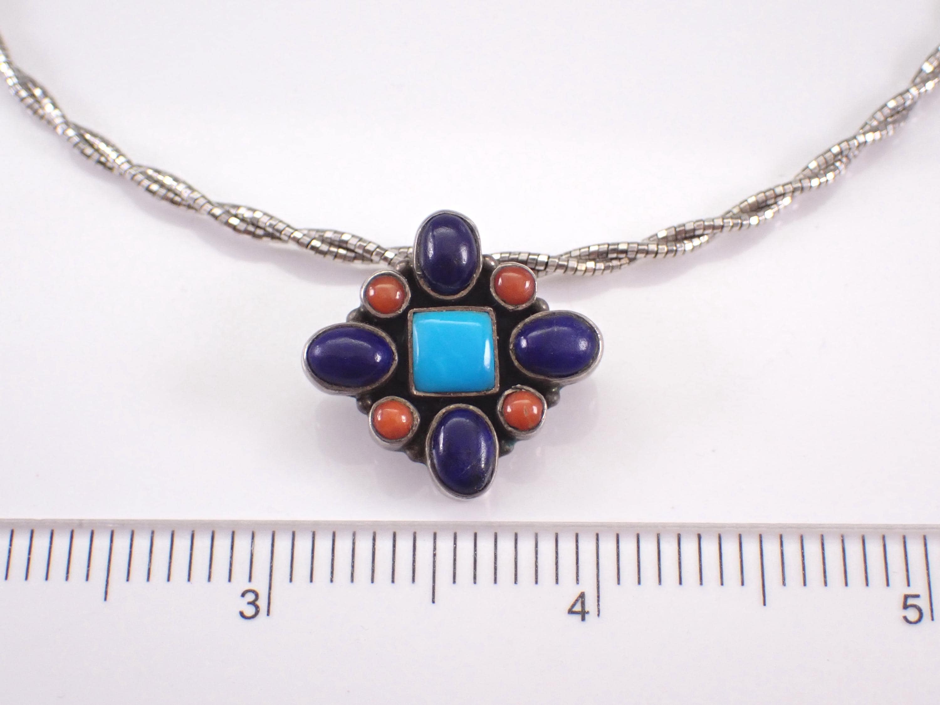 There is one square Turquoise, four Oval Lapis Lazuli and four Round Coral set in the centerpiece. The pendant slide charm measures 23 X 24 mm. The chain is a braided wire Omega style chain that measures 18" in full length with adjustment loops from 16". This necklace weighs 15.1 grams with the charm. This necklace is a very unique vintage item, perfect gift for any occasion!
