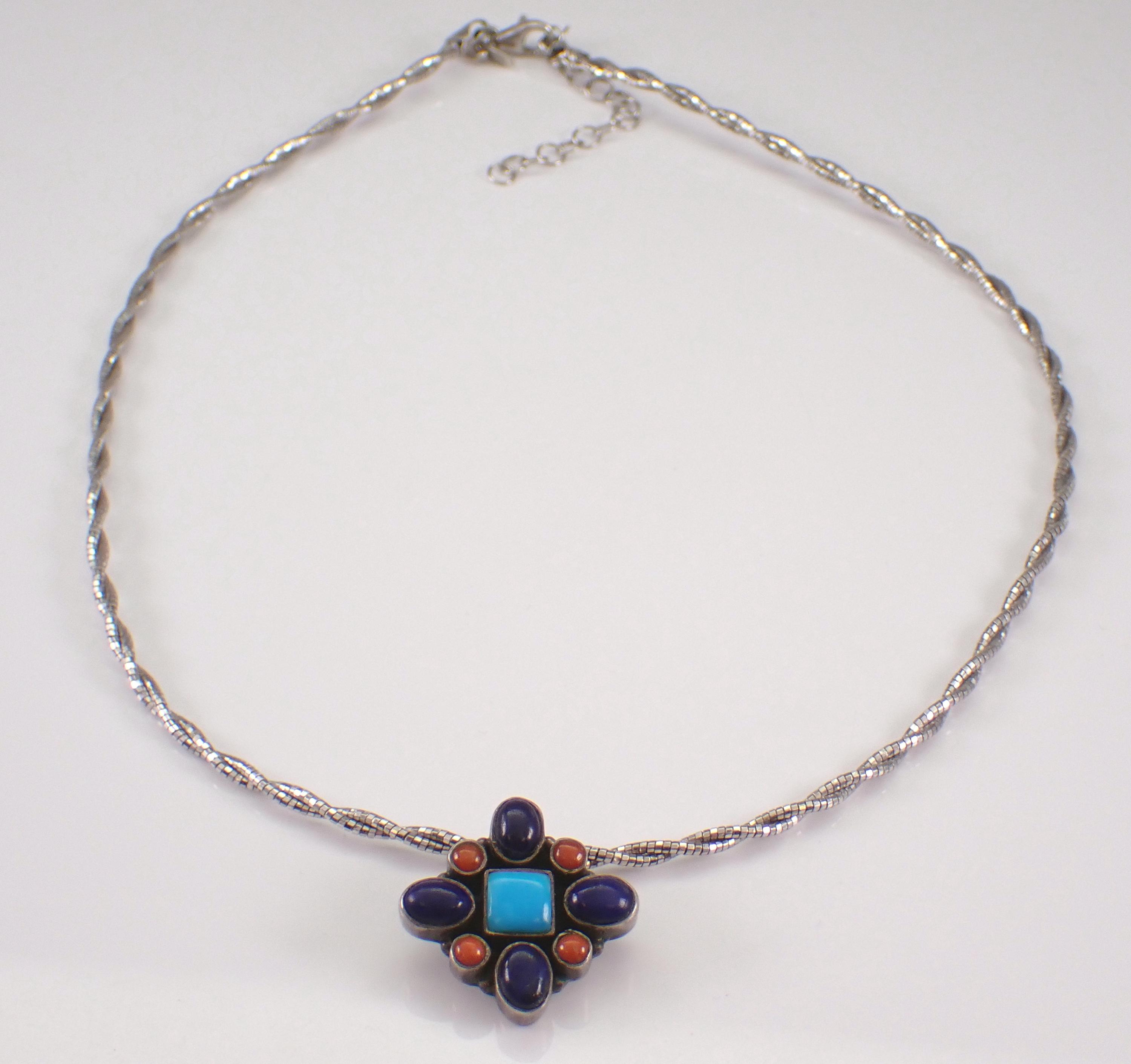 Sterling Silver Turquoise, Coral and Lapis Lazuli Necklace.