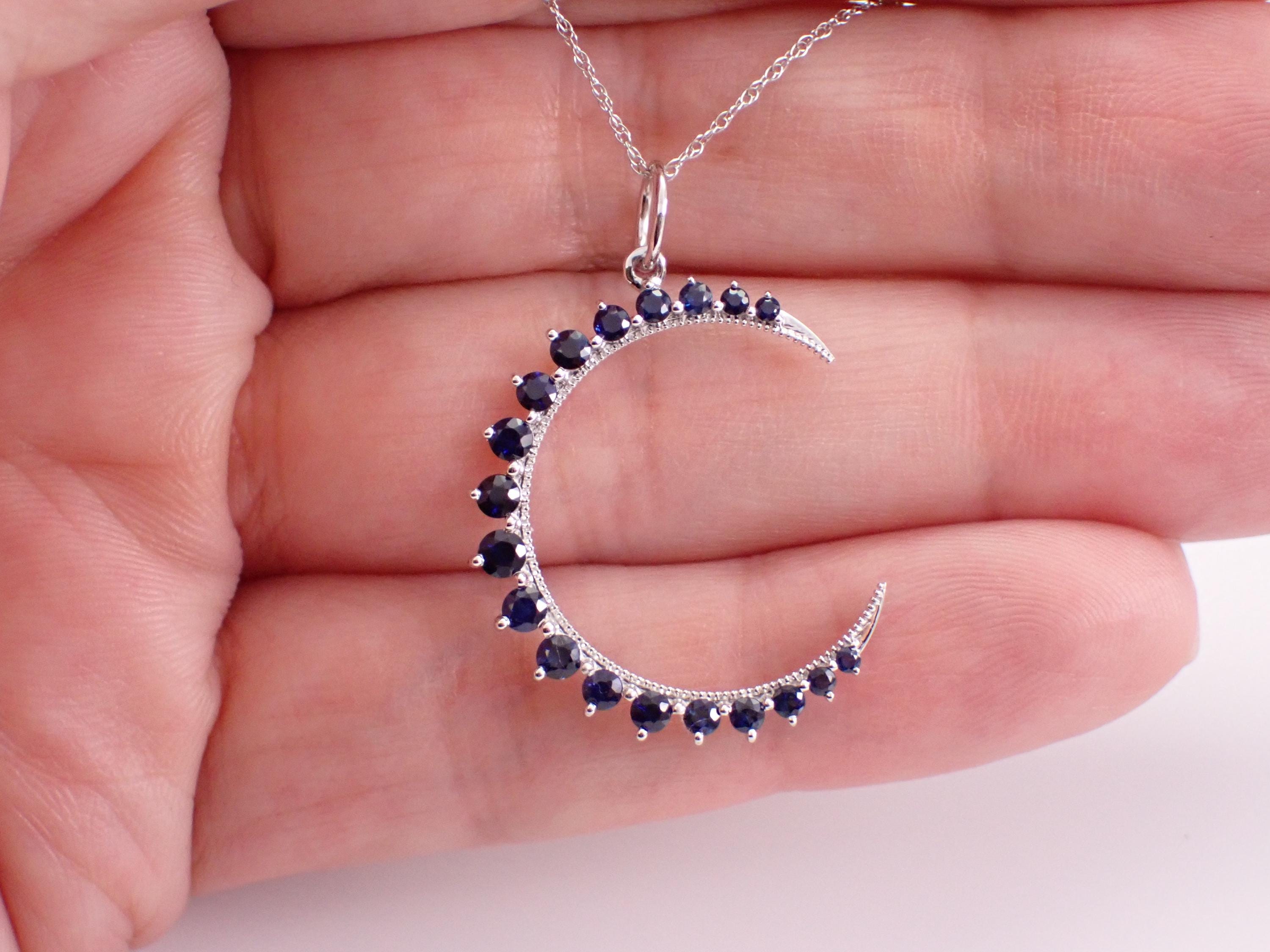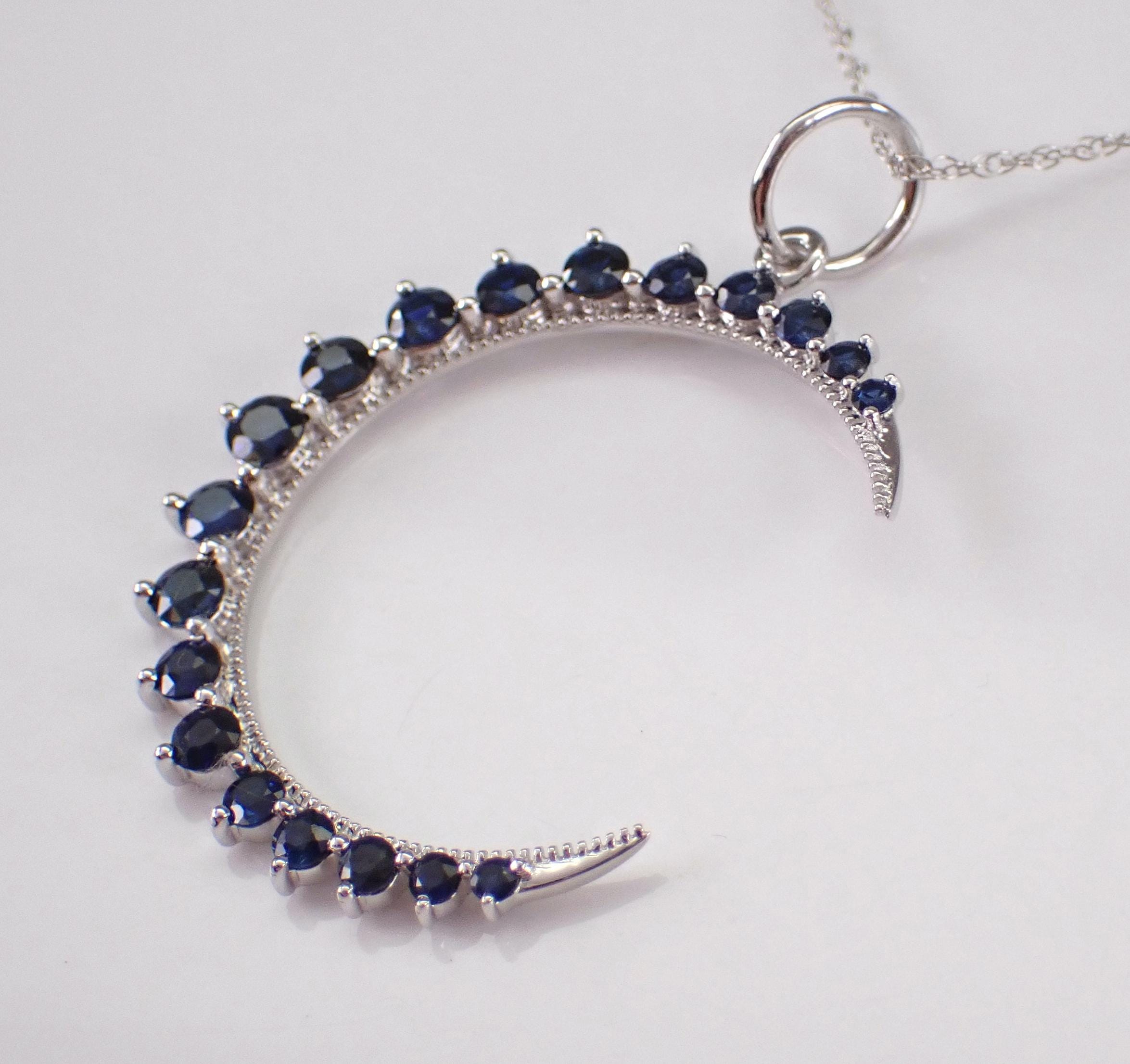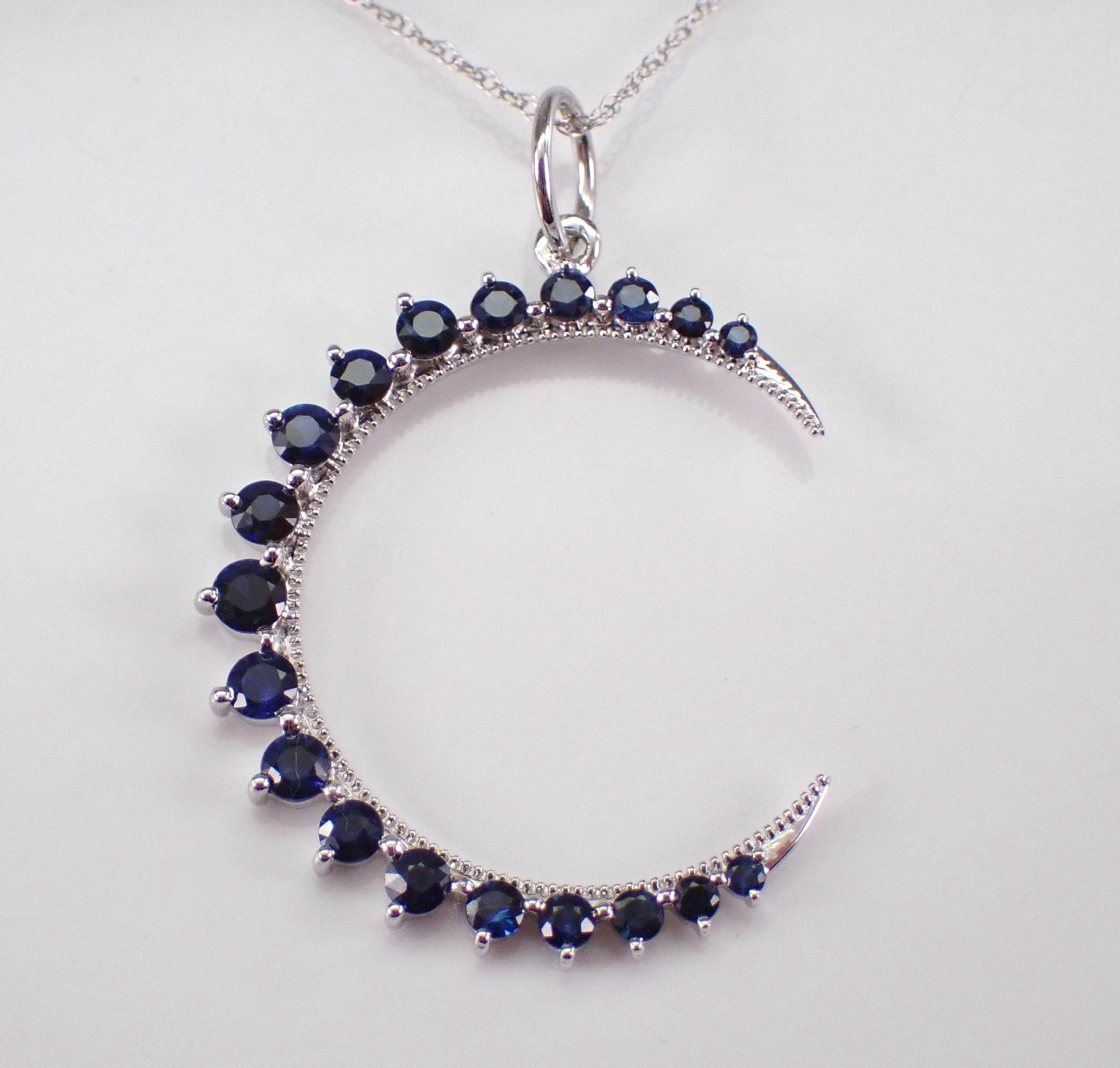 White Gold Sapphire Crescent Moon Pendant Necklace. This necklace is set with nineteen genuine Round Sapphires. These Sapphires are a beautiful deep blue color and combine to a total weight of 3/4 carat. The pendant measures 25 mm and the necklace weighs 1.6 grams with the accompanied chain that has an overall length of 18". Both the pendant and the chain are 10K White Gold. This necklace will be accompanied by an appraisal, valued at $1,485.00. The necklace will be shipped promptly in a gift box.