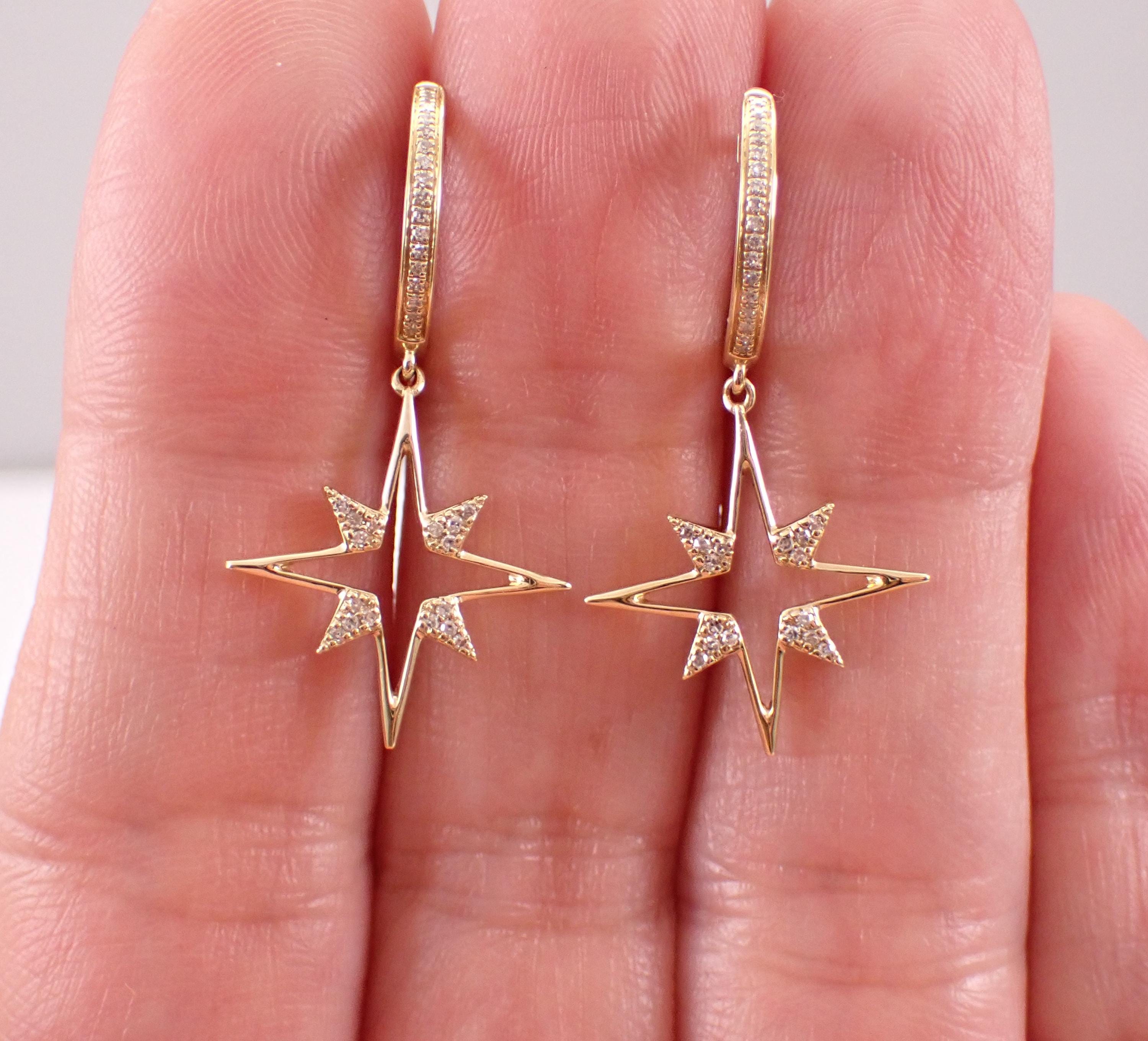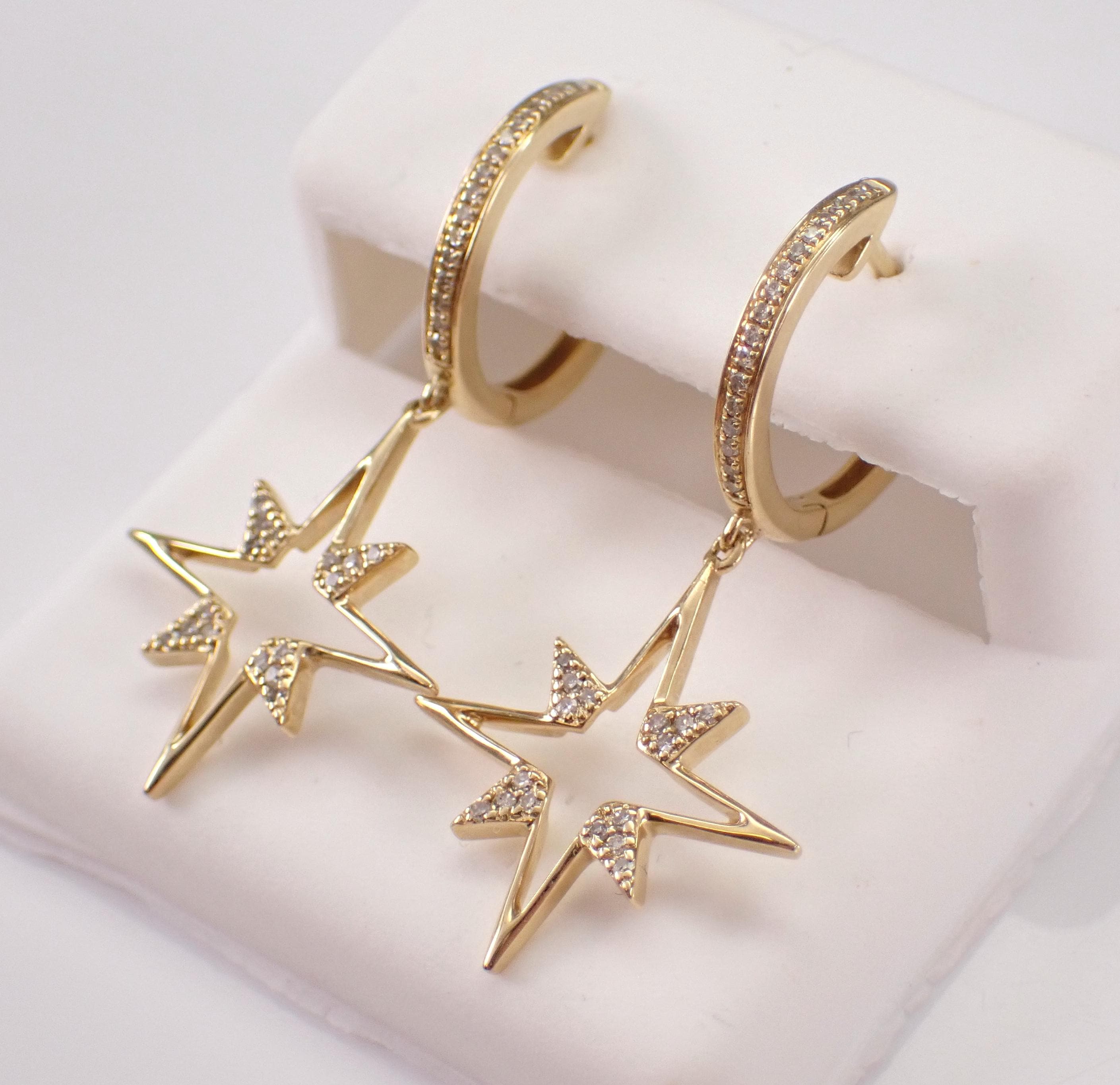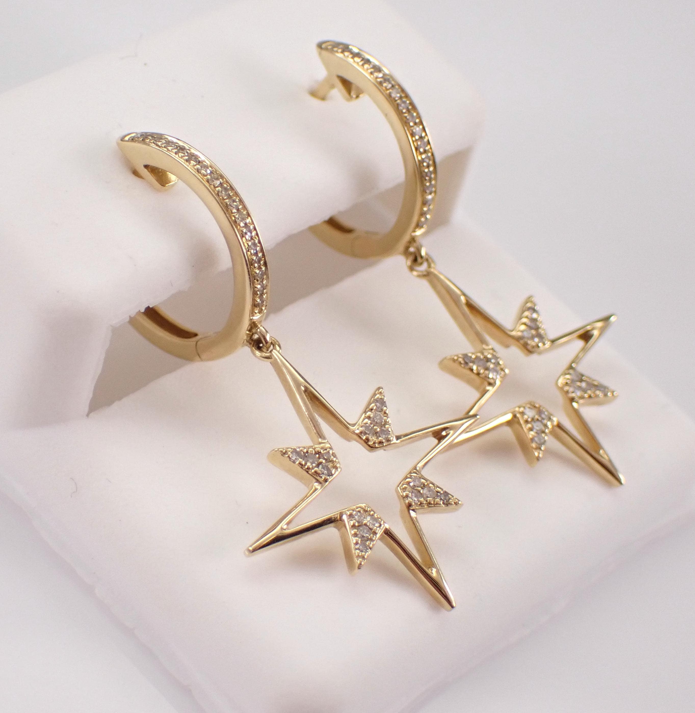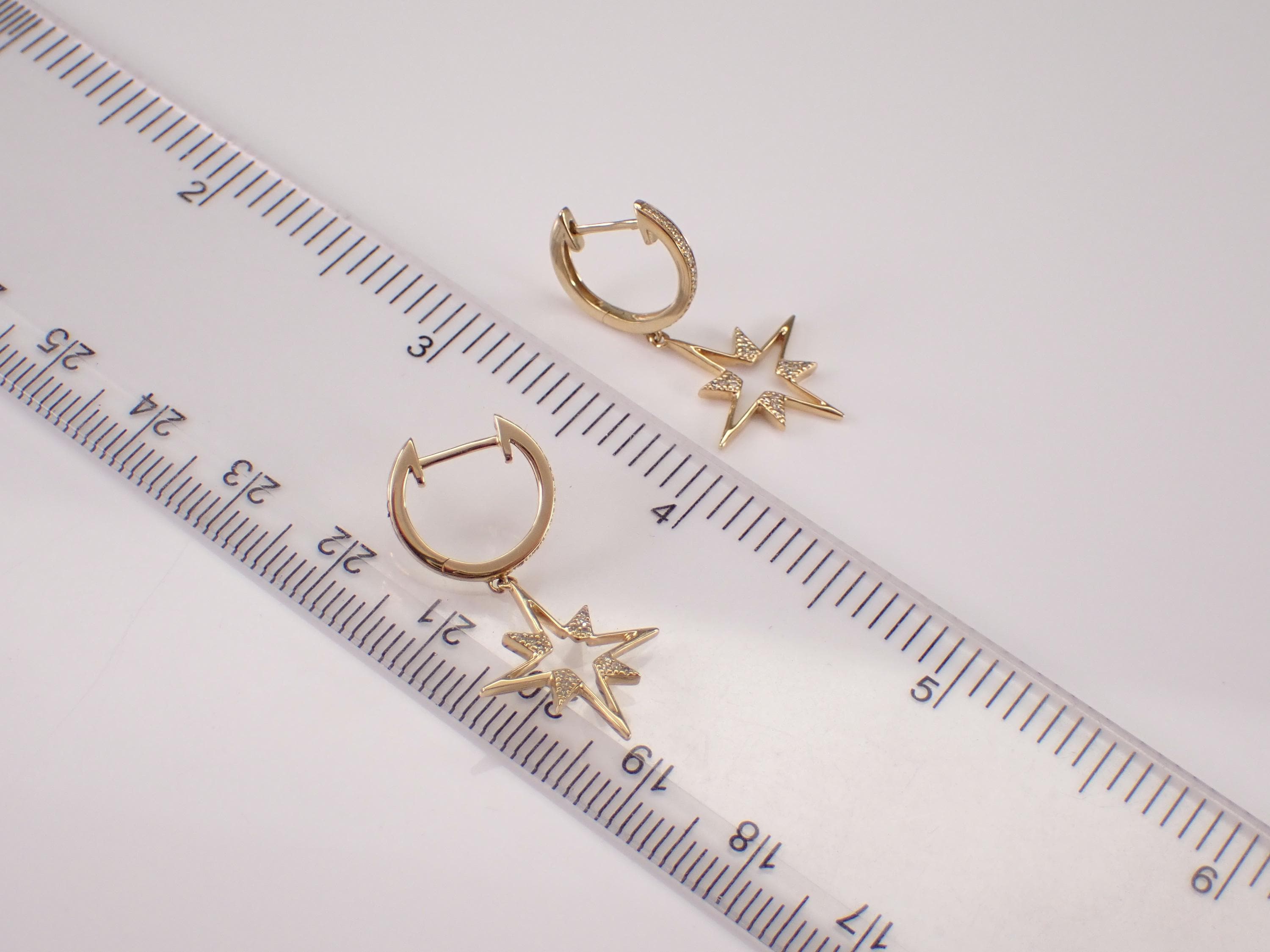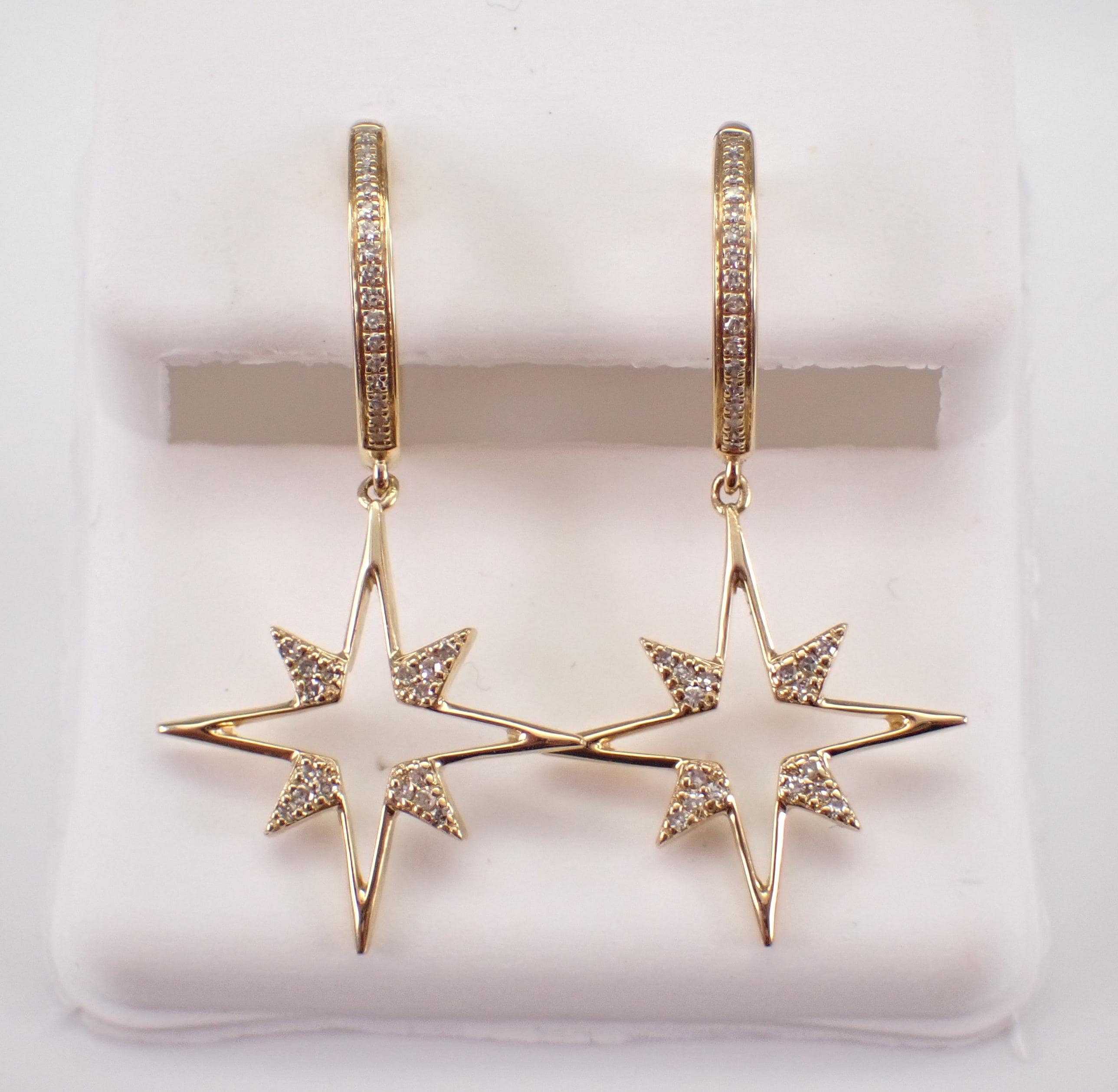 14K Yellow Gold Diamond Star Dangle Earrings. There are thirty-three natural Round Brilliant Diamonds set in EACH earring. These diamonds are H color, SI/I1 clarity and weigh a total of 1/4 carat. These earrings are 14KT Yellow Gold and weigh a total of 2.6 grams. These earrings are for pierced ears, measure 30.5 mm in length and have latch back clasps for pierced ears. These earrings will be accompanied by an appraisal written by a GIA Certified Diamond Grader with the retail replacement value of $1,485.00. I will ship these earrings promptly in a gift box.