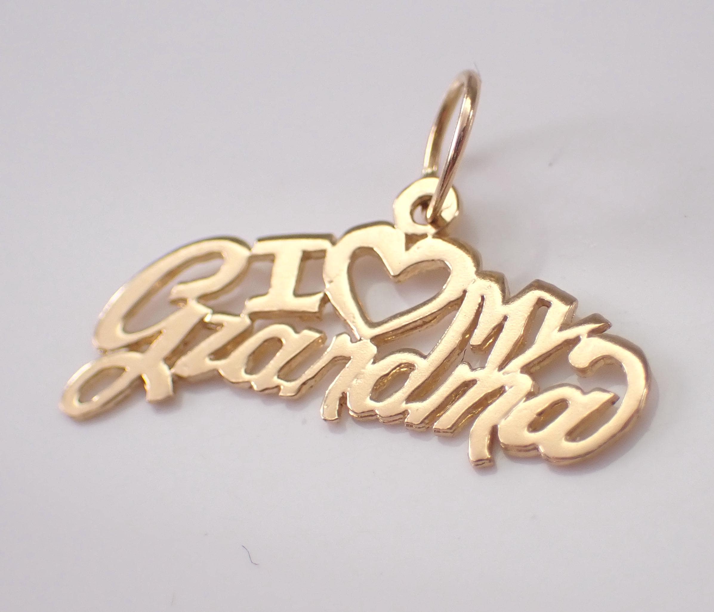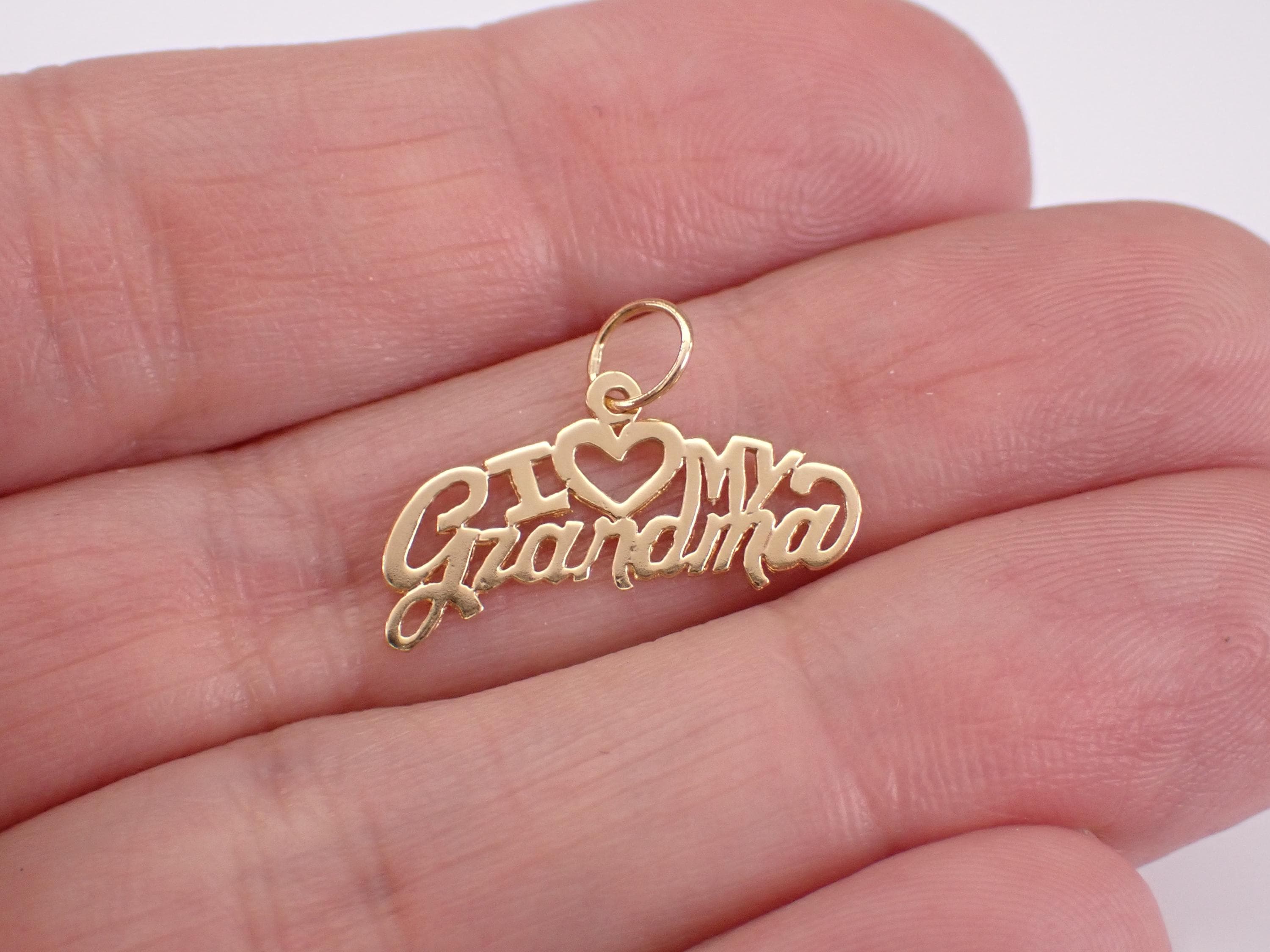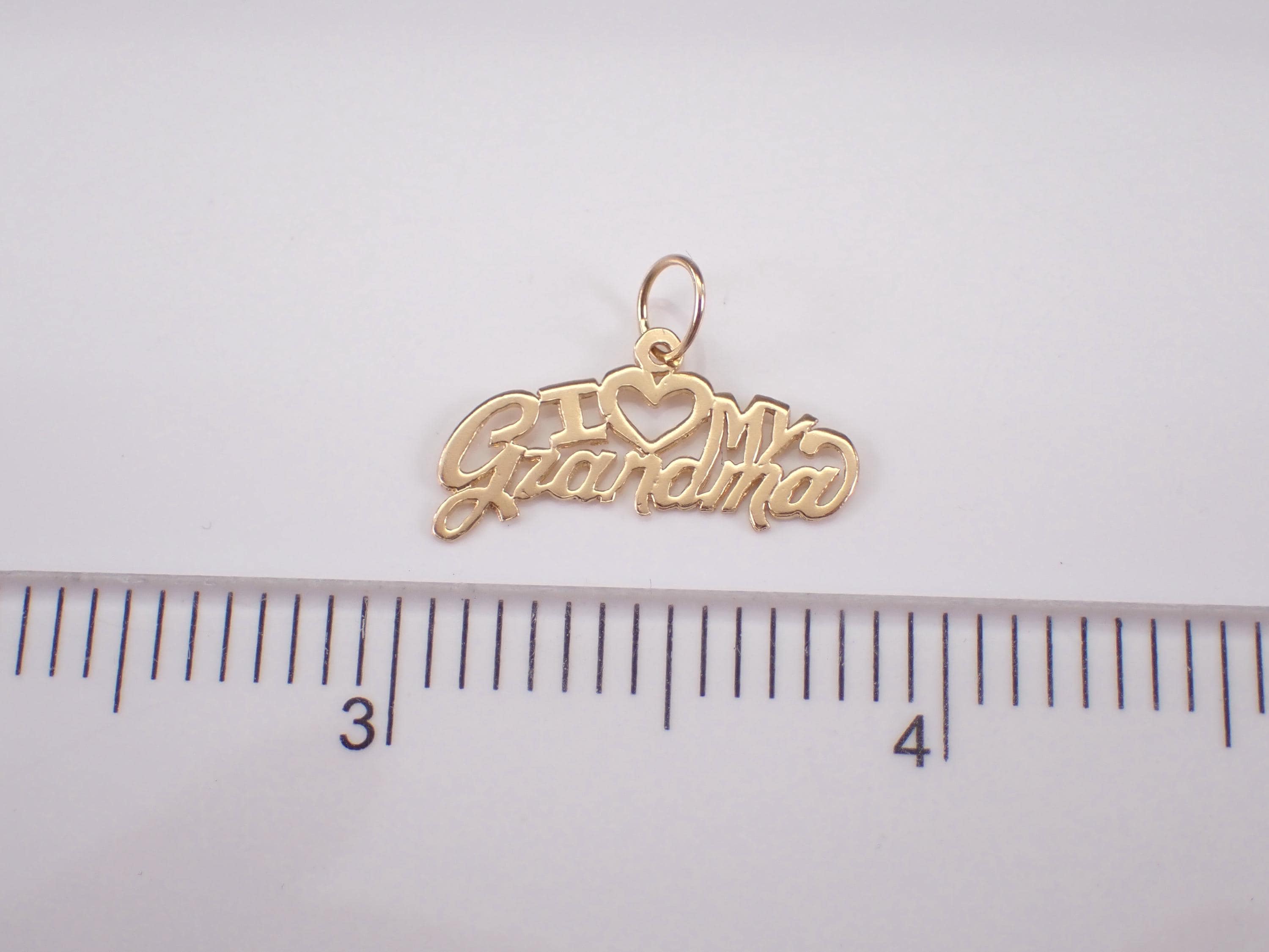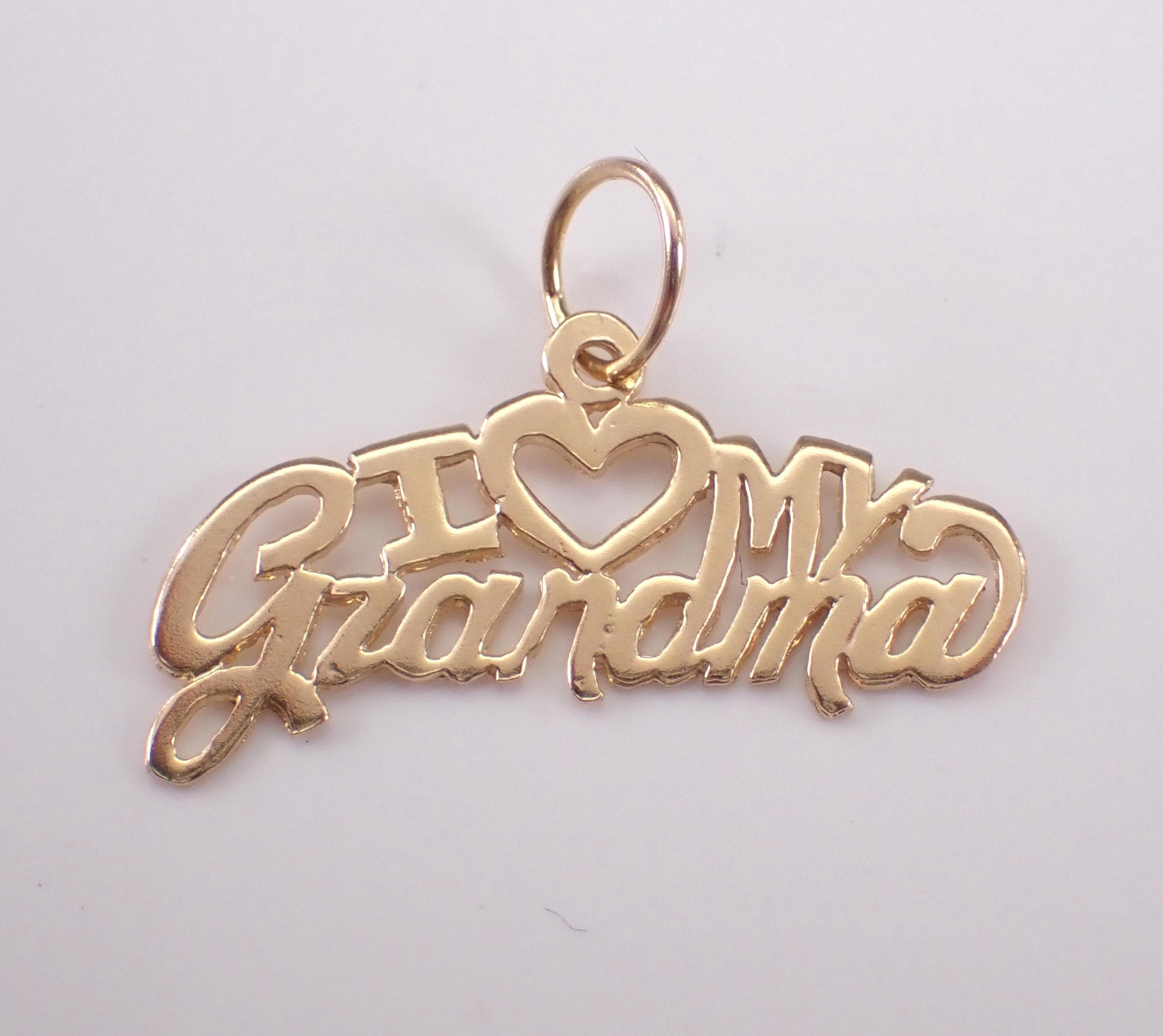Vintage 14K Yellow Gold "I LOVE GRANDMA" Charm Pendant. This charm is 14K Yellow gold and weighs .5 grams. This charm measures 20 X 7 mm. I will ship this pendant promptly in a gift pouch.