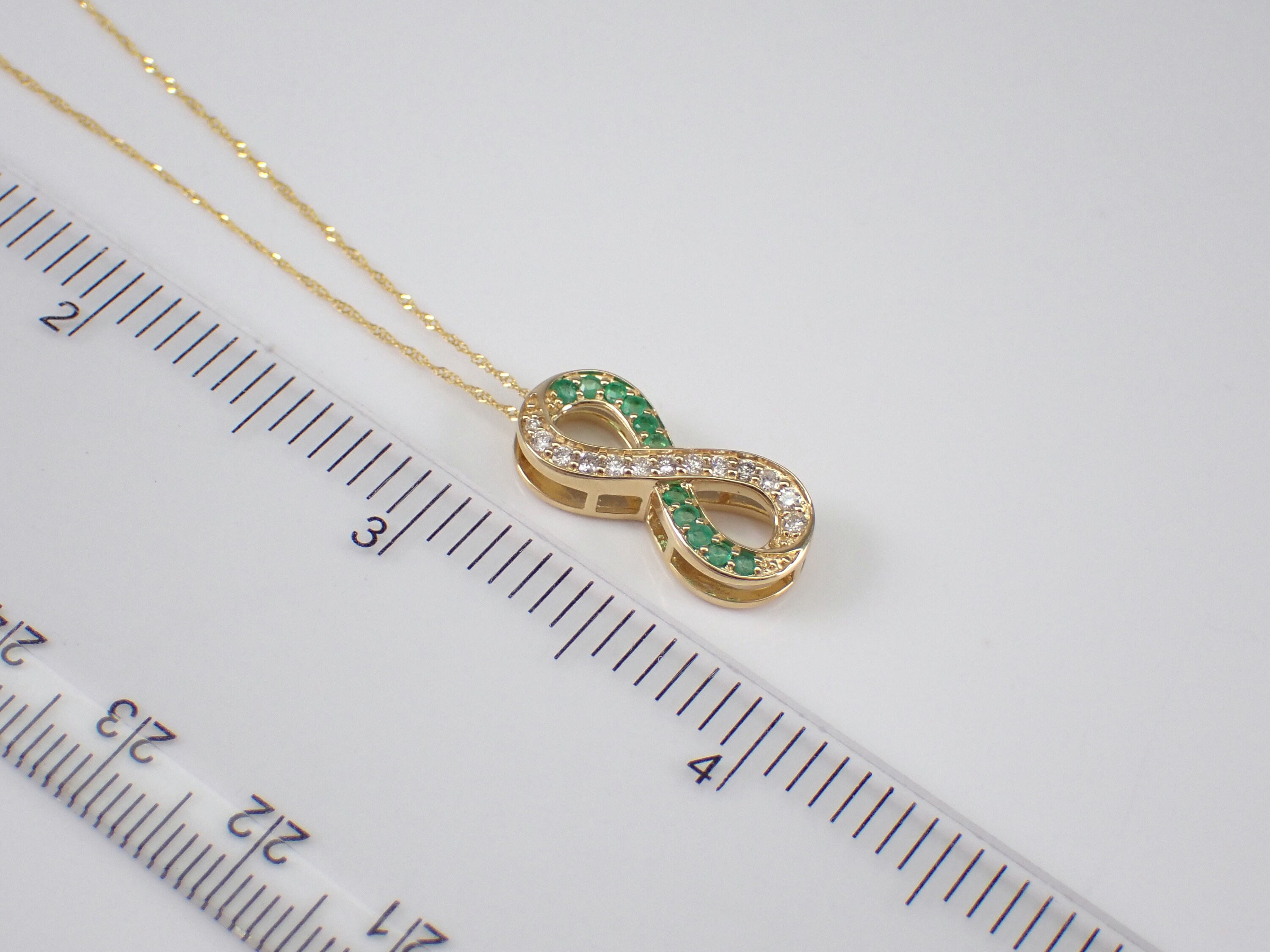 14K Yellow Gold Diamond and Emerald Infinity Sign Pendant Necklace with Chain. This pendant is set with thirteen genuine Round Brilliant Diamonds and eleven natural Round Emeralds. The Emeralds amount to a total weight of .15 carat. The diamonds are H color, I1 clarity and weigh a total of .18 carats. This pendant is 14KT Solid Yellow Gold, comes with an 18" 14K Yellow Gold chain and together with the chain weighs 2.6 grams. This pendant measures 20.5 X 9 mm. This necklace will be accompanied by an appraisal by a GIA Certified Diamond Grader with the retail replacement value of $1,385.00. I will ship this pendant promptly in a beautiful gift box.