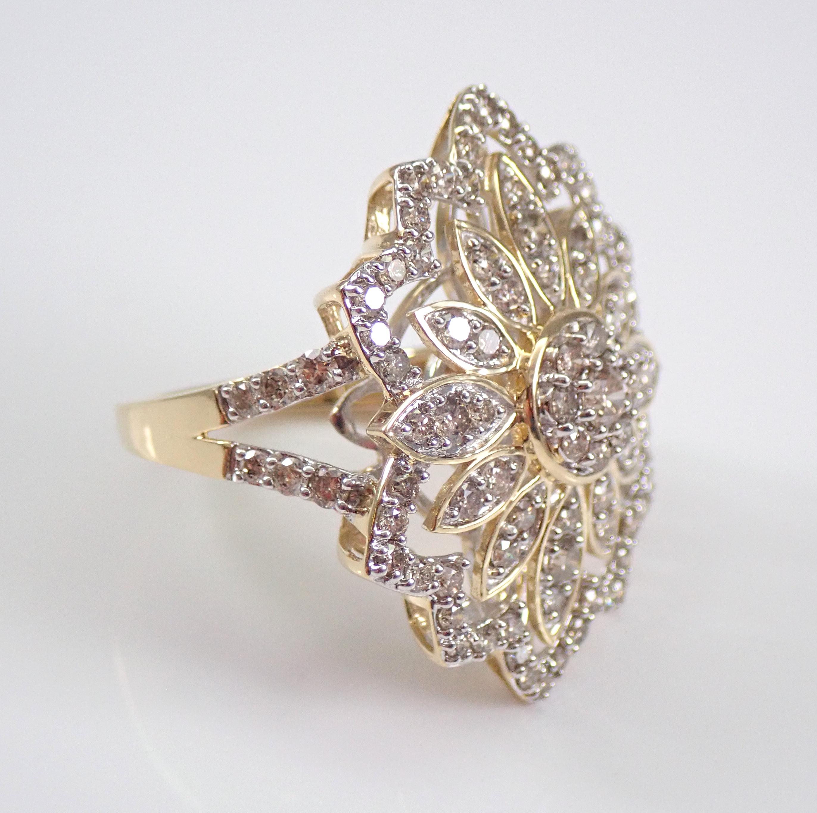 Solid Yellow Gold Diamond Cocktail Ring. This ring is set with ninety-five genuine Round Brilliant Diamonds. These diamonds are I/J color, SI/I1 clarity and weigh a total of 2.00 carat. This ring is 10KT Yellow Gold, weighs 5.9 grams, measures 29 mm along the finger and is a finger size 7, which can be resized free of charge (please inquire about sizing with the finger size that you need). This ring will be accompanied by an appraisal with the retail replacement value of $4,695.00. I will ship this ring promptly in a gift box.