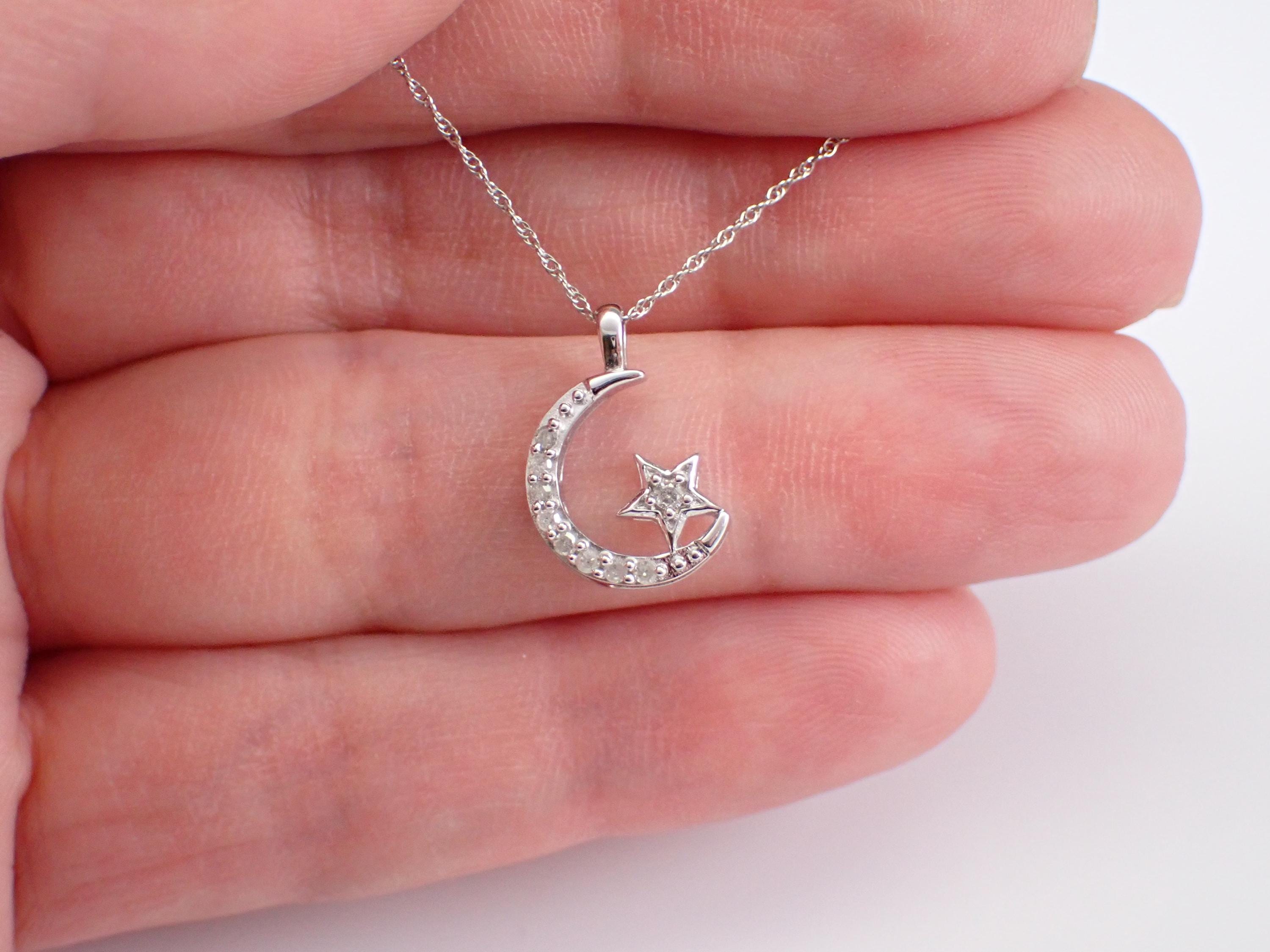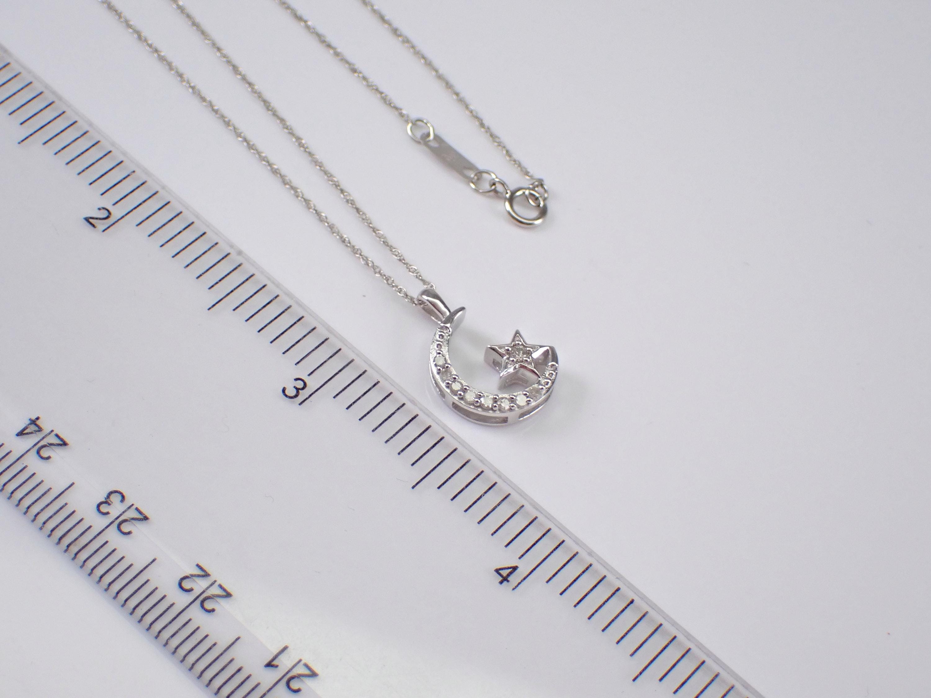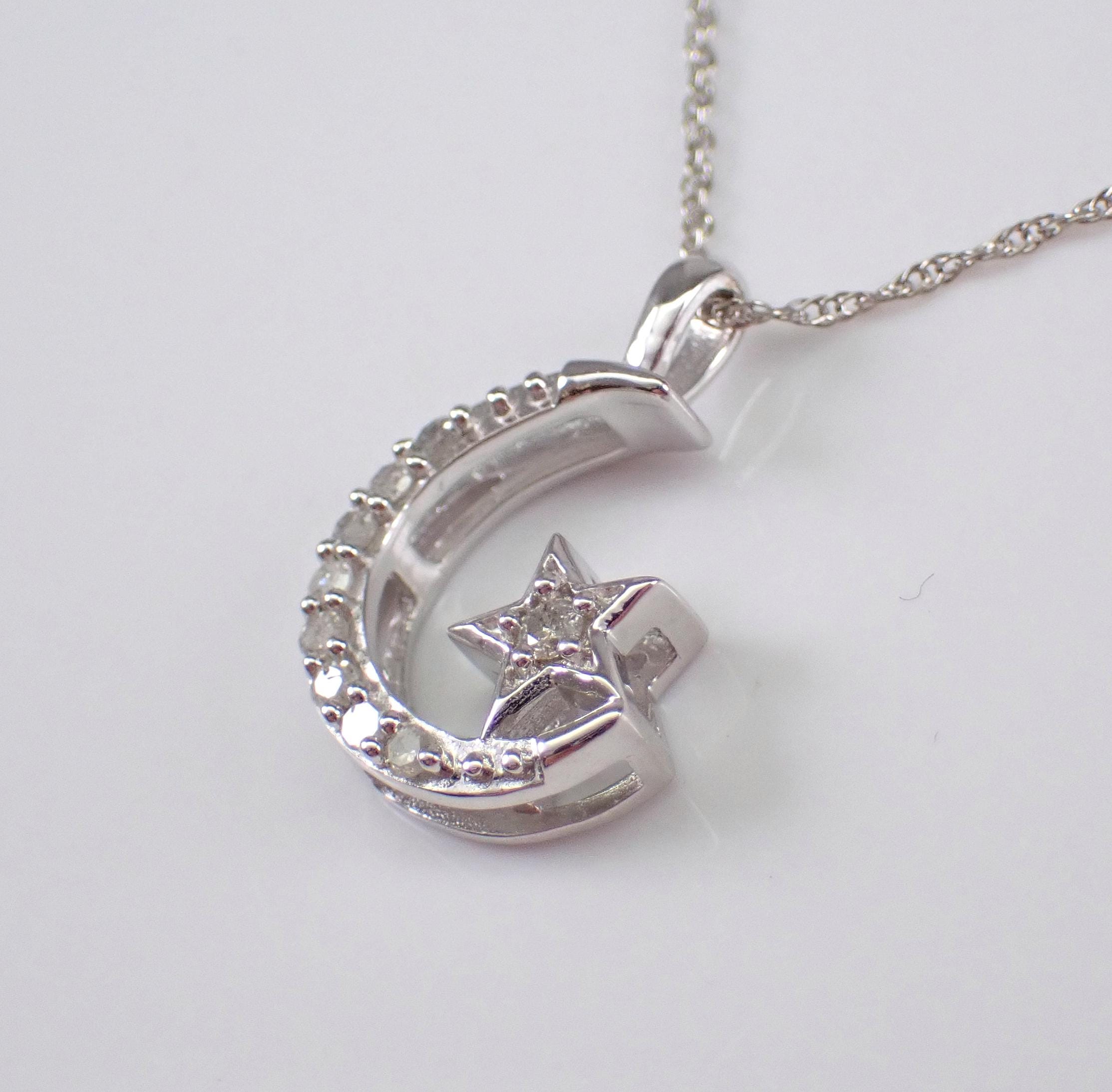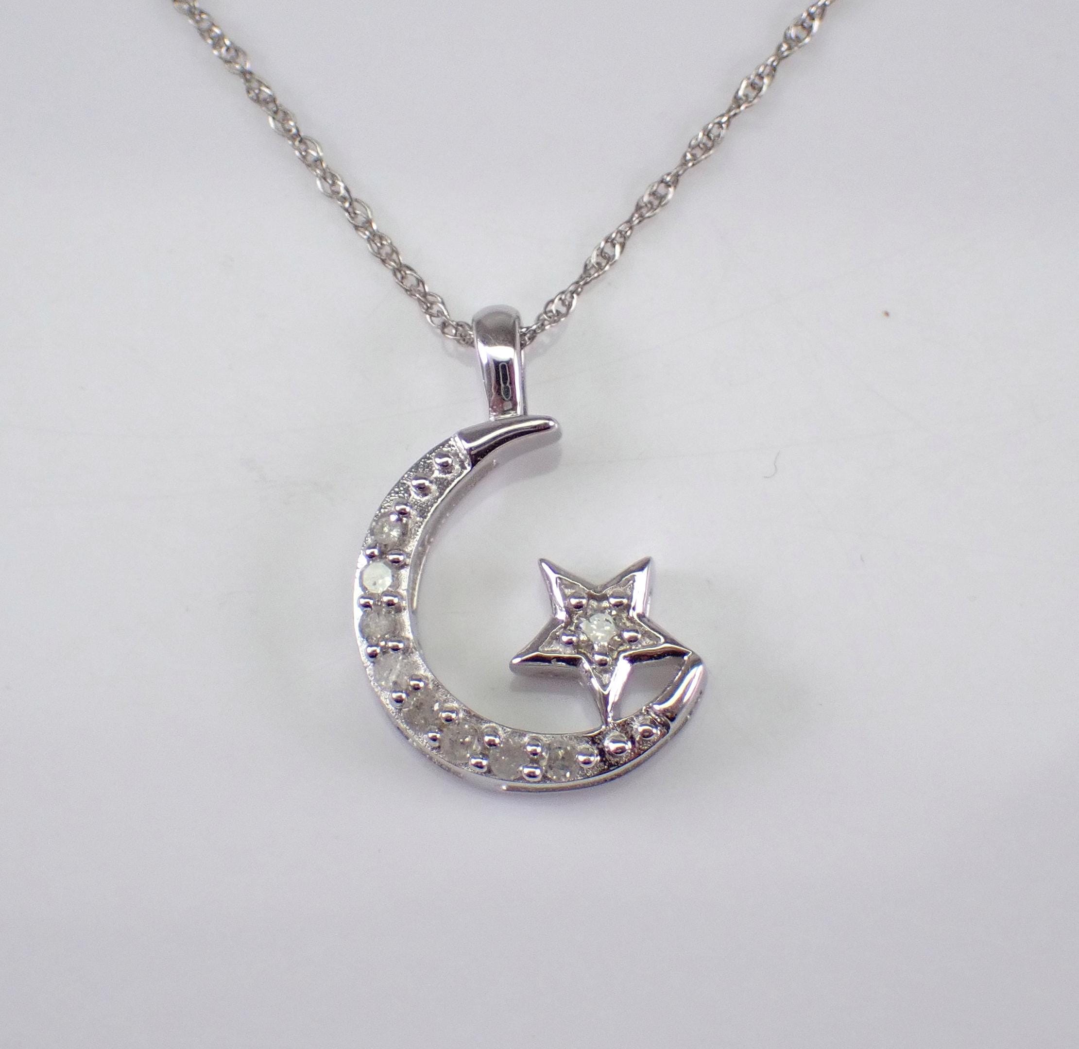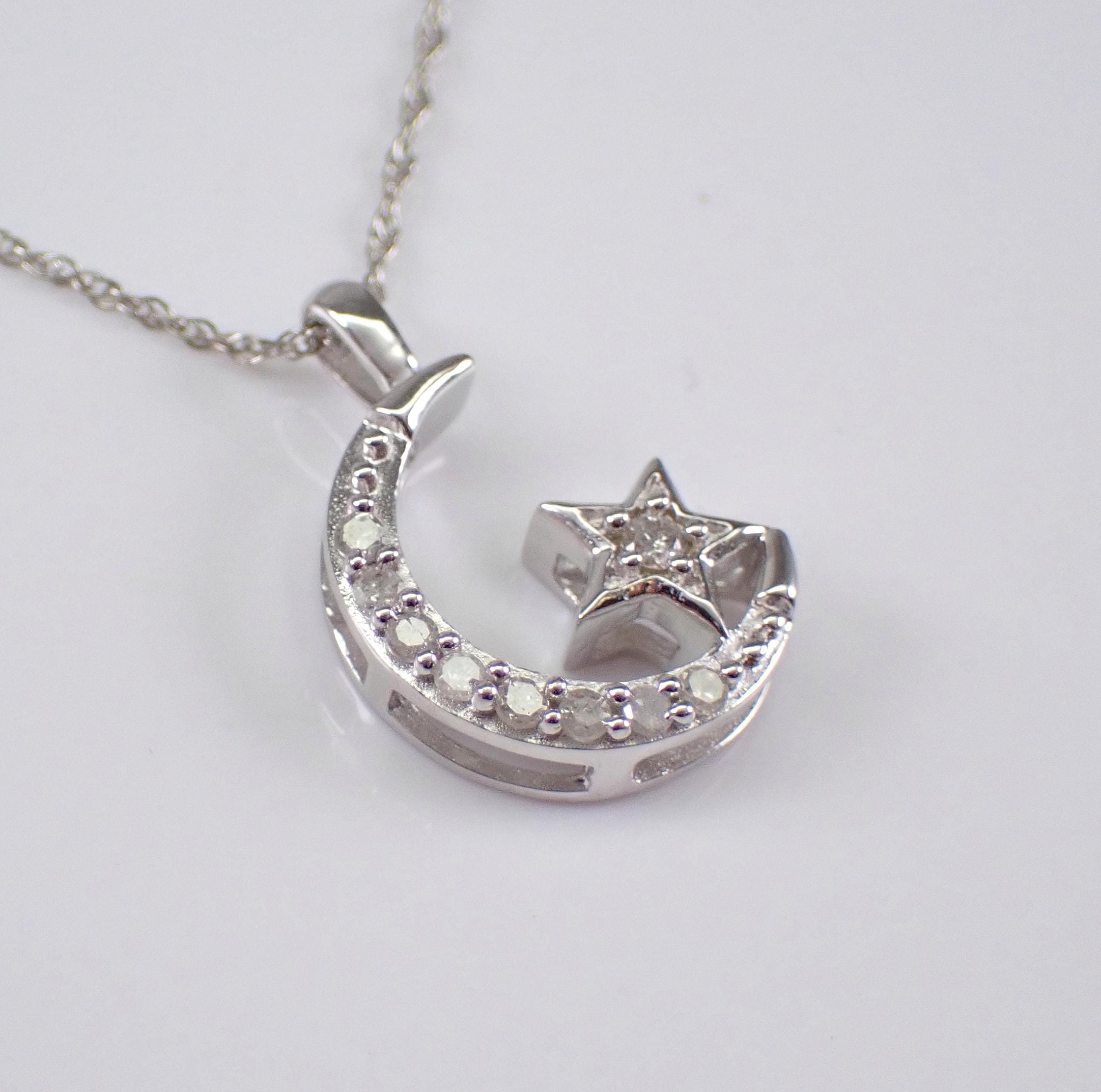 White Gold Diamond Crescent Moon and Star Necklace. This necklace is set with nine genuine Round Diamonds. These diamonds are H color, I1 clarity and combine to a total weight of .10 carats. The charm measures 12 X 10 mm and the necklace weighs 1.5 grams with included 18" 10K White Gold chain. This necklace will be accompanied by an appraisal, valued at $985.00. The necklace will be shipped promptly in a gift box.