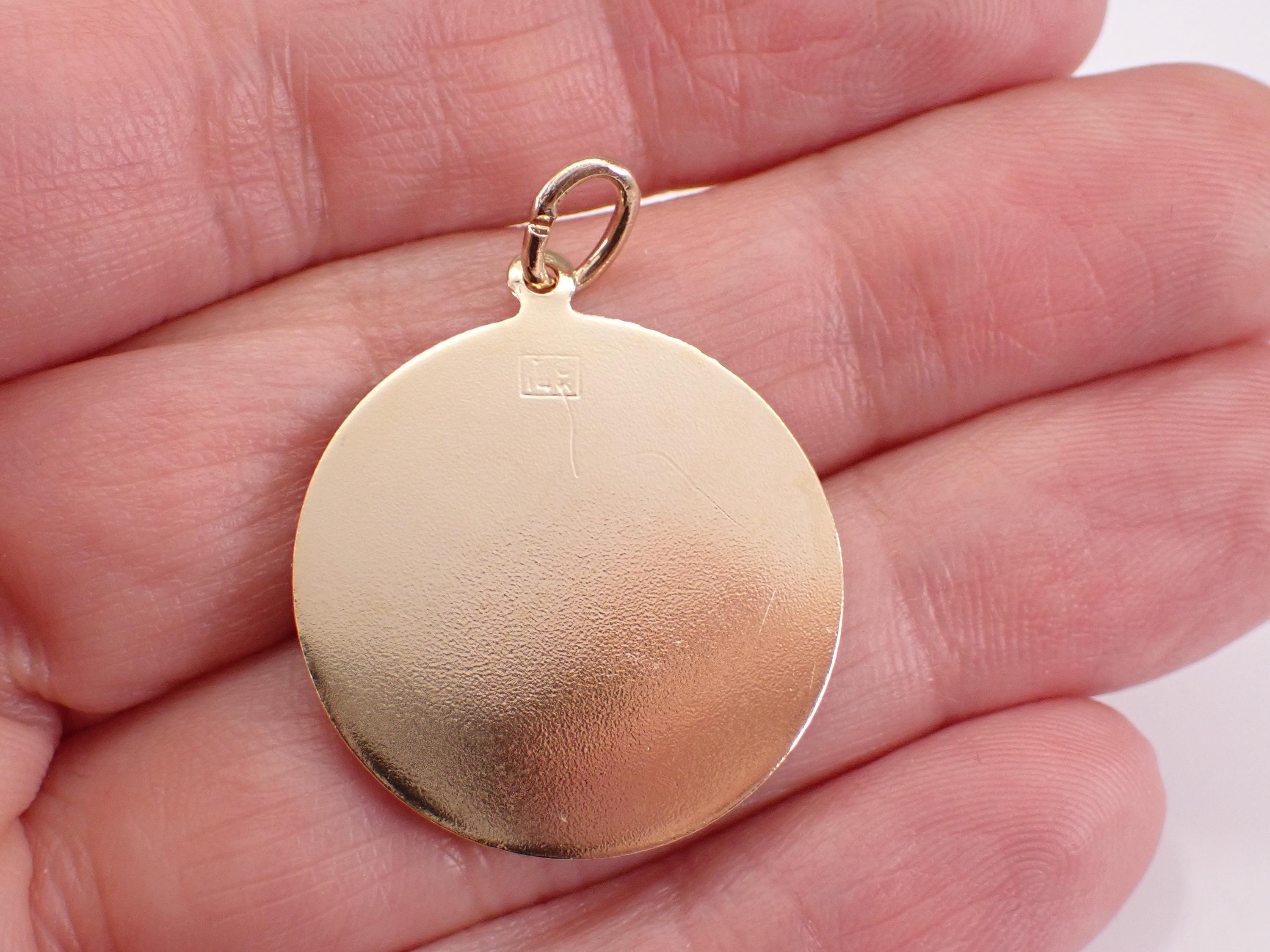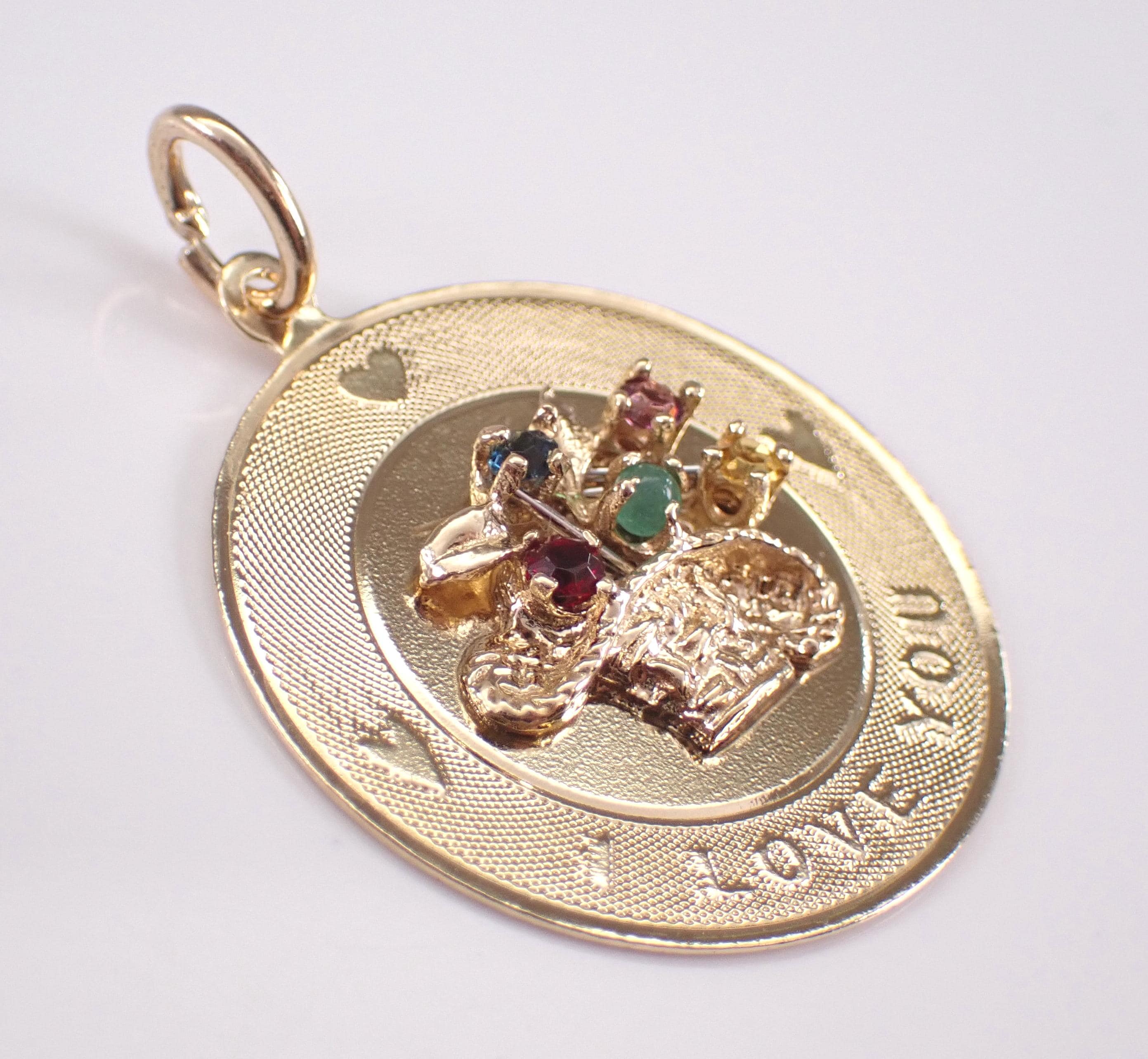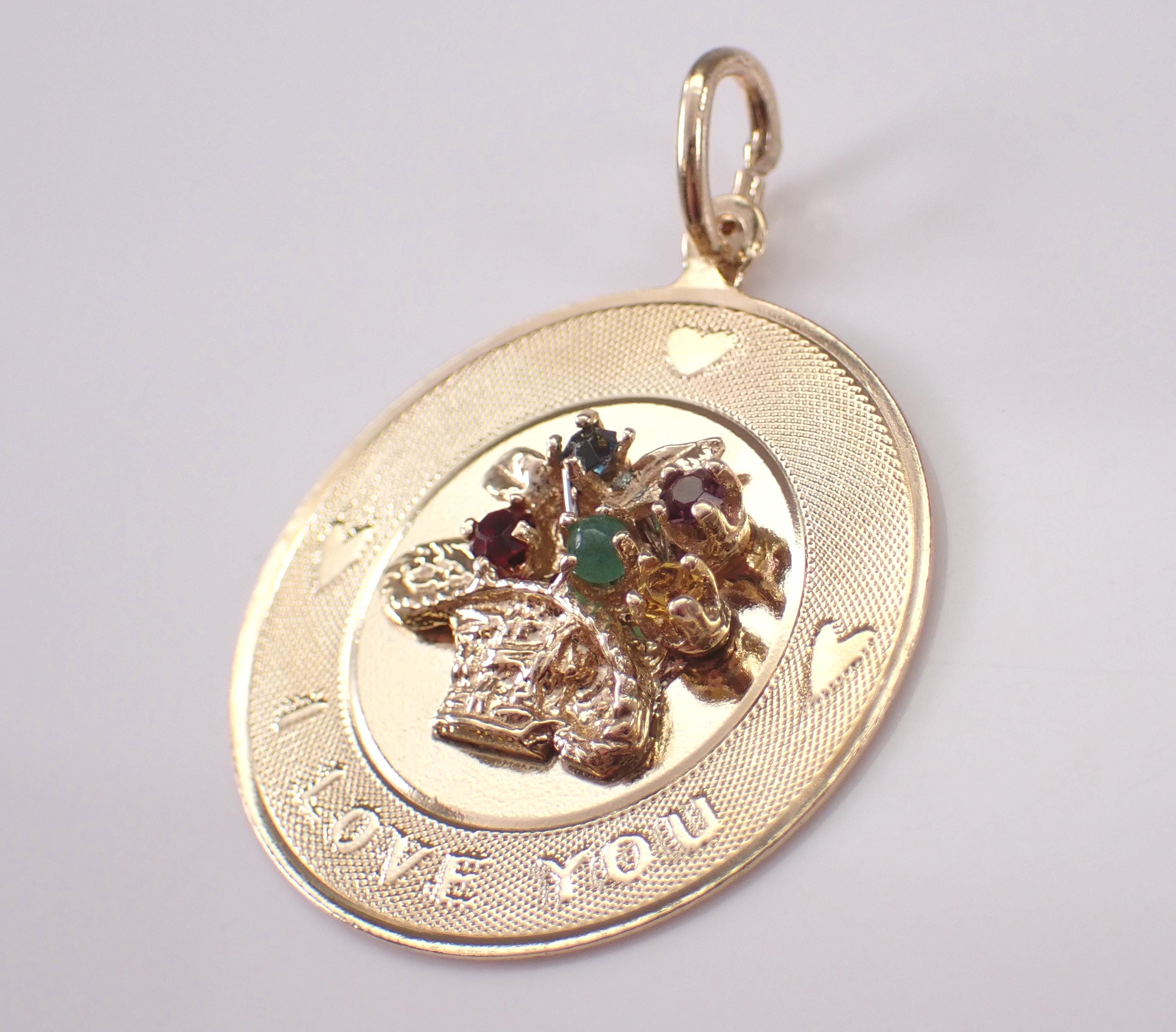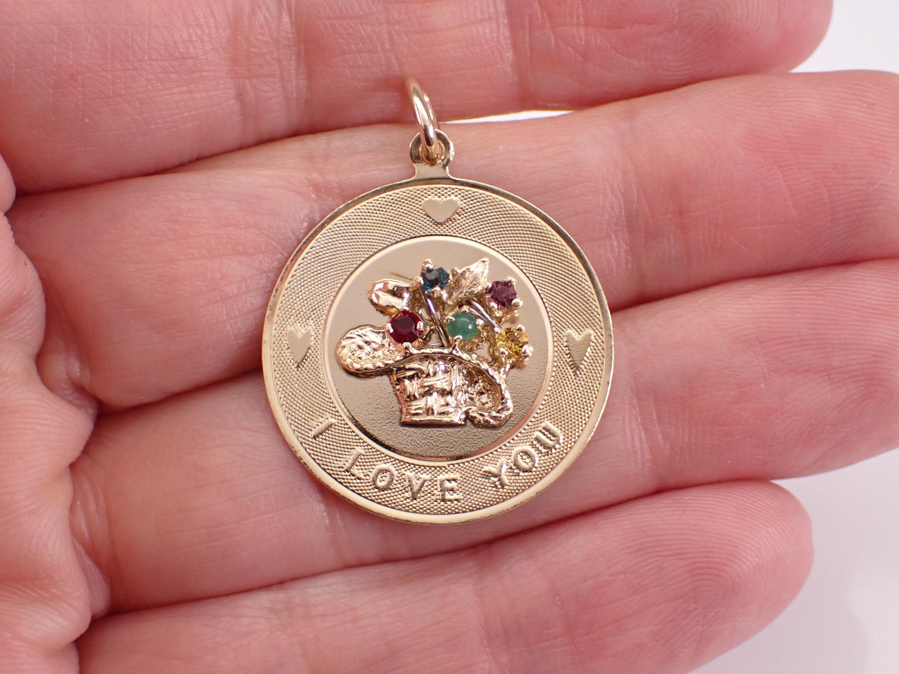 Vintage 14K Yellow Gold "I LOVE YOU" Charm Pendant. There are five Round Multi Color gemstones set in this charm. This charm is Solid 14K Yellow gold, measures 25 mm in diameter (1") and weighs 3.9 grams. I will ship this pendant promptly in a gift pouch.