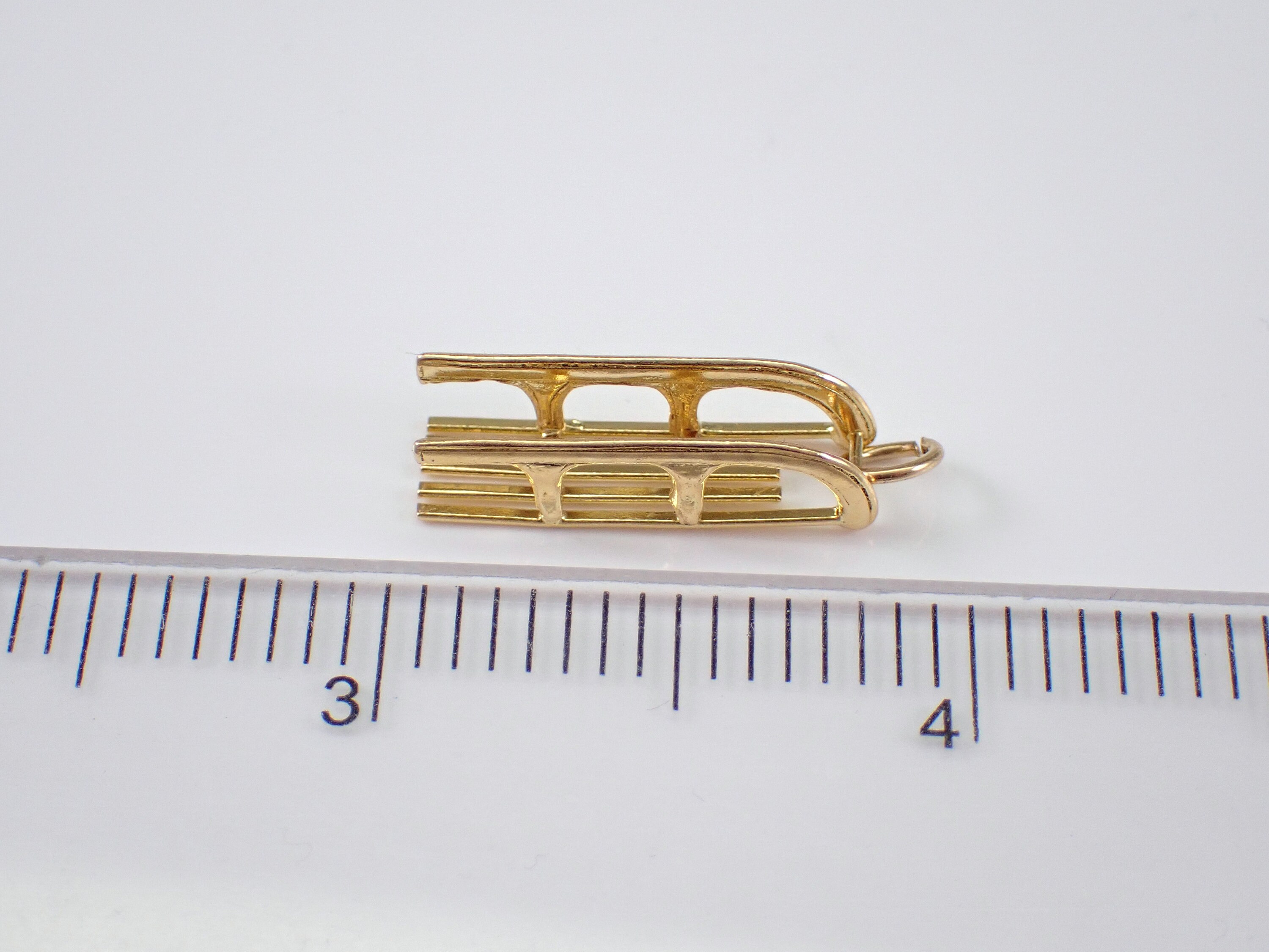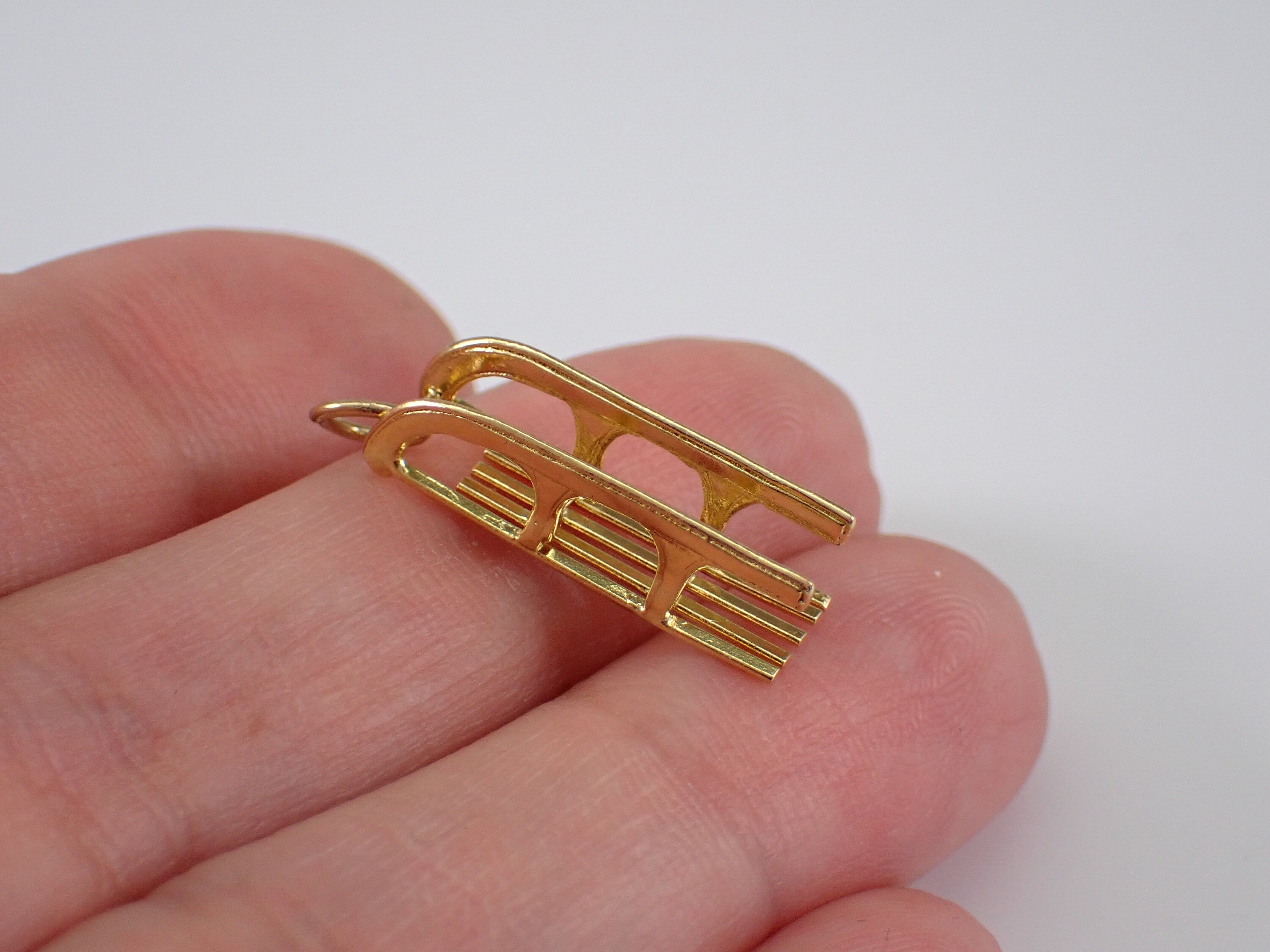 Vintage 14K Yellow Gold Sled Charm Pendant. This charm is 14K Solid Yellow gold and weighs 1.8 grams. This charm measures 21 mm across. I will ship this pendant promptly in a gift pouch.